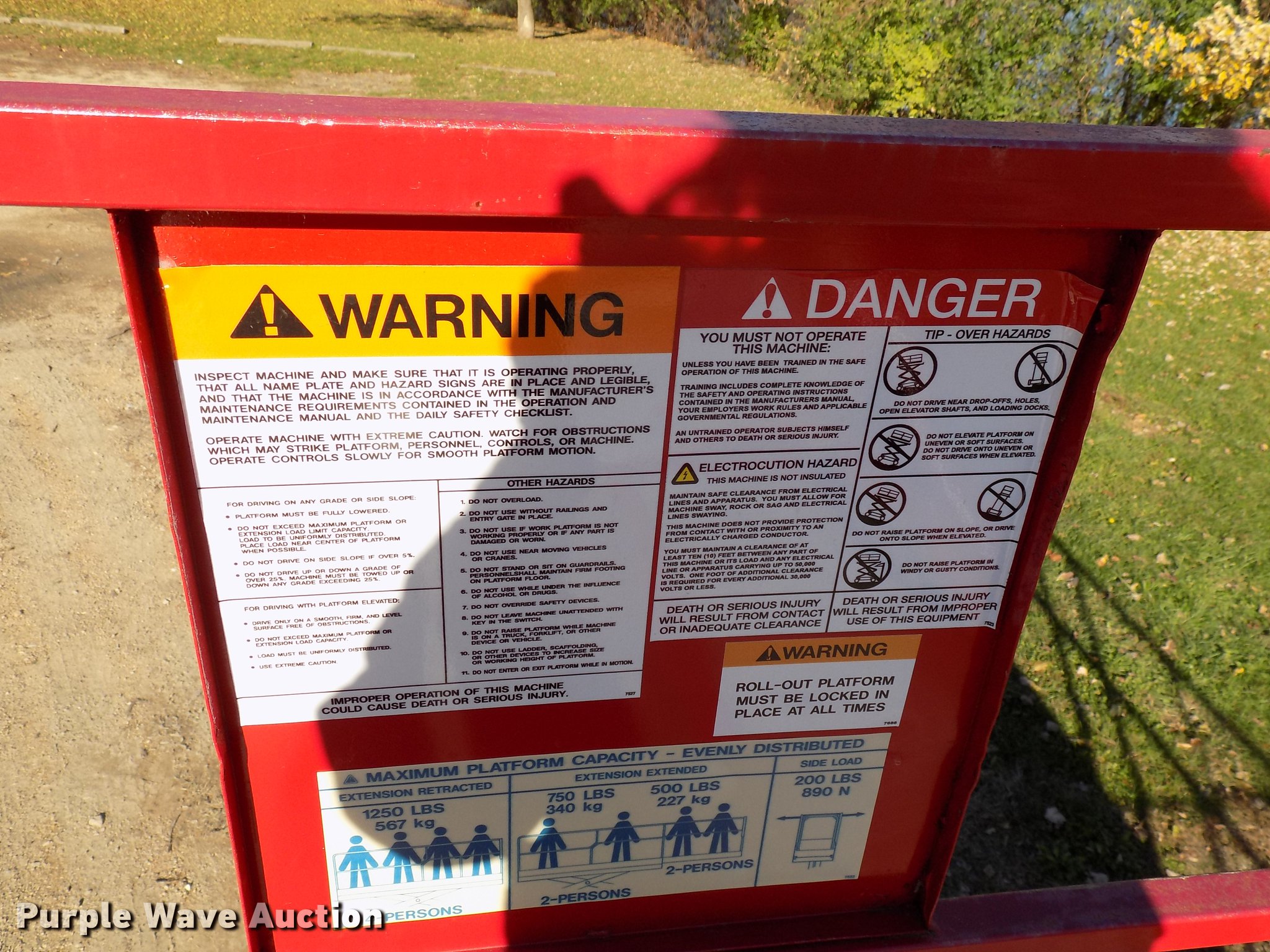 Purple Wave is selling a used Scissor or Vertical Lift in Iowa. This item is a 1996 Mec 33RT rough terrain scissor lift with the following: 1,646 hours on meter, Kubota DF752 three cylinder dual fuel engine, Gas or propane capable, 1,250 lbs max lift capacity, 33' max lift height, 3.8 mph travel speed, 131.9"L x 48"W platform, 48" platform extension, Manual platform extension, Platform and ground controls, AC power outlet, Safety alarm, 12-6.5 pneumatic tires, Serial 10800340