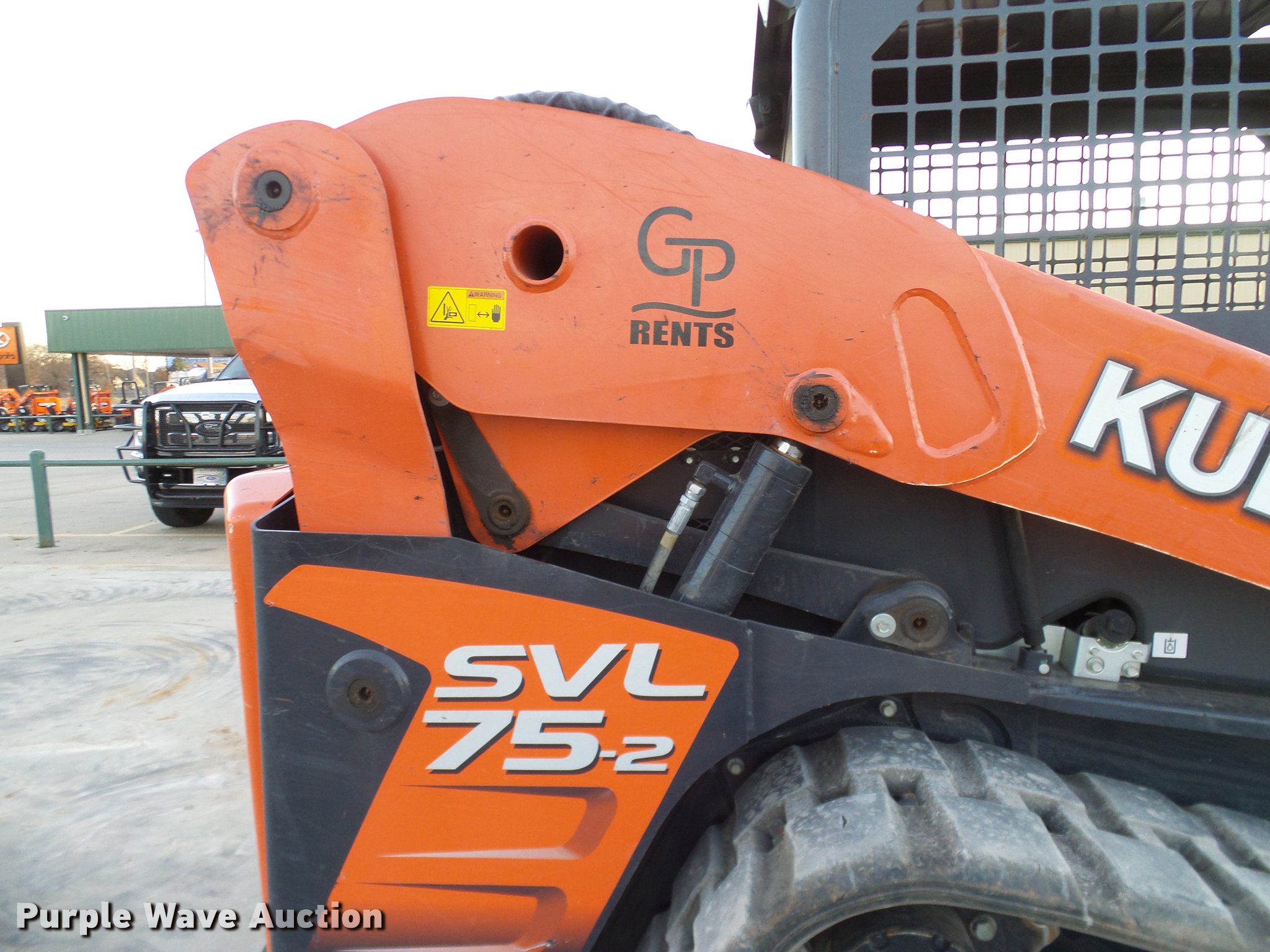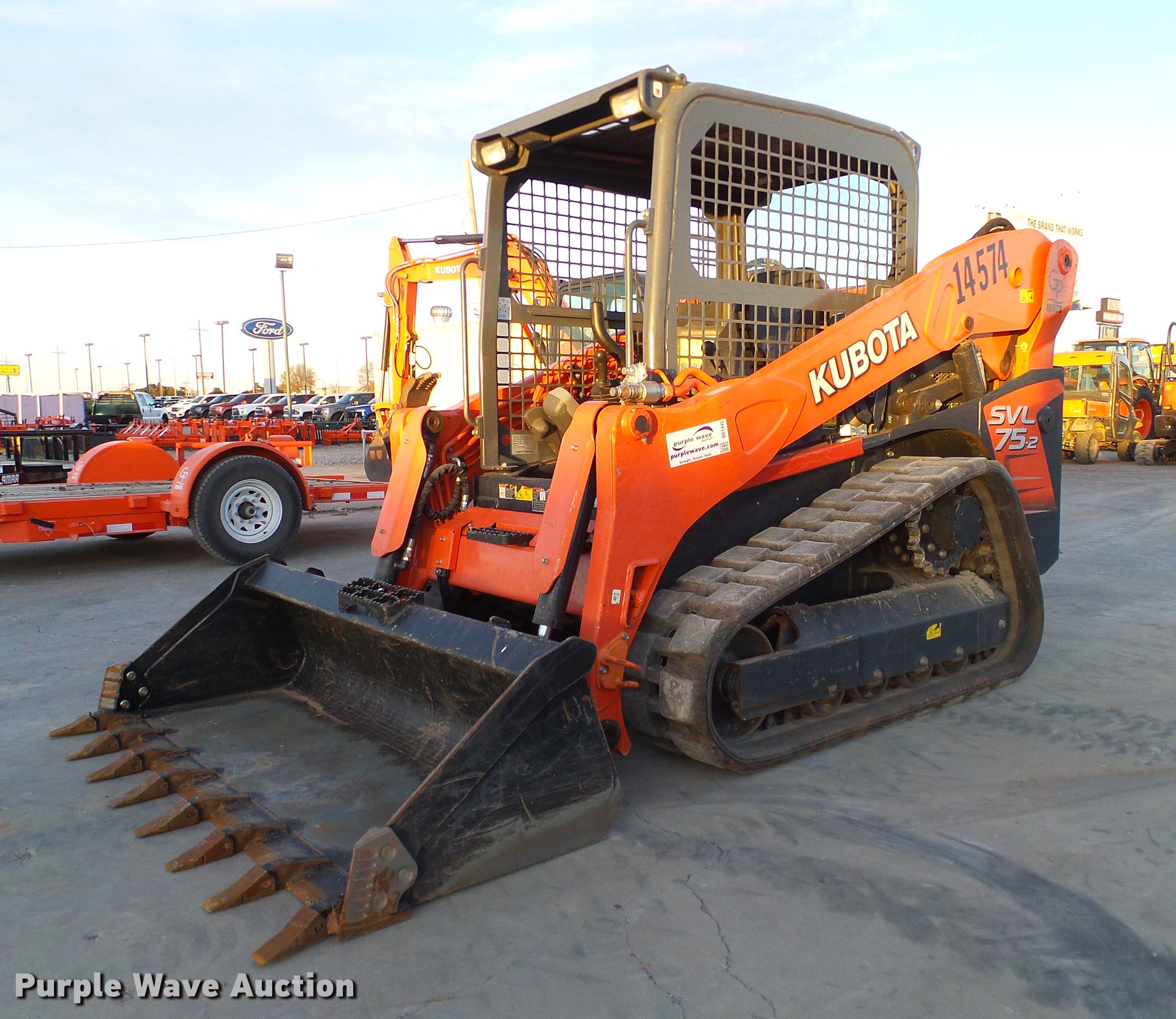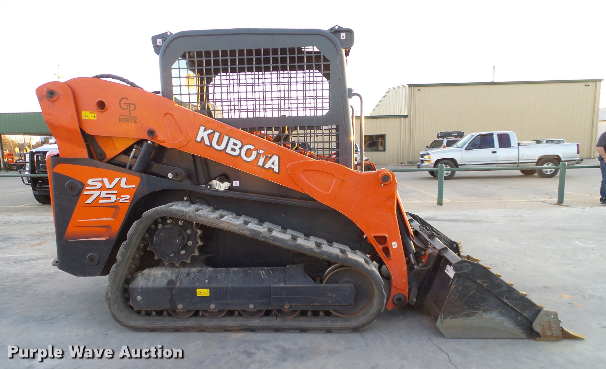 Purple Wave is selling a used Tracked Skid Steer Loader in Oklahoma. This item is a 2015 Kubota SVL75-2 skid steer with the following: 317 hours on meter, Kubota four cylinder turbo diesel engine, Two speed hydrostatic transmission, OROPS, Joystick controls, EMS panel, Air suspension seat, Front and rear work lights, Backup alarm, Auxiliary hydraulics, Hydraulic quick coupler, Kubota 74"W bucket, Bolt-on teeth, 15"W tracks, Serial 20906