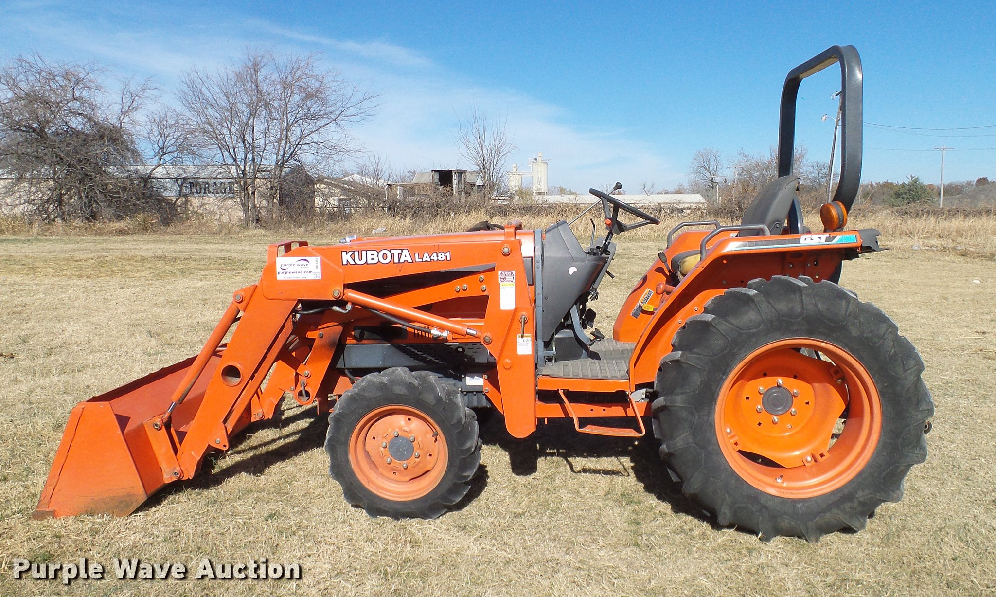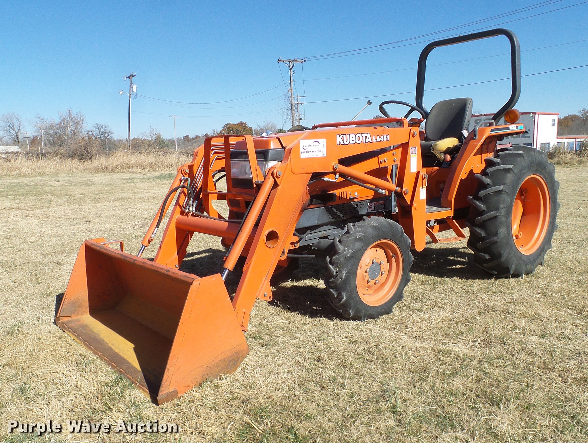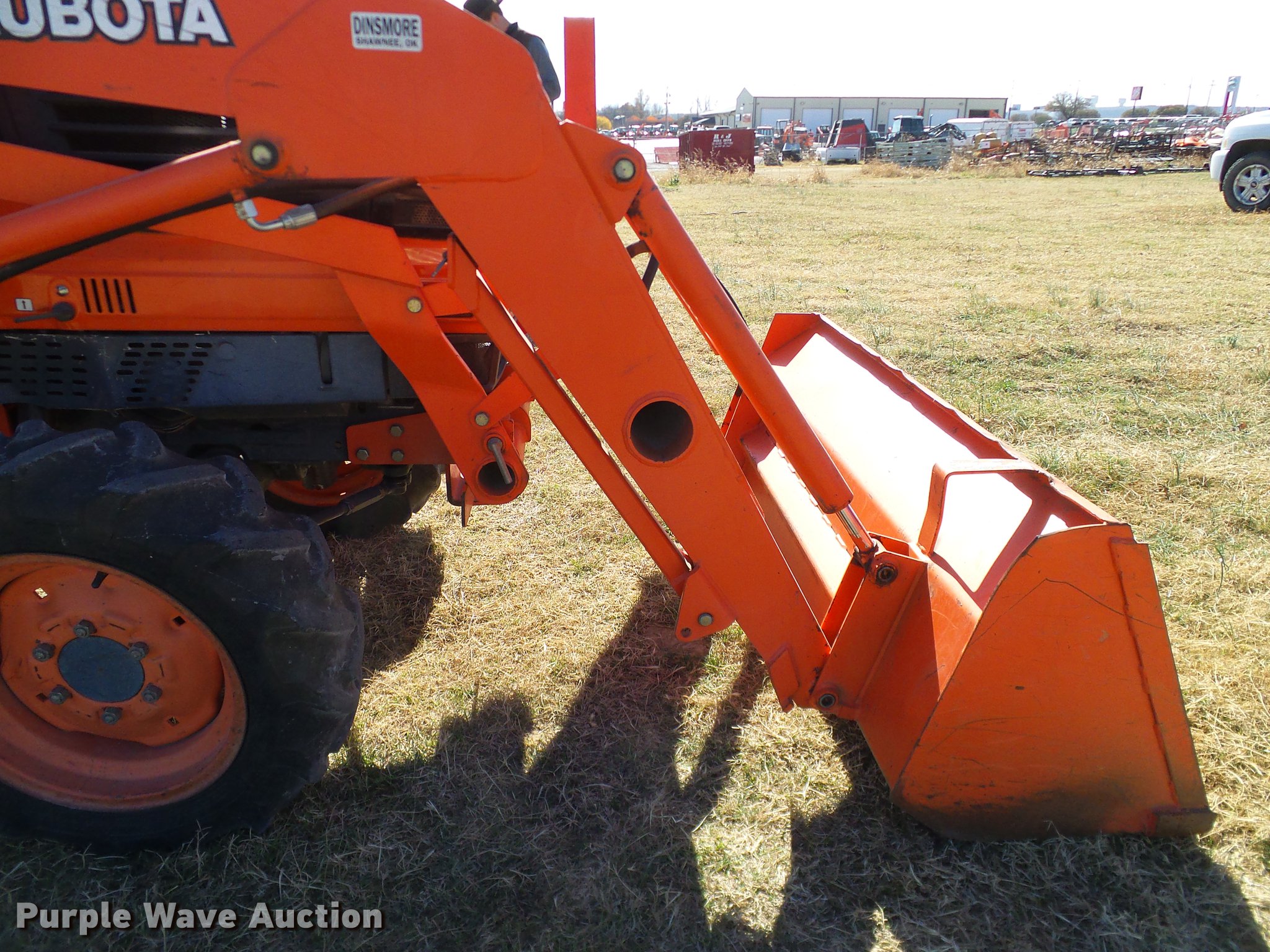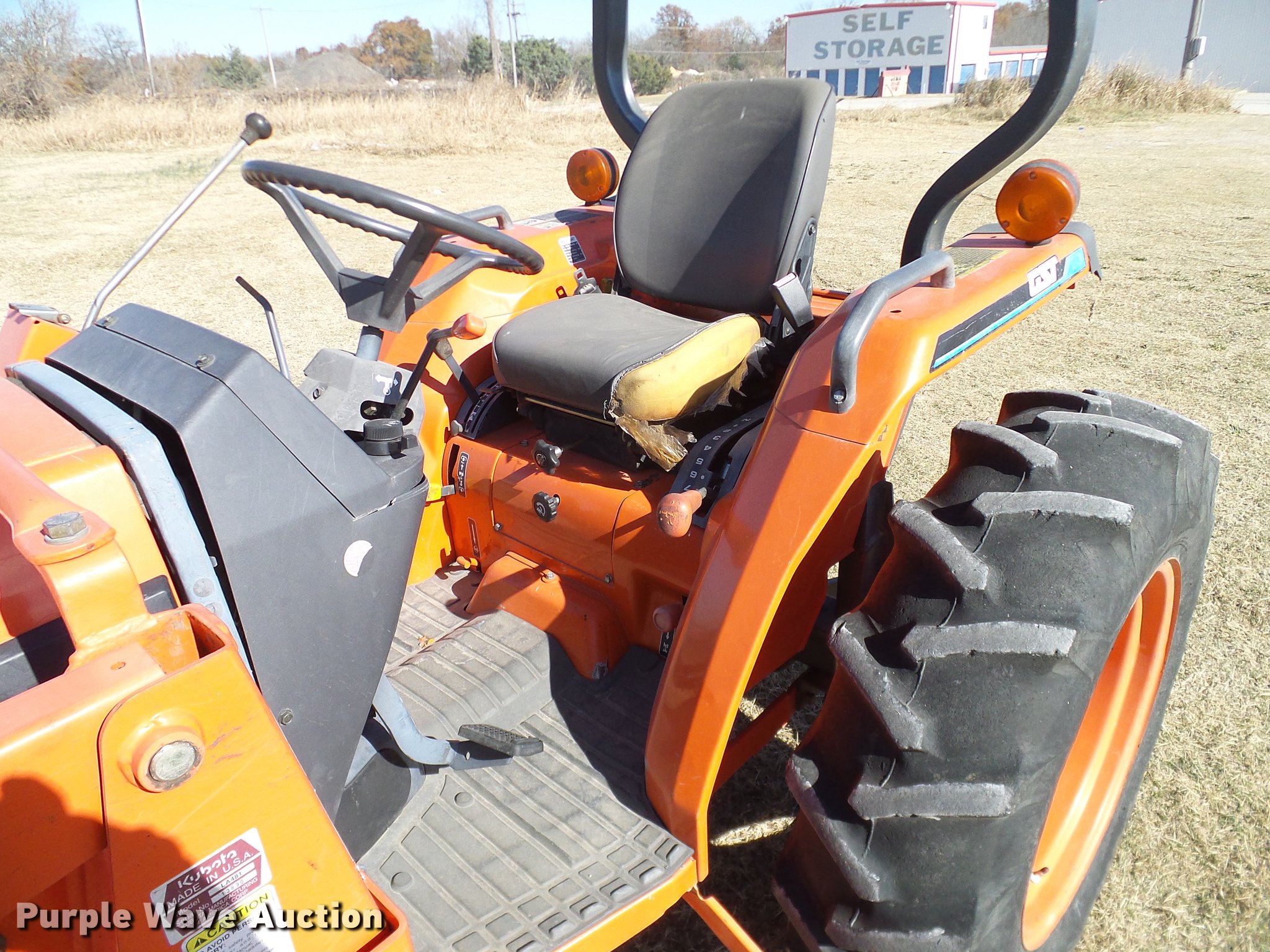 Purple Wave is selling a used Tractor in Oklahoma. This item is a Kubota L3010GST MFWD tractor with the following: 1,493 hours on meter, Kubota 1.5L three cylinder diesel engine, 32 HP, Glide transmission, 8F-8R gears, ROPS, Left-Hand reverser, Differential lock, Spring suspension seat, Tilt steering wheel, Kubota LA481 loader, 60"W bucket, Joystick loader control, Three point, 540 PTO, 92-16 front tires, 12.4-24 rear tires, Serial 0302