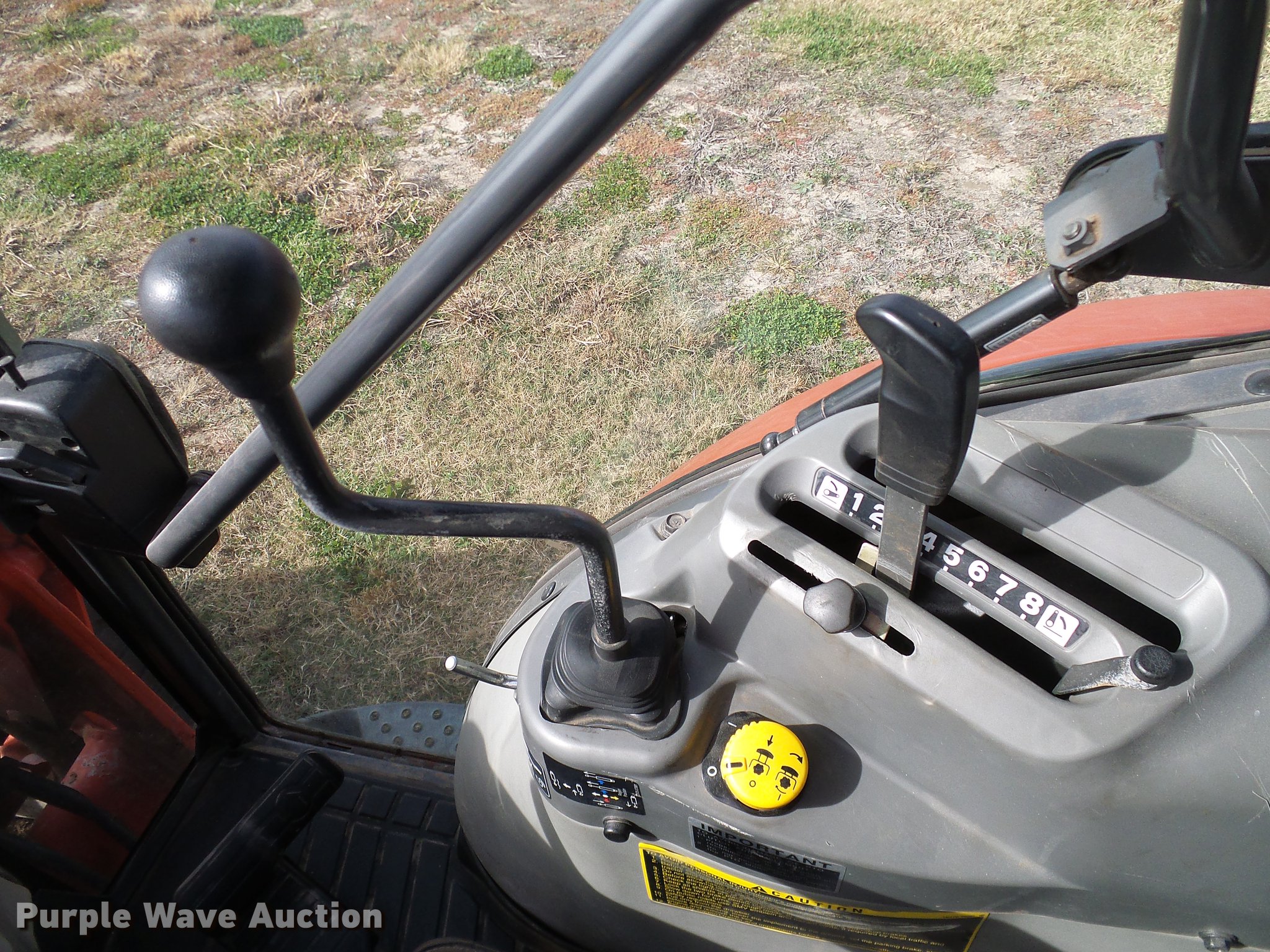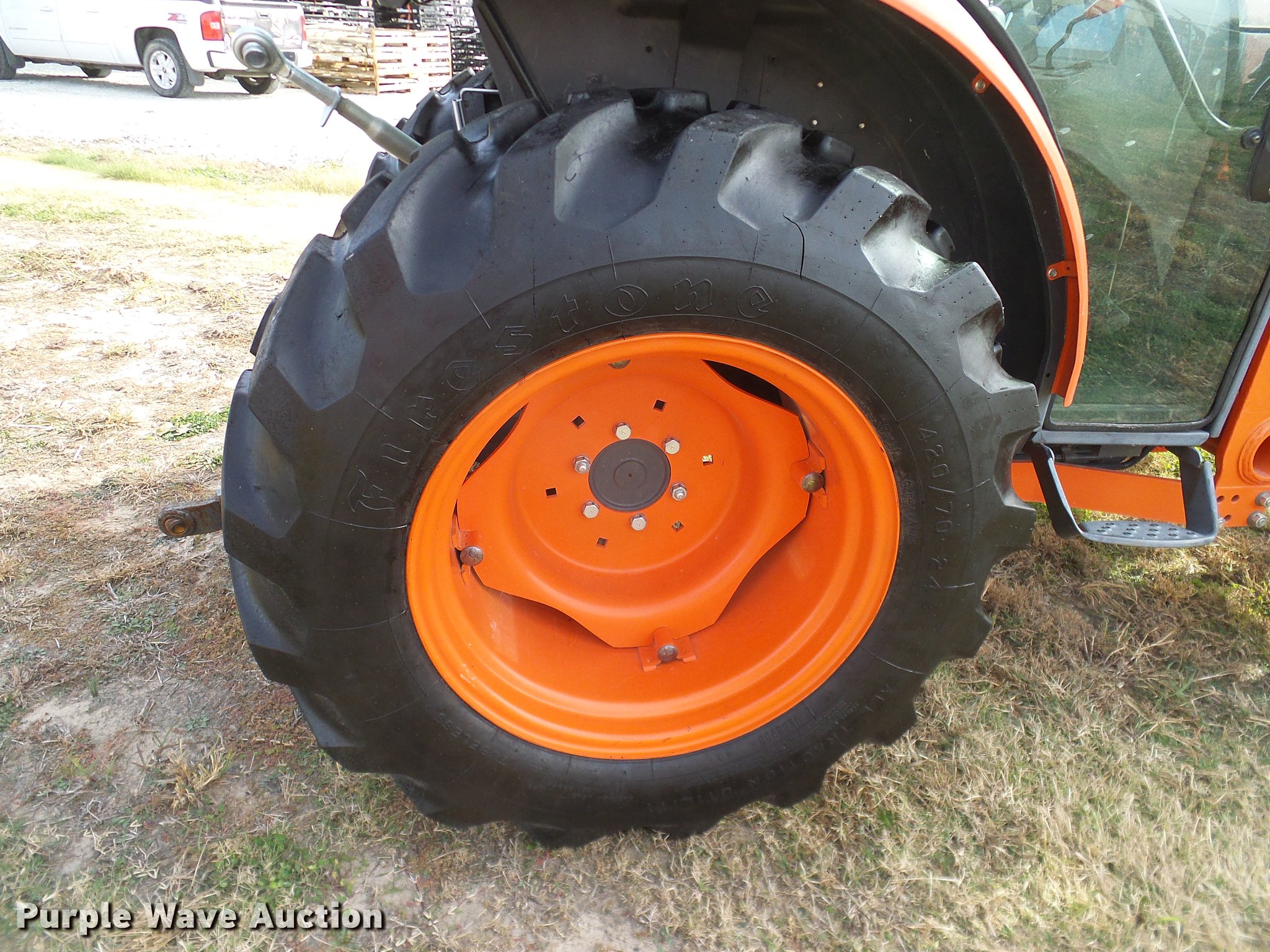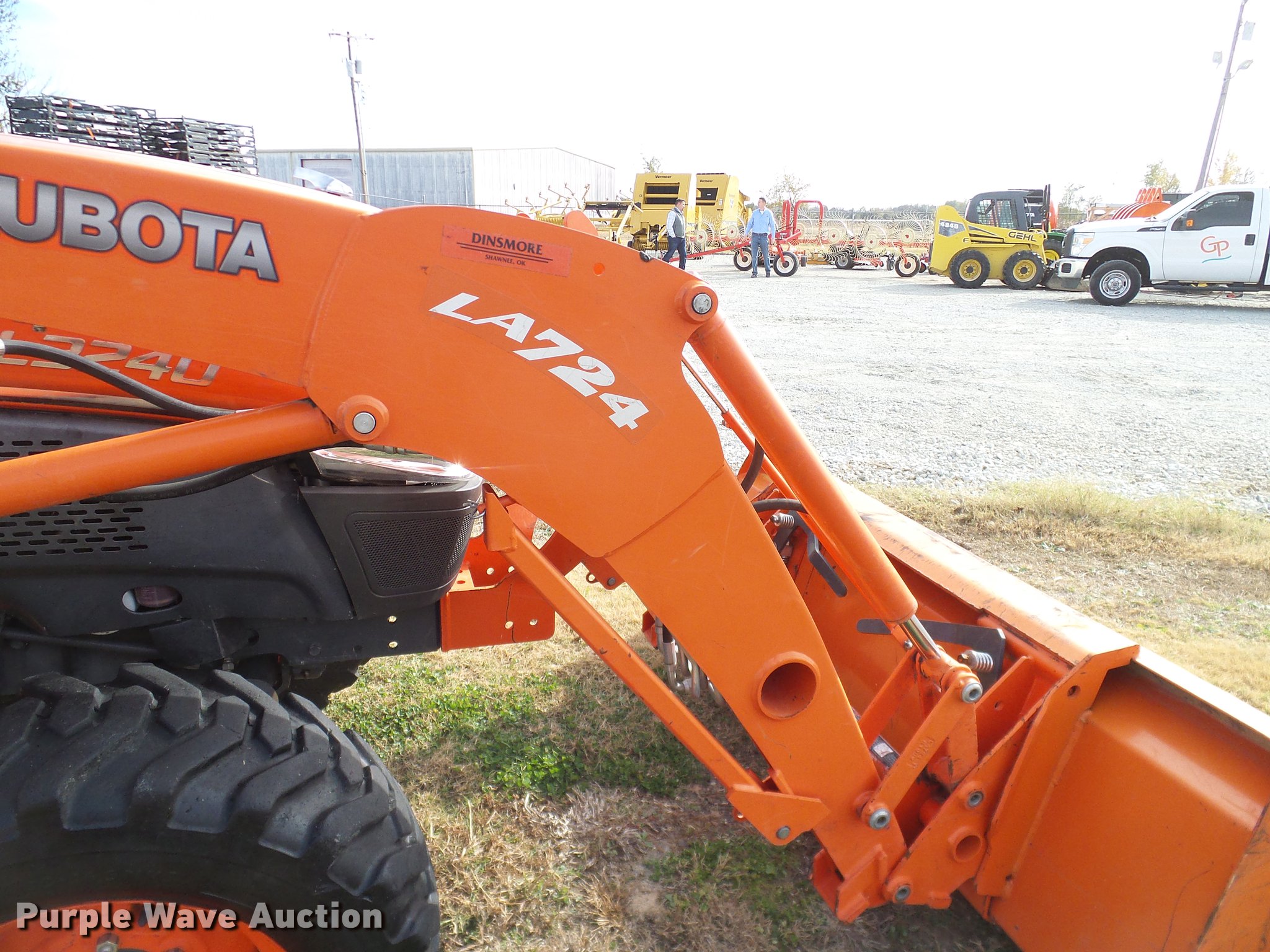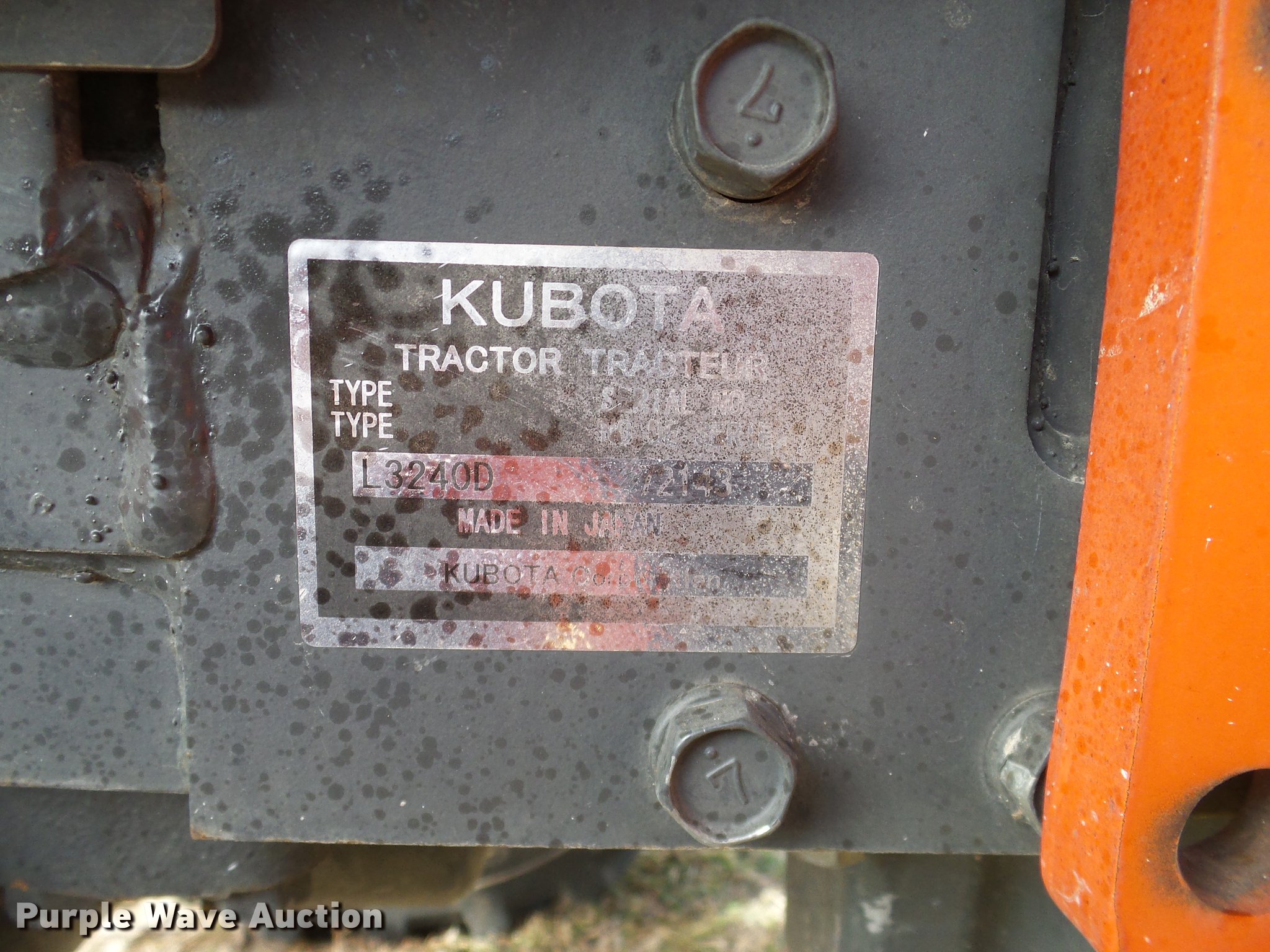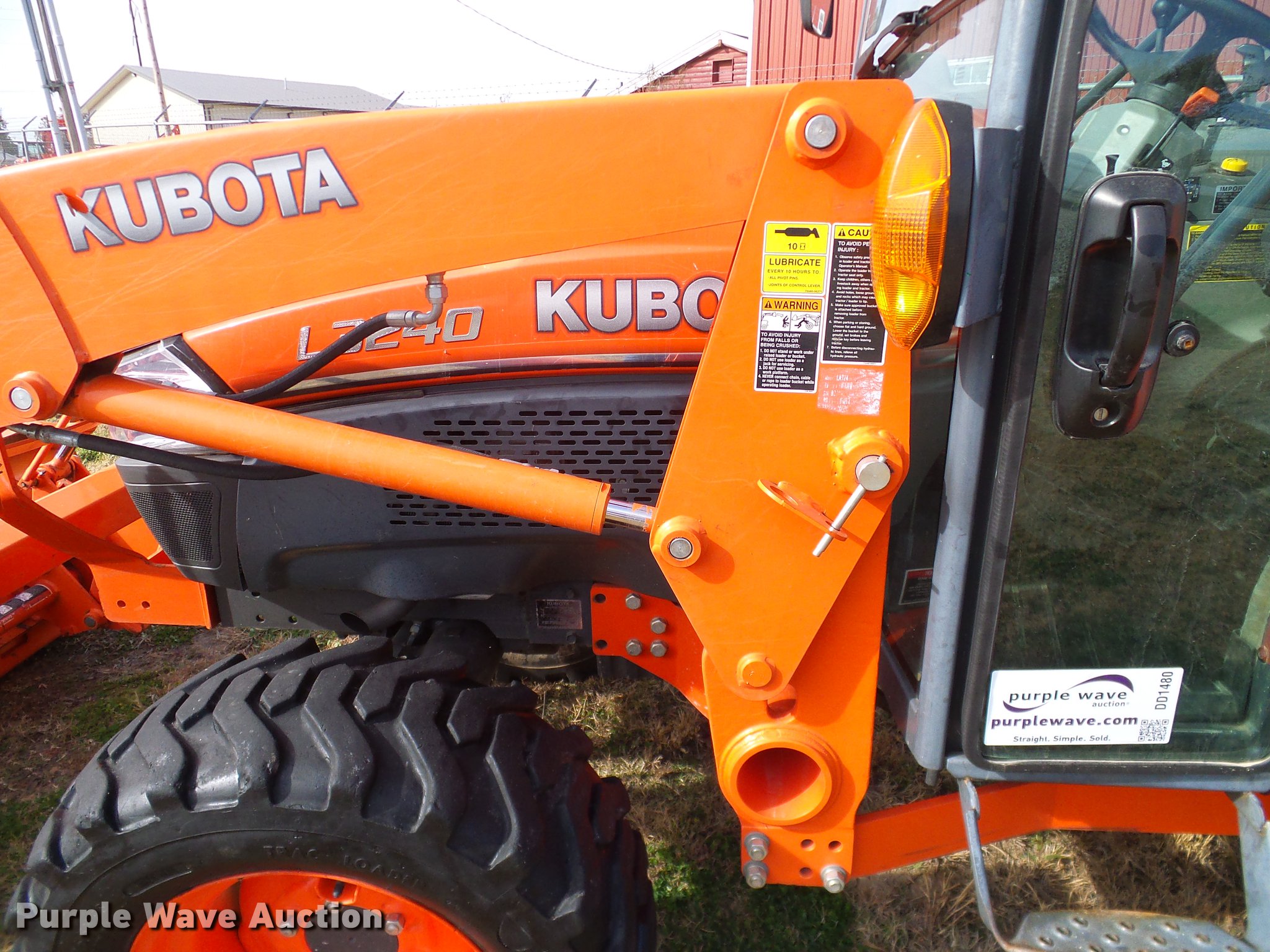 Purple Wave is selling a used Tractor in Oklahoma. This item is a 2011 Kubota L3240HSTC MFWD tractor with the following: 1,036 hours on meter, Kubota 1.6L three cylinder diesel engine, 34 HP, HST Plus hydrostatic transmission, 3F-3R gears, Differential lock, AC and heat, Tilt steering wheel, AM/FM/CD, Air suspension seat, Kubota LA724 loader, 72"W bucket, Quick attach, Joystick controls, Three point, Top link, 540 PTO, Draw bar, Work lights, 10-16.5 front tires, 420/70-24 rear tires, 71" wheel base, Serial 72143