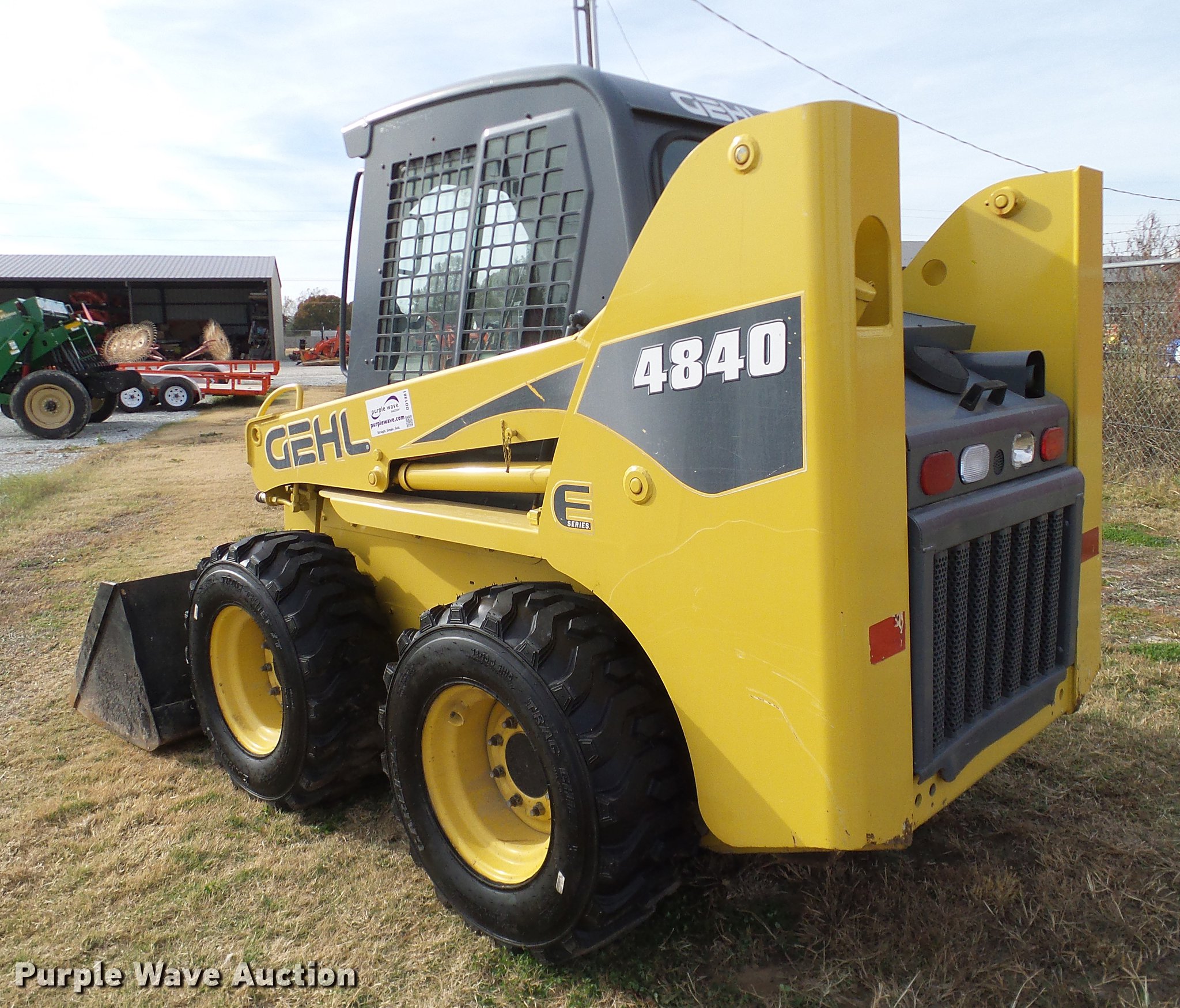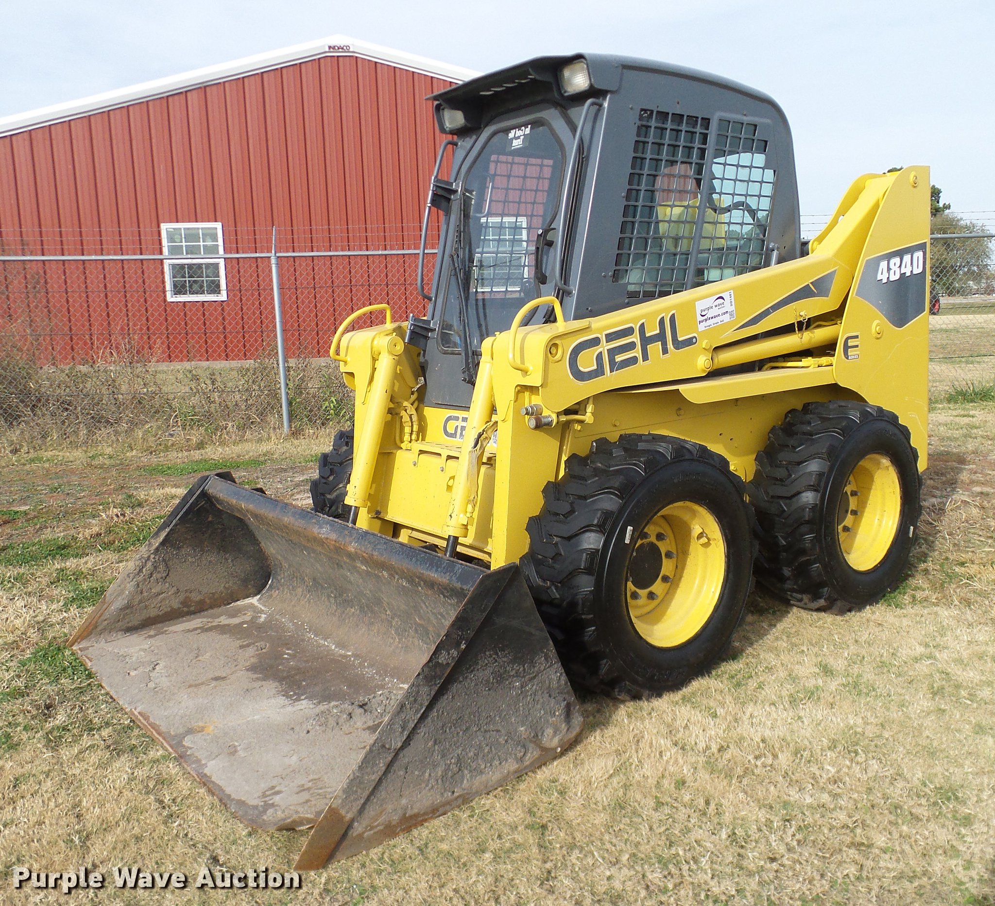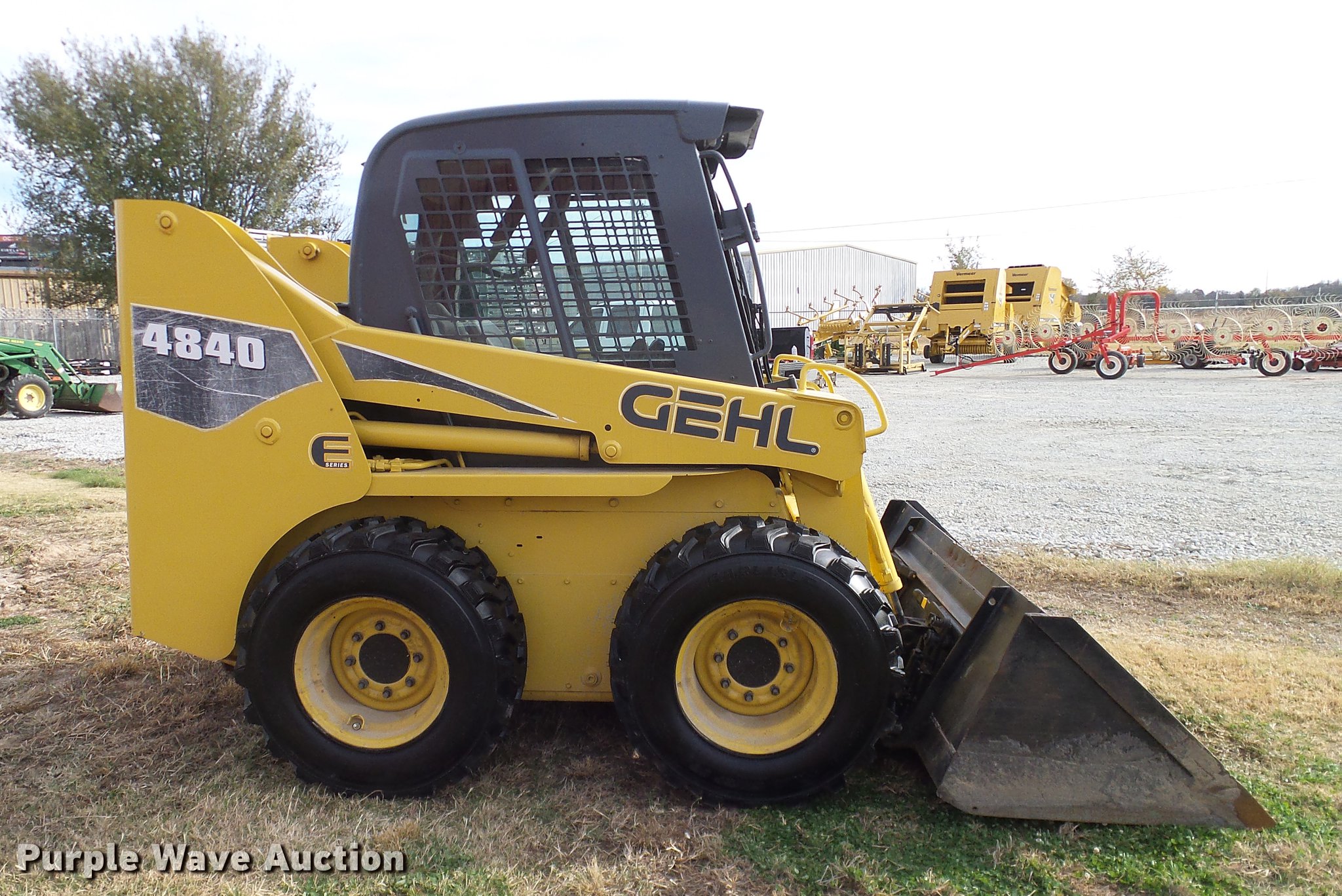 Purple Wave is selling a used Skid Steer Loader in Oklahoma. This item is a 2005 Gehl 4840E skid steer with the following: 1,027 hours on meter, Deutz F4M2011 four cylinder diesel engine, 60 HP, Serial 10054317, Hydrostatic transmission, Enclosed cab, AC and heat, AM/FM, Hand and foot controls, Front and rear work lights, Wipers, Auxiliary hydraulics, Manual quick coupler, 73"W bucket, Carlisle 12-16.5 tires, Serial GHL04840H00408789