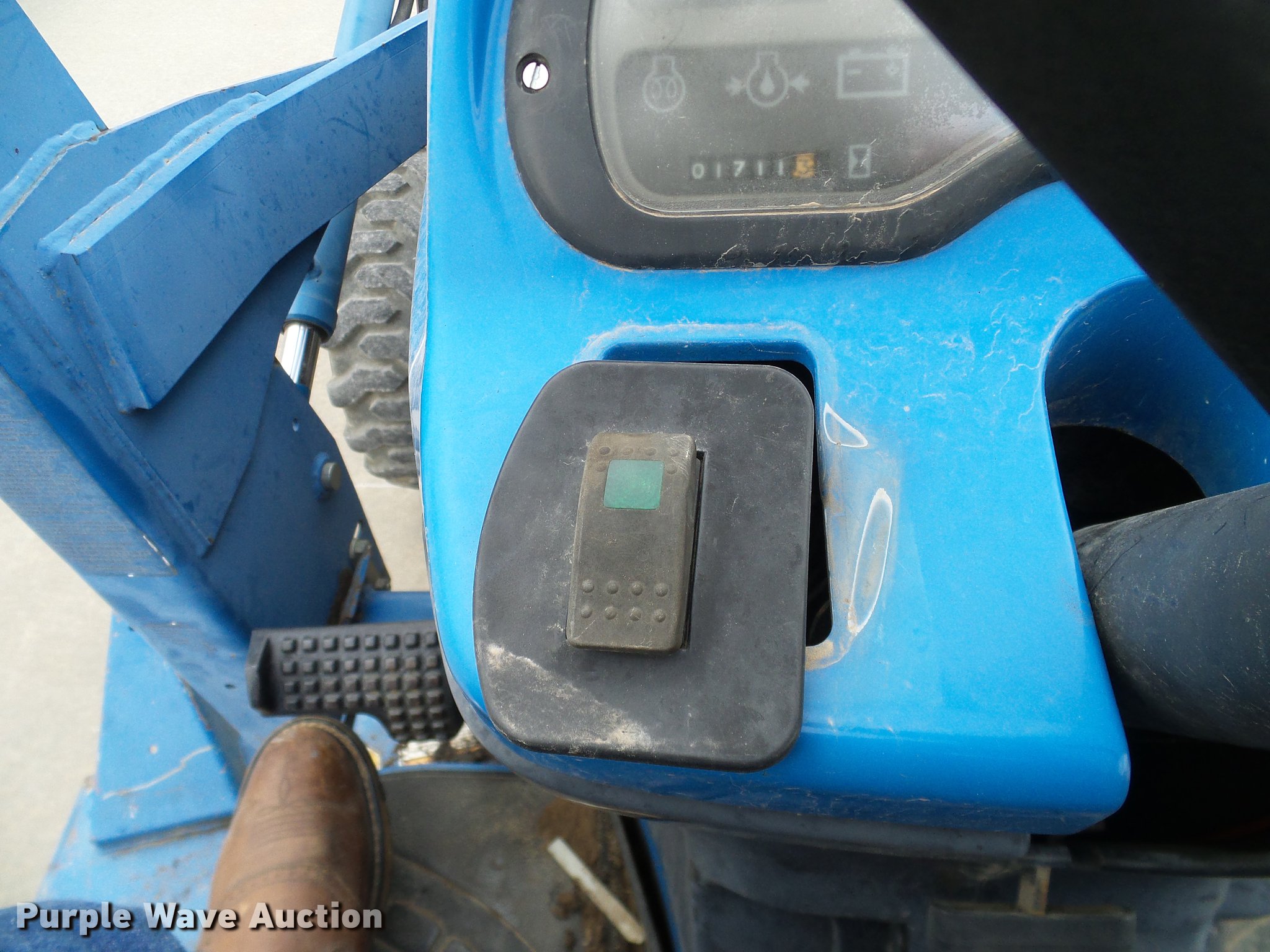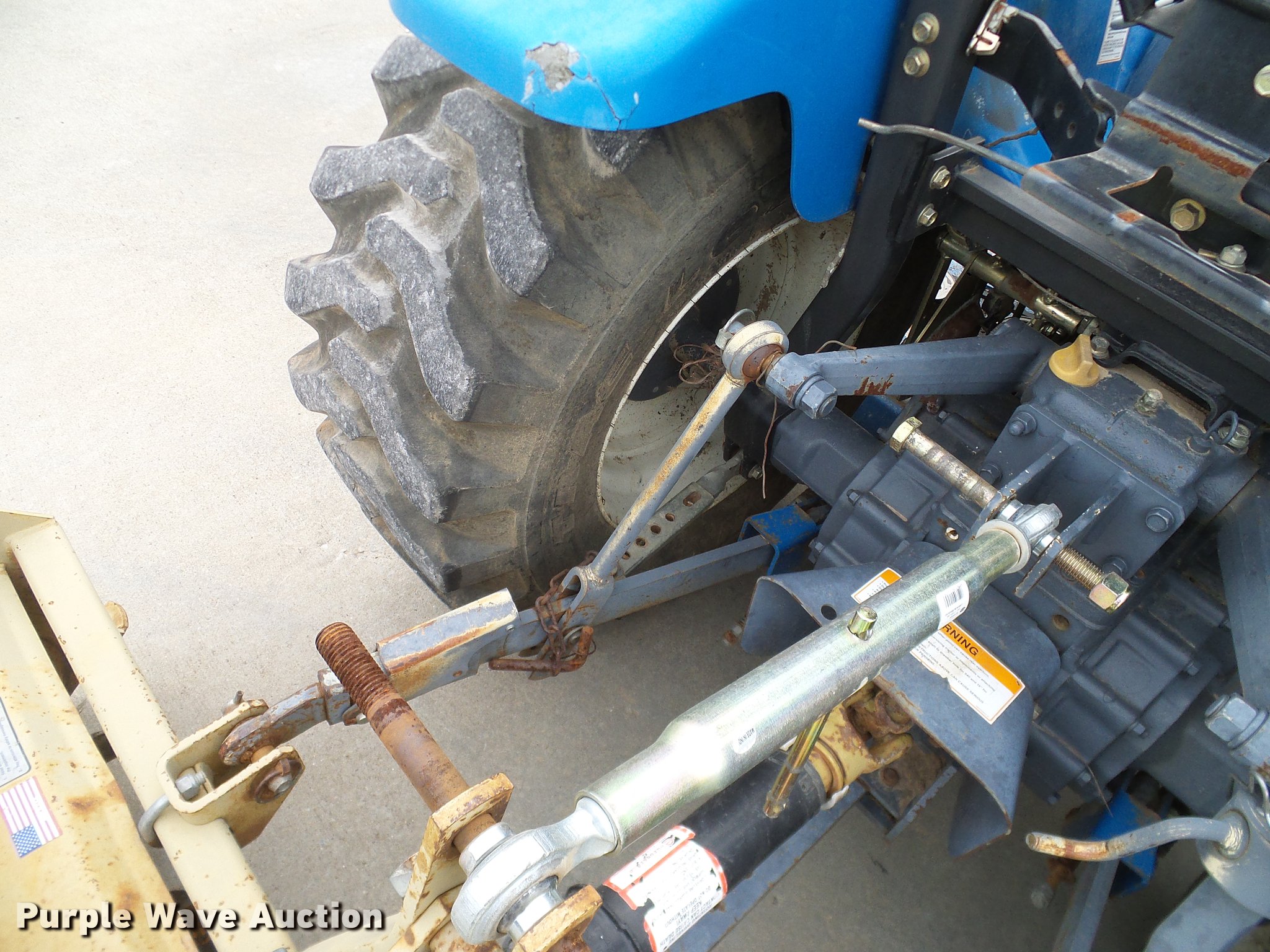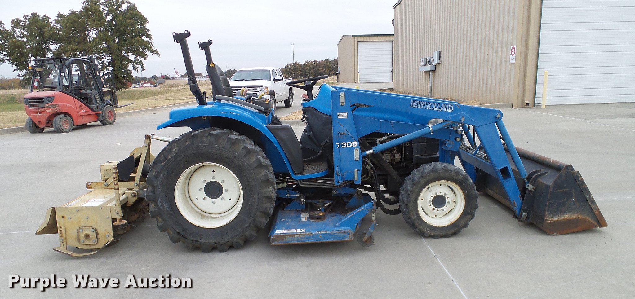 Purple Wave is selling a used Tractor in Oklahoma. This item is a 1999 New Holland TC29D Deluxe MFWD tractor with the following: 1,711 hours on meter, Shibura 1.3L three cylinder diesel engine, 29 HP, Serial 61379, Hydrostatic transmission, 3F-3R gears, Differential lock, Tilt steering wheel, Suspension seat, New Holland 7308 loader, 61"W bucket, Joystick controls, Three point, Top link, 540 PTO, Work lights, Land Pride RTA1058 rototiller, 58"W, 540 PTO, Three point, 72"W mid-mounted mower deck, 25x8.50-14 front tires, 15x195 rear tires, Top section of ROPS missing, Serial G014007