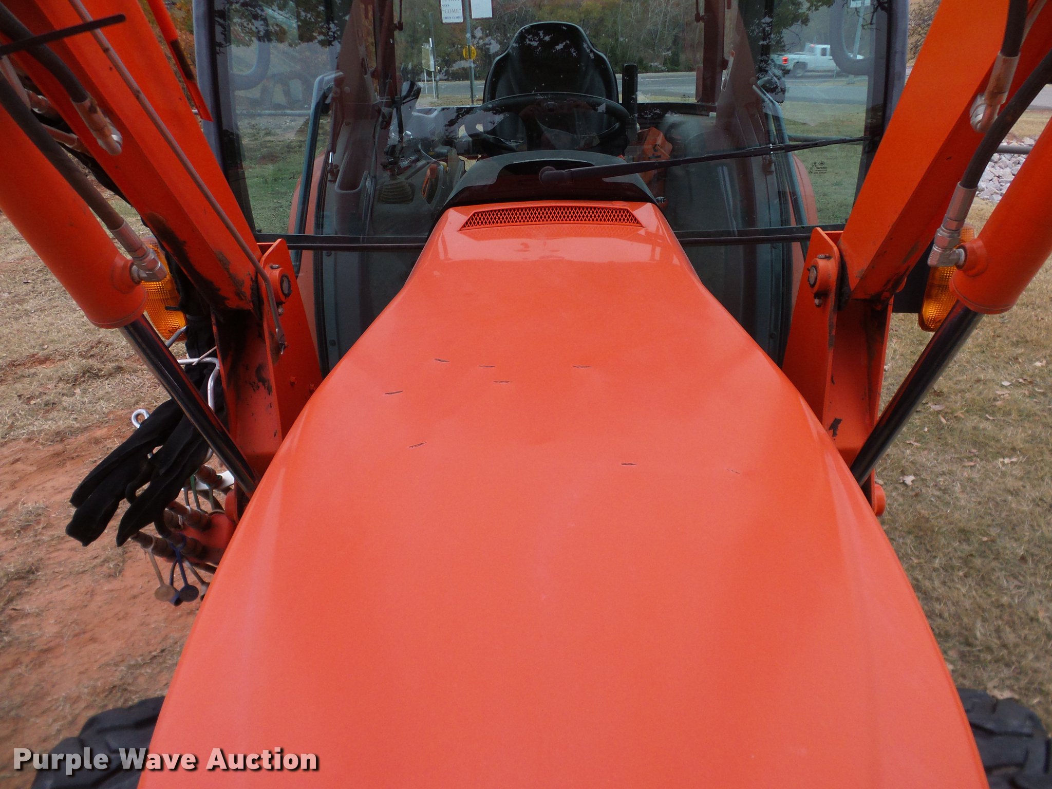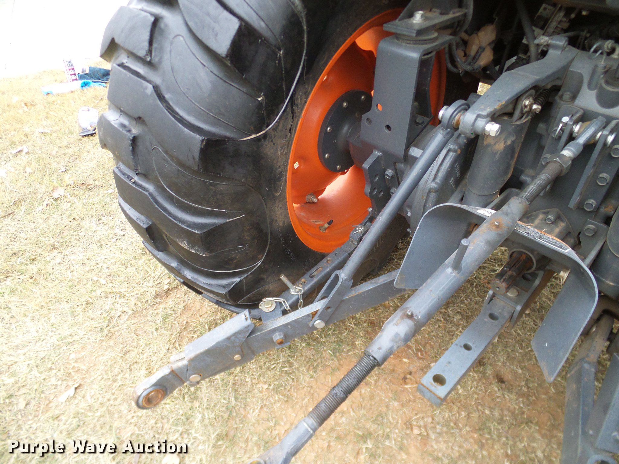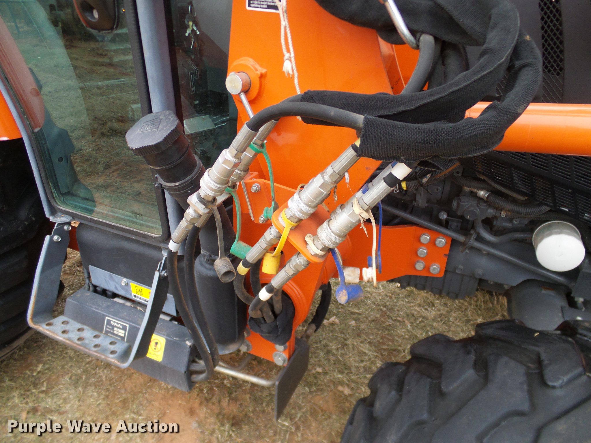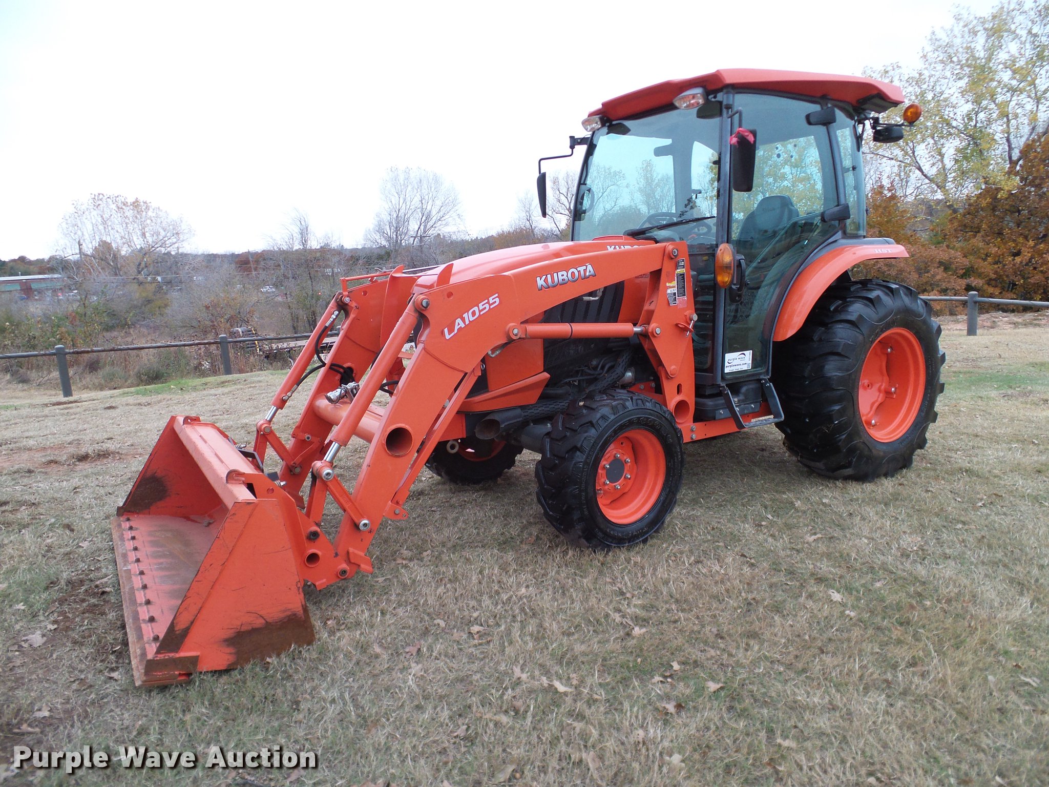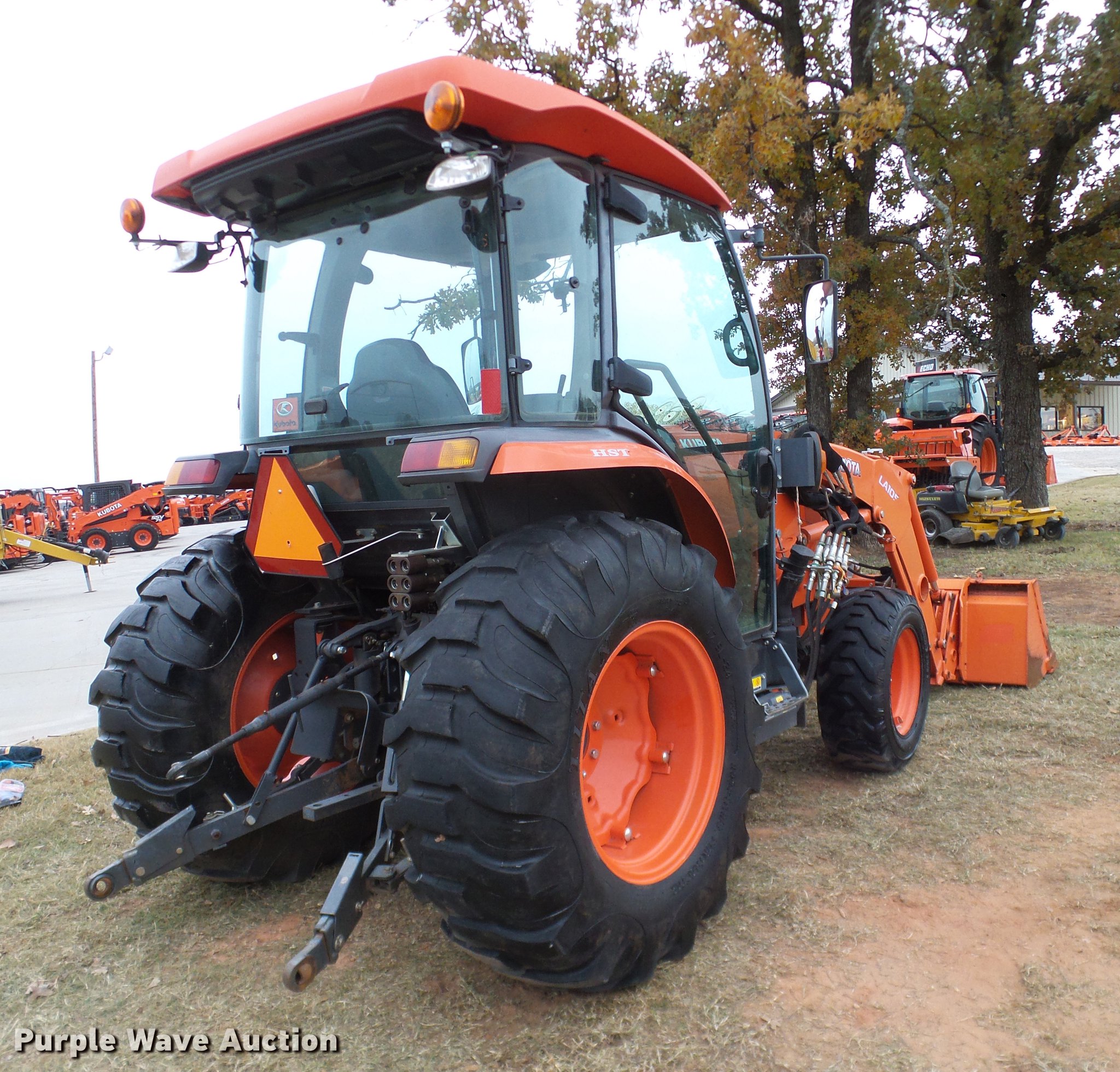Purple Wave is selling a used Tractor in Oklahoma. This item is a 2014 Kubota L5460HSTC MFWD tractor with the following: 1,867 hours on meter, Kubota 2.4L four cylinder turbo diesel engine, 54 HP, HST Plus hydrostatic transmission, 3F-3R gears, Differential lock, AC and heat, Tilt steering wheel, AM/FM/CD, Air suspension seat, Kubota LA1055 loader, 72"W bucket, Quick attach, Joystick controls, Auxiliary loader hydraulics, Three point, Top link, Draw bar, 540 PTO, (3) rear hydraulic remotes, 265/70R16.5 front tires, 17.5-24 rear tires, 74" wheel base, Serial 400132