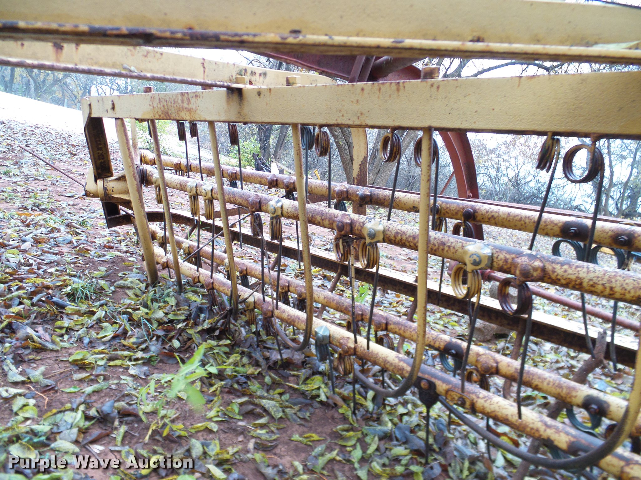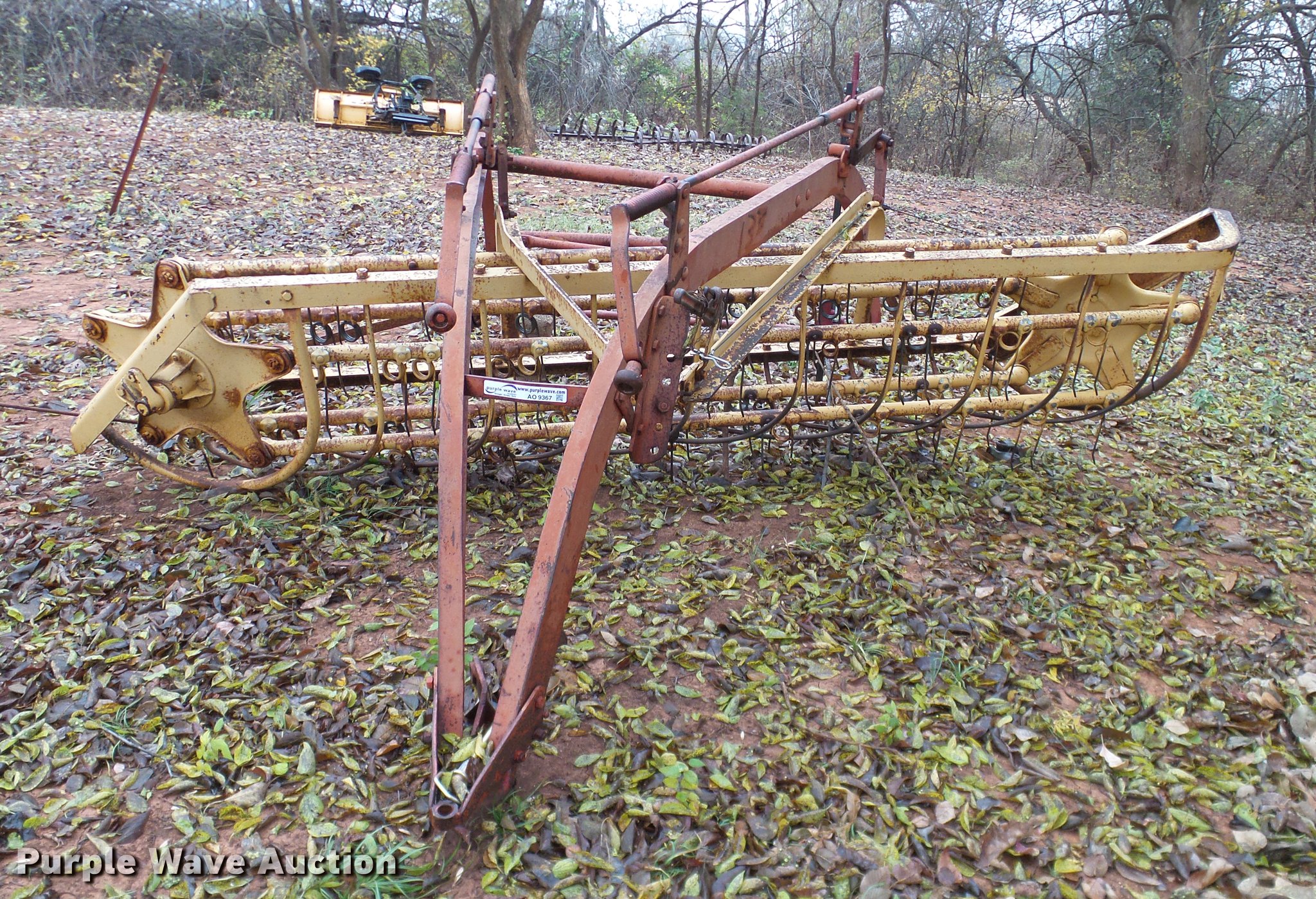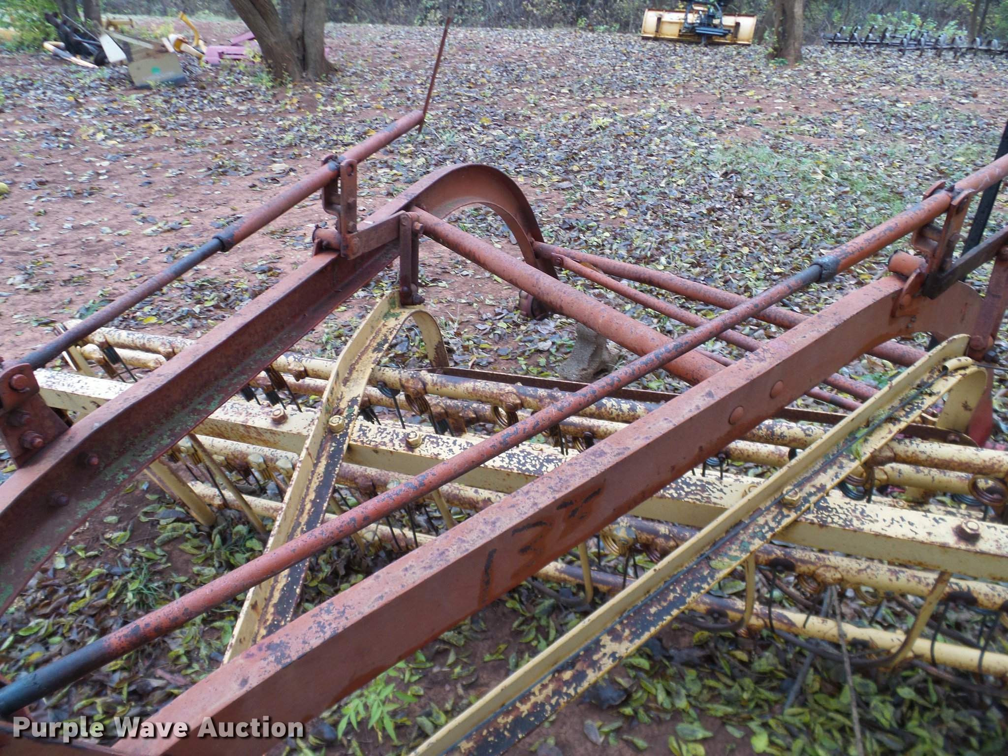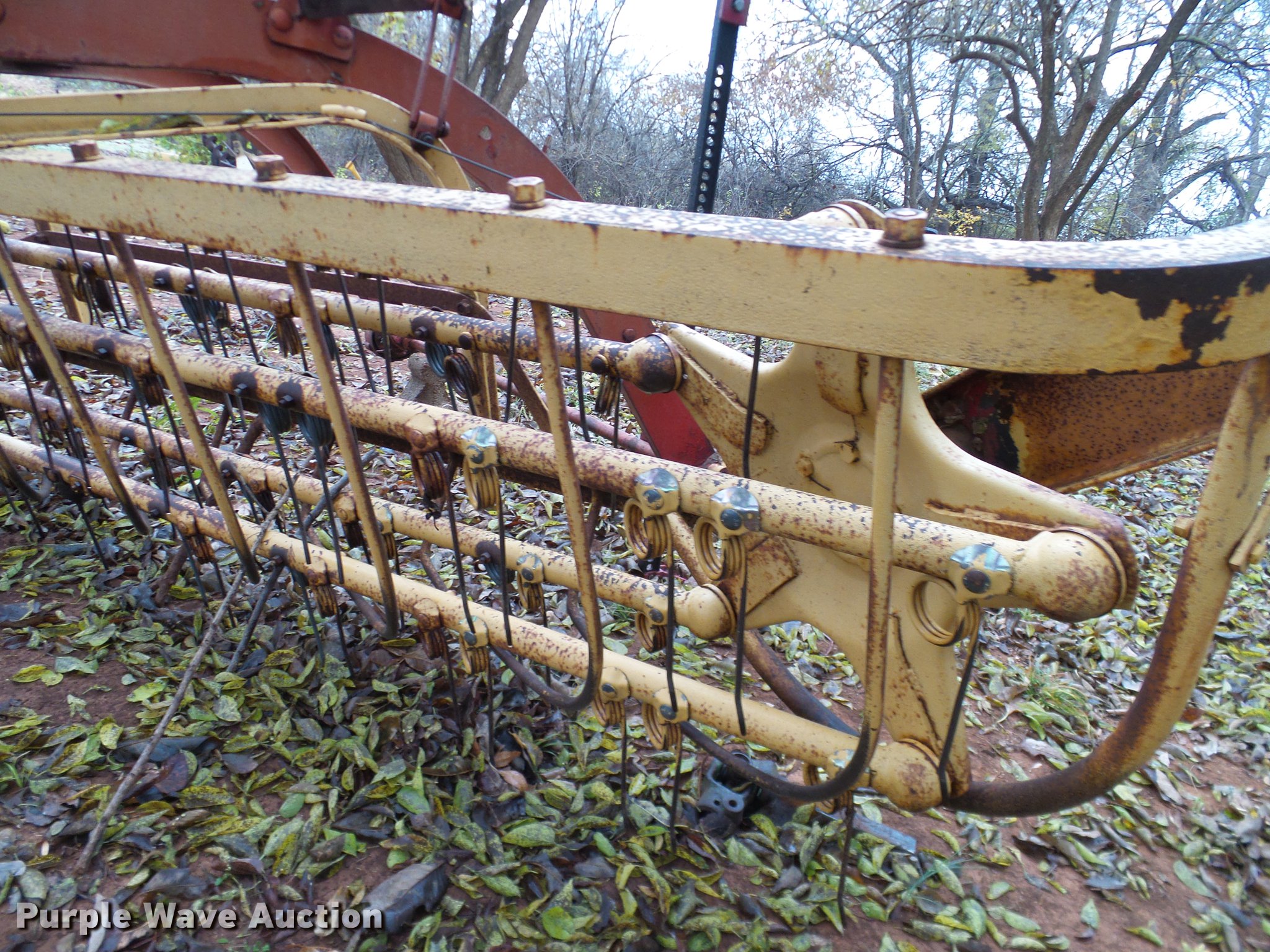 Purple Wave is selling a used Hay Rake in Oklahoma. This item is a New Holland 55 hay rake with the following: 10'W, Steel tines, Ground driven, Pin hitch, No tires or wheels, Hi-lift jack not included, Serial 21540