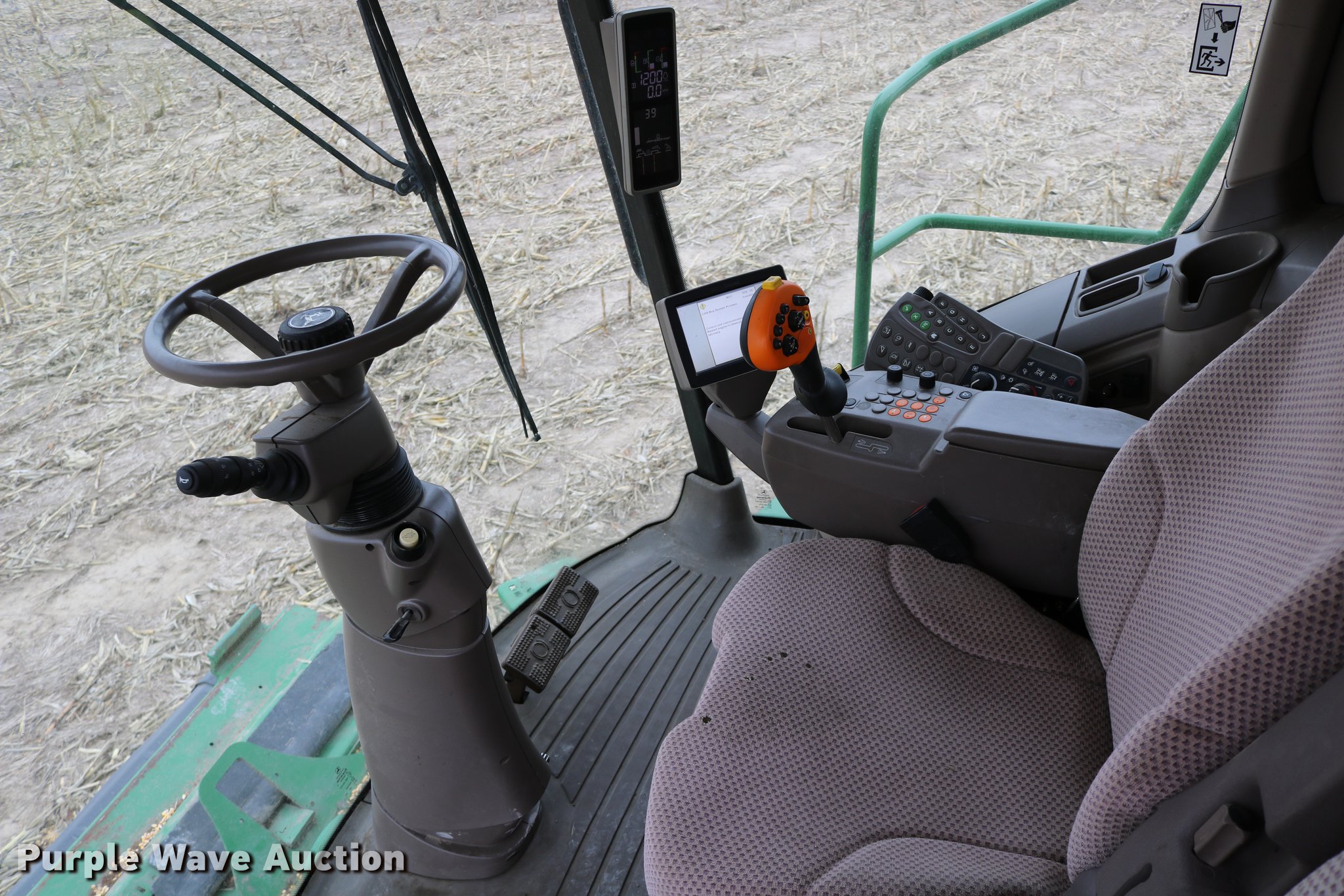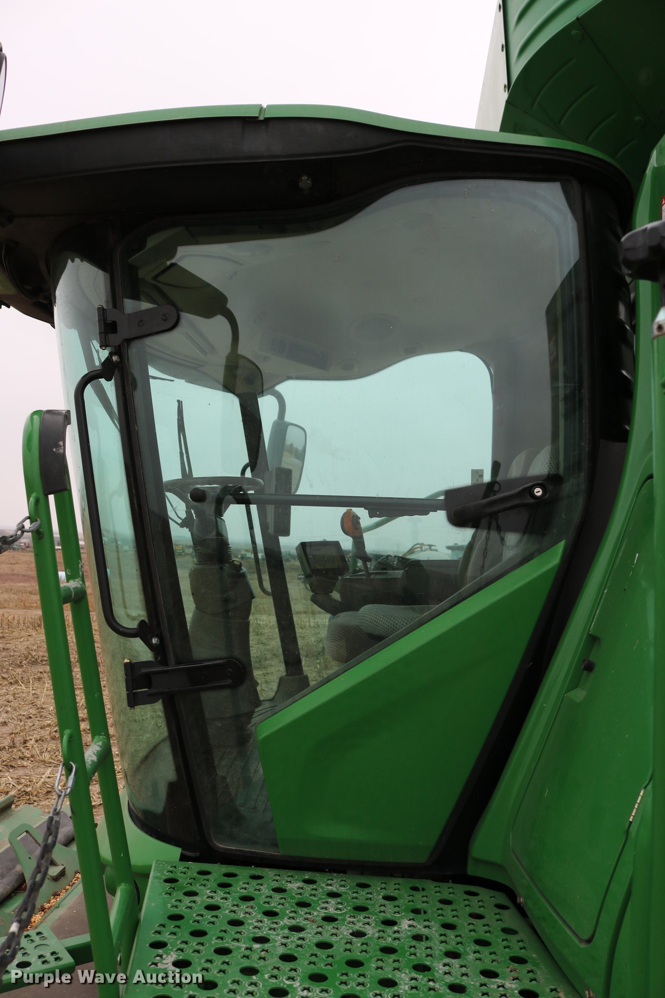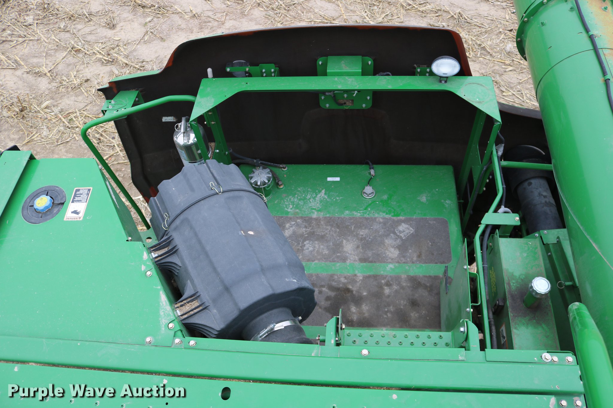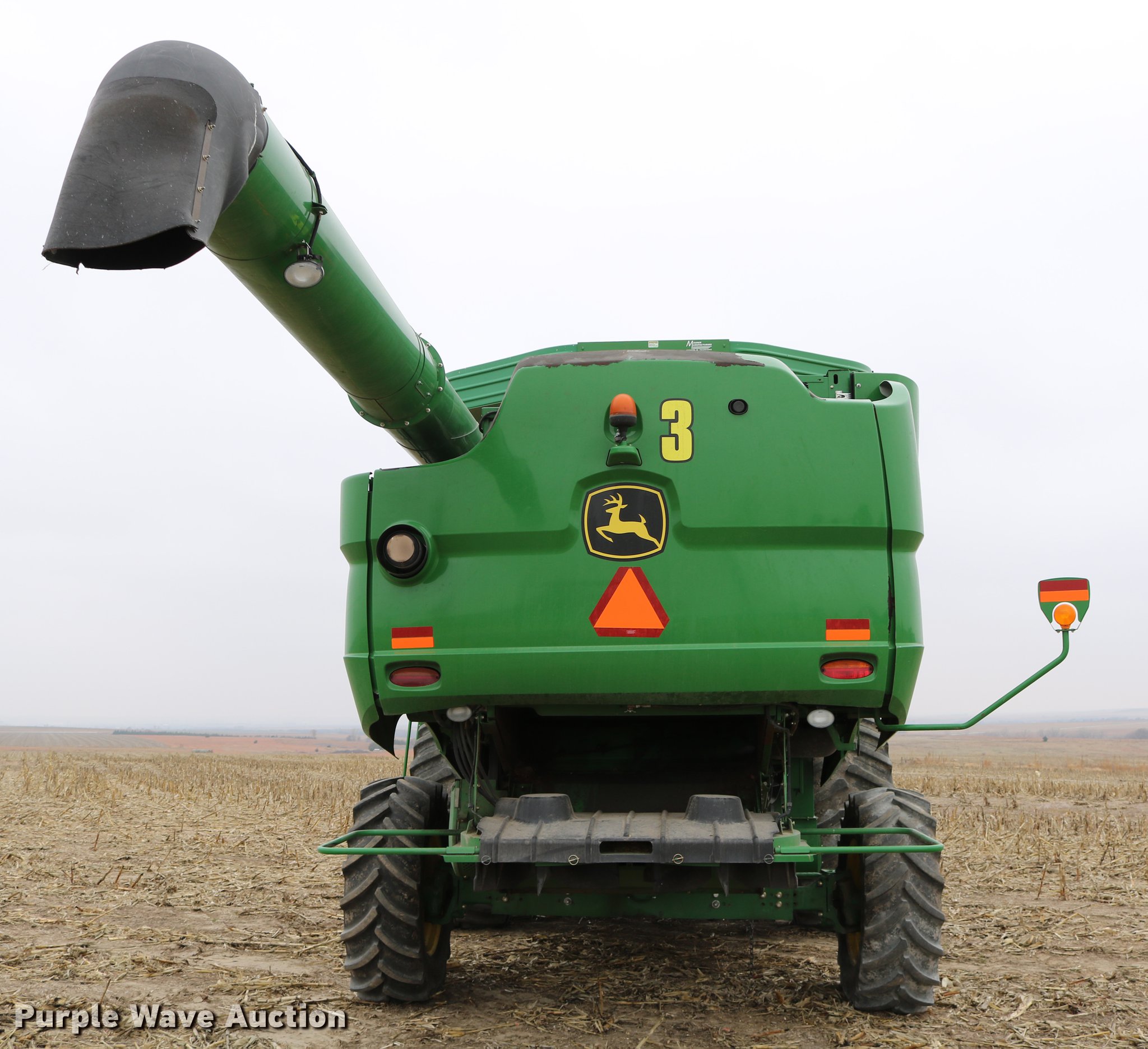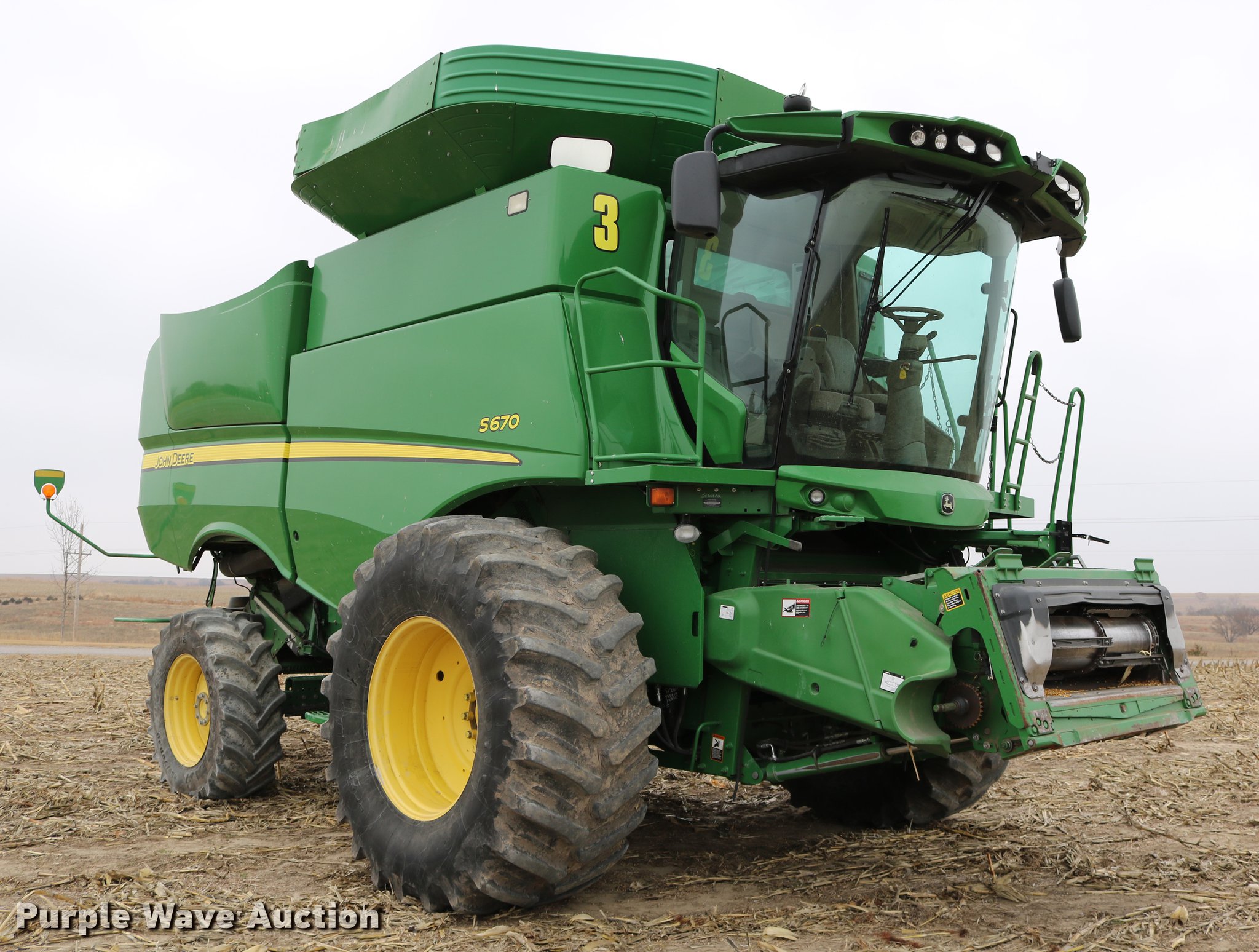 Purple Wave is selling a used Combine in Kansas. This item is a 2013 John Deere S670 STS combine with the following: 1,434 engine hours on meter, 979 separator hours on meter, John Deere 9.0L six cylinder turbo diesel engine, ProDrive hydrostatic transmission, 3F-1R gears, Feederhouse, Lateral tilt, Variable speed, Reverser, Custom cutter extended wear package, Single point header coupler, AC and heat, Tilt steering wheel, AM/FM, Suspension seat, Instructor's seat, Visor, GreenStar ready, Yield monitor, Round concaves, Two speed rotor, Chaff spreader, Straw chopper, Power tailboard, Maurer bin extensions, 25' unloading auger length, S-series cleaning shoe, Work lights, 800/70R38 front tires, 480/70R30 rear tires, Operators manual, Serial 1H0S670SHD0756635, Unit# 3