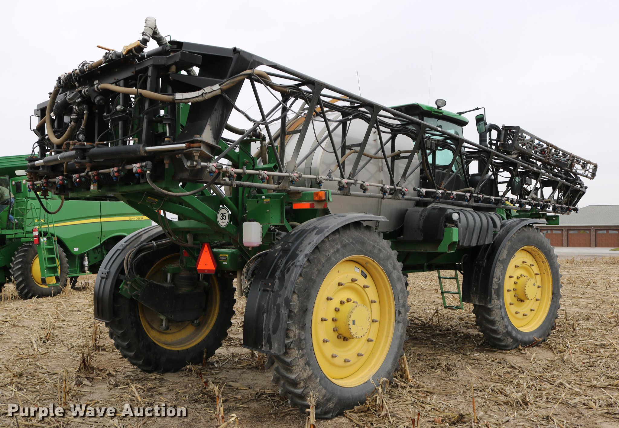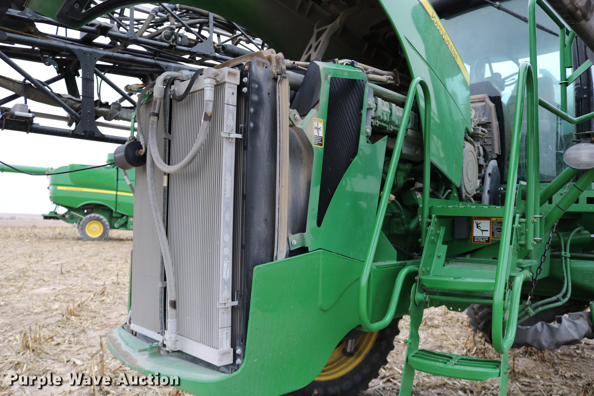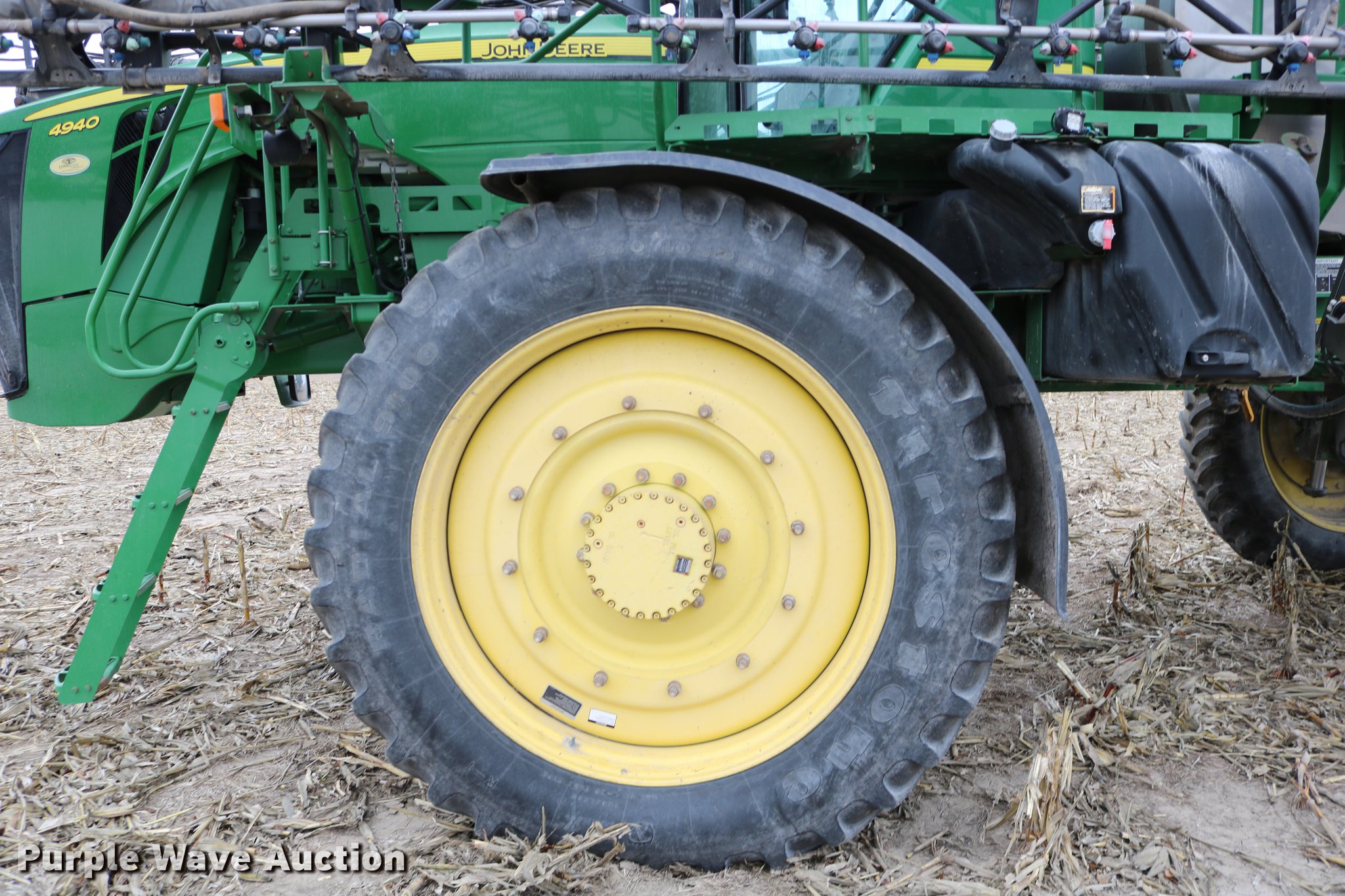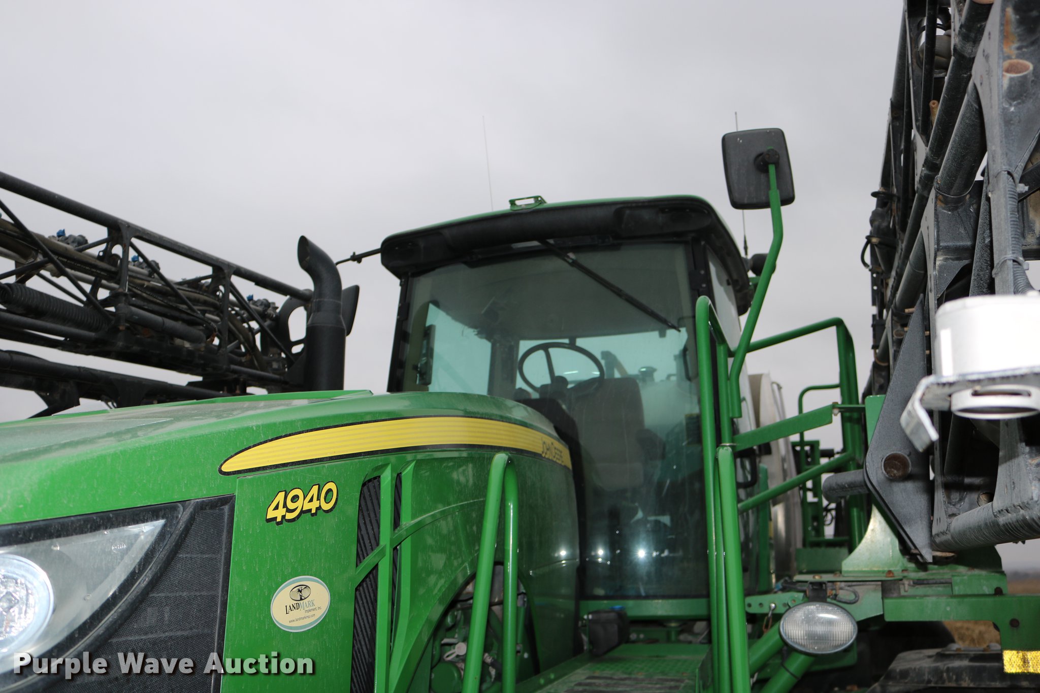Purple Wave is selling a used Applicator Self Propelled in Kansas. This item is a 2012 John Deere 4940 self-propelled sprayer with the following: 1,474 engine hours on meter, 466 spray hours on meter, John Deere 9.0L six cylinder turbo diesel engine, Serial RG6090R006147, Hydrostatic transmission, Four wheel drive, 1,200 gallon stainless steel solution tank, Five gallon stainless steel chemical eductor tank, 170 gallon rinse tank, 1.5 gallon foam maker tank, 120'W boom, Seven boom sections, Break-away boom, Hydraulic boom fold, Hydraulic height control, Automatic height control, 15" nozzle spacing, Five-way nozzle bodies, Right side fence row nozzles, Swath control, AC and heat, AM/FM, Suspension seat, Work lights, GPS monitor, John Deere spray controls, Auto steer, Ground radar, Block heater, Hydraulic ladder, Fenders, Belly shield, Hydraulic axle width adjust, 380/105R50 row crop tires, Serial 1N04940XCB0018066