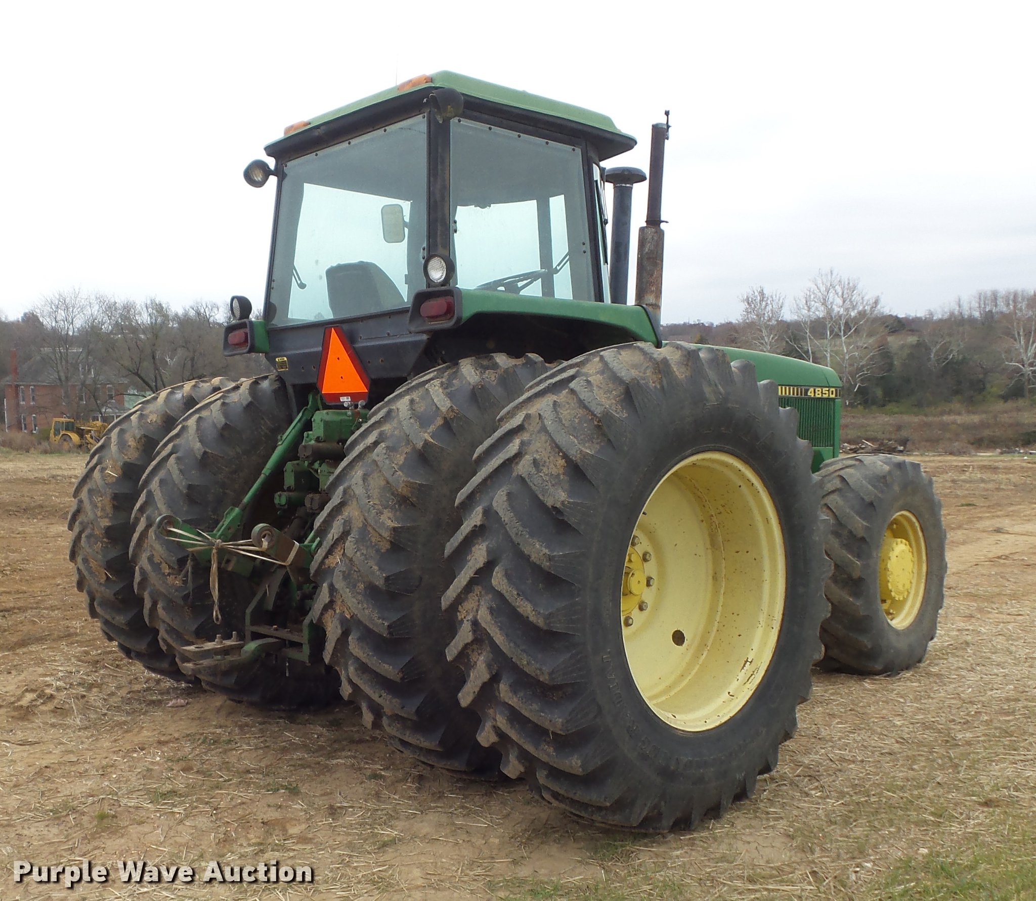 Purple Wave is selling a used Tractor in Missouri. This item is a 1984 John Deere 4850 MFWD tractor with the following: 10,253 hours on meter, John Deere 6466AR-17 7.6L six cylinder turbo diesel engine, Serial 267741, Powershift transmission, 15F-3R gears, Differential lock, AC and heat, AM/FM, Hydraulic suspension seat, Tilt steering wheel, Three point, 1000 PTO, Seven pin outlet, (3) rear hydraulic remote sets, Suitcase weights, 18.4R26 front tires, 520/85R38 dual rear tires, Transmission oil leak at flywheel housing, Possible seal issue, Serial RW4850P005313
