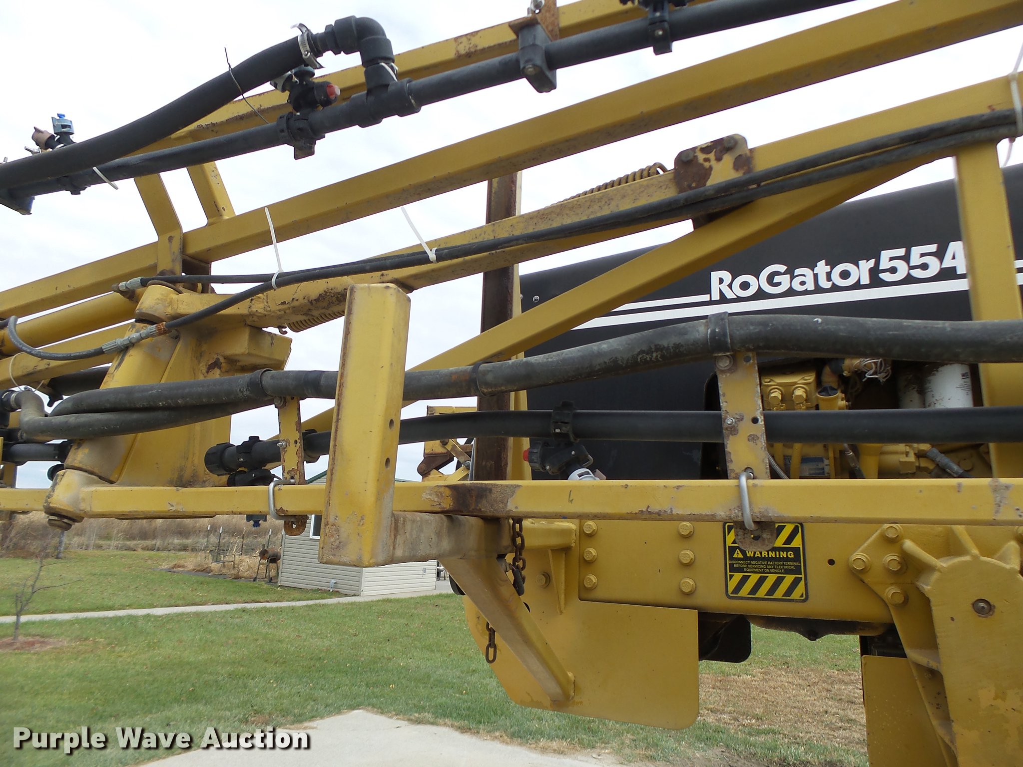 1997 Rogator 554 self-propelled sprayer. 5,859 hours on meter, Cummins six cylinder turbo diesel engine, Hydrostatic transmission, Four wheel drive, 500 gallon poly solution tank, 80'W boom Auto boom, Five boom sections, Hydraulic boom fold, 20" nozzle spacing, AC and heat, Suspension seat, Work lights, Outback KS3 GPS monitor, GPS receiver, Raven SCS460 spray controls, Auto steer, 320/85R38 row crop tires, Serial 5502607. Gruender Farms. 73970 Seed House Rd. Tipton, MO 65081