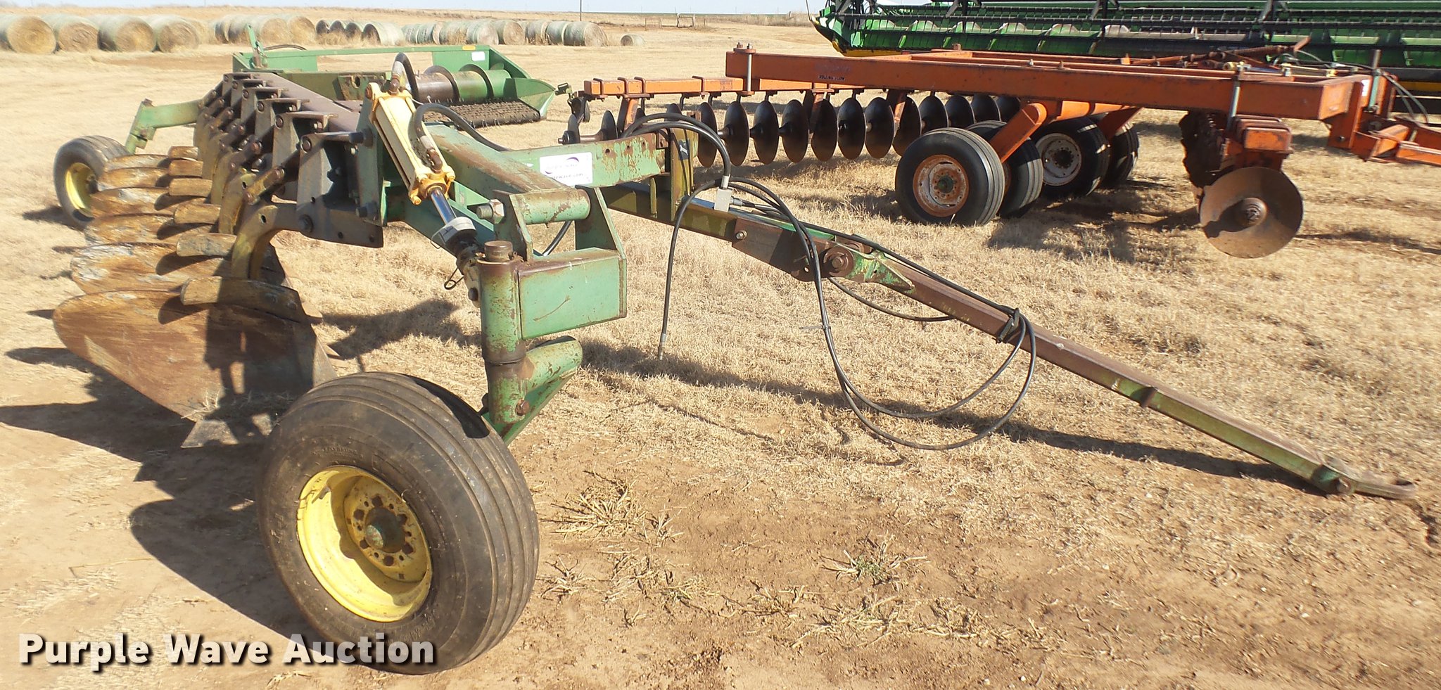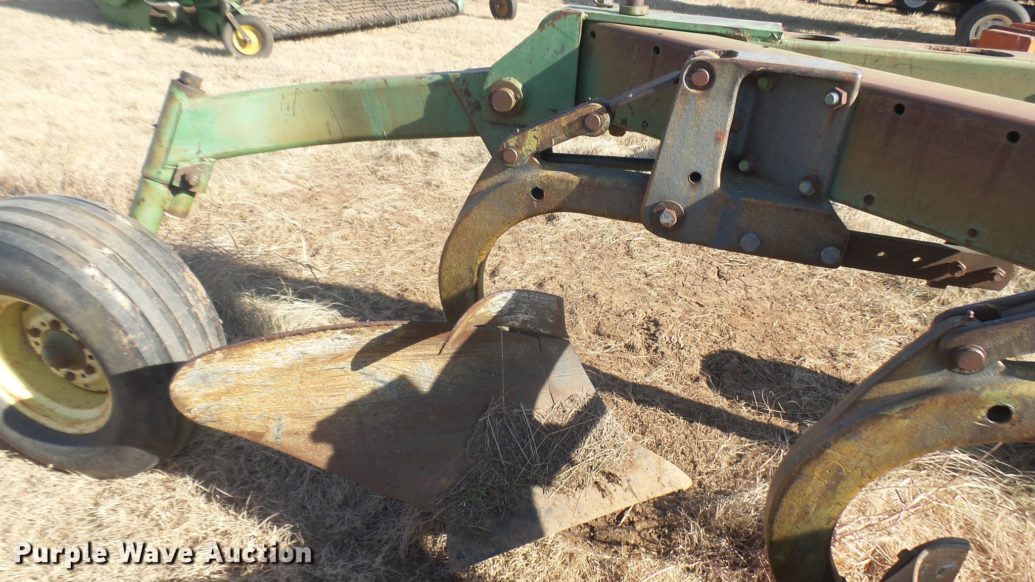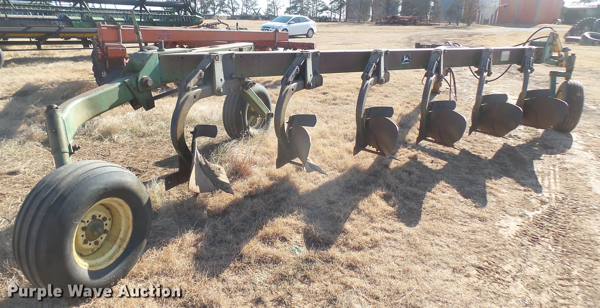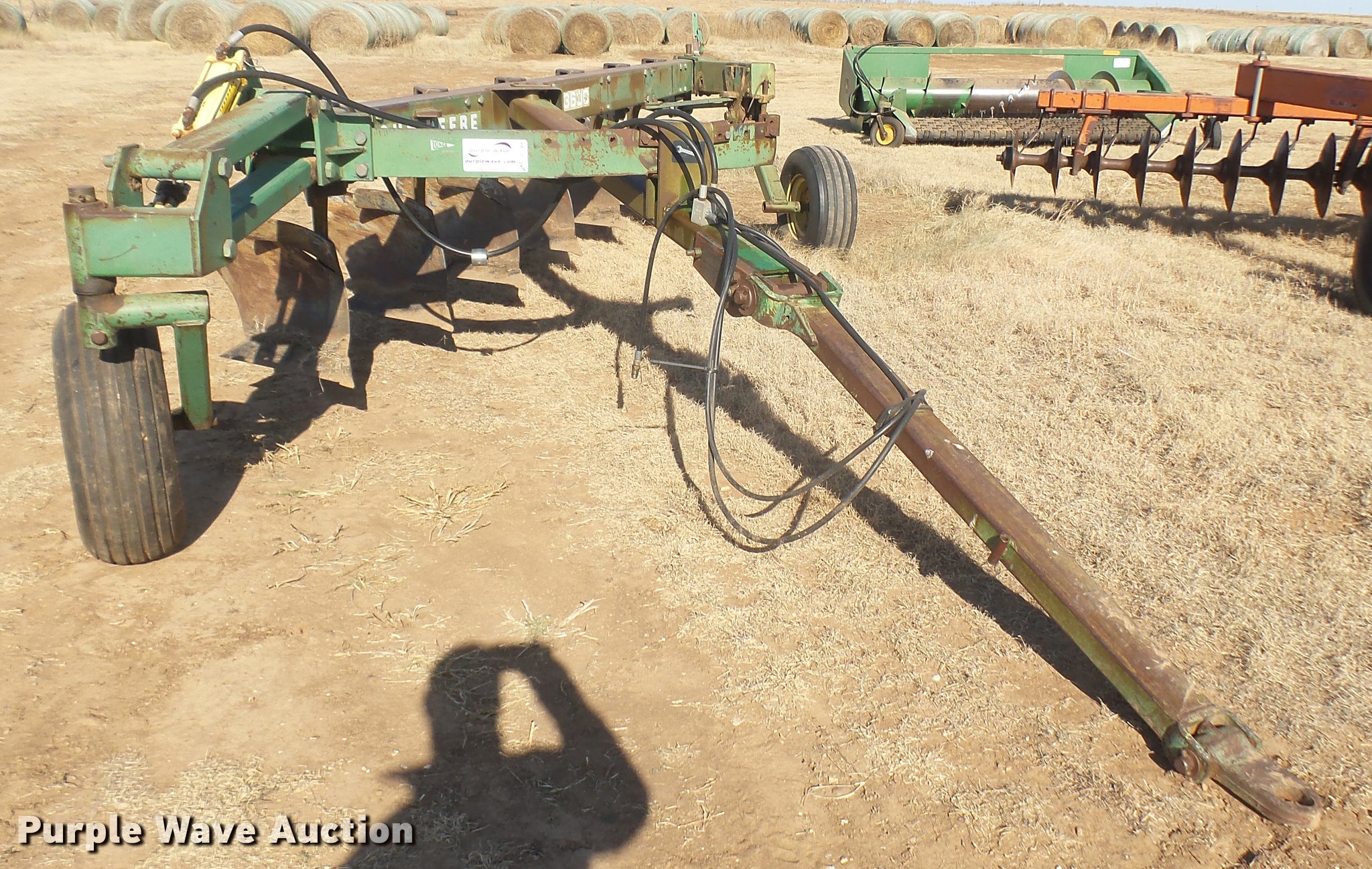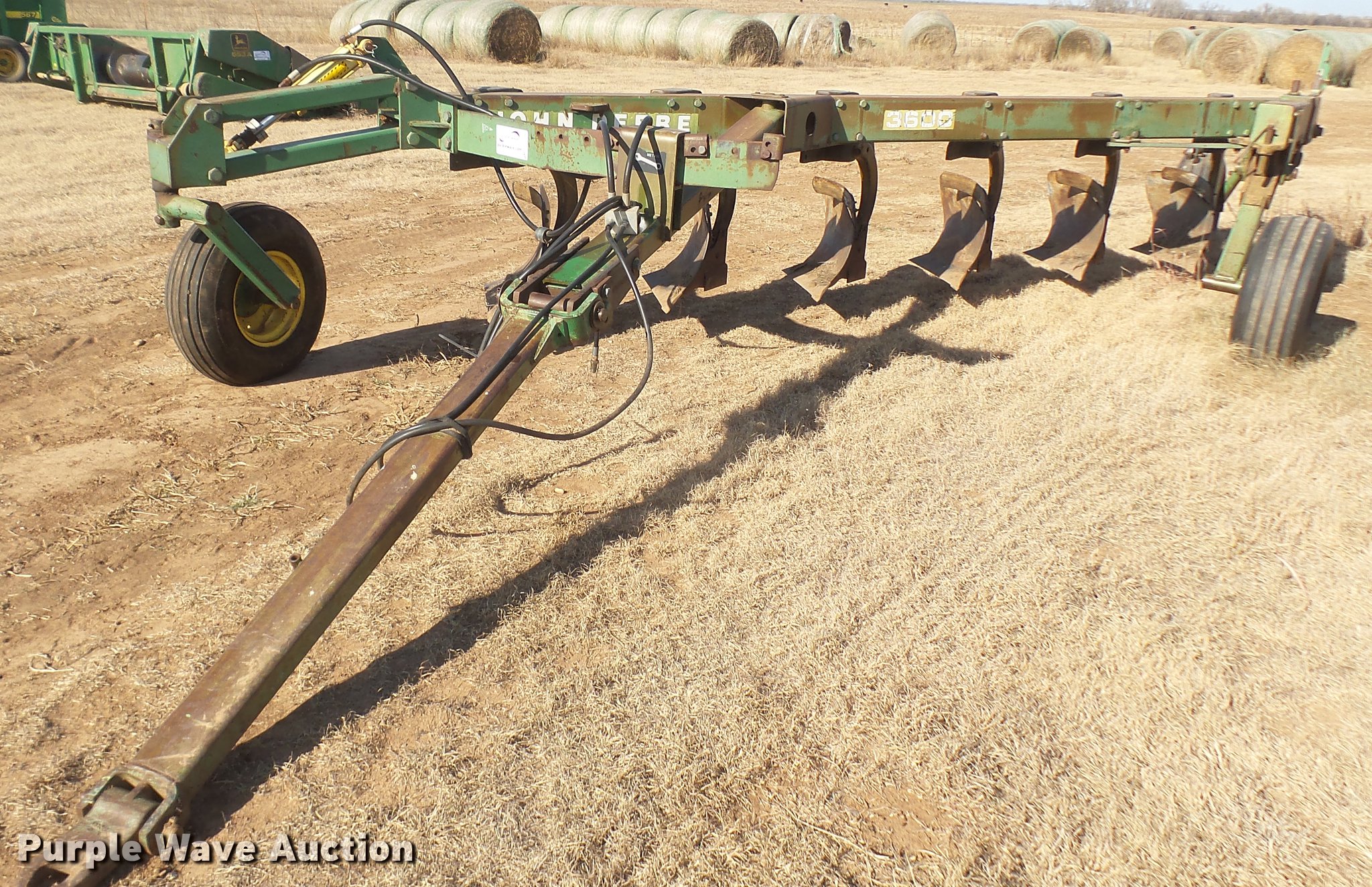 Purple Wave is selling a used Plow in Kansas. This item is a John Deere 3600 six bottom plow with the following: Hydraulic lift, Pin/clevis hitch, 11L-14 tires
