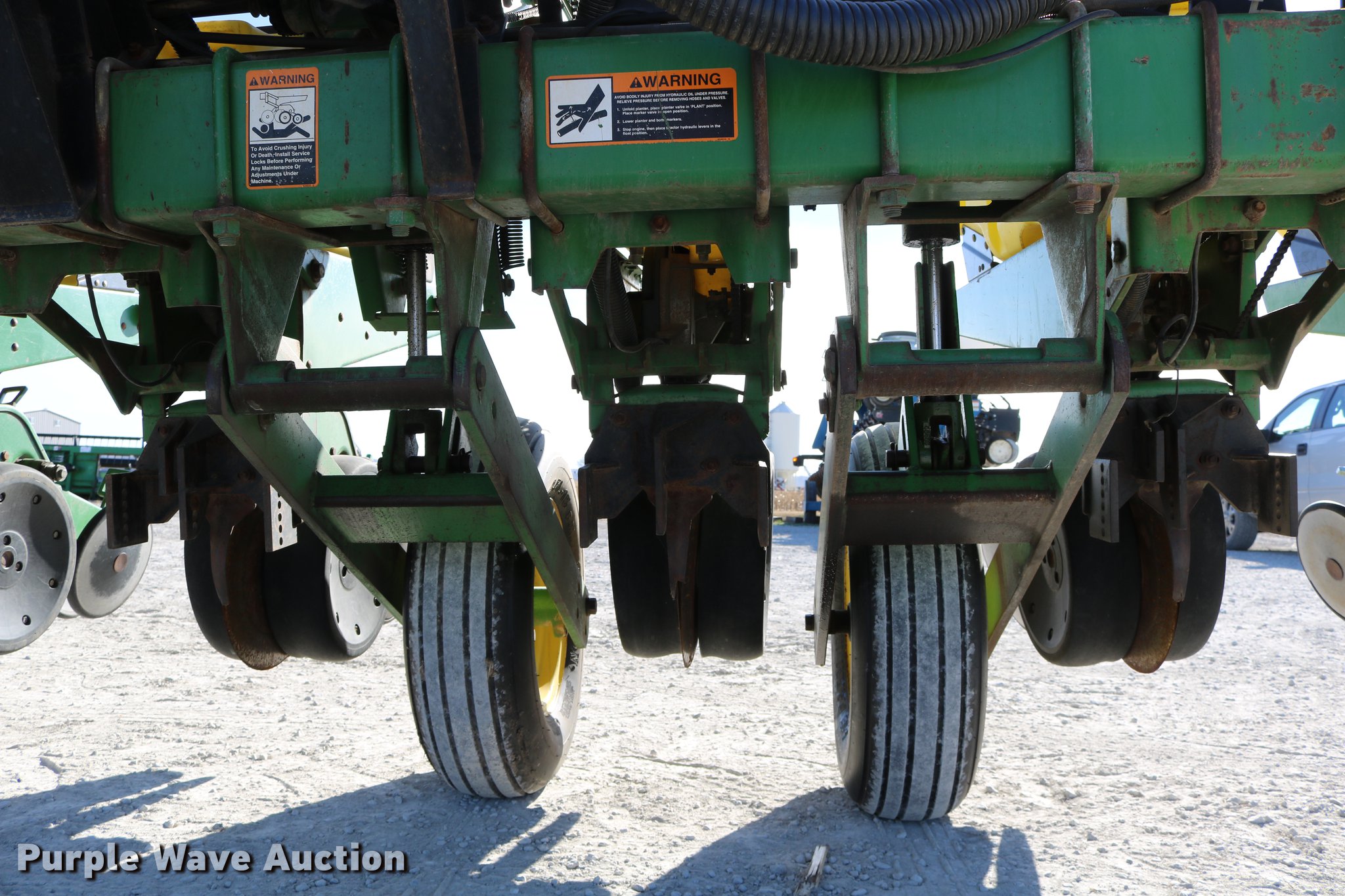 Purple Wave is selling a used Planter in Kansas. This item is a 1996 John Deere 1760 no-till planter with the following: 20'W, Eight row units, 30" row spacing, Marker arms, Knotched marker disk with depth band, Wing fold, Individual seed hoppers, Three bushel capacity, Vacuum metering, Ground meter drive, (3) corn and soybean meters, Milo meters, HD spring down pressure, Double disk openers, Double gauge wheels, Double rubber closing system, 300 gallon liquid fertilizer tank, John Blue piston pump, John Deere Computrak 350 monitor, Clevis hitch, (4) 9.5L-15 transport tires, (2) 16x6.5-8 drive/outside tires, Unknown operating condition of fertilizer system, Serial H01760R665203