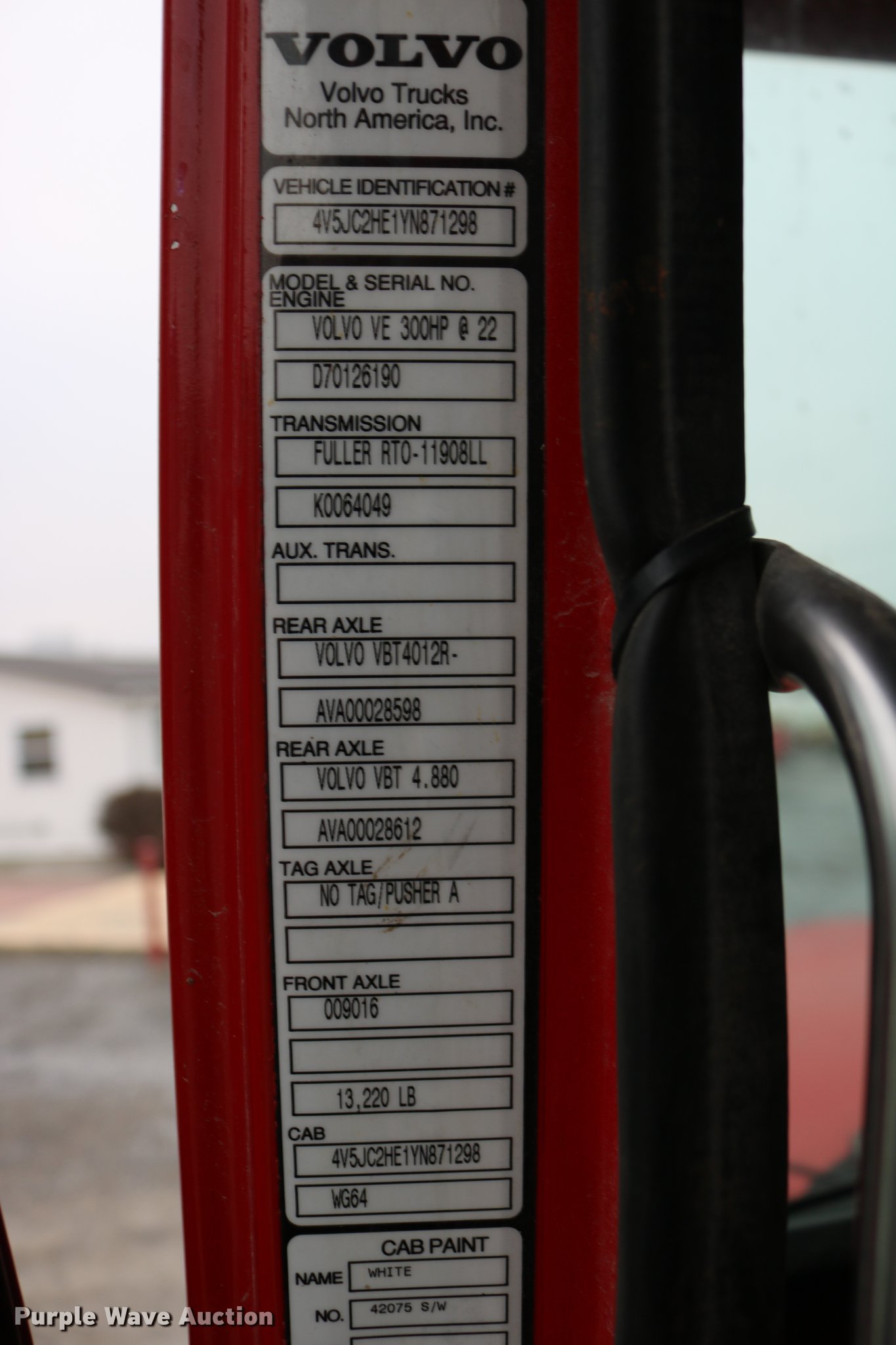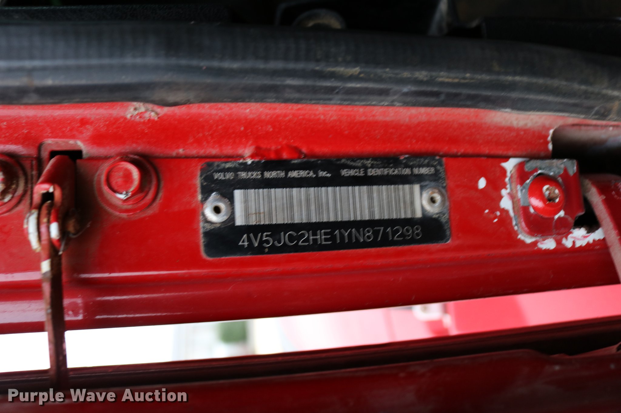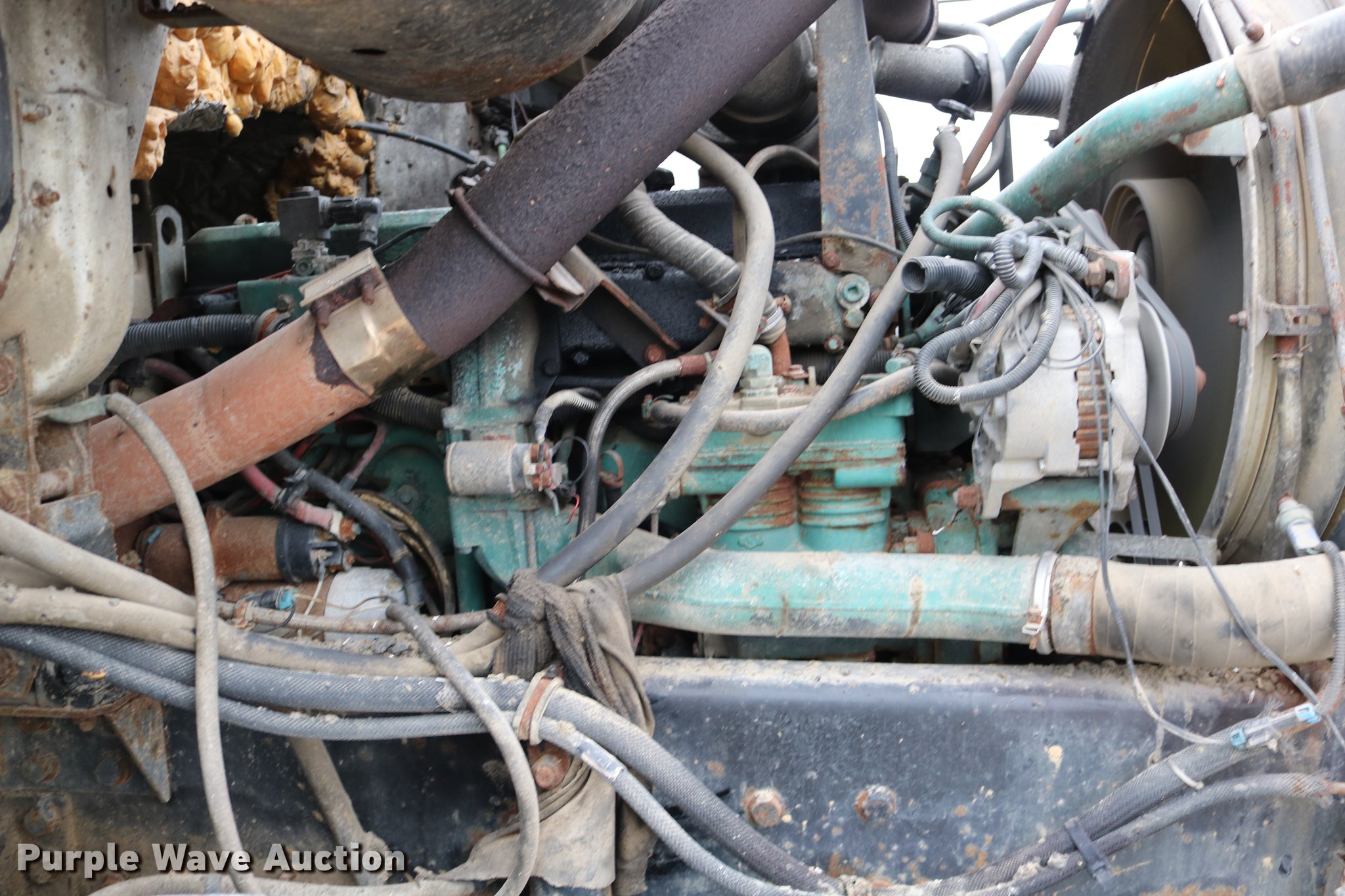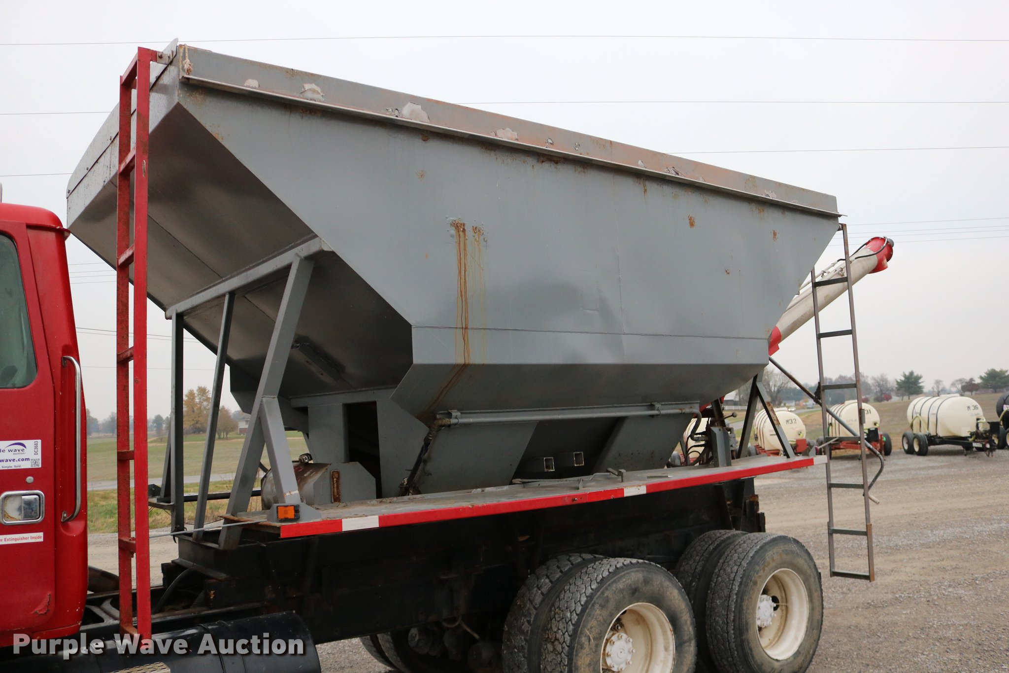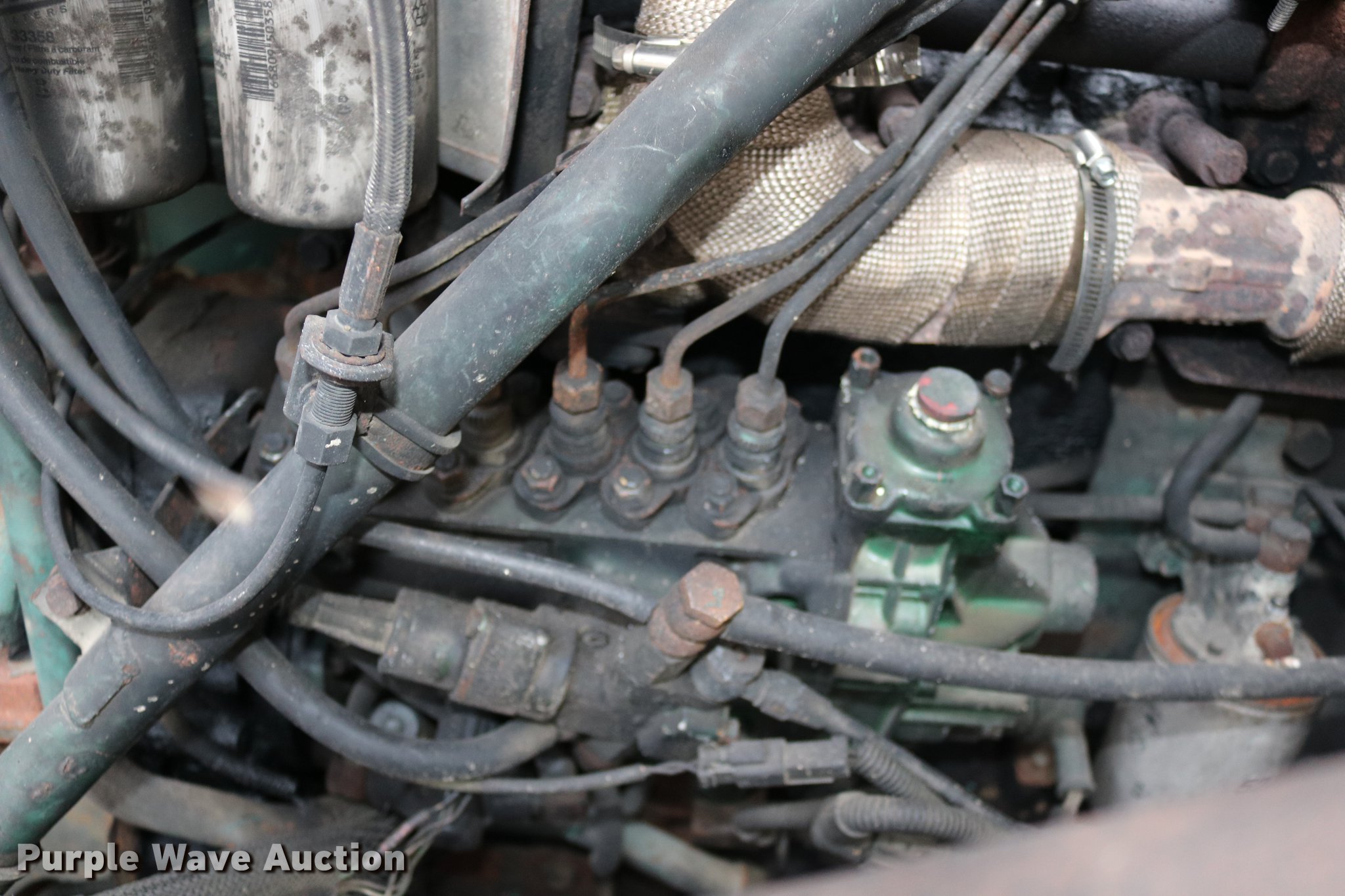 Purple Wave is selling a used Fertilizer or Feed Delivery Truck in Kentucky. This item is a 2000 Volvo WG fertilizer truck with the following: 168,345 miles on odometer, 1,701 hours on meter, Volvo VE D7 6.7L L6 turbo diesel engine, 700 HP, Eaton Fuller RTP-11908LL 10 speed manual transmission, Inter-axle differential lock, Tandem axle, AC and heat, Tilt, Air suspension seat, Block heater, 15'10"L x 95.5"W fertilizer bed, 19.5'L x 8" diameter discharge auger, Rear hydraulic lift, Roll over tarp, Rear/ground controls, 4:88 gear ratio, 196" wheelbase, Spring over walking beam suspension, 11R22.5 tires, GVWR 55,000 lbs, FAWR 13,220 lbs, Windshield cracked, Non-operational AC, No belt on AC compressor, No AC and heat fan switch, Unit# 78010/17254