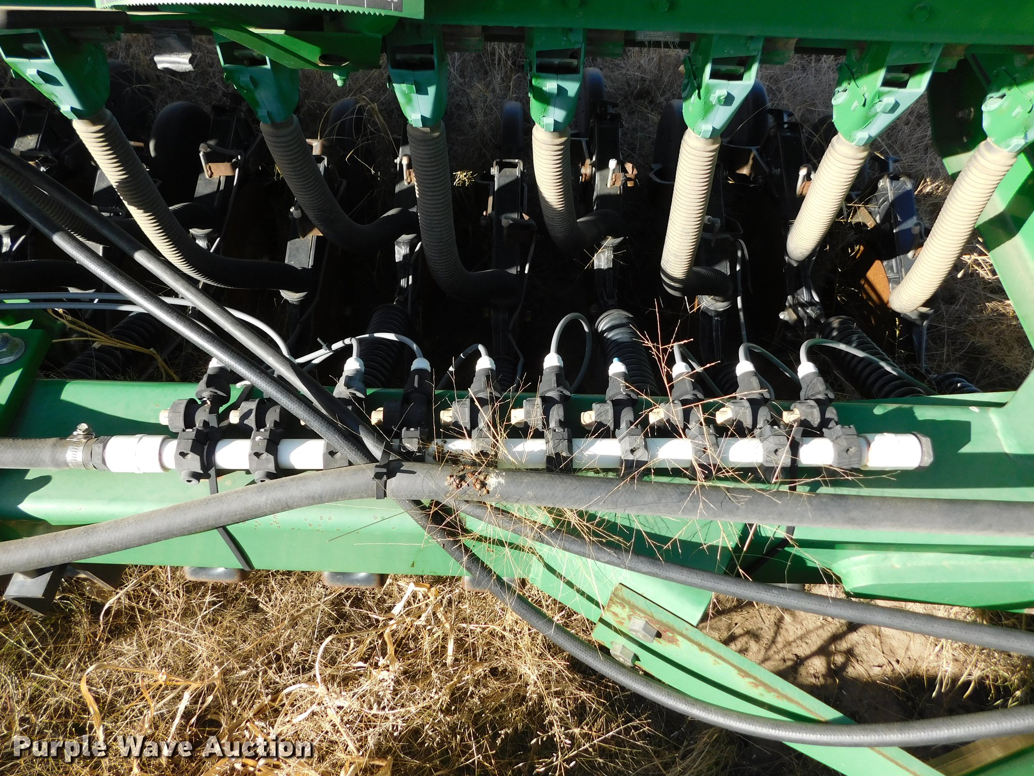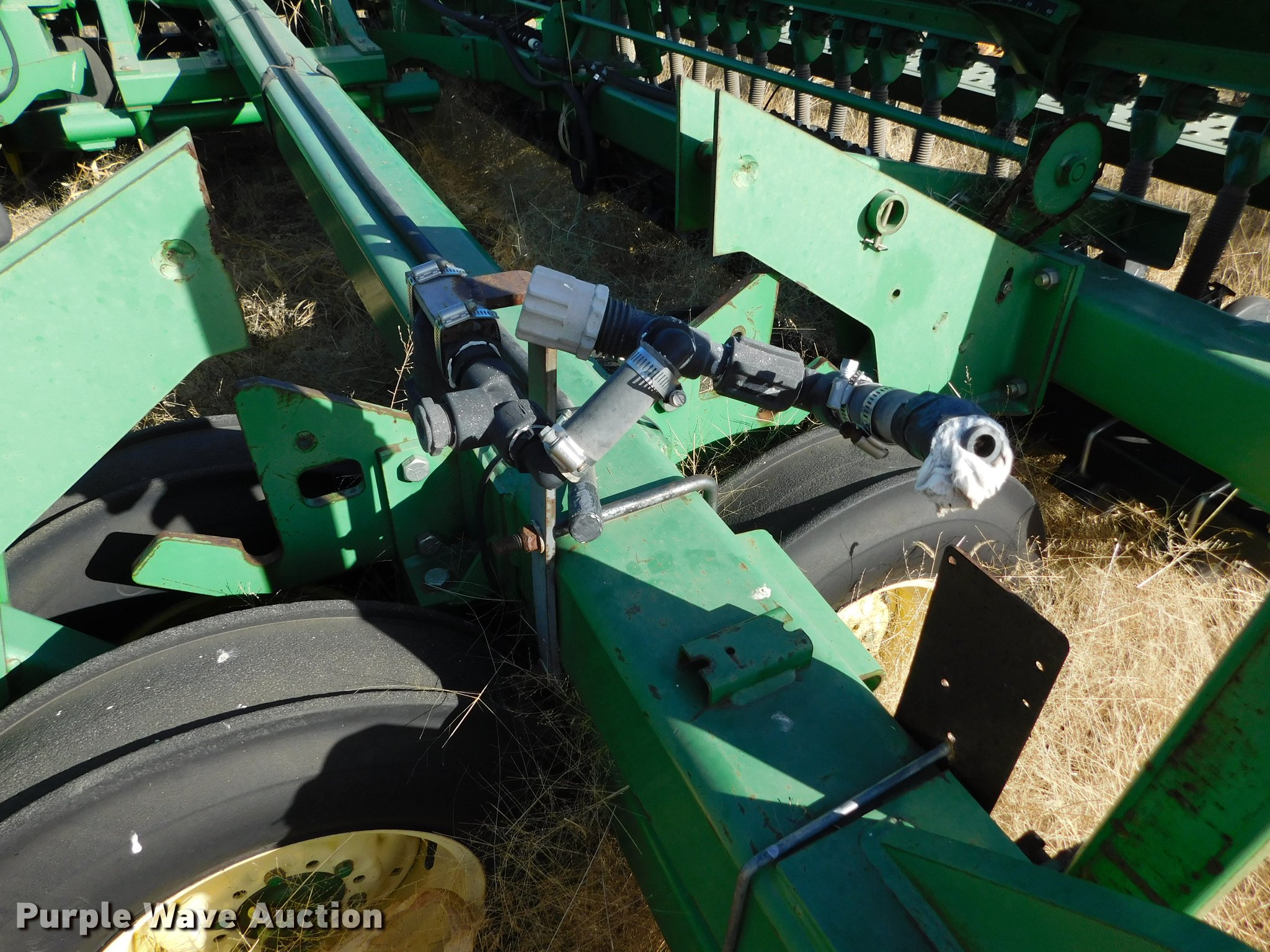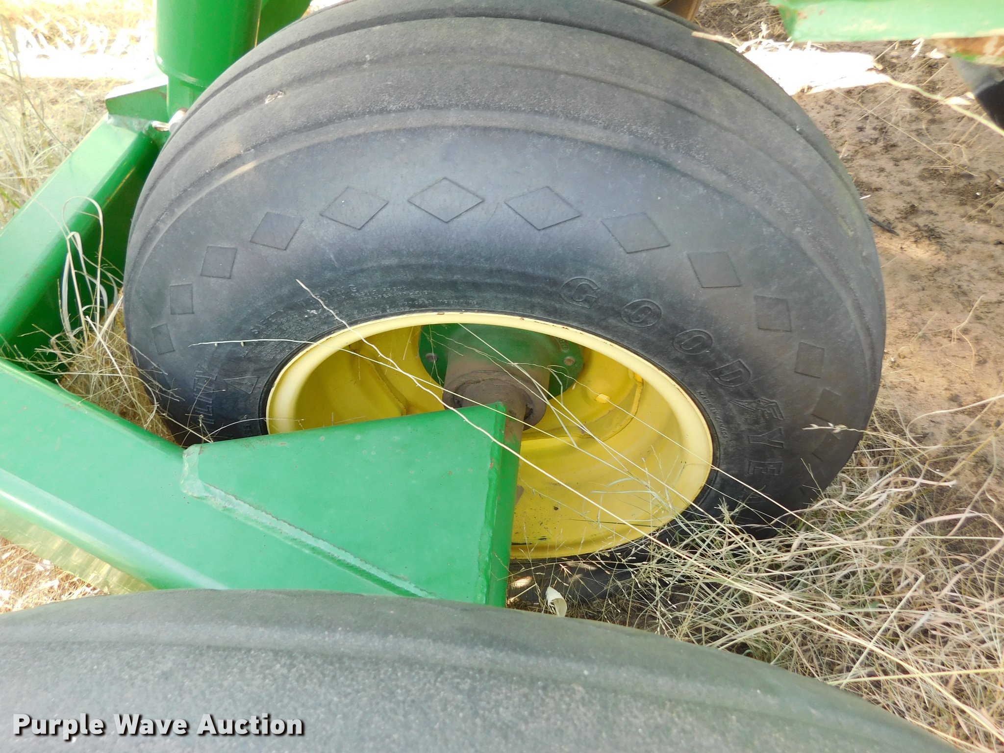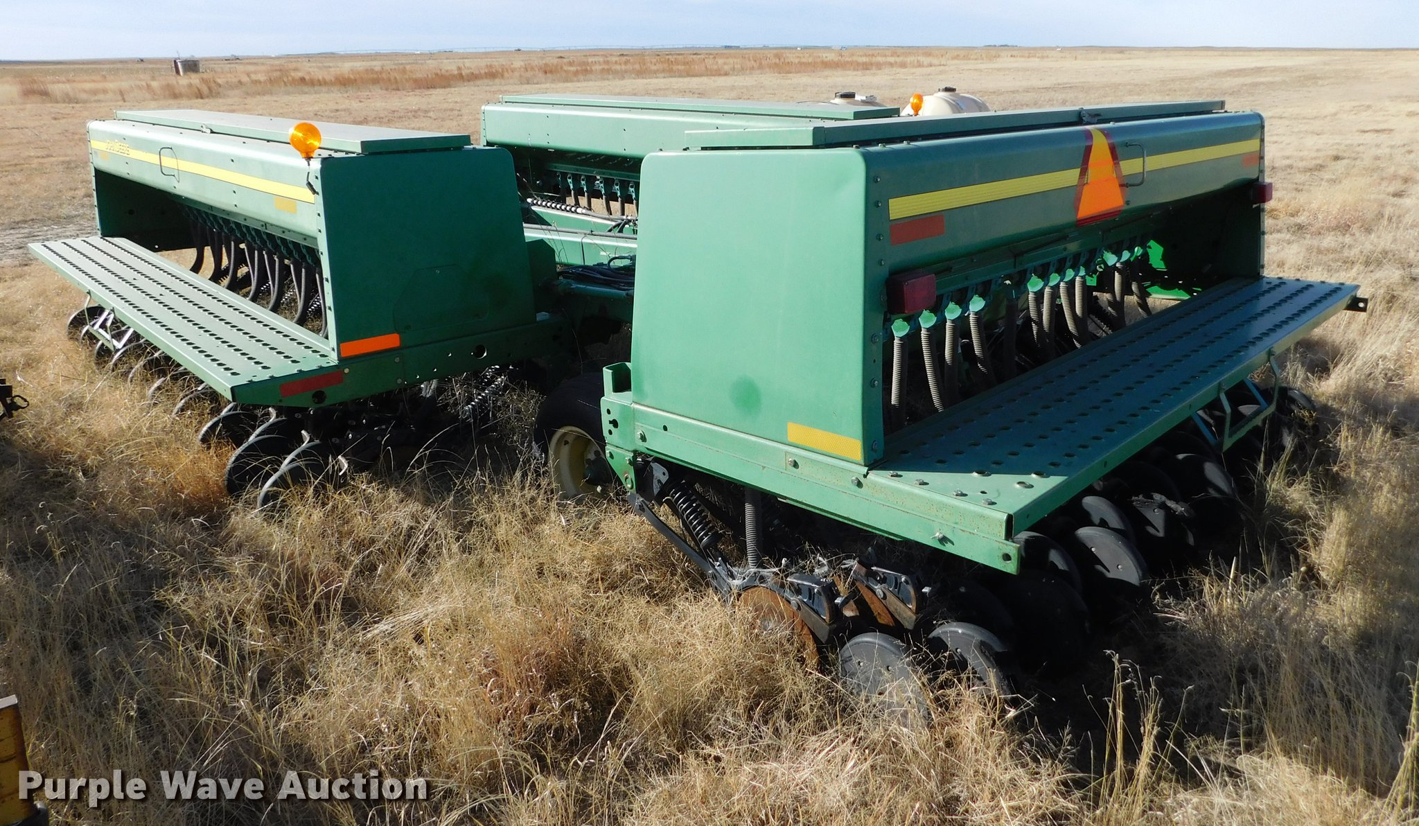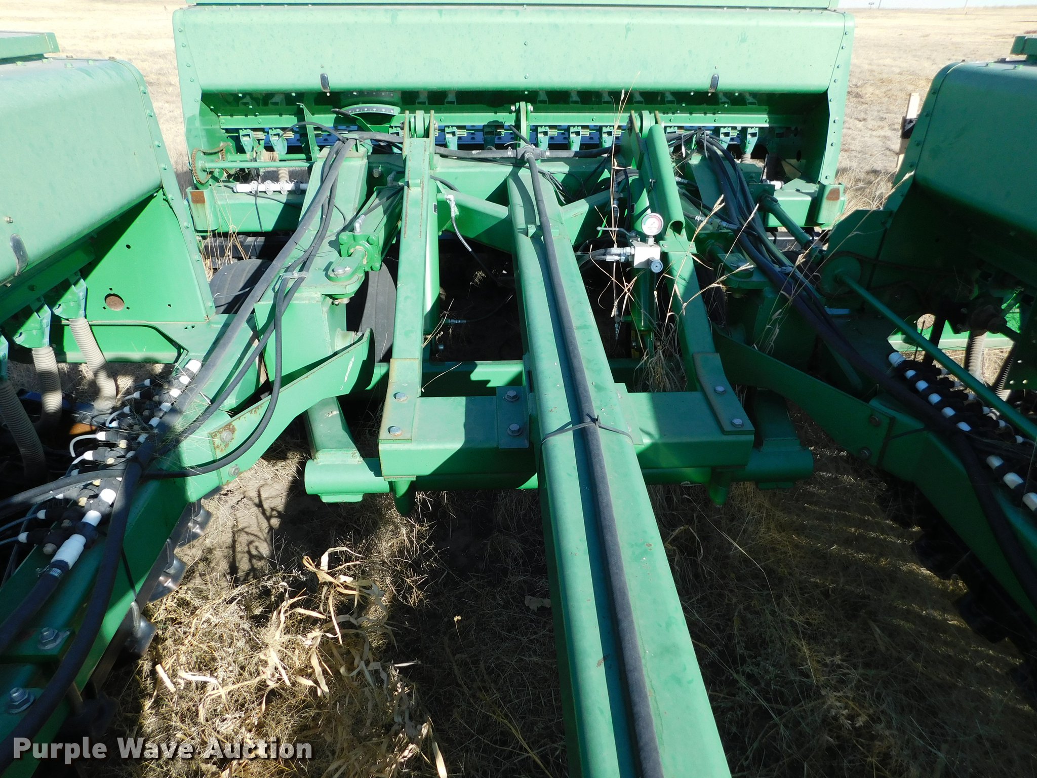 Purple Wave is selling a used Grain Drill or Seeder in Kansas. This item is a John Deere 455 grain drill with the following: 35'W, 56 row units, 7.5" row spacing, Hydraulic front fold, Bulk fill system, Ground meter drive, Double disk openers, Single rubber closing system, Transport lights, Fertilizer manifolds, Stainless steel tube delivery, Pin hitch, (4) 11L-15SL transport tires, (4) 7.60-15 drive/outside tires, Fire damage, Serial N00455X700363, Unit# A303866P00