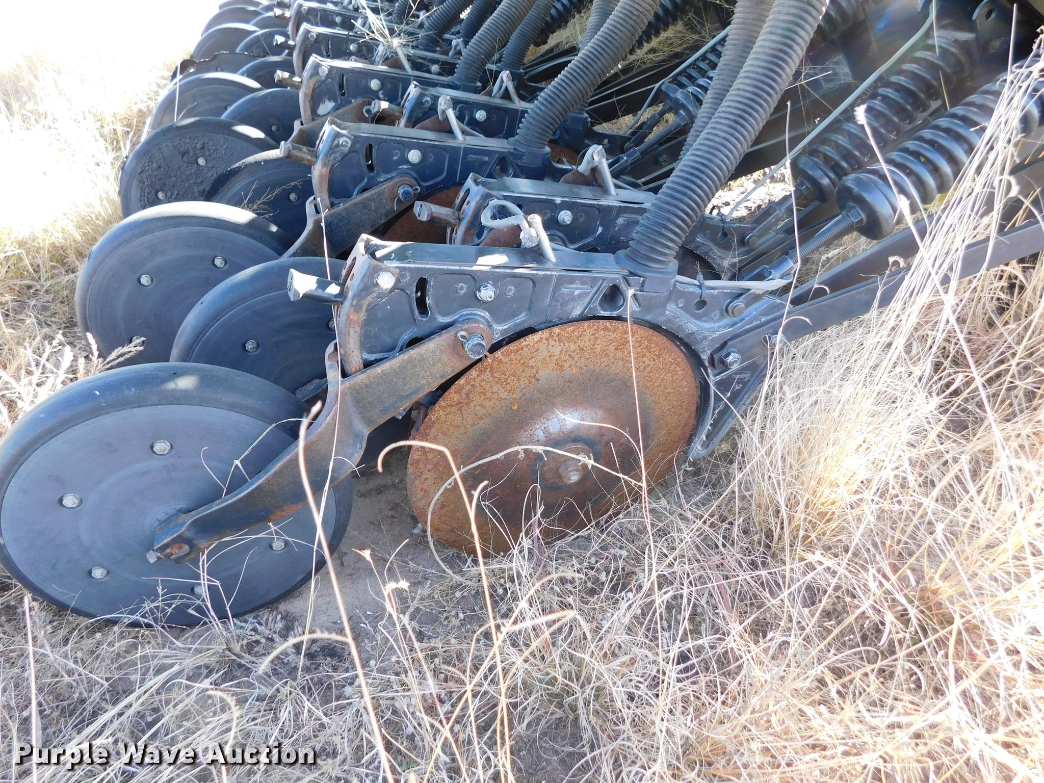 John Deere 455 grain drill. 35'W, 56 row units, 7.5" row spacing, Hydraulic front fold, Bulk fill system, Ground meter drive, Double disk openers, Single rubber closing system, Transport lights, Fertilizer manifolds, Stainless steel tube delivery, Pin hitch, (4) 11L-15SL transport tires, (4) 7.60-15 drive/outside tires, Fire damage, Serial N00455X700363, Unit# A303866P00. Insurance salvage. Farm Bureau Financial Services. 9566 Rd 13. Liberal, KS 67901