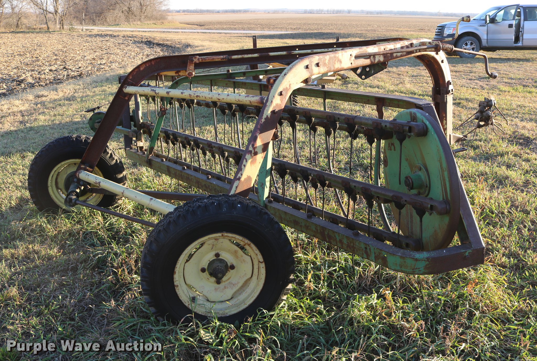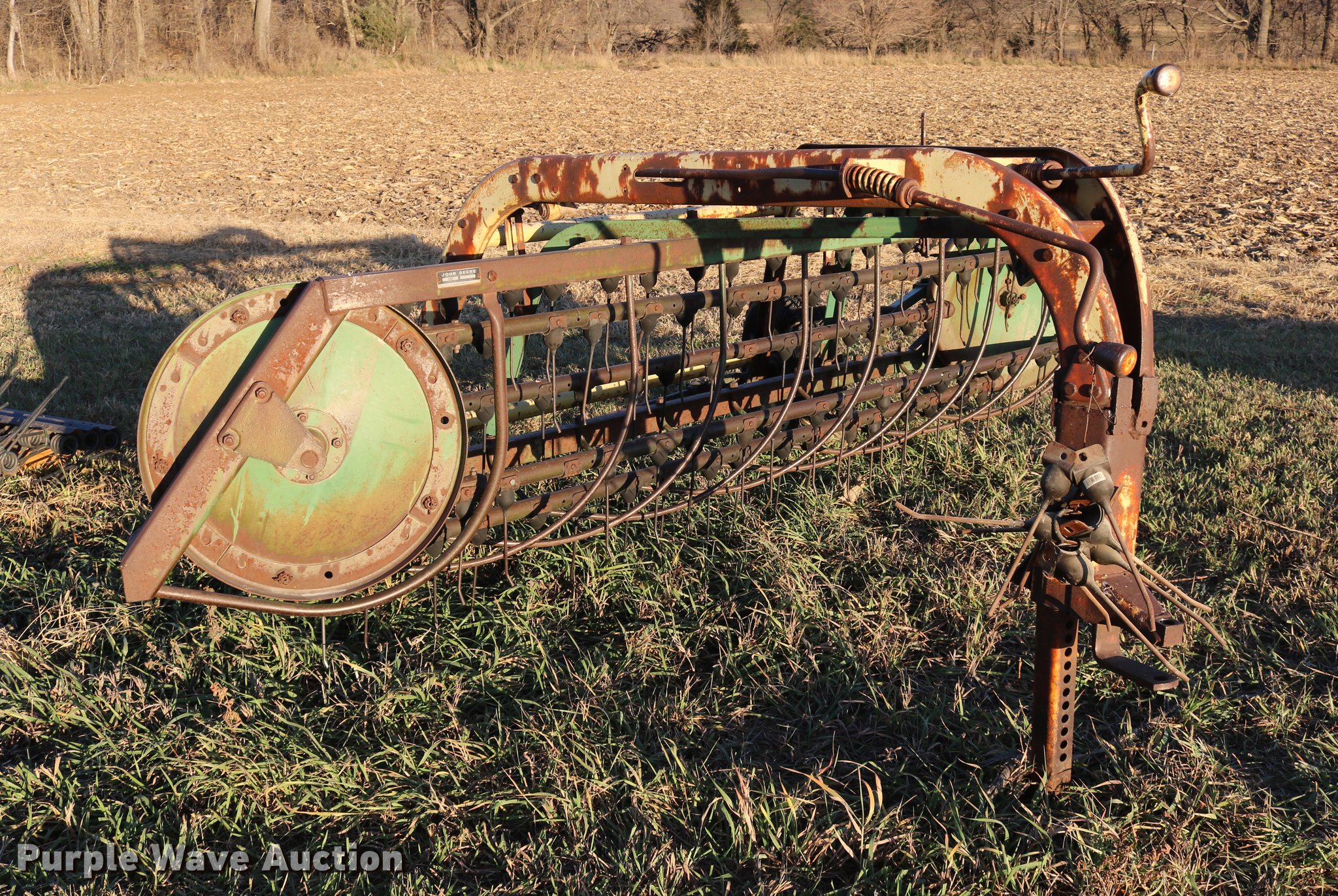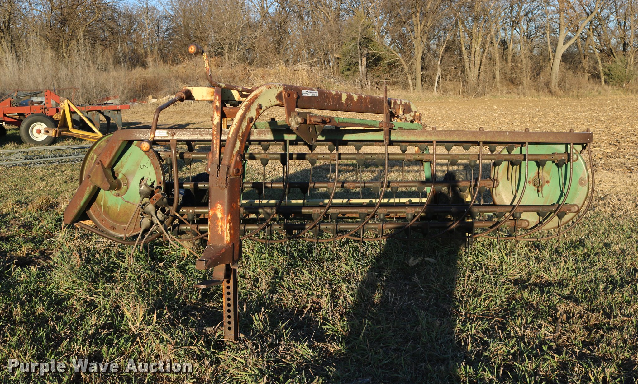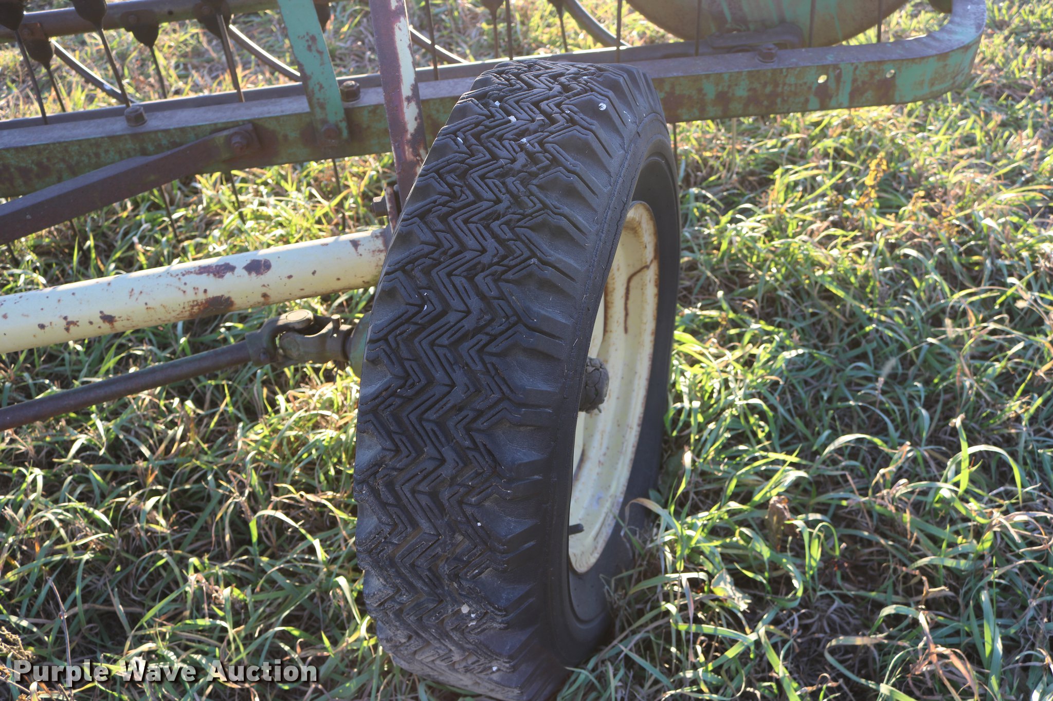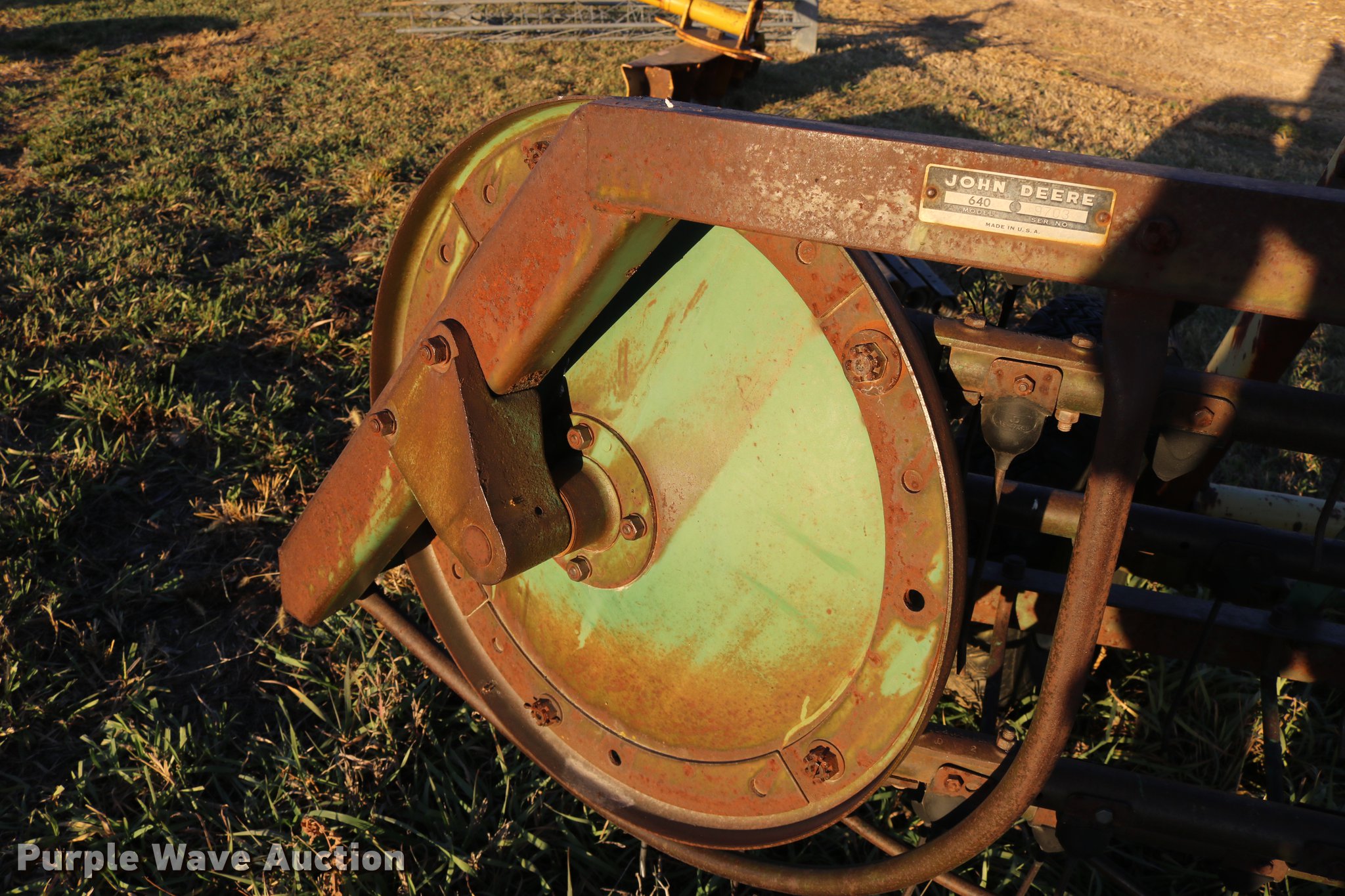 Purple Wave is selling a used Hay Rake in Kansas. This item is a John Deere 640 hay rake with the following: 9'W, Manual adjust, Ground driven, 7.5-14 tires, Serial 9703