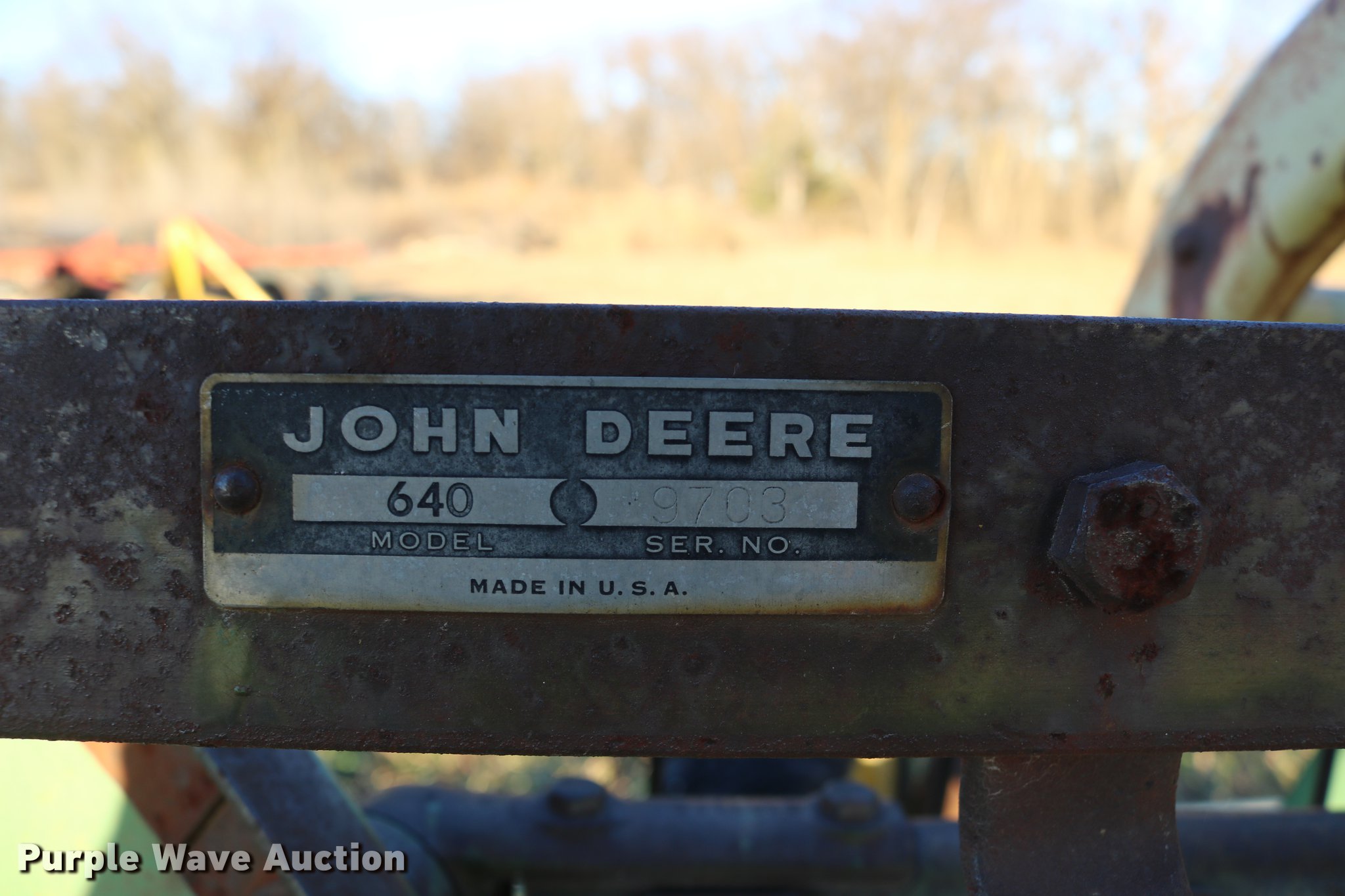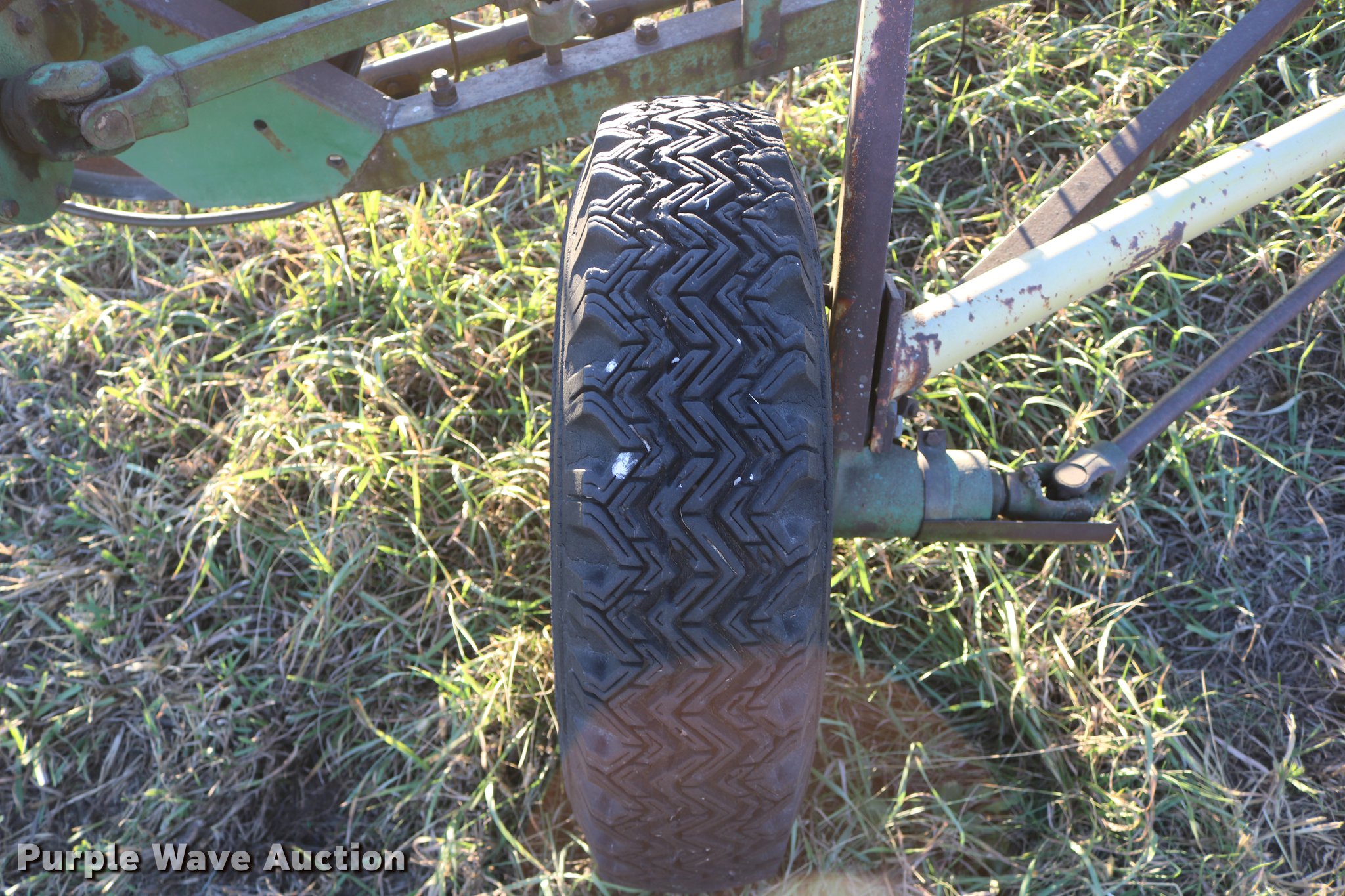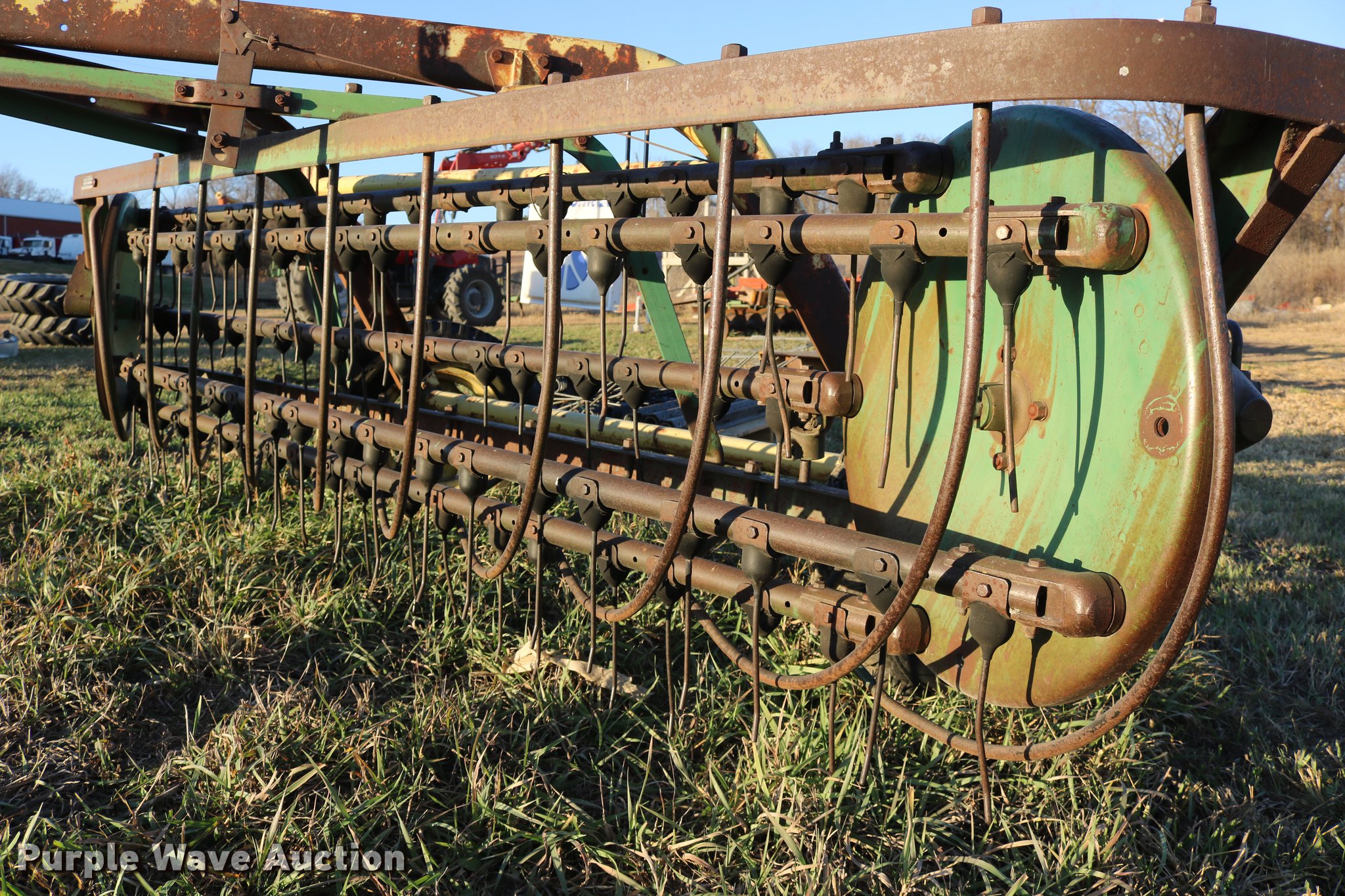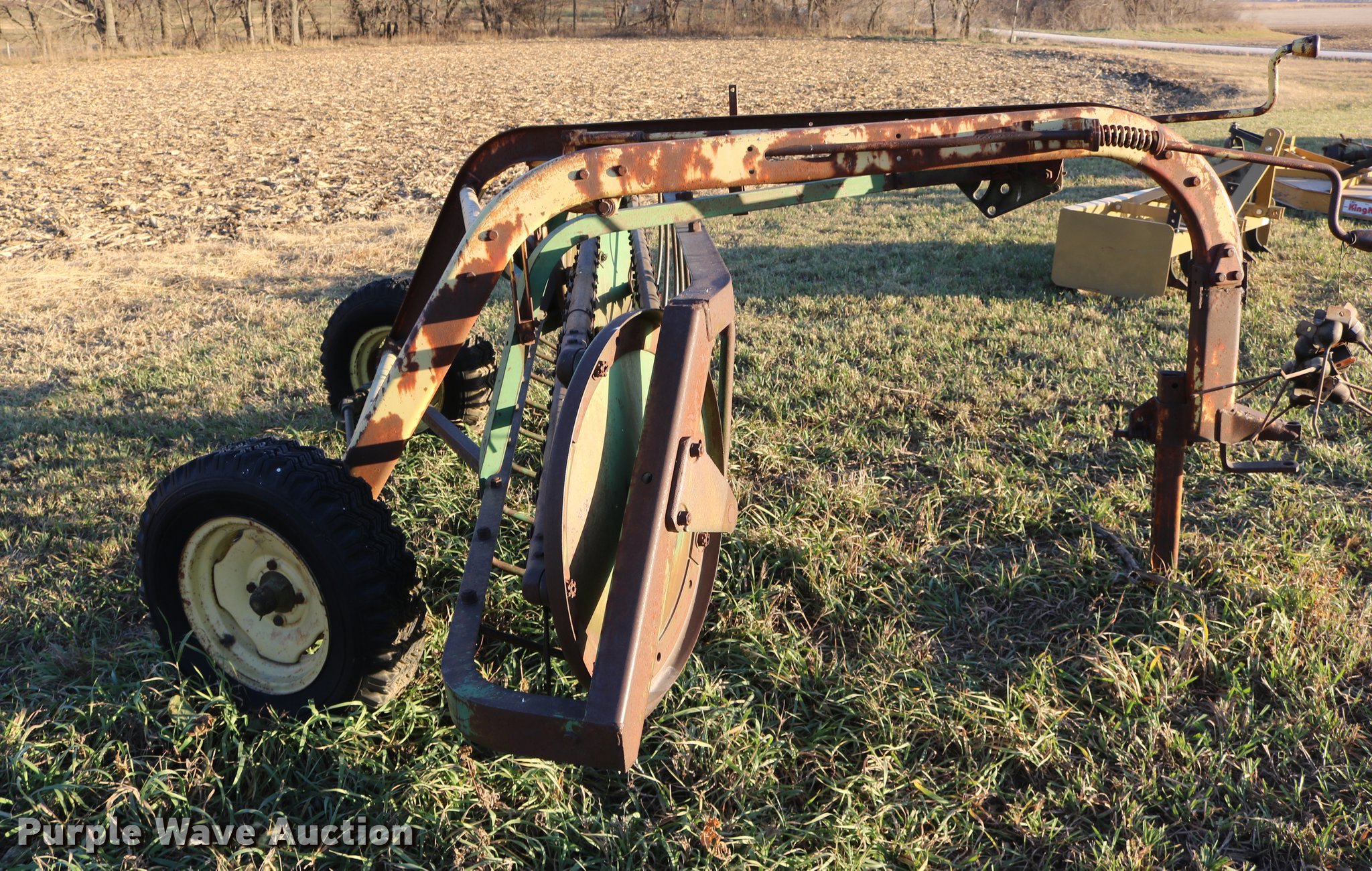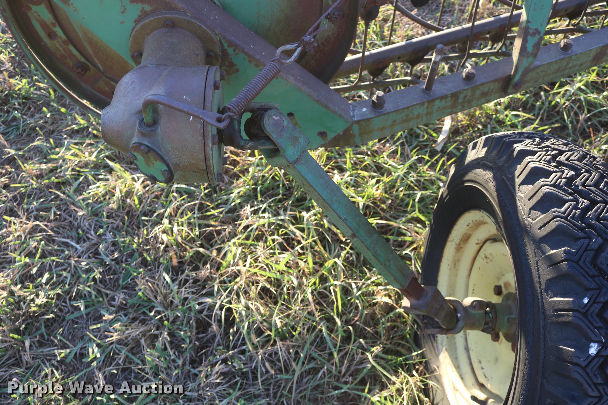 Purple Wave is selling a used Hay Rake in Kansas. This item is a John Deere 640 hay rake with the following: 9'W, Manual adjust, Ground driven, 7.5-14 tires, Serial 9703