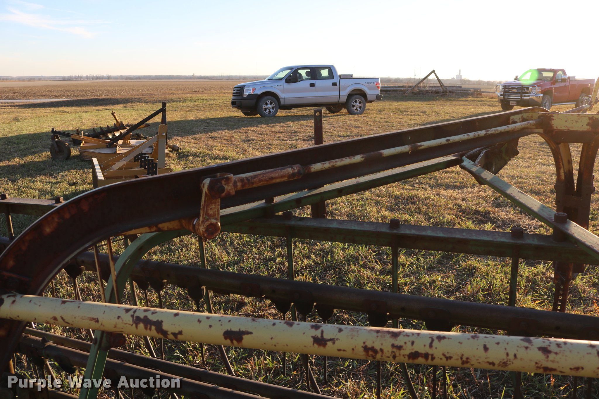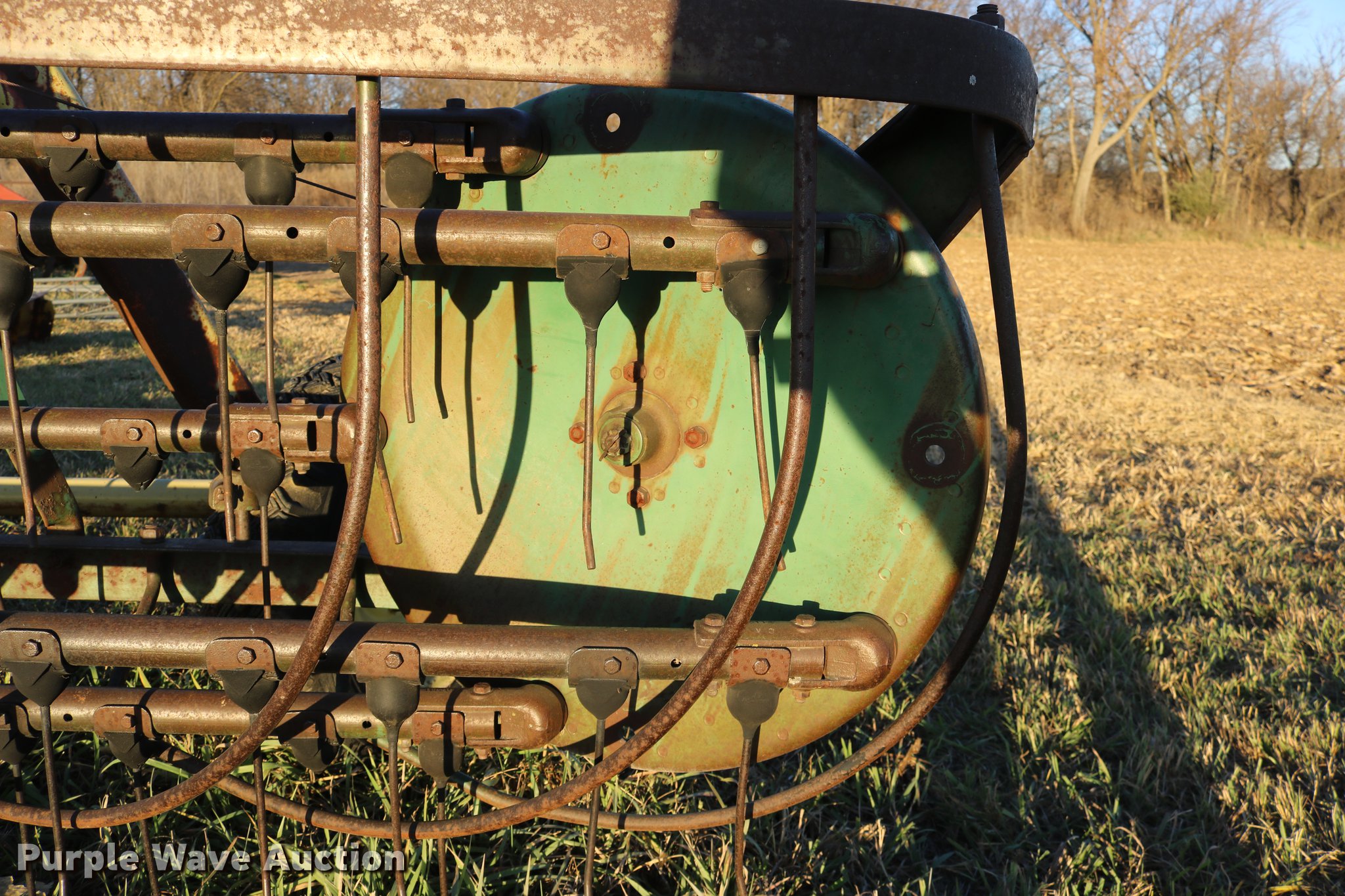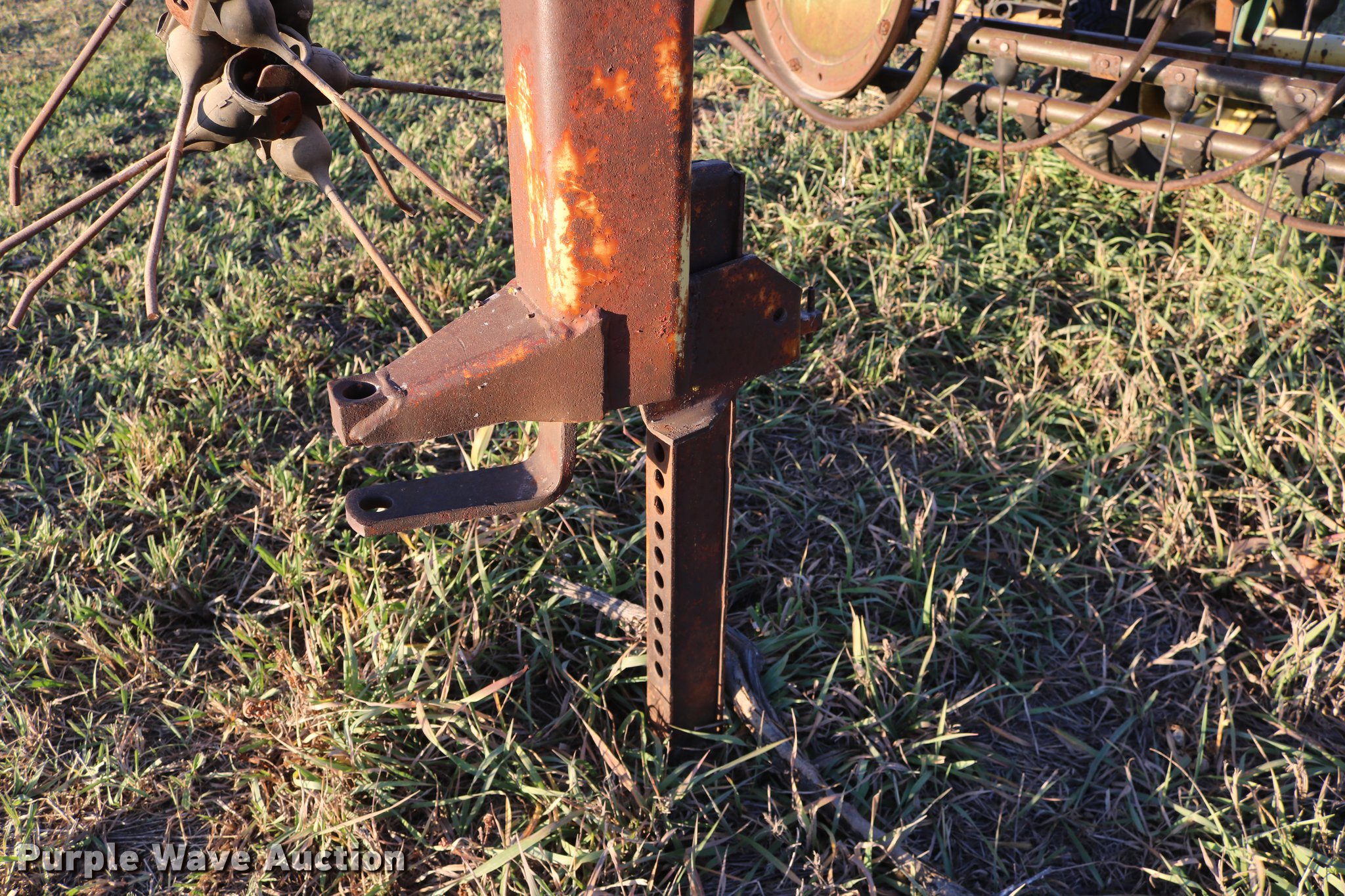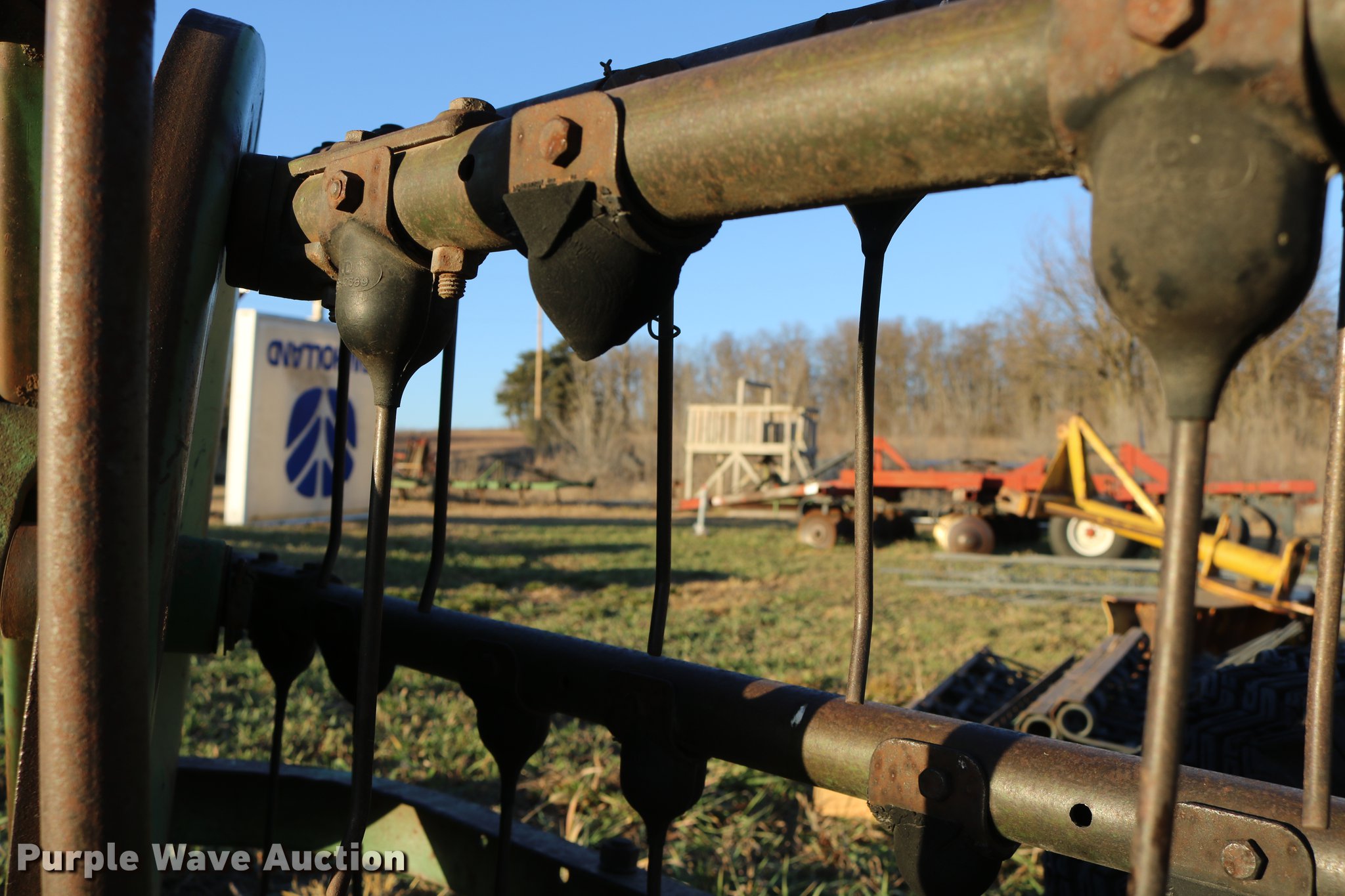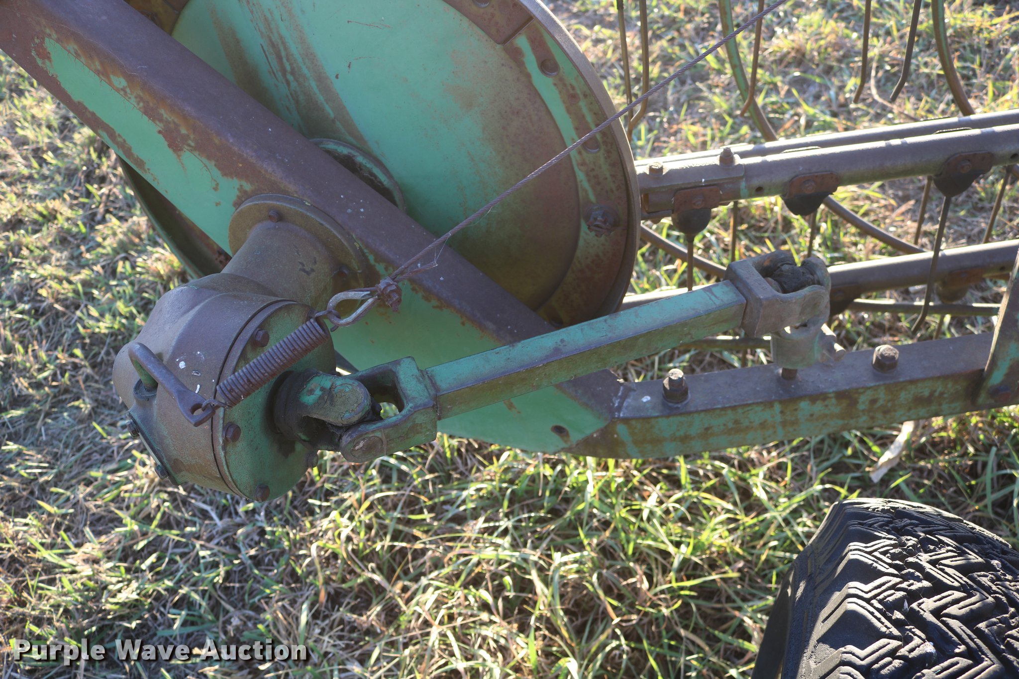 Purple Wave is selling a used Hay Rake in Kansas. This item is a John Deere 640 hay rake with the following: 9'W, Manual adjust, Ground driven, 7.5-14 tires, Serial 9703