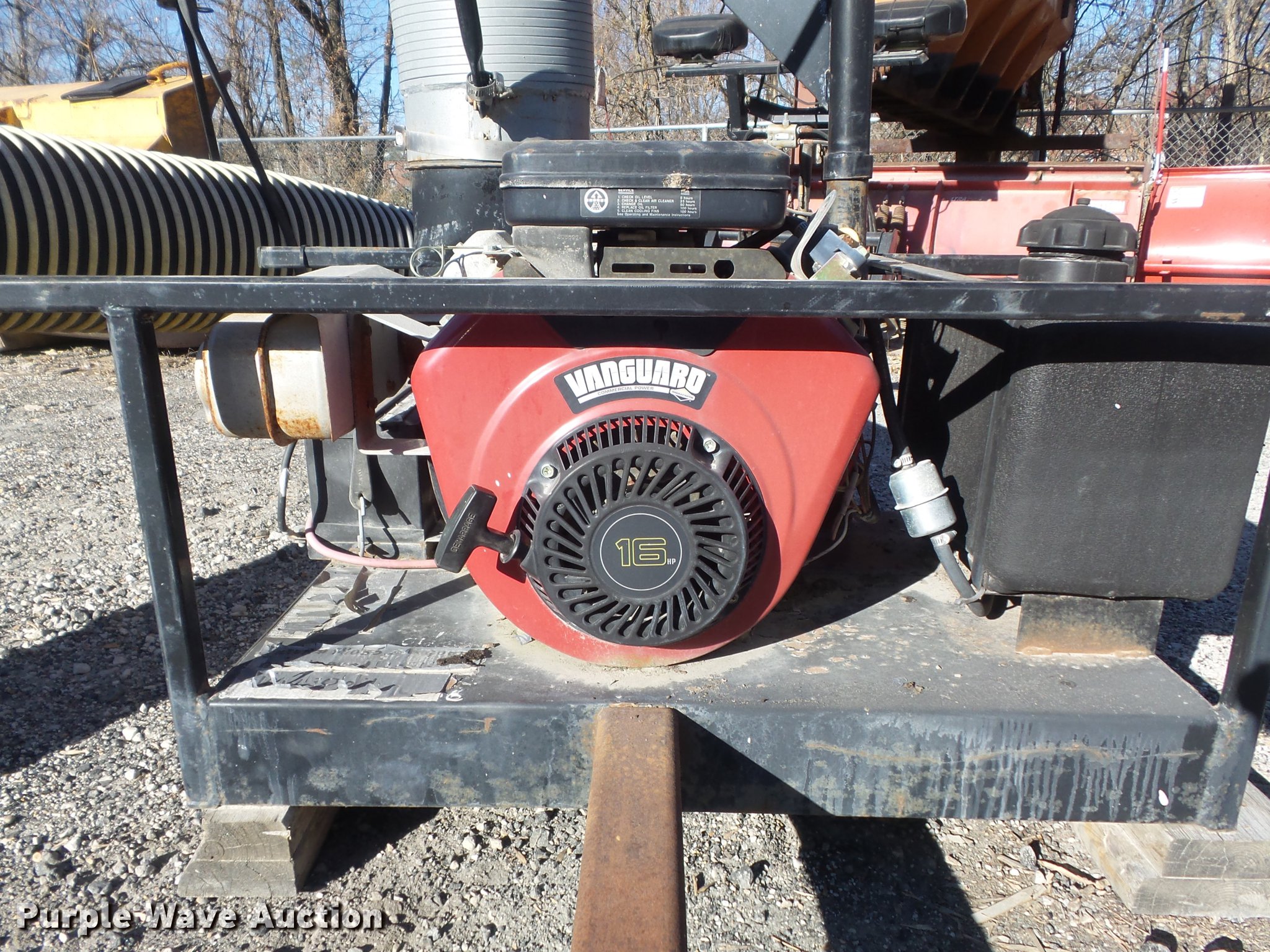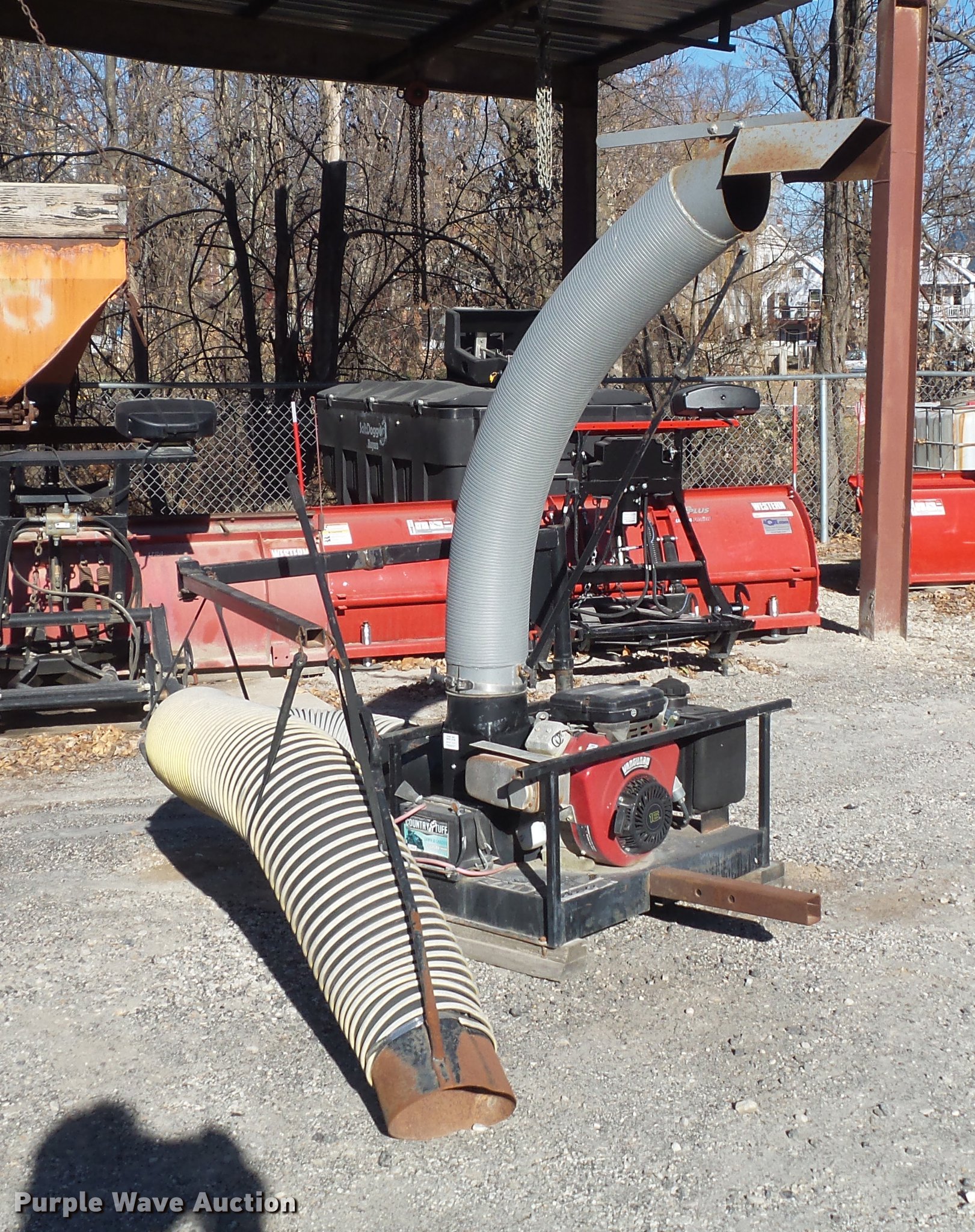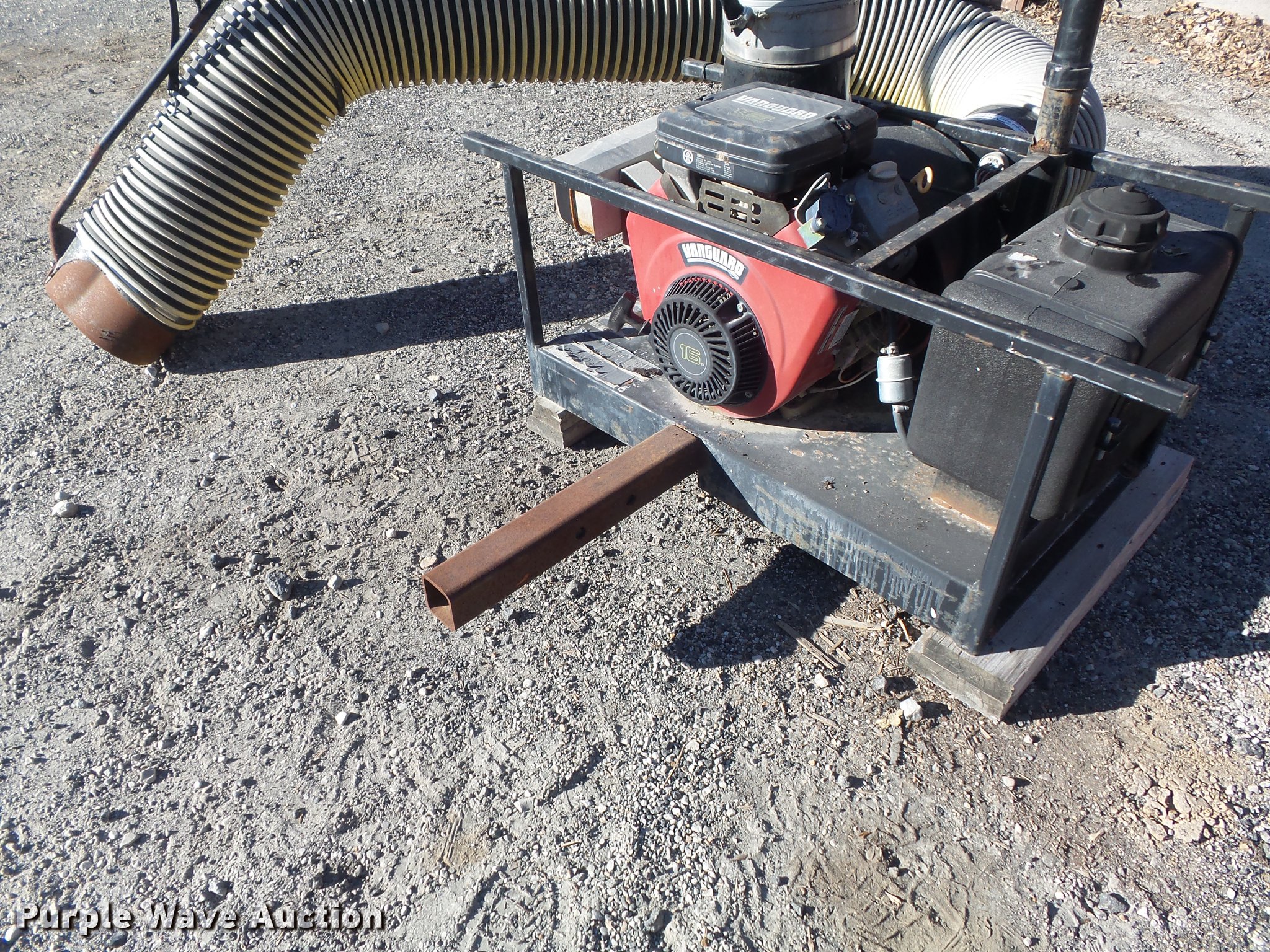 Purple Wave is selling a used Lawn and Garden in Missouri. This item is a Trac-vac 2116 leaf vacuum with the following: Briggs & Stratton two cylinder gas engine, 16 HP, 10' x 10" suction hose, Receiver hitch mounting tube, Dead battery, Serial 241