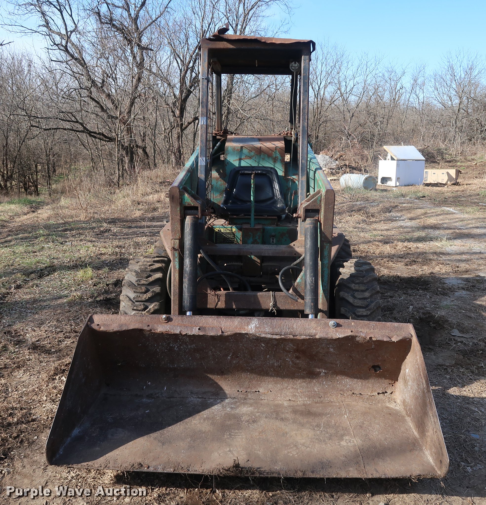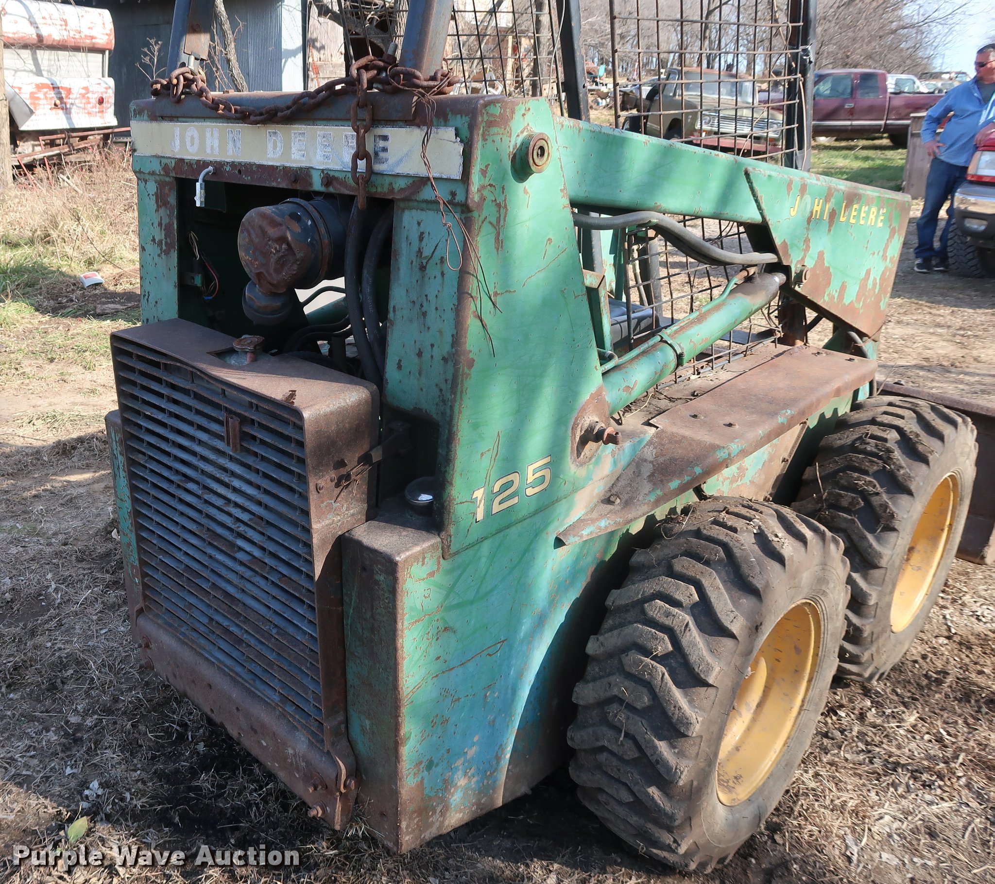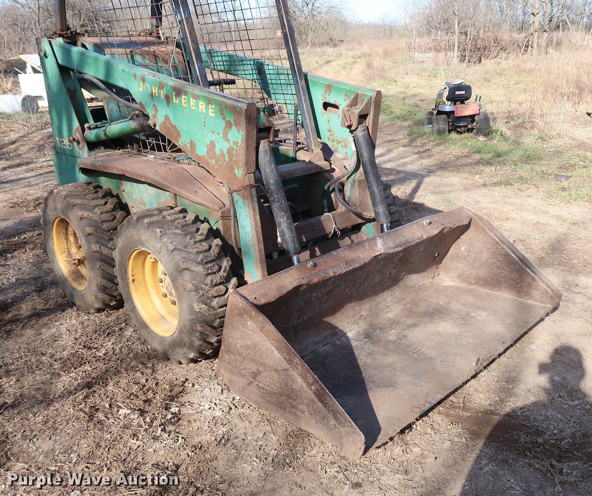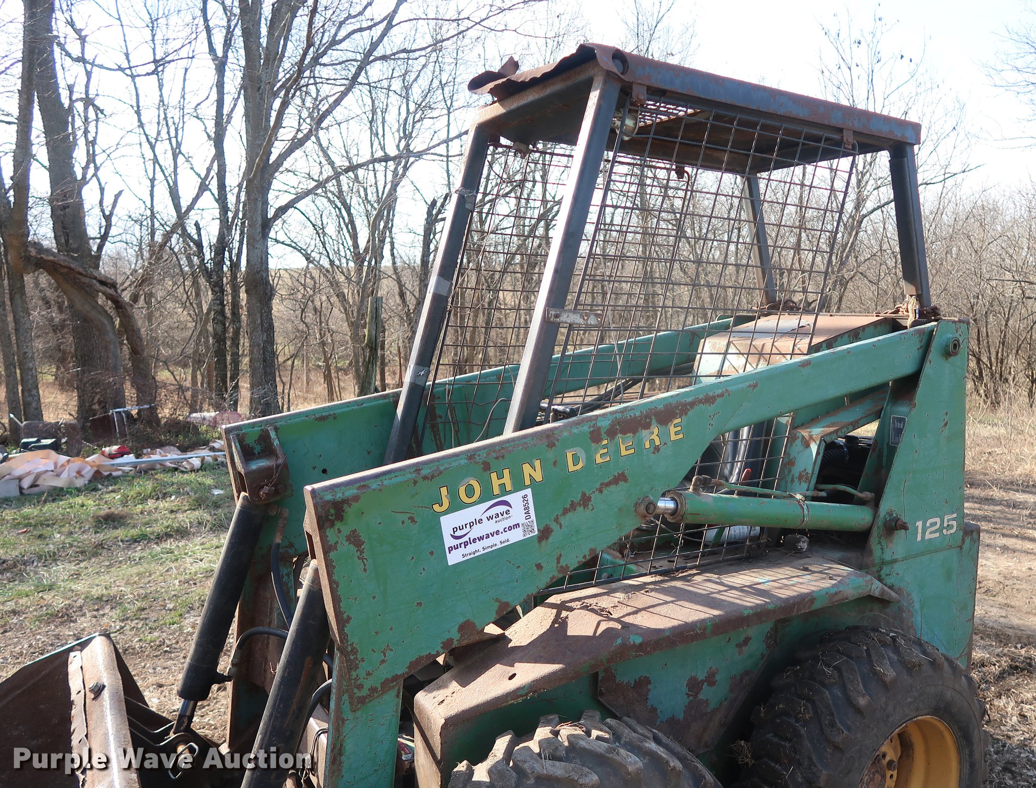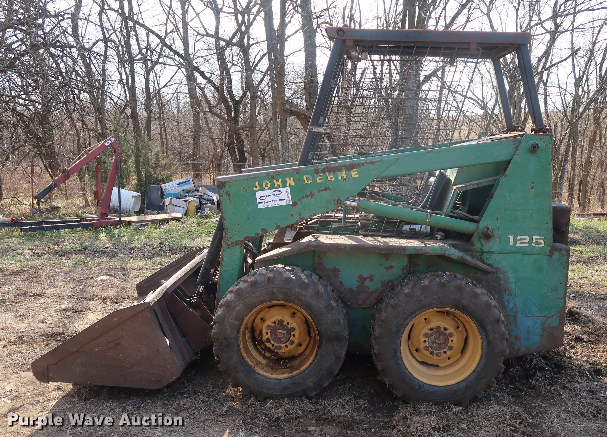 Purple Wave is selling a used Skid Steer Loader in Missouri. This item is a John Deere 125 skid steer with the following: 1,736 hours on meter, Four cylinder gas engine, Hydrostatic transmission, Open station/canopy, 64"W bucket, Smooth cutting edge, 10-16.5 tires