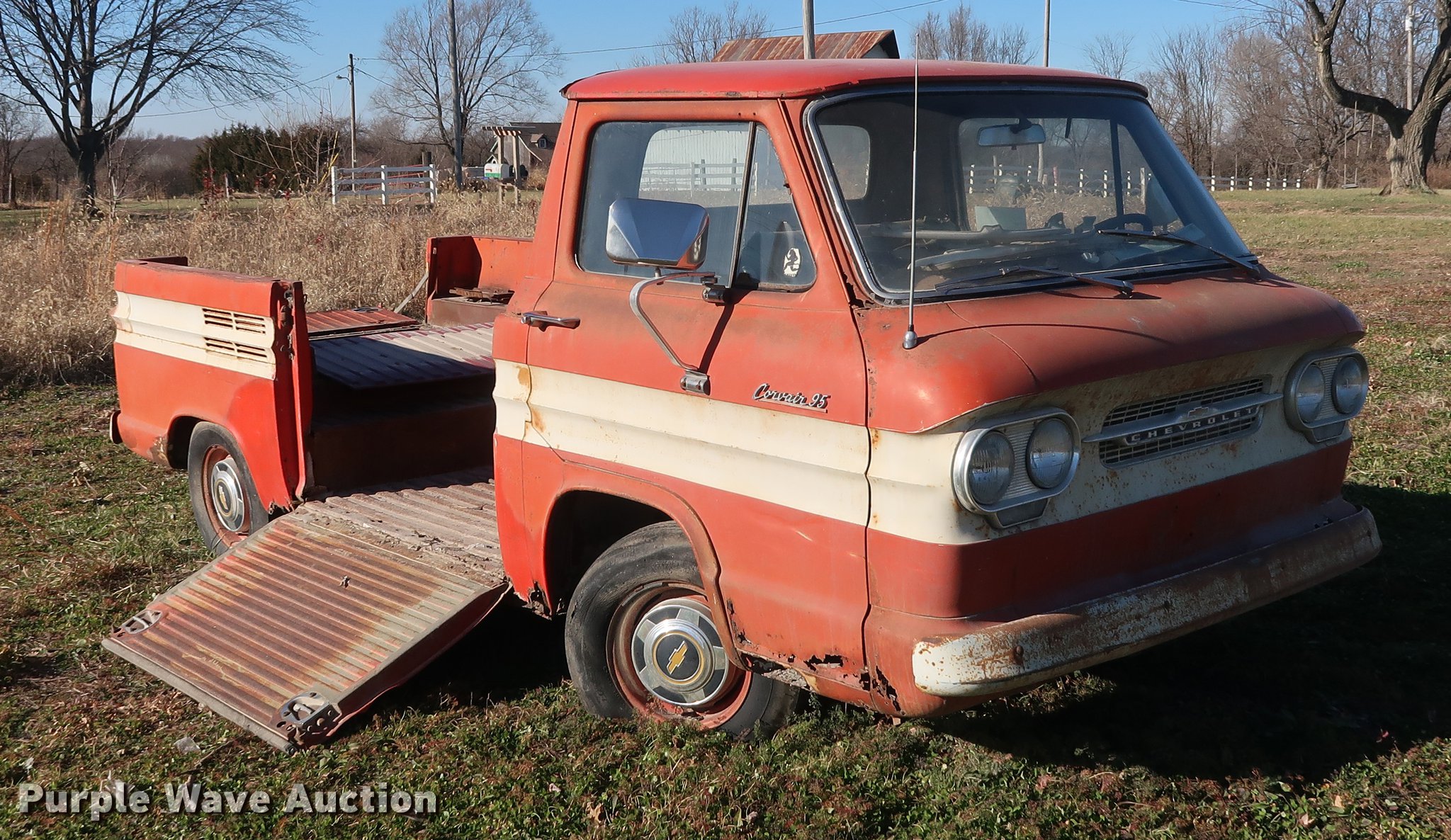 Purple Wave is selling a used Passenger Vehicle in Missouri. This item is a 1962 Chevrolet Corvair 95 with the following: 83,785 miles on odometer, Six cylinder gas engine, Four speed manual transmission, Manual windows and locks, Ramp side, Dead battery, Unknown operating condition