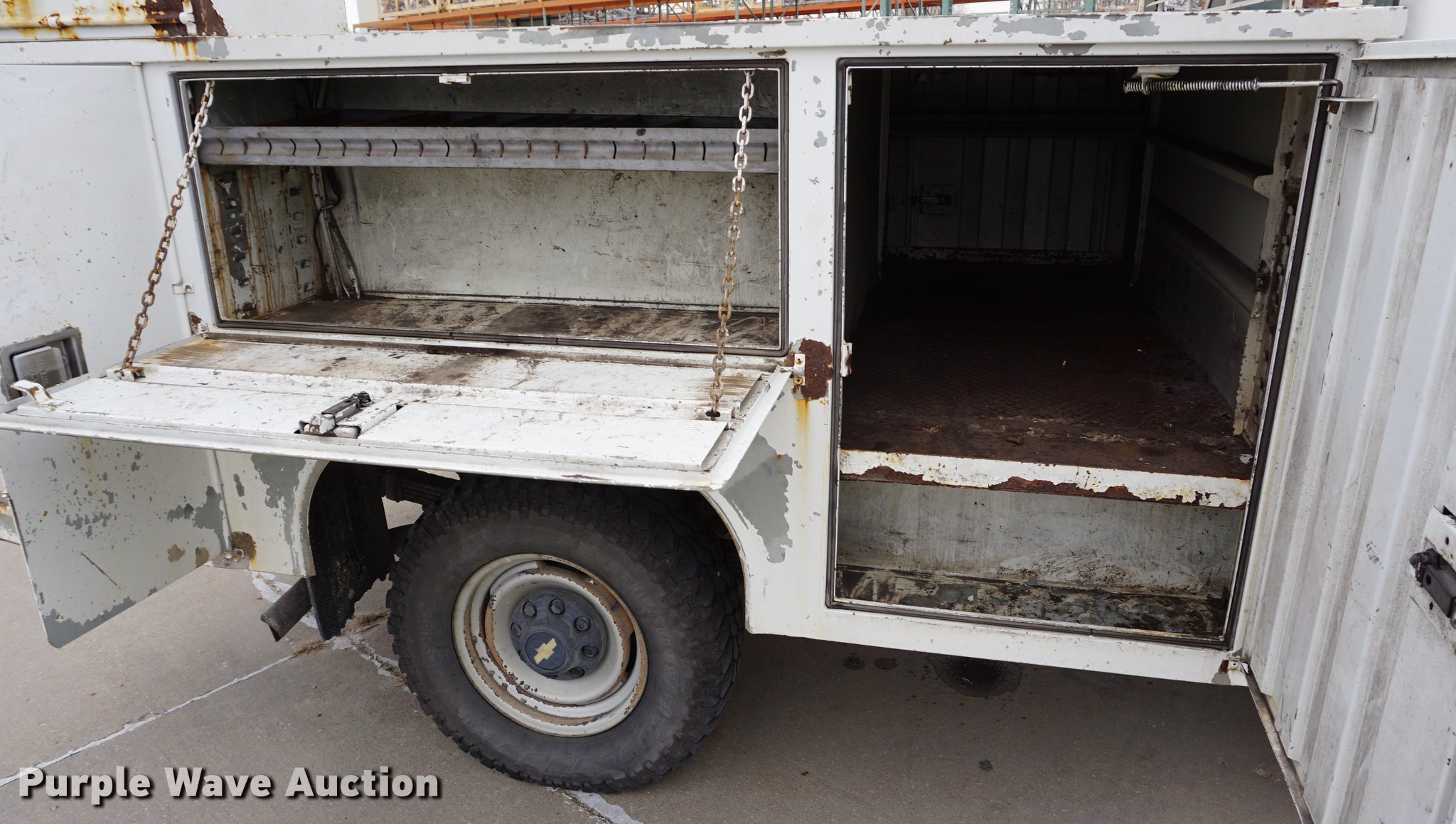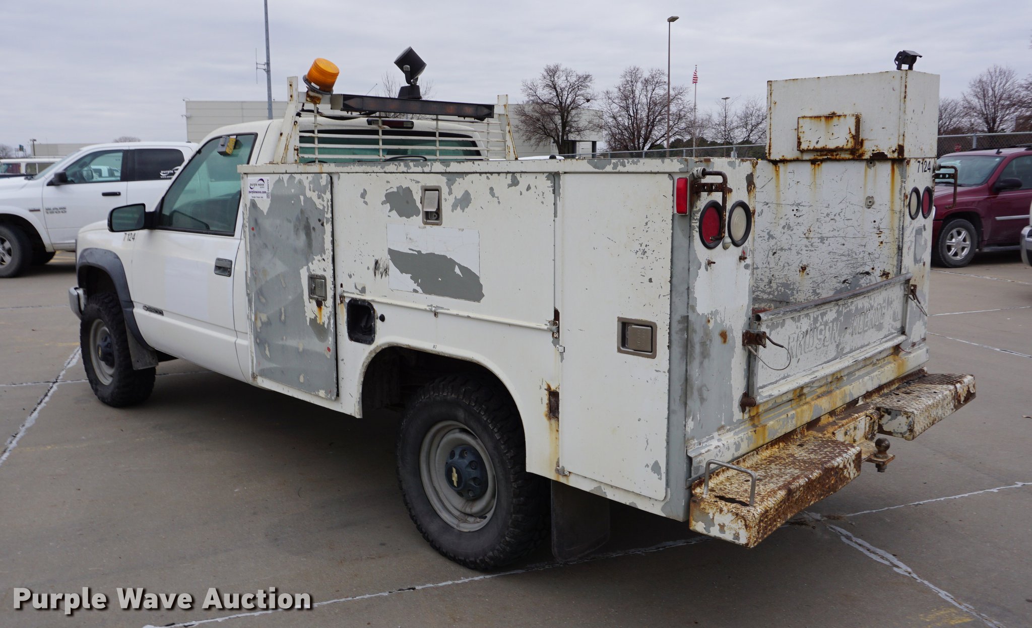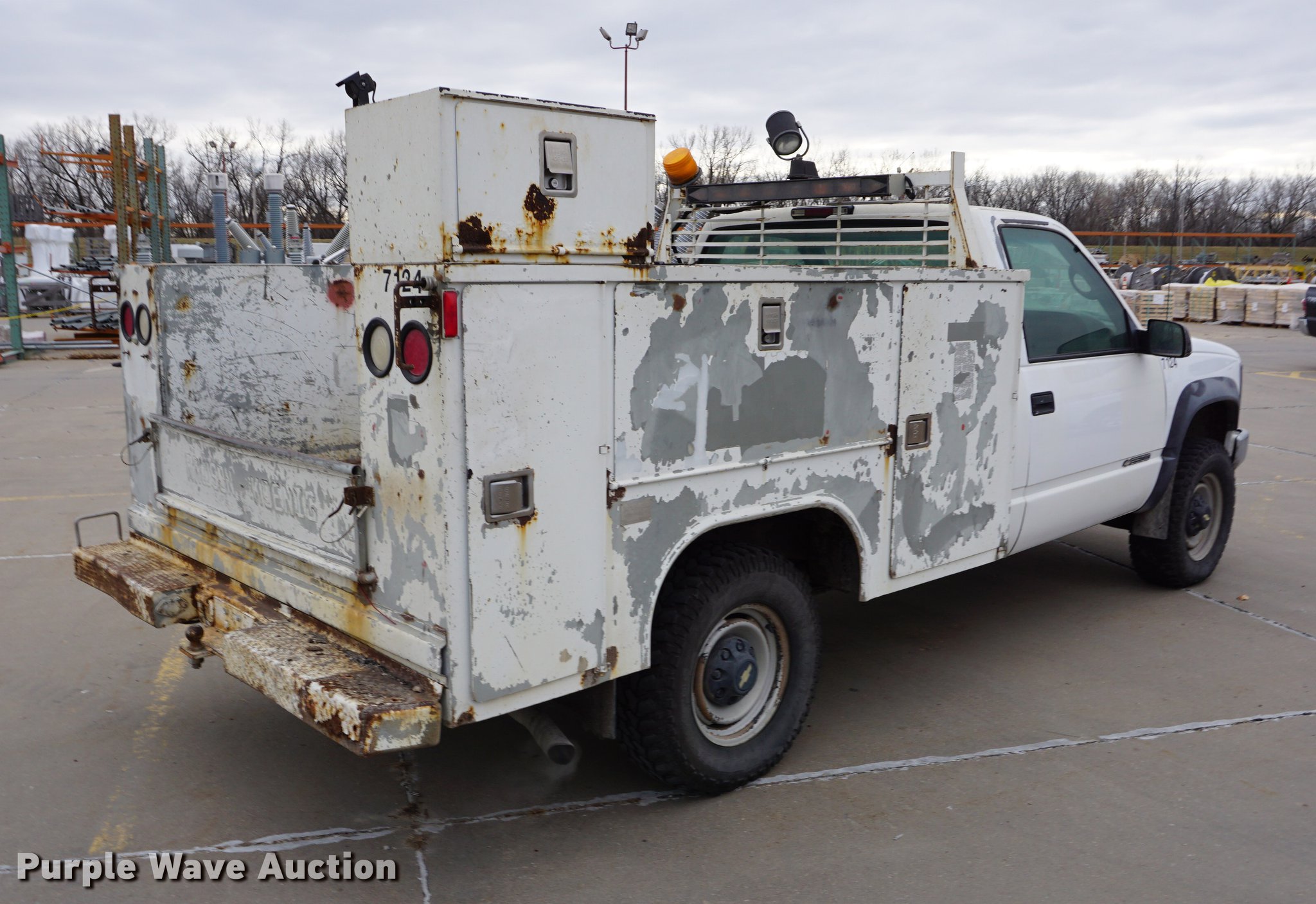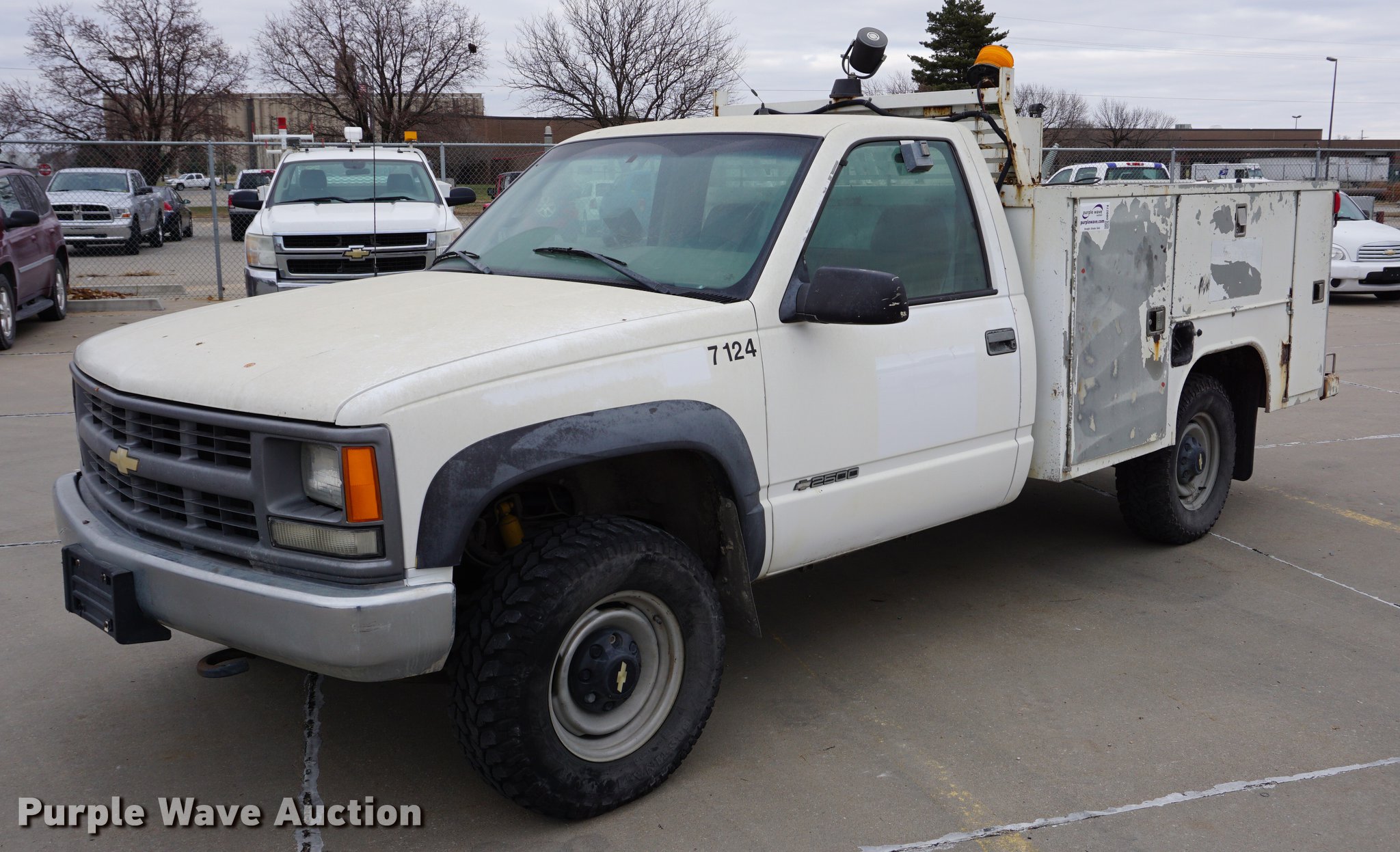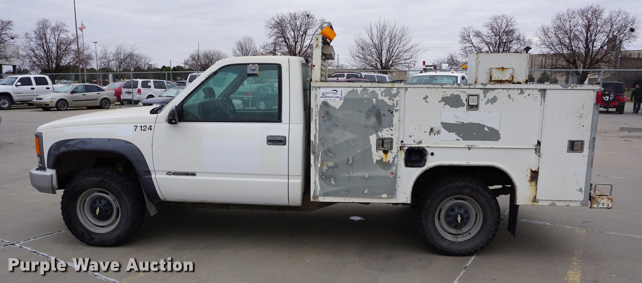 Purple Wave is selling a used 3/4 or 1 Ton Pickup or Van in Kansas. This item is a 2000 Chevrolet 2500 utility bed pickup truck with the following: 145,691 miles on odometer, 5.7L V8 OHV 16V gas engine, Automatic transmission, Four wheel drive, AC and heat, Tilt, Cruise, AM/FM/cassette, Manual windows and locks, Vinyl interior, Backup camera, Front tow hooks, Rawson-Koenig utility bed, 8'L x 81.5"W, Arrow light, Strobe light, 245/75R16 tires, Unit# 7124