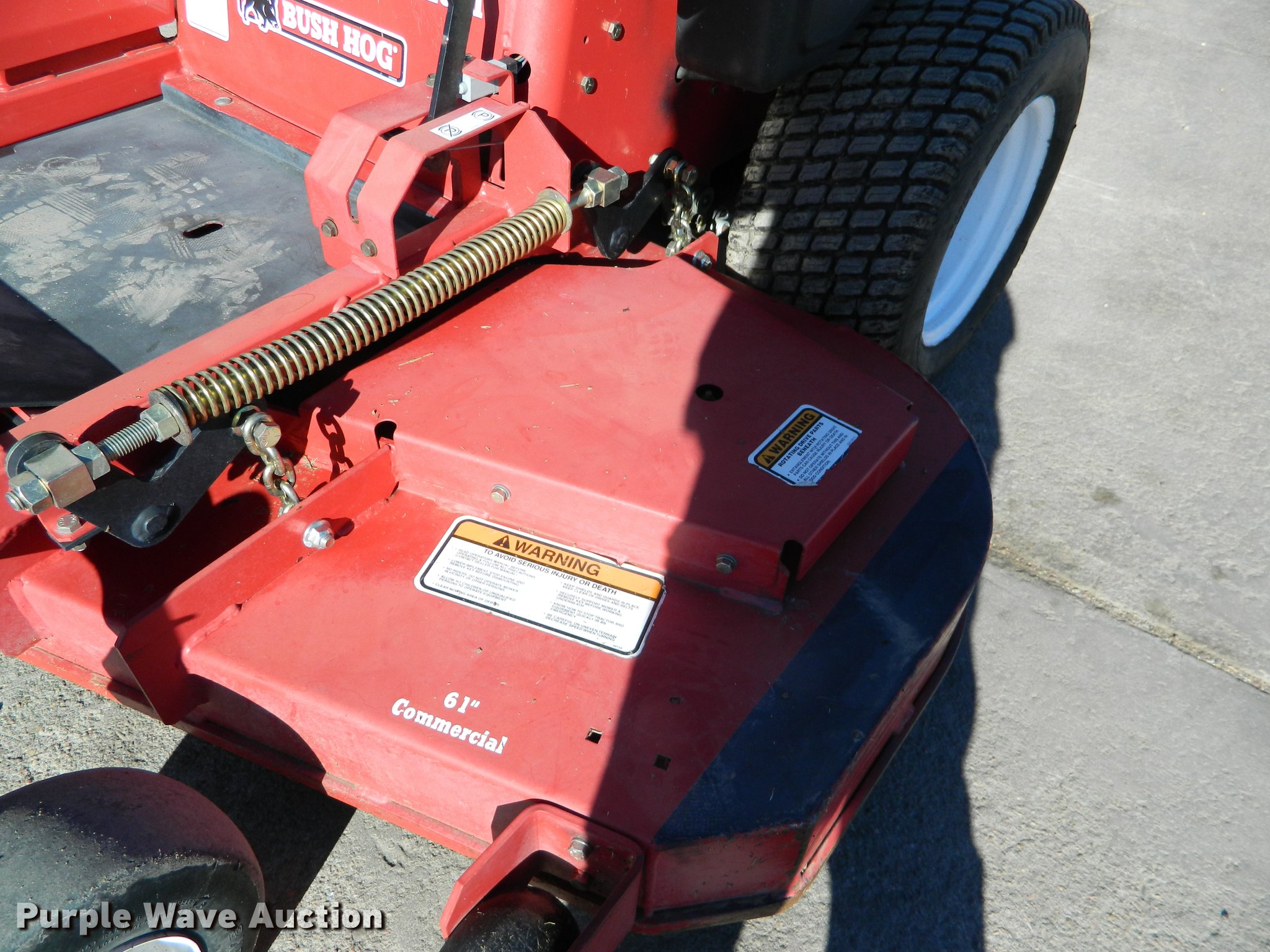 Purple Wave is selling a used Commercial Turf Mower in Kansas. This item is a 2011 Bush Hog EC2561 lawn mower with the following: 150 hours on meter, 61"W deck, Kohler gas engine, Hydrostatic transmission, ROPS, 13 x 5.00 front tires, 22 x 10.50-12 rear tires, Serial 12-00031