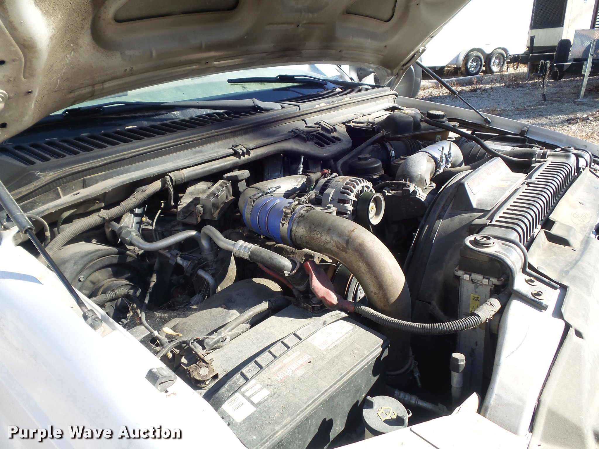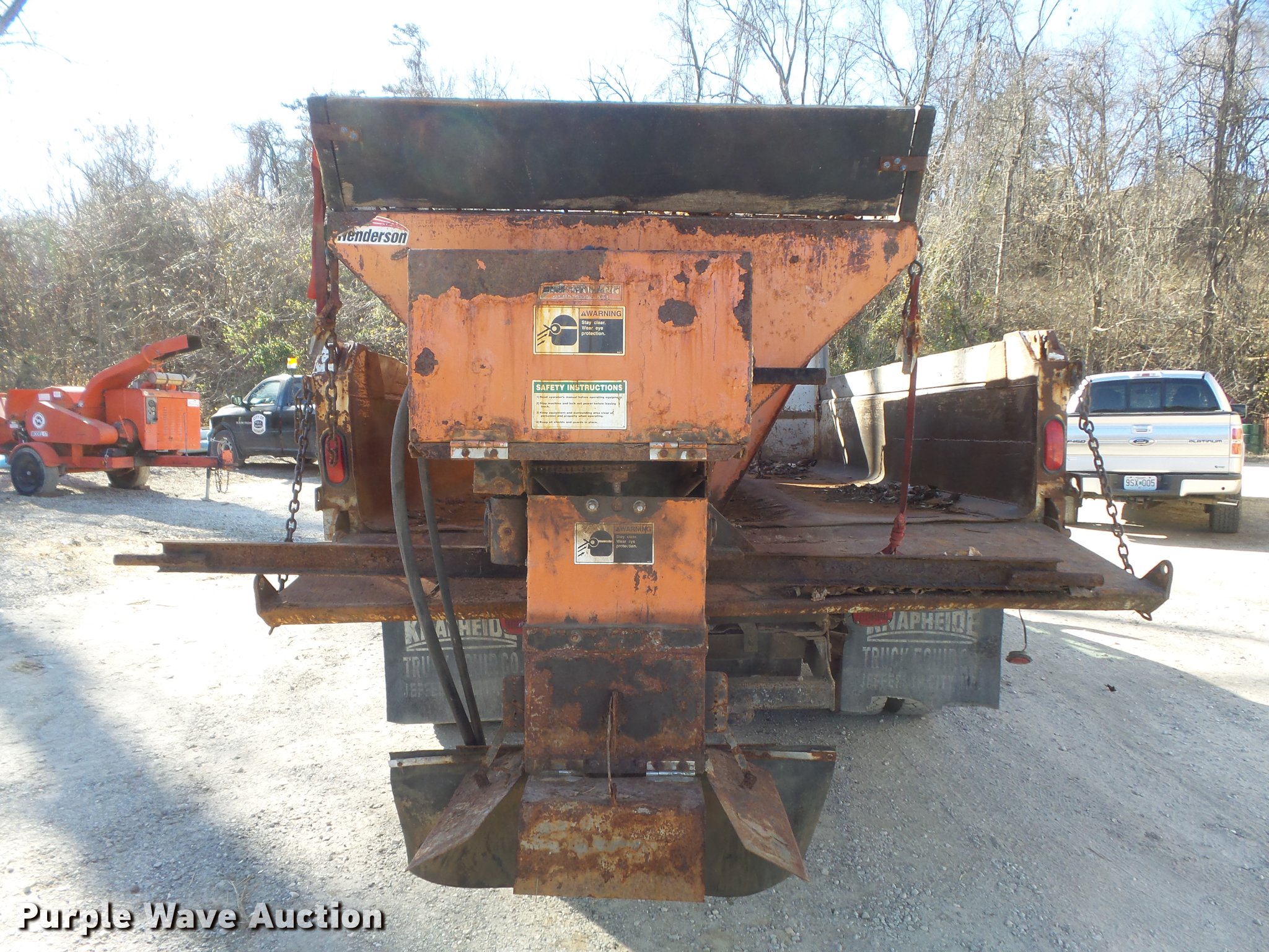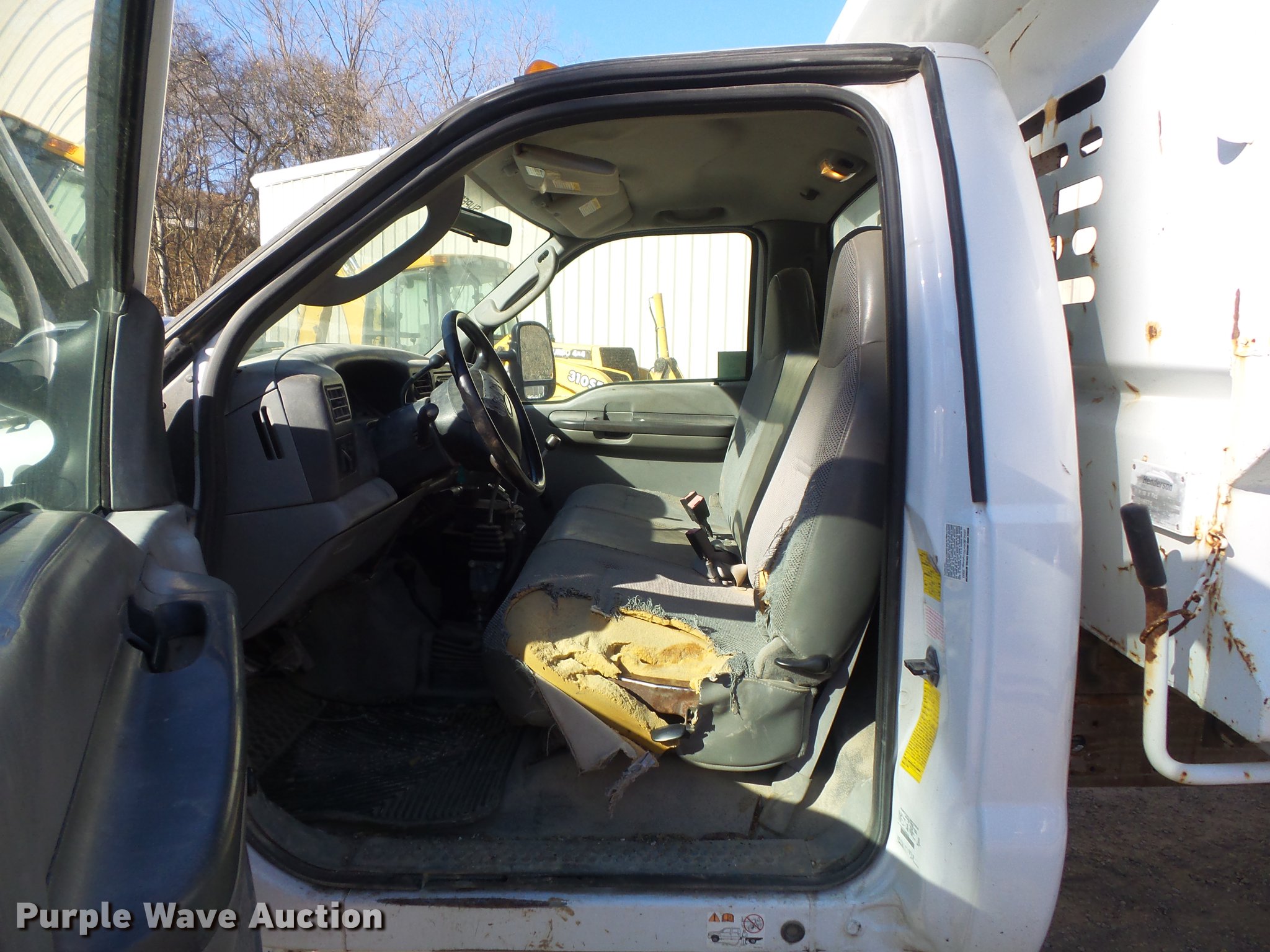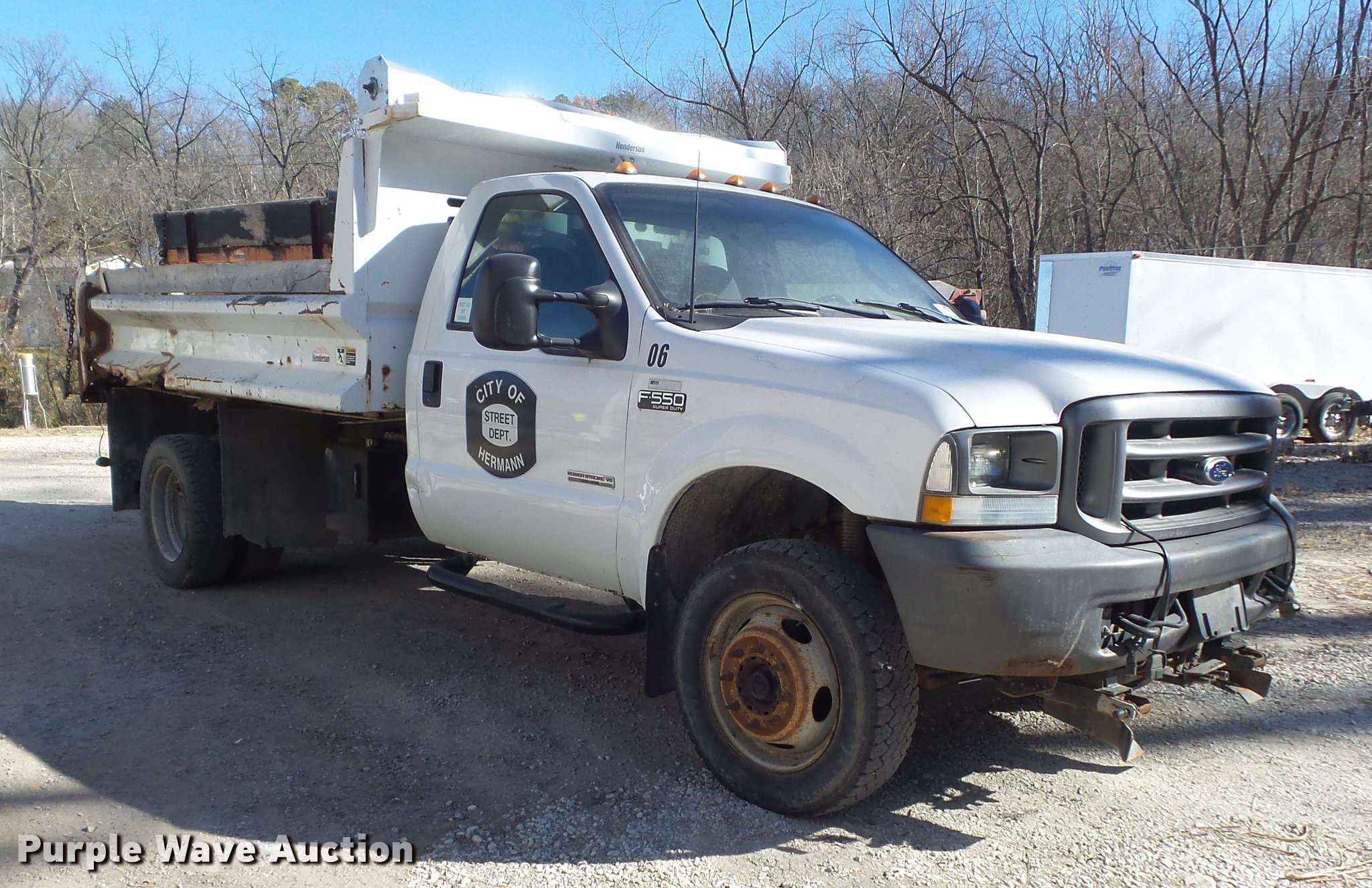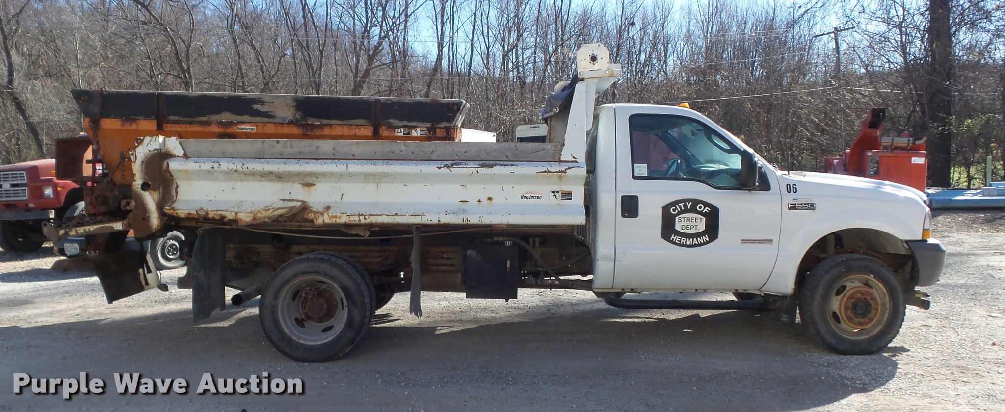 Purple Wave is selling a used Construction Dump Truck in Missouri. This item is a 2004 Ford F550 Super Duty XL dump truck with the following: 79,835 miles on odometer, 7,696 hours on meter, 6.0L V8 OHV 32V turbo diesel engine, Automatic transmission, Four wheel drive, AC and heat, AM/FM, Cloth interior, Henderson 11x18xFXS dump bed, 11'L x 96"W, 16" side height, 6" side board height, Western snow plow mount and hookups, Henderson 10XMILDXHYD spreader, Hydraulic driven, Unknown operating condition, 225/70R19.5 tires, Cylinder head gasket issues