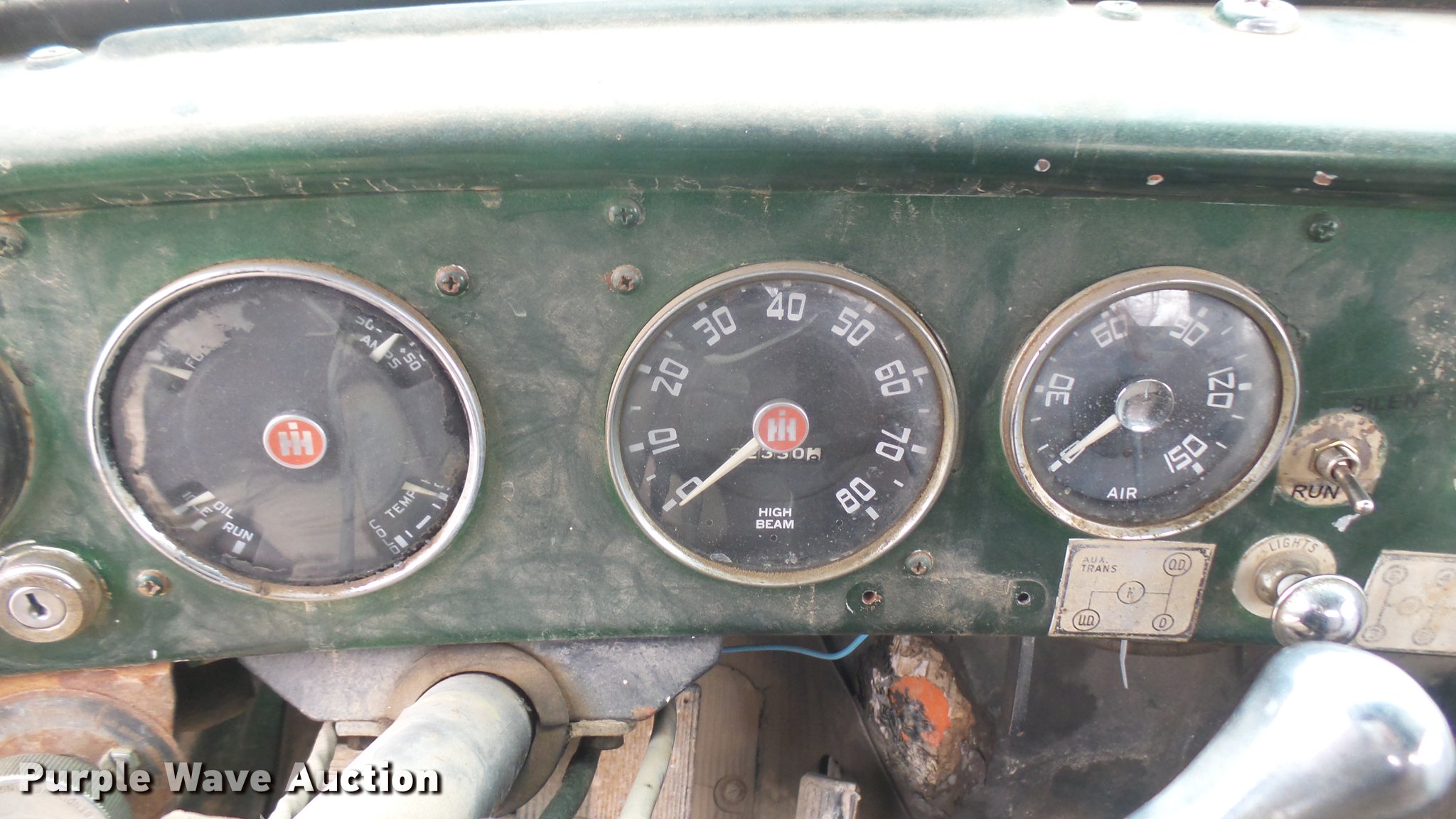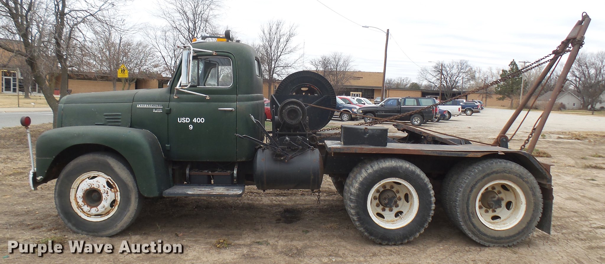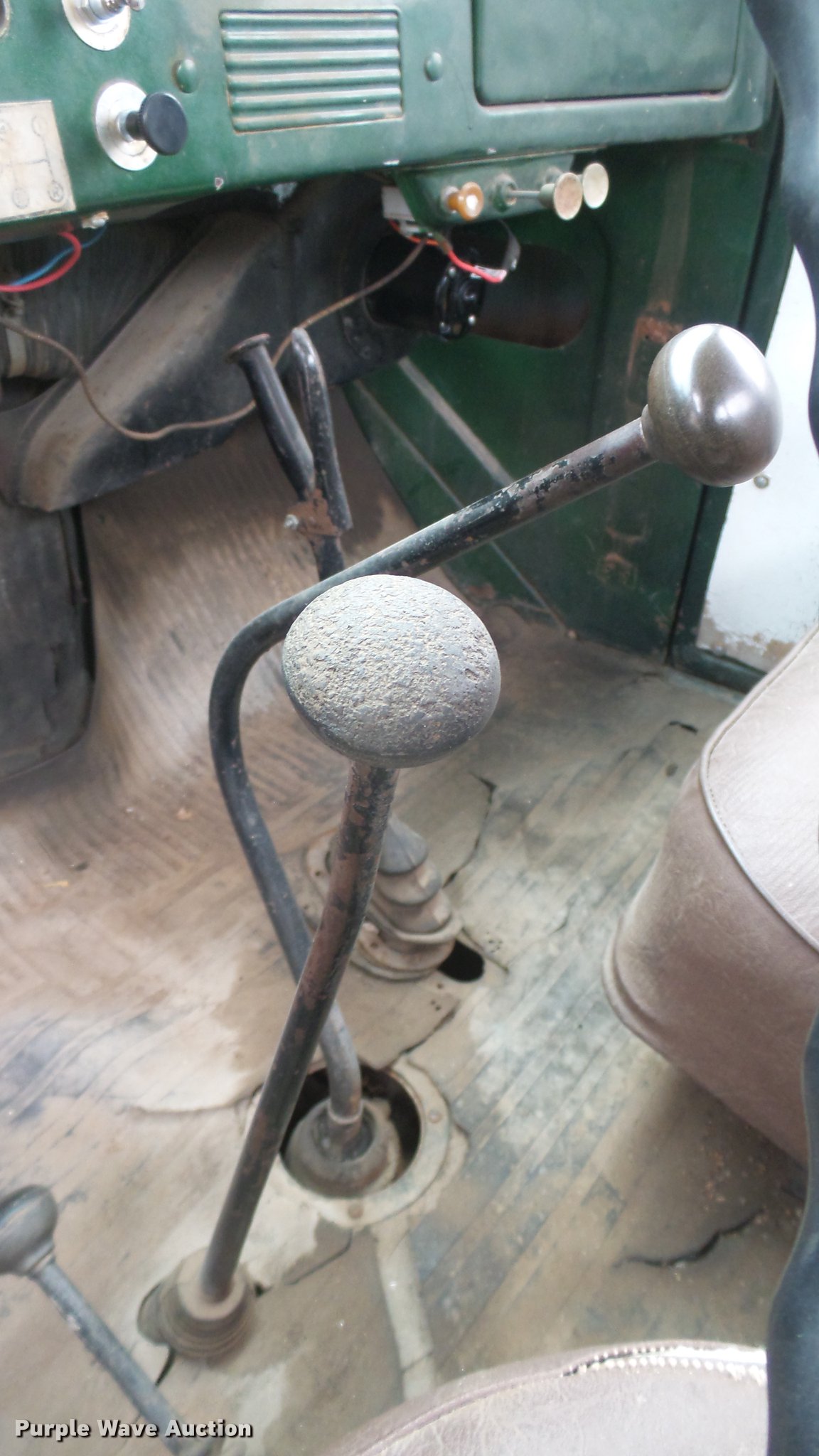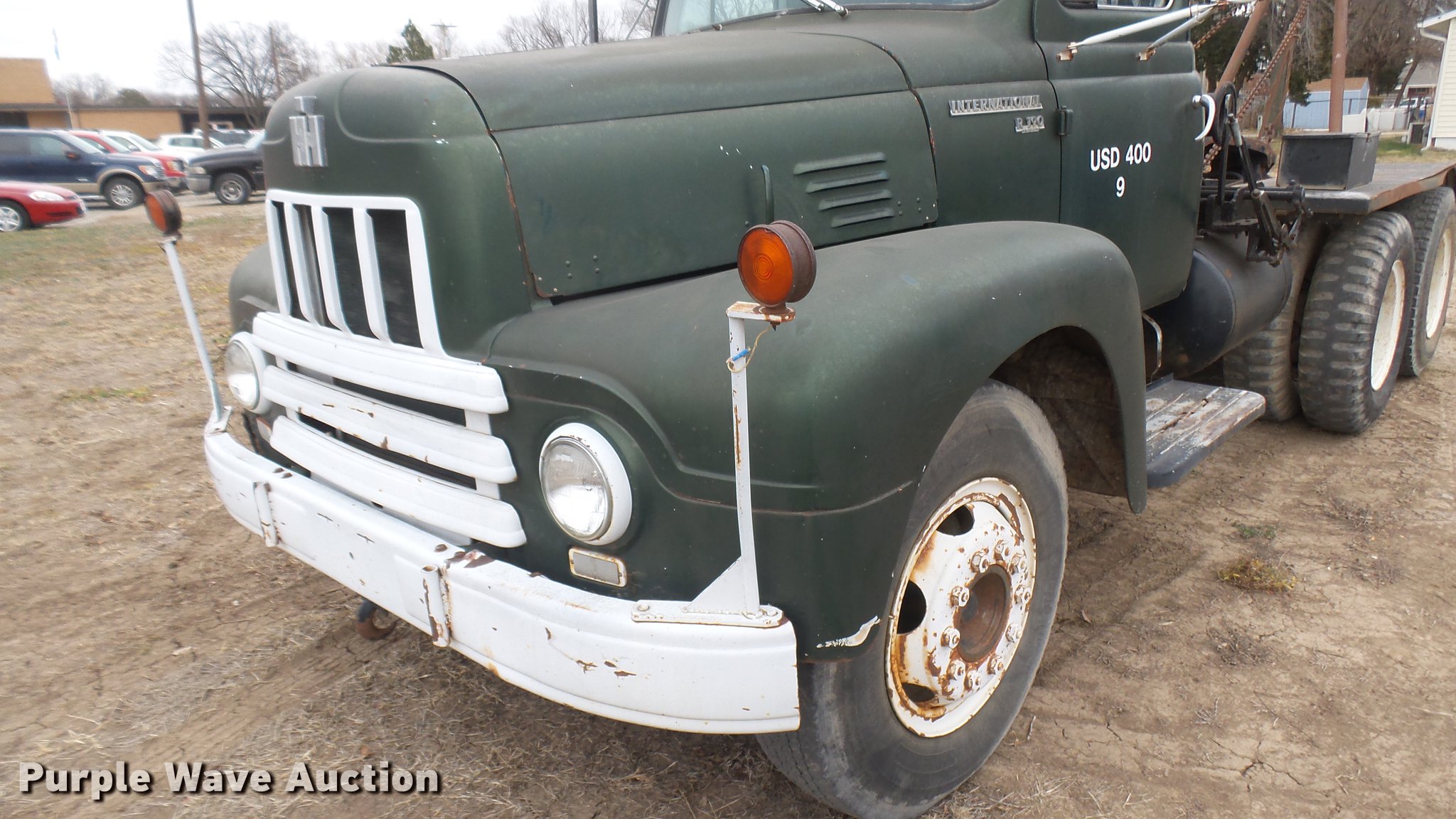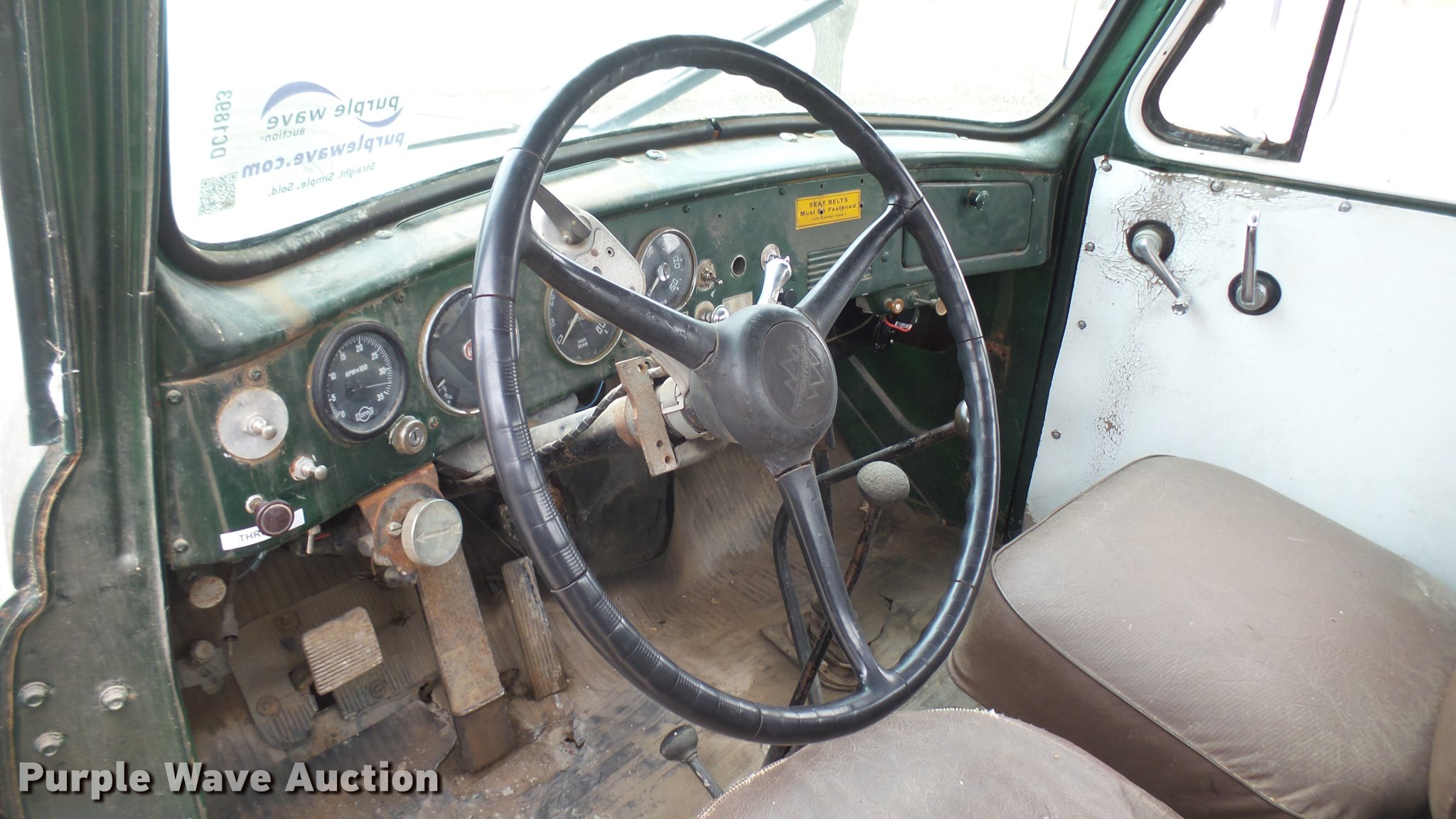 Purple Wave is selling a used Flat Bed Truck in Kansas. This item is a 1953 International RF192 flatbed truck with the following: 32,330 miles on odometer, Actual mileage unknown, 406 C.I.D. six cylinder gas engine, 138 HP, 4+3 manual transmission, Tandem axle, Inter-axle differential lock, Manual windows and locks, Vinyl interior, Converted to 12V, 6V generator is available to be included, Front tow hooks, Fifth wheel plate, Tulsa winch, 7' gin pole, Pin hitch, Full fenders, Air brakes, 157" wheelbase, 9.00-20 tires, GVWR 35,000 lbs, (4) sets of dual tire chains