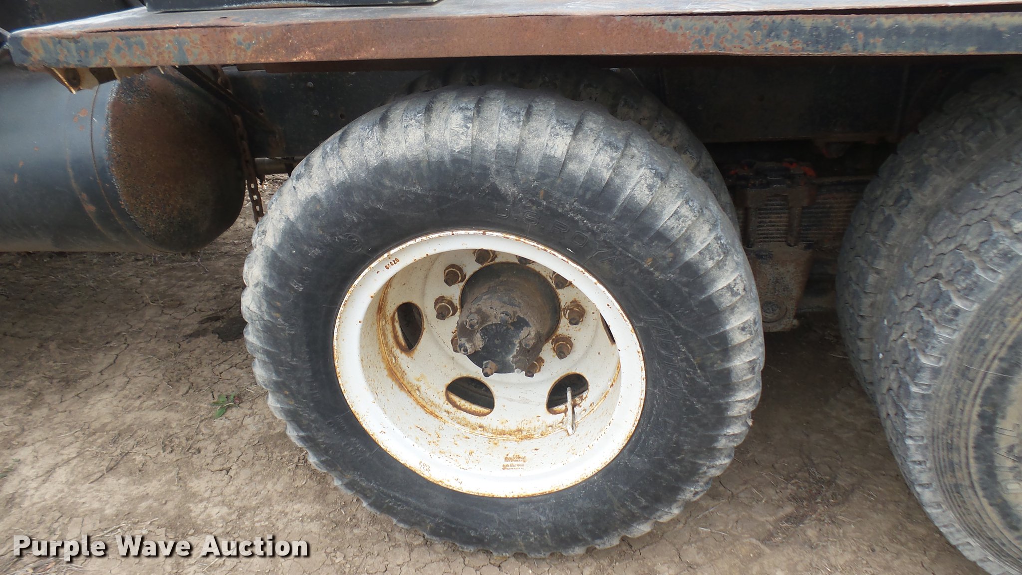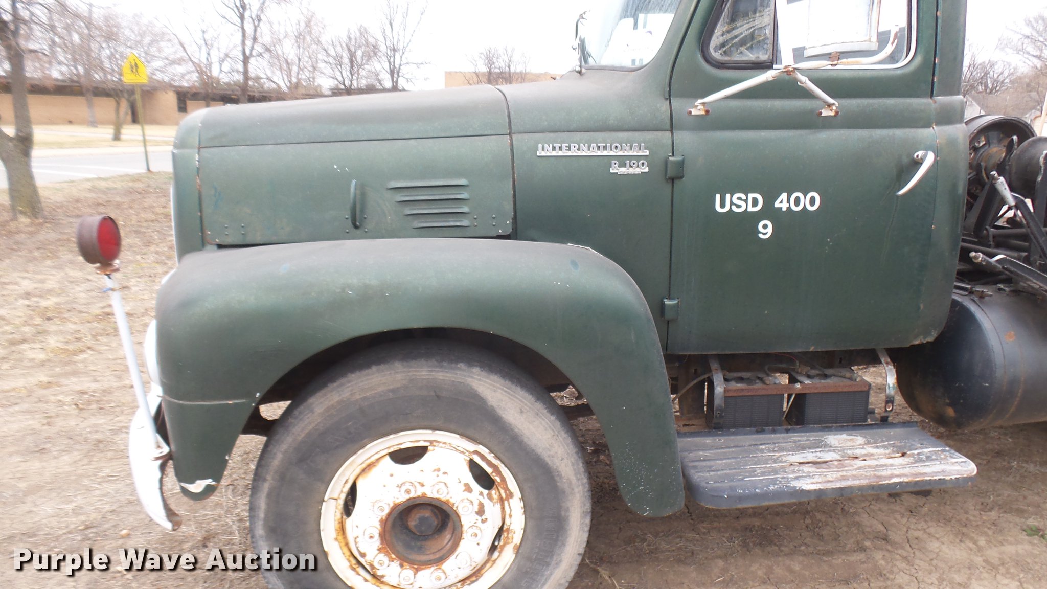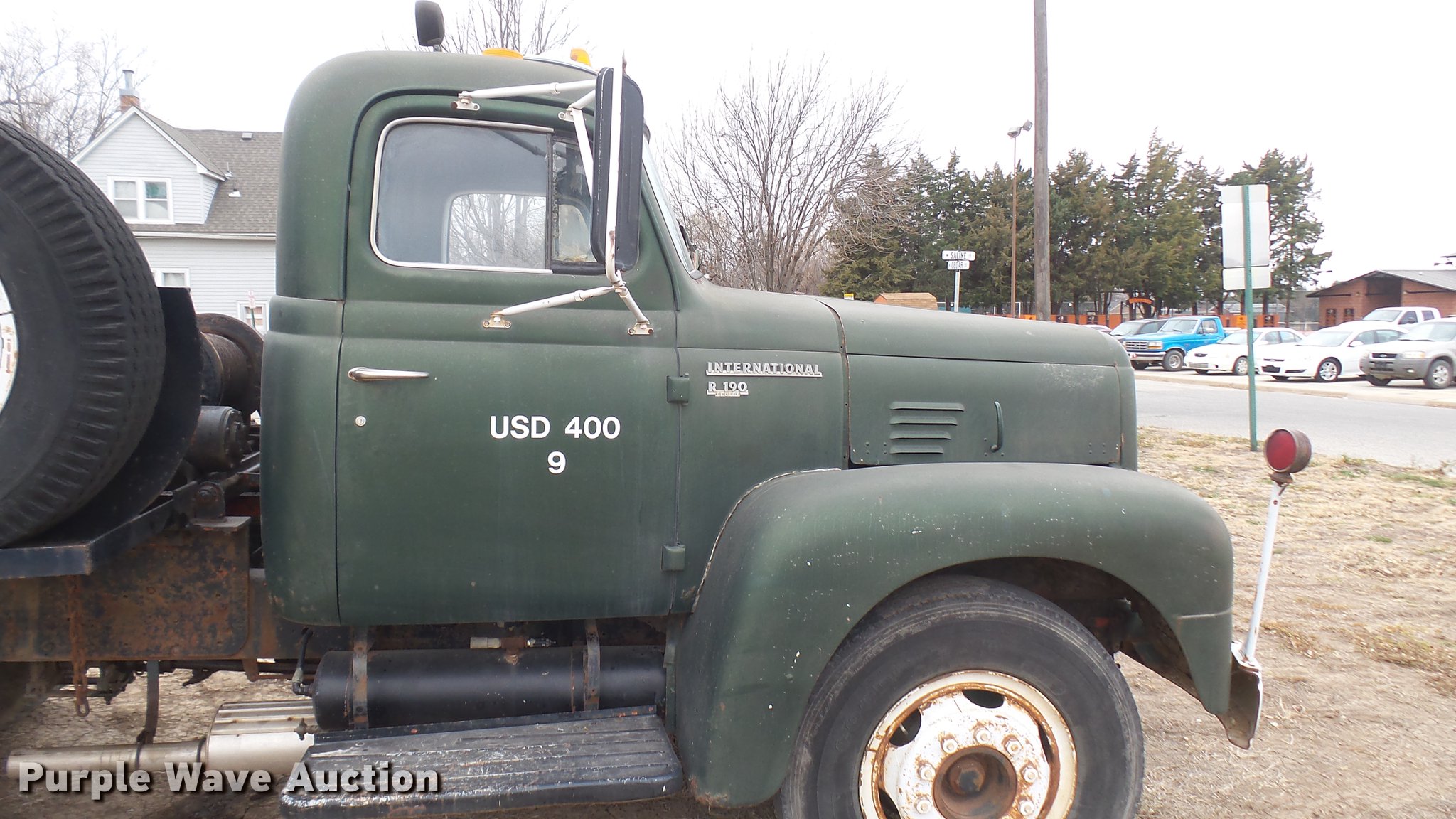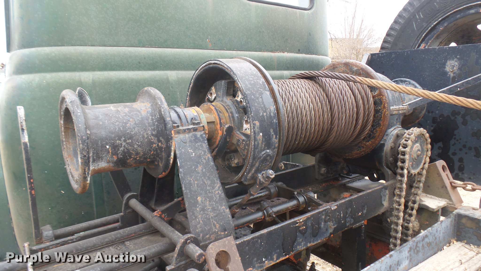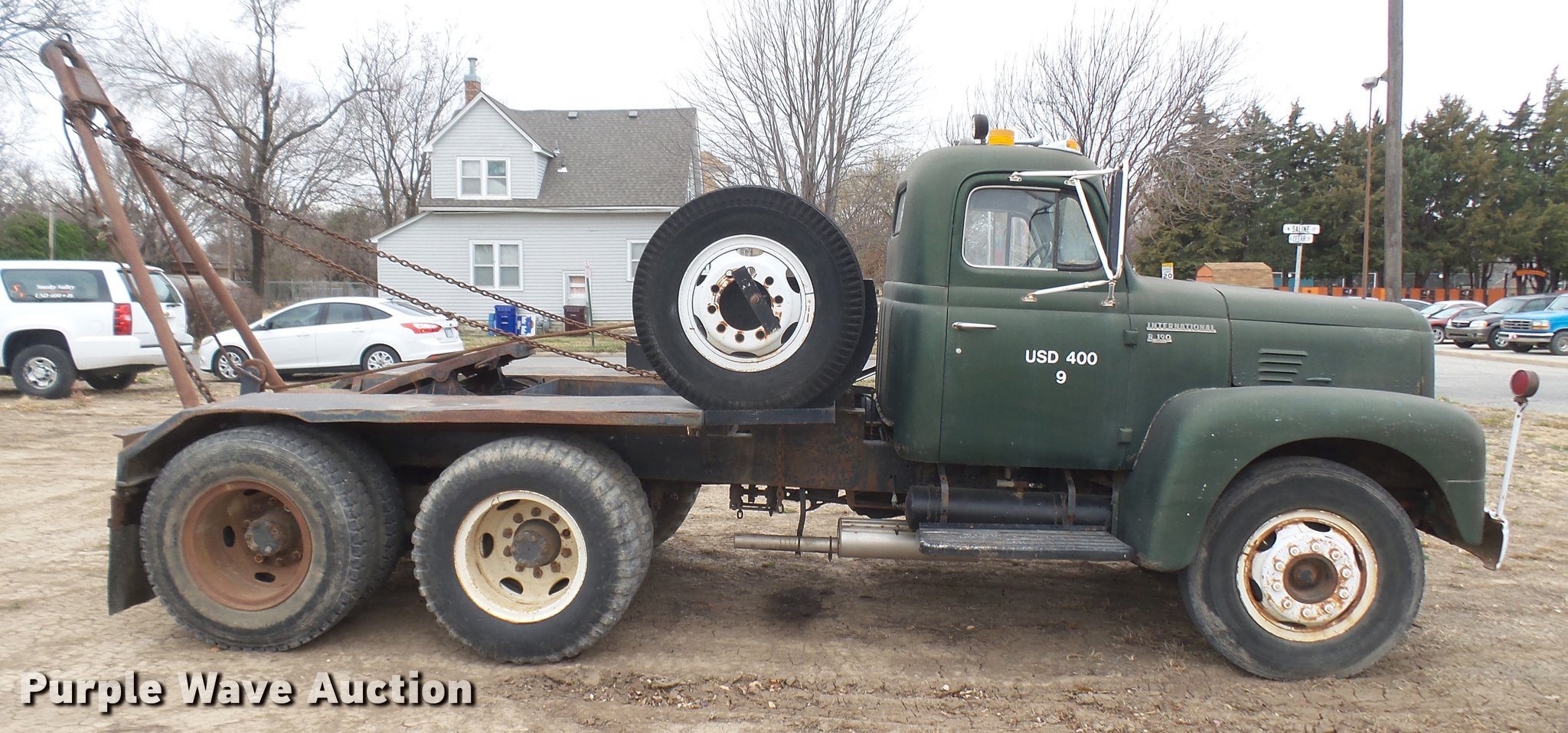 Purple Wave is selling a used Flat Bed Truck in Kansas. This item is a 1953 International RF192 flatbed truck with the following: 32,330 miles on odometer, Actual mileage unknown, 406 C.I.D. six cylinder gas engine, 138 HP, 4+3 manual transmission, Tandem axle, Inter-axle differential lock, Manual windows and locks, Vinyl interior, Converted to 12V, 6V generator is available to be included, Front tow hooks, Fifth wheel plate, Tulsa winch, 7' gin pole, Pin hitch, Full fenders, Air brakes, 157" wheelbase, 9.00-20 tires, GVWR 35,000 lbs, (4) sets of dual tire chains