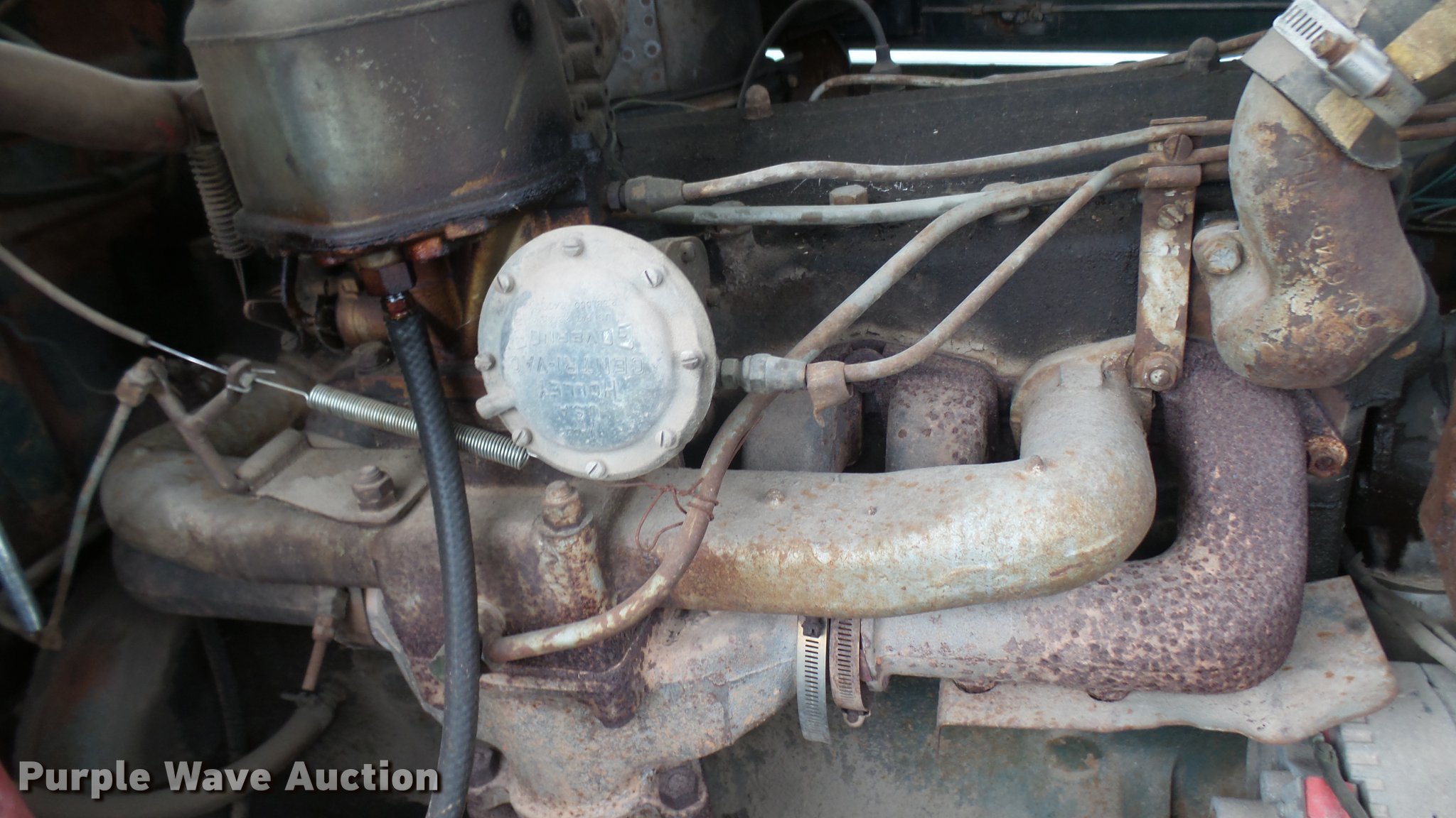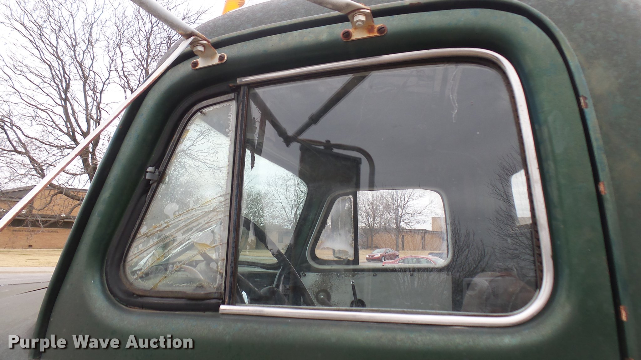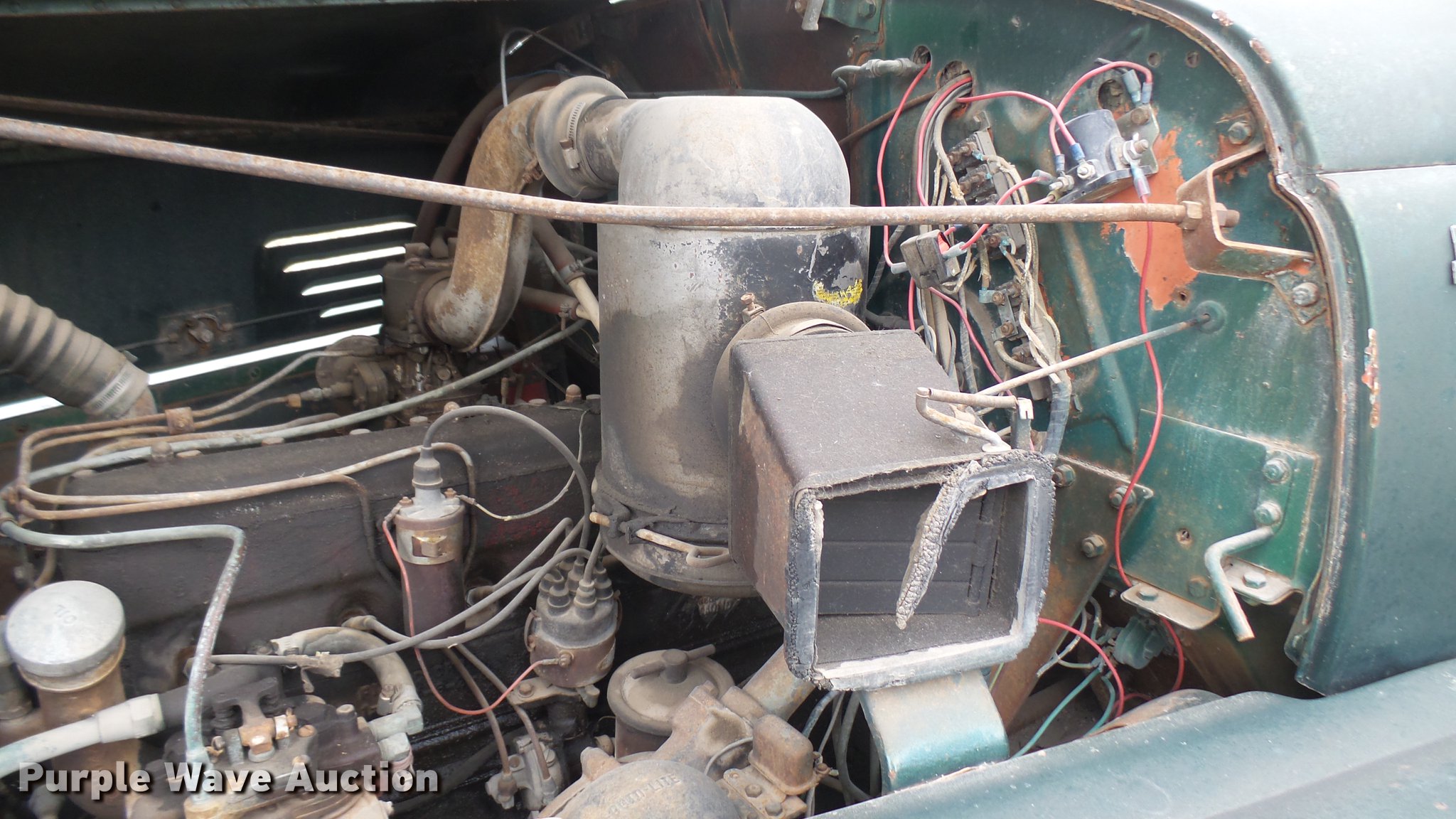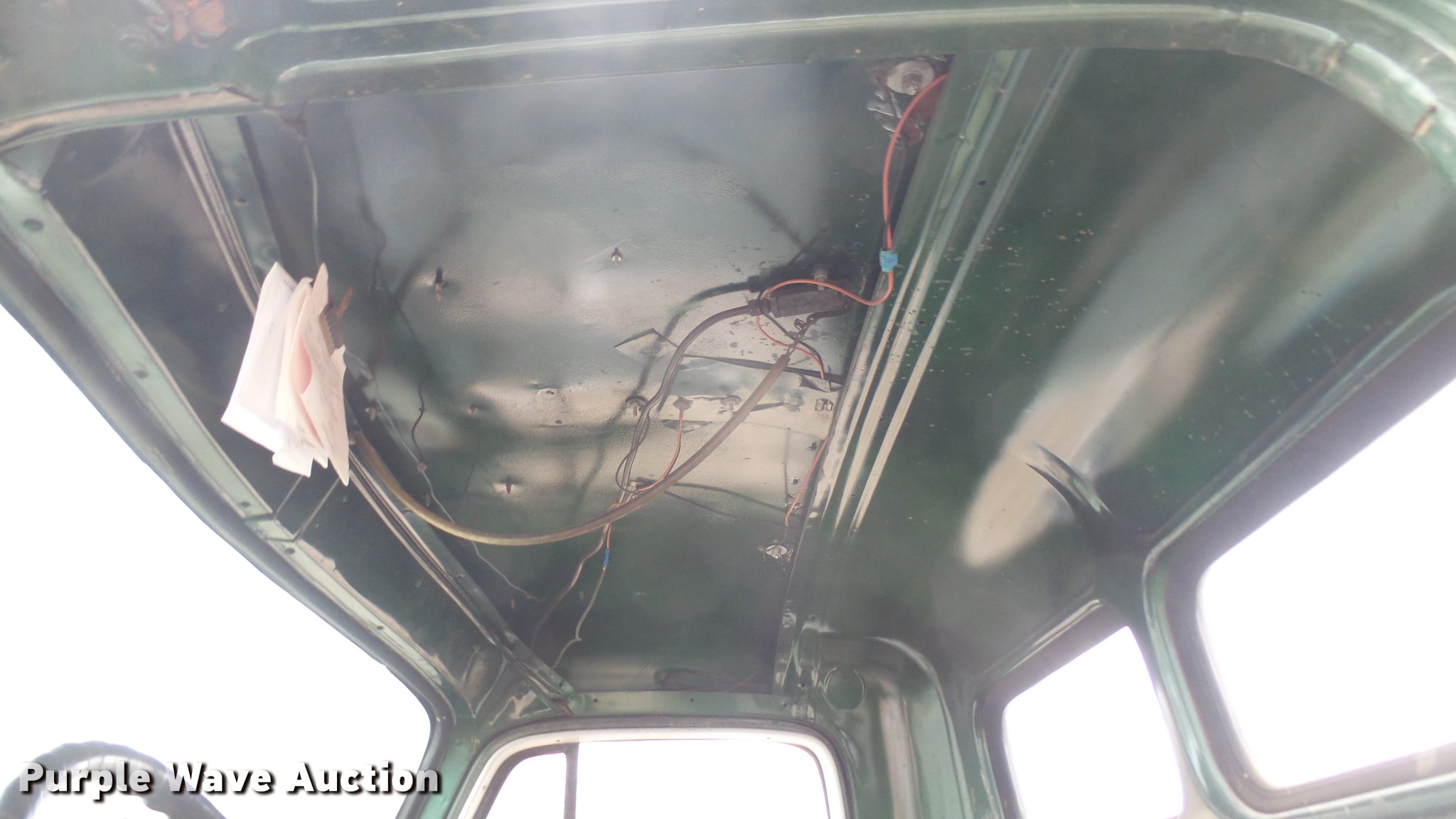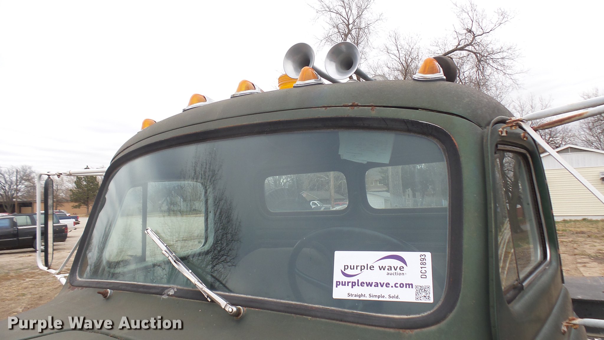 Purple Wave is selling a used Flat Bed Truck in Kansas. This item is a 1953 International RF192 flatbed truck with the following: 32,330 miles on odometer, Actual mileage unknown, 406 C.I.D. six cylinder gas engine, 138 HP, 4+3 manual transmission, Tandem axle, Inter-axle differential lock, Manual windows and locks, Vinyl interior, Converted to 12V, 6V generator is available to be included, Front tow hooks, Fifth wheel plate, Tulsa winch, 7' gin pole, Pin hitch, Full fenders, Air brakes, 157" wheelbase, 9.00-20 tires, GVWR 35,000 lbs, (4) sets of dual tire chains