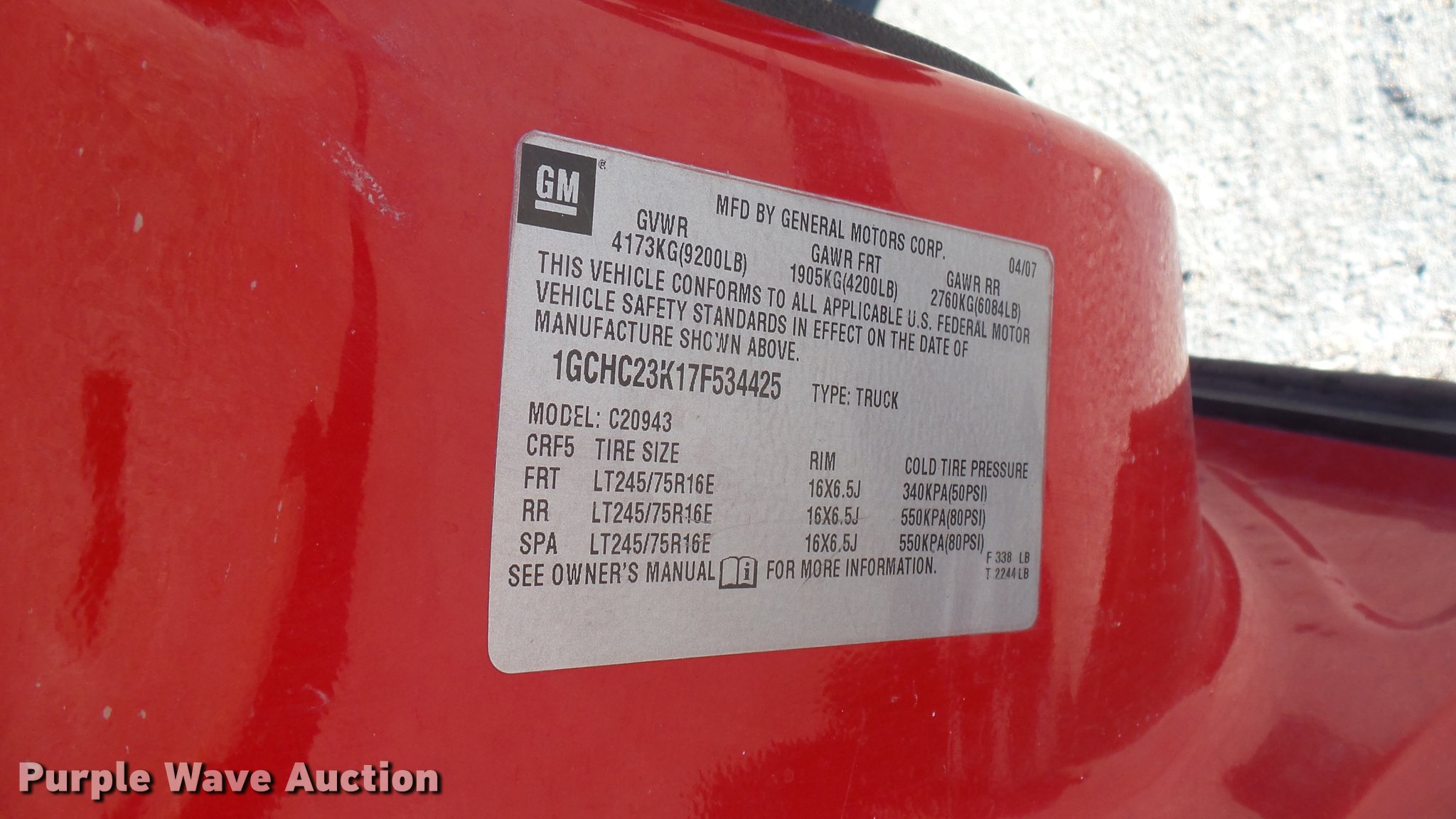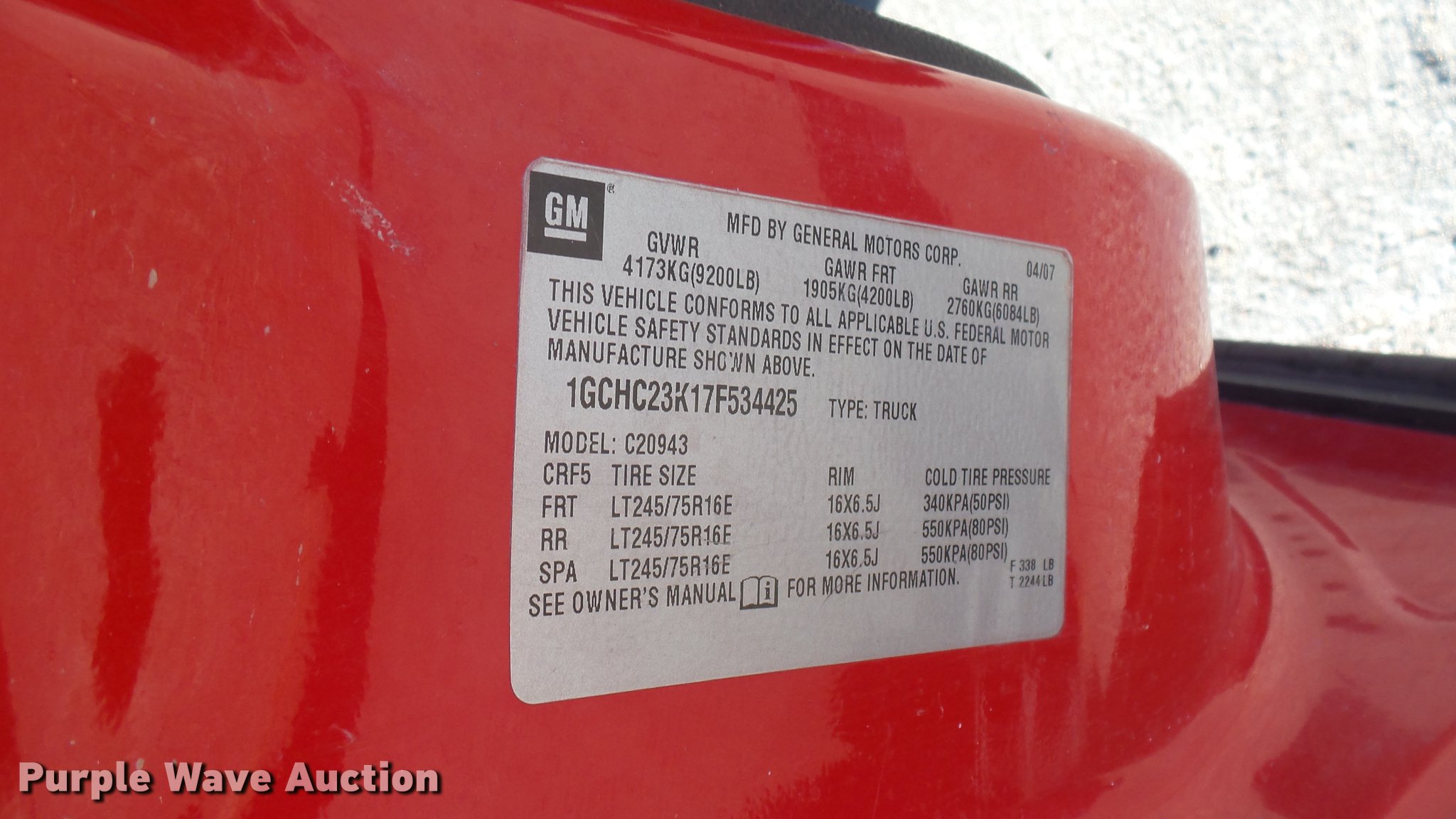 2007 Chevrolet Silverado 2500HD Crew Cab pickup truck. 160,868 miles on odometer, 6.0L V8 OHV 16V gas engine, Automatic transmission, AC and heat, Tilt, Cruise, AM/FM/CD, Power windows, locks, and mirrors, Cloth interior, Front tow hooks, Running boards, Long bed, Receiver hitch, Trailer wiring, 245/75R16 tires. Kansas title. 1GCHC23K17F534425. Bryant & Bryant Construction, Inc.. 703 McNair St. Halstead, KS 67056