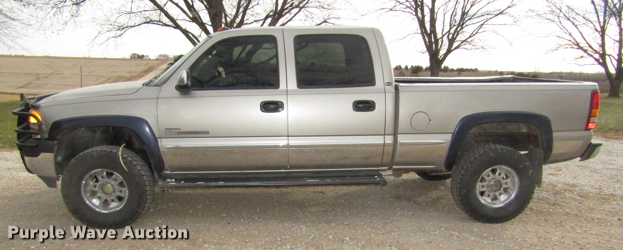 Purple Wave is selling a used 3/4 or 1 Ton Pickup or Van in Nebraska. This item is a 2002 GMC Sierra 2500HD SLE Crew Cab pickup truck with the following: 349,323 miles on odometer, Miles may vary, still in use, 6.6L V8 OHV 32V turbo diesel engine, 300 HP, Automatic transmission, Four wheel drive, AC and heat, Tilt, Cruise, AM/FM/CD, Power windows, locks, mirrors, and seats, Cloth interior, Front tow hooks, Running boards, Brake controller, Ranch Hand grill guard, Long bed, Bed liner, Gooseneck ball, Receiver hitch, Trailer wiring, Aluminum wheels, Nitto Terra Grappler LT305/70R16 tires, Head gaskets and bolts replaced in October 2017, Injectors and fuel lines replaced in 2016, Windshield damage, Bed rail damaged