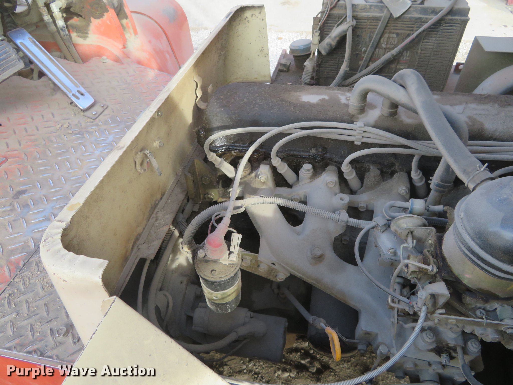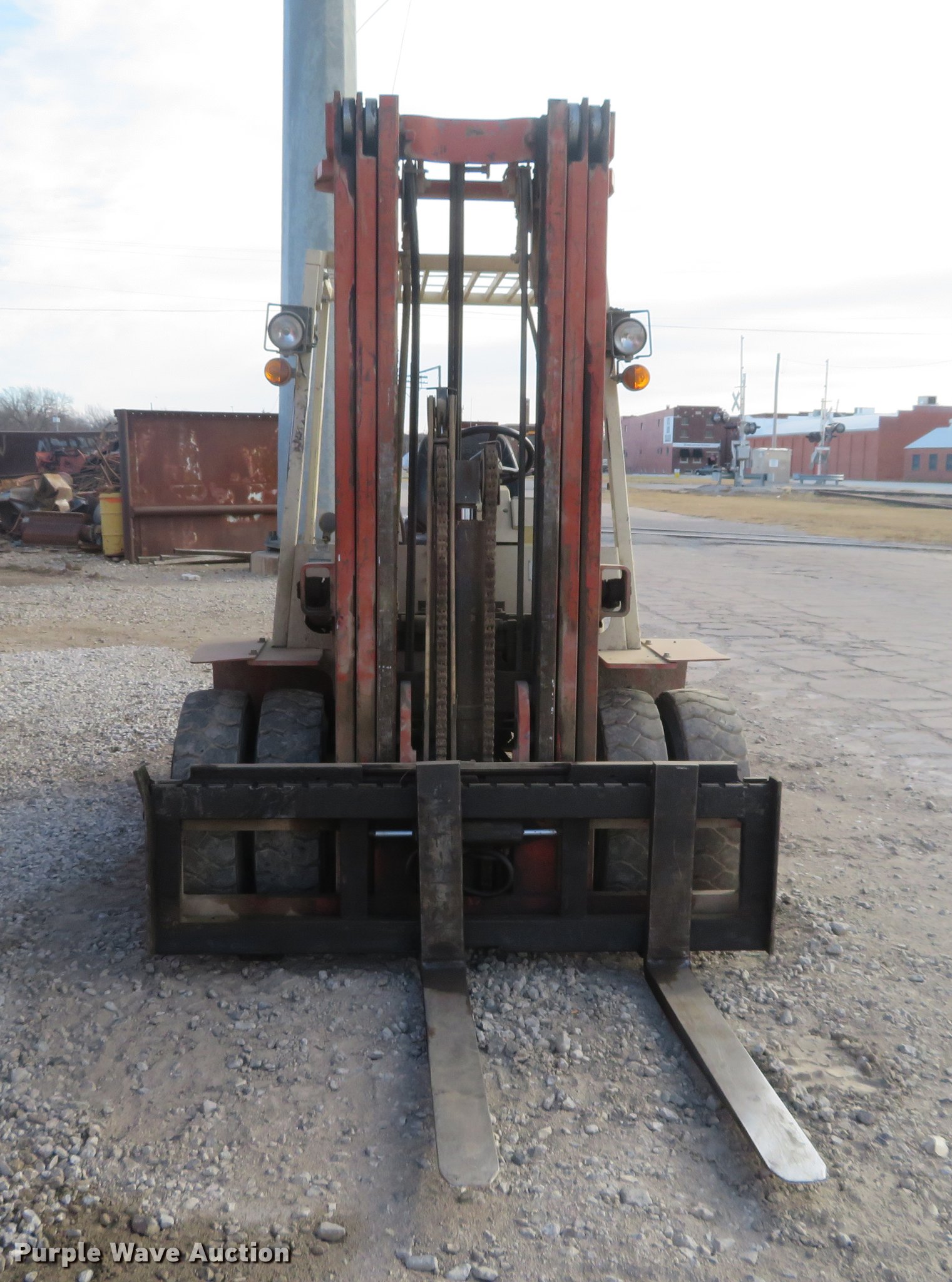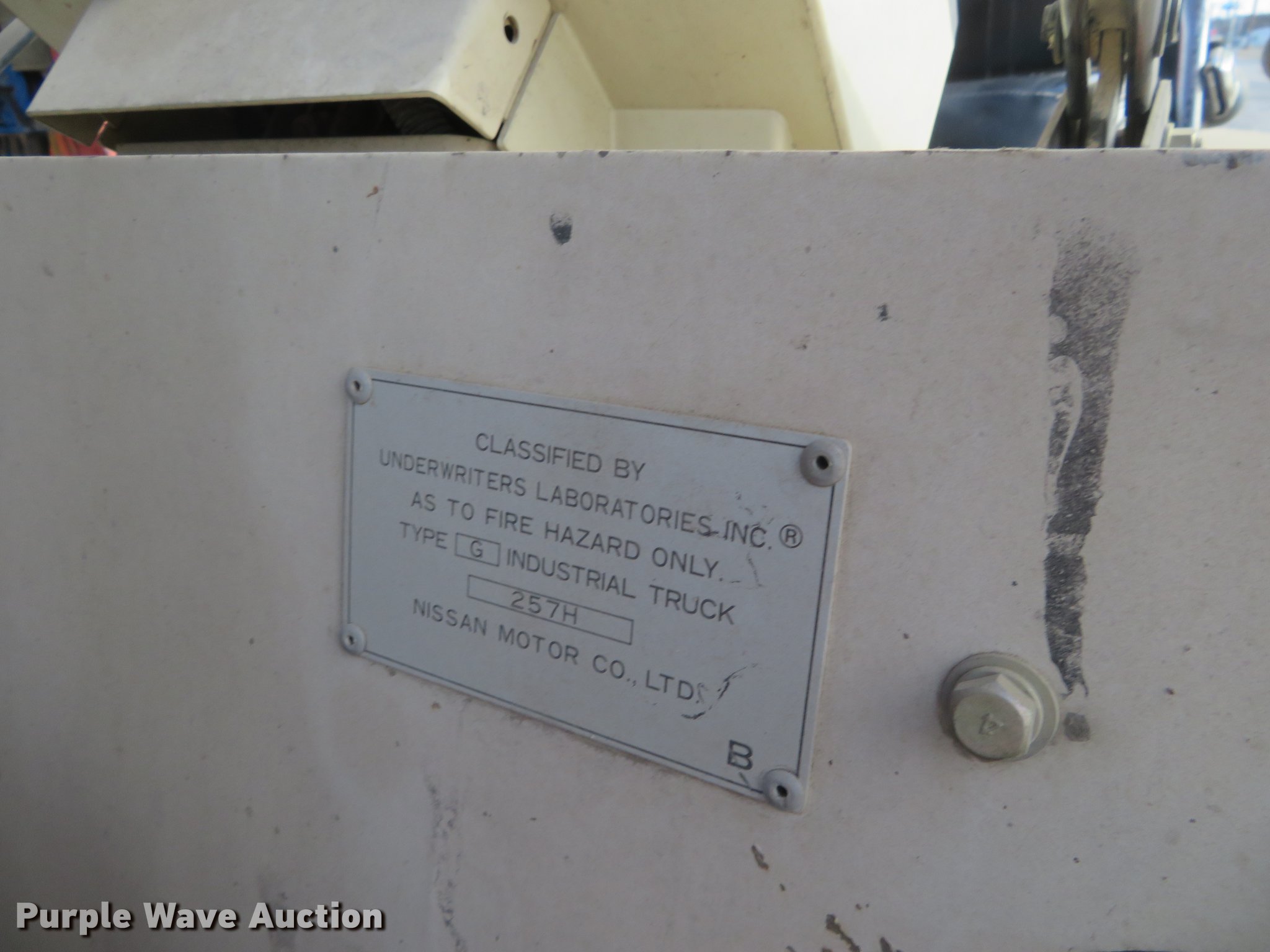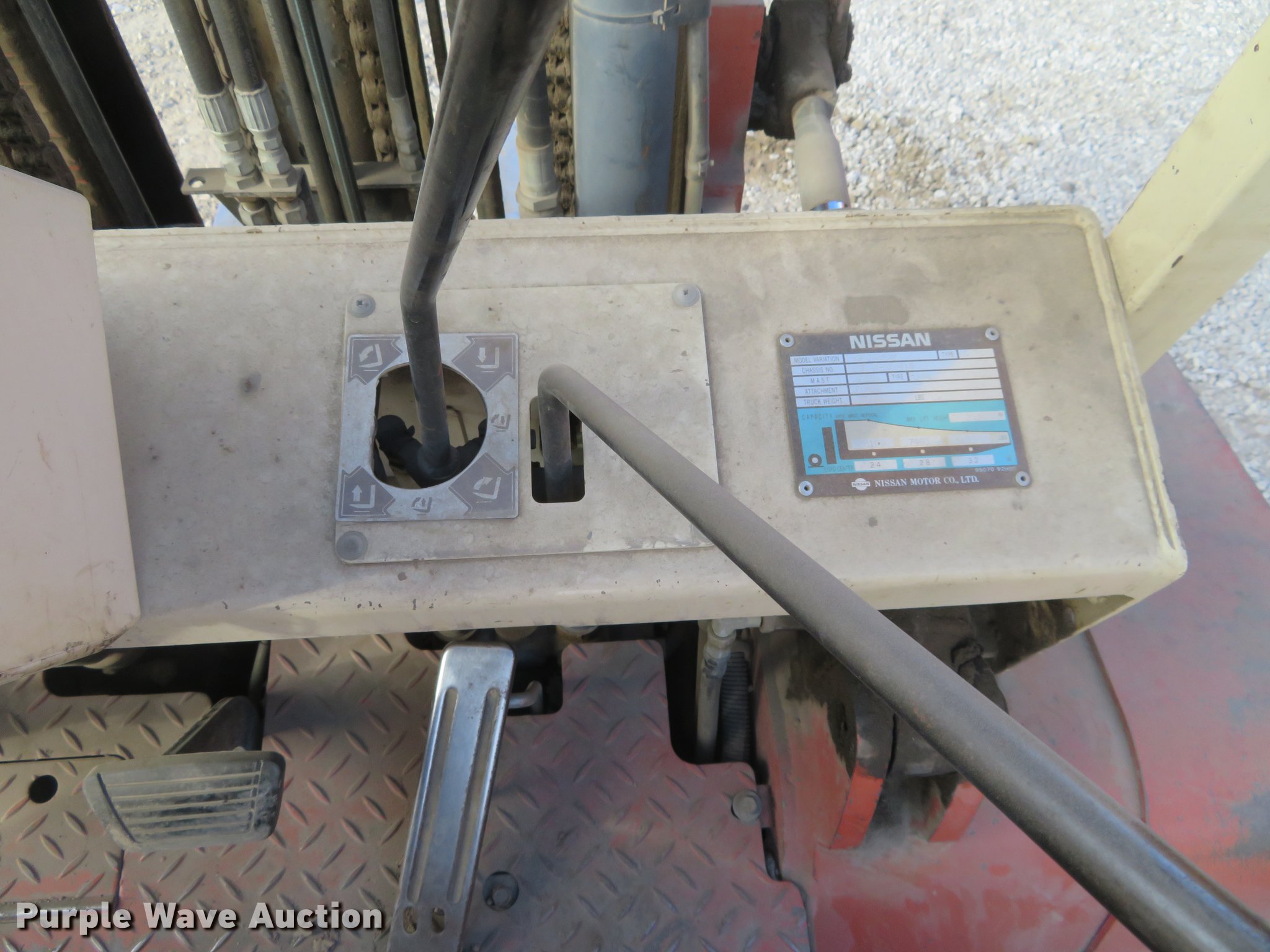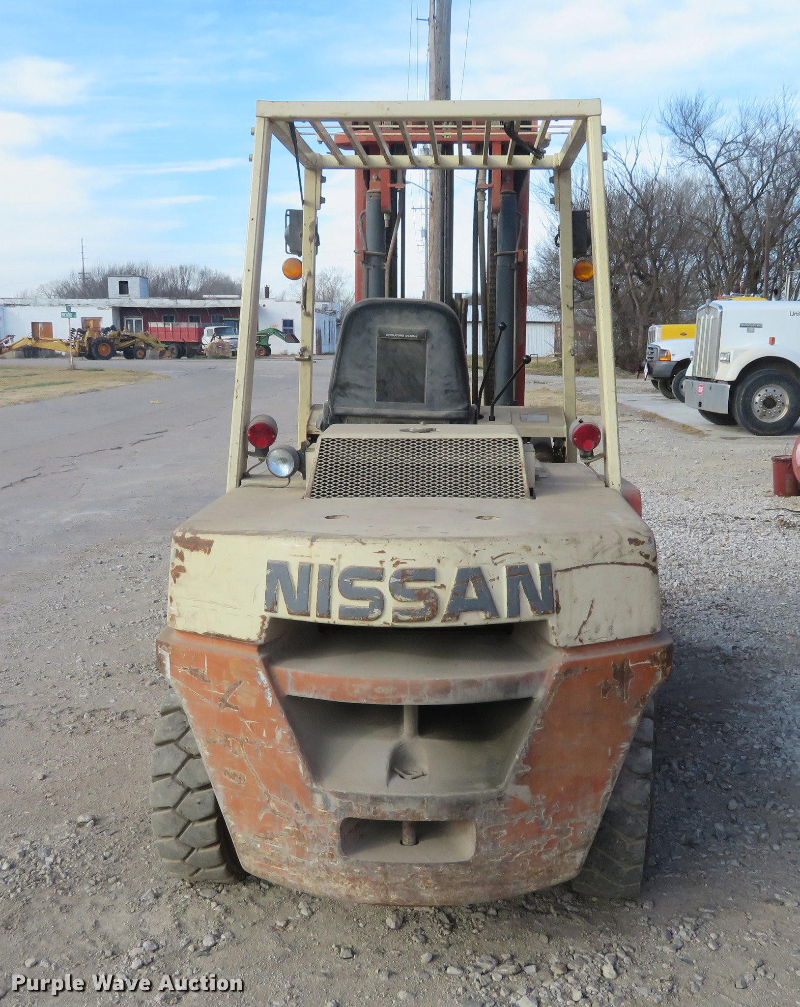 Purple Wave is selling a used Strt. Mast Rough Terr. Forklift in Kansas. This item is a Nissan 90 forklift with the following: 7,073 hours on meter, Model BGF03A40U, Six cylinder gas engine, 8,100 lbs maximum lift capacity, Side shift, Three stage mast, 7.50-15 front tires, 7.00-12 rear tires, Carburetor issues