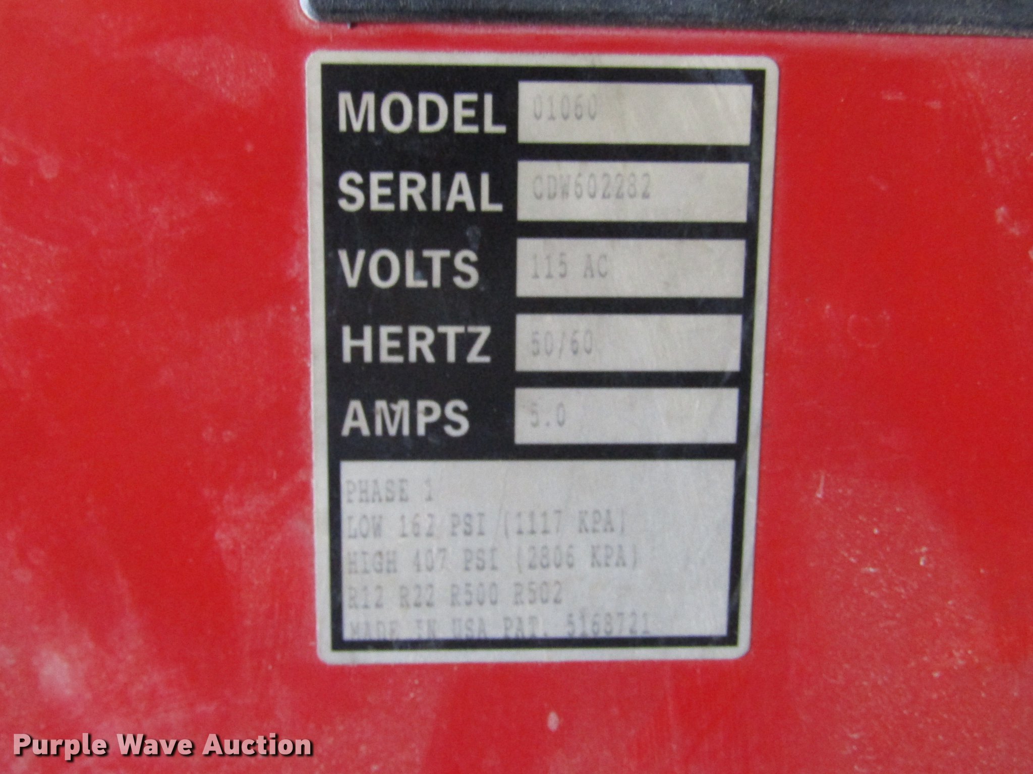 Purple Wave is selling a used Tools in Nebraska. This item is a Tools with the following: White Industries refrigerant recovery system, Model 01060, 8 hours on meter, 110V, 20"W x 17"D x 42"H O.D. transport, Operators manual, Serial CDW602282, Unknown operating condition, Bottles not included, Horizontal bandsaw, Gould motor, 1/2 HP, 115V, Single phase, No blade, 60"W x 24"D x 40"H O.D. transport