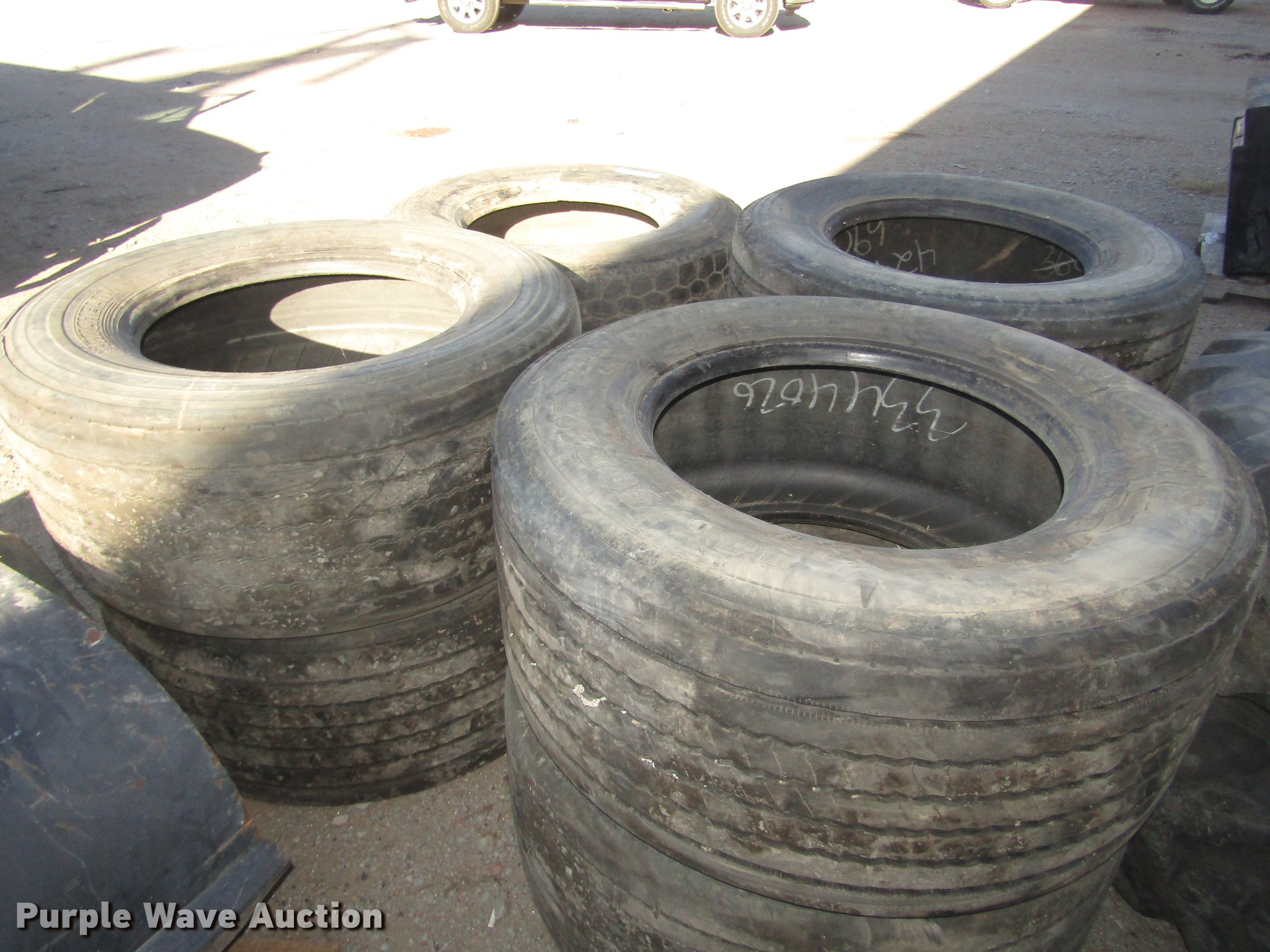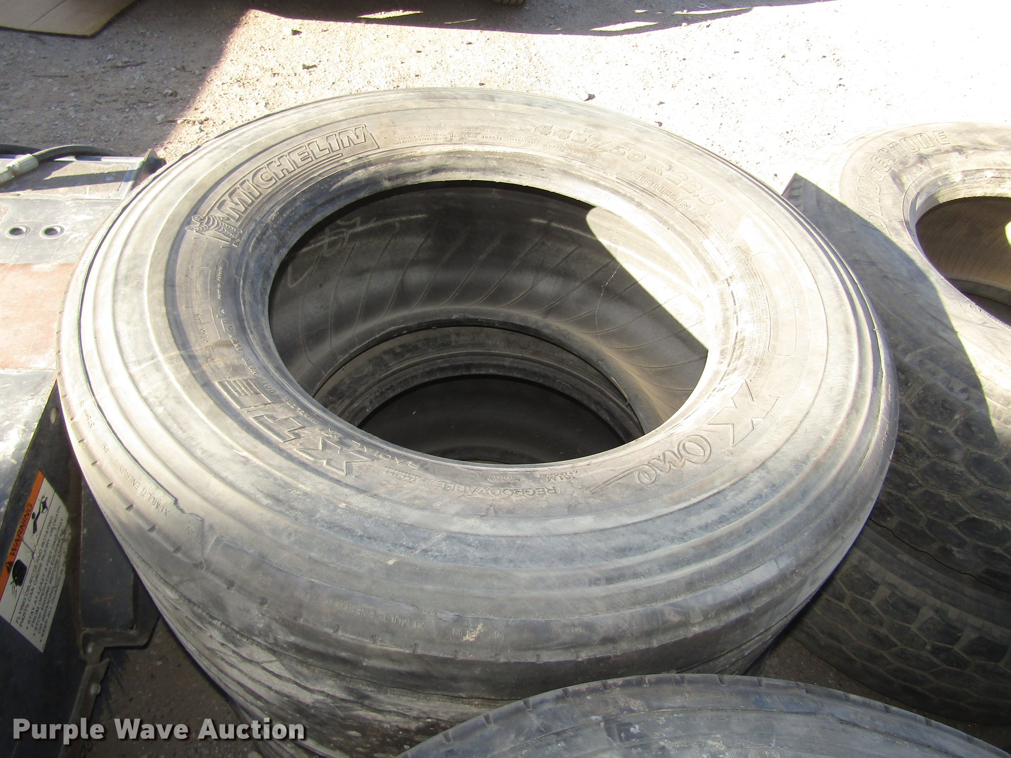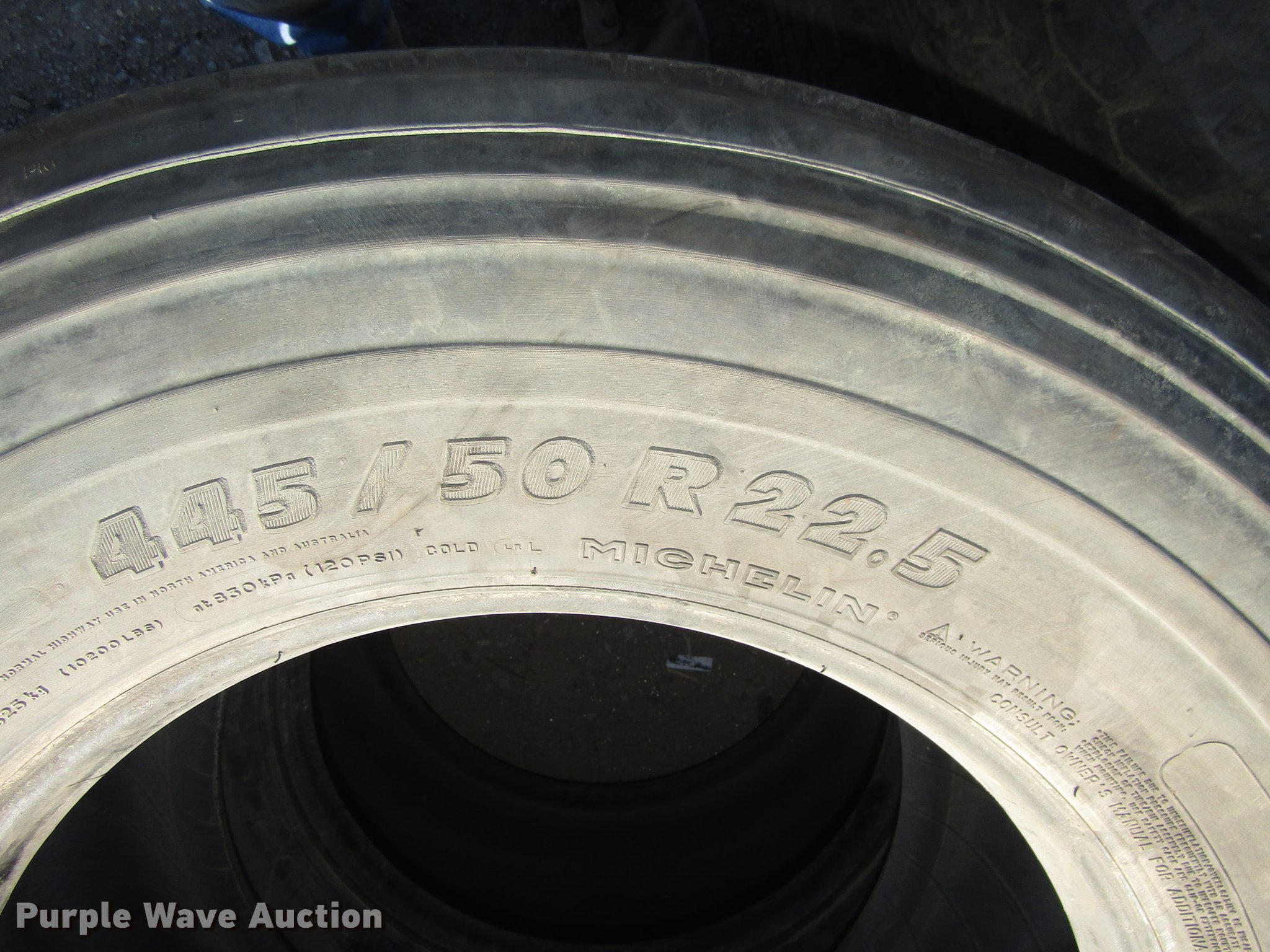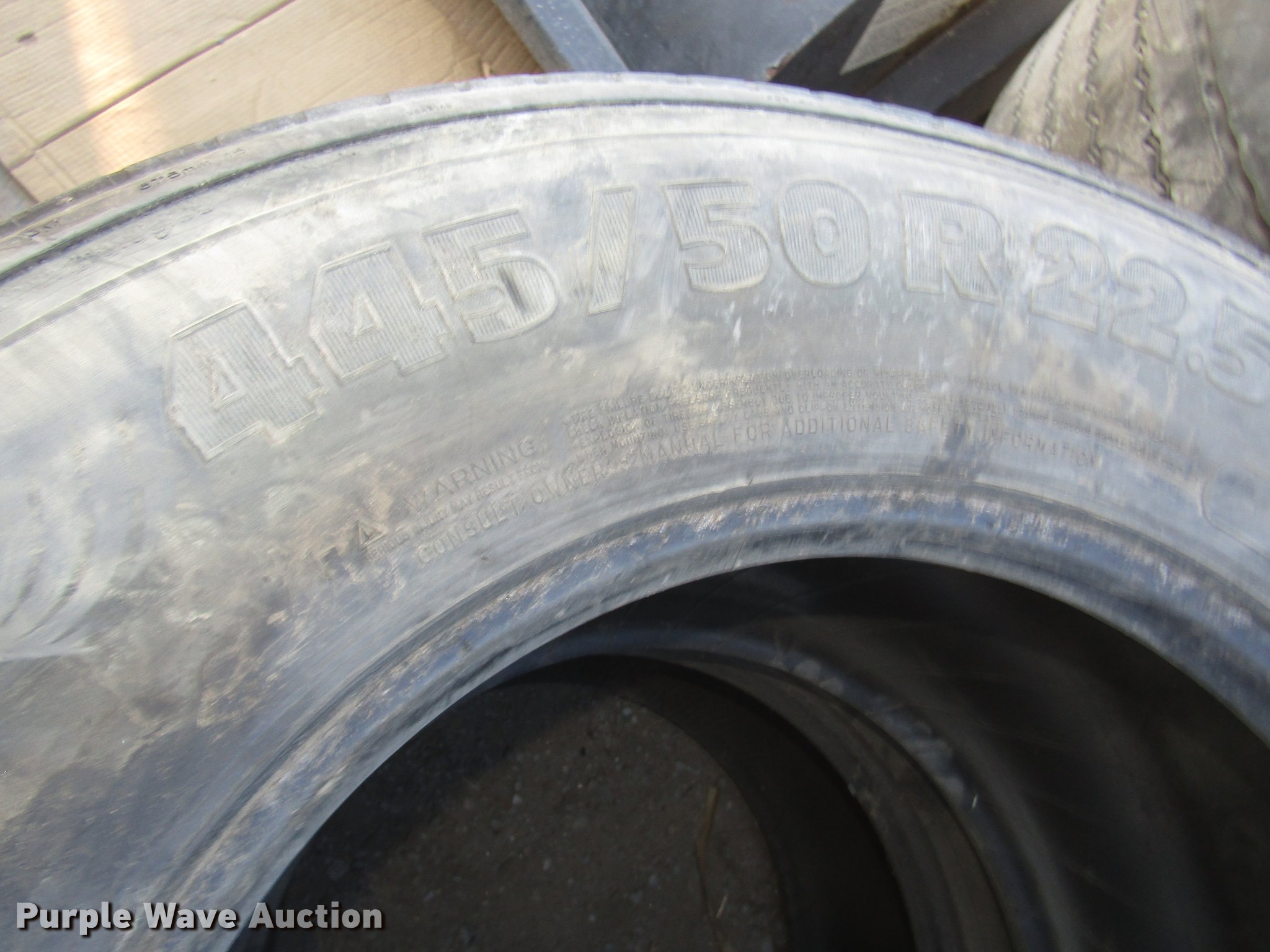 Purple Wave is selling a used Fleet Tires in Nebraska. This item is a (8) super single tires with the following: (5) Michelin 445/50R22.5, Goodyear 445/50R22.5, (2) Bridgestone 385/65R22.5