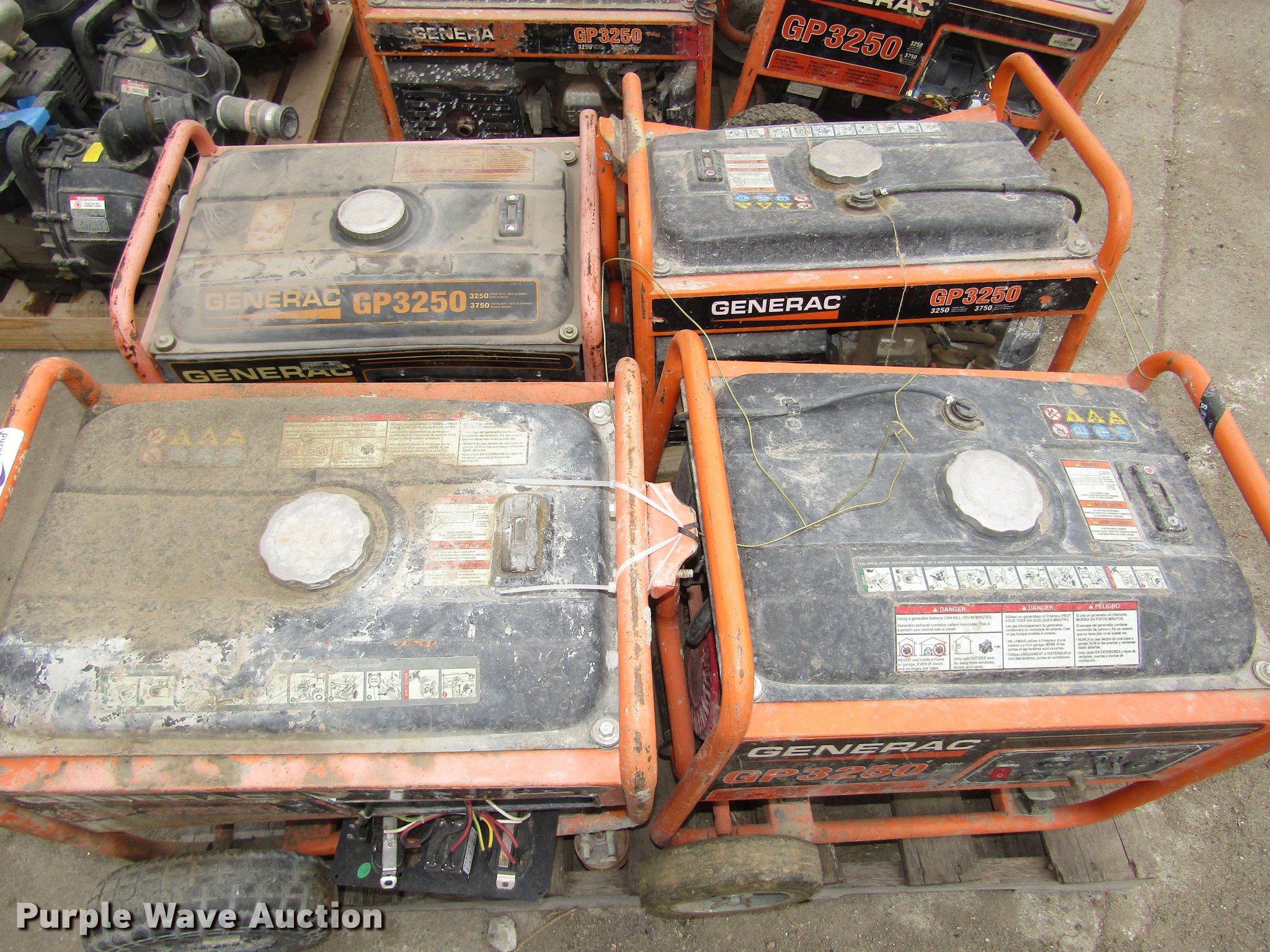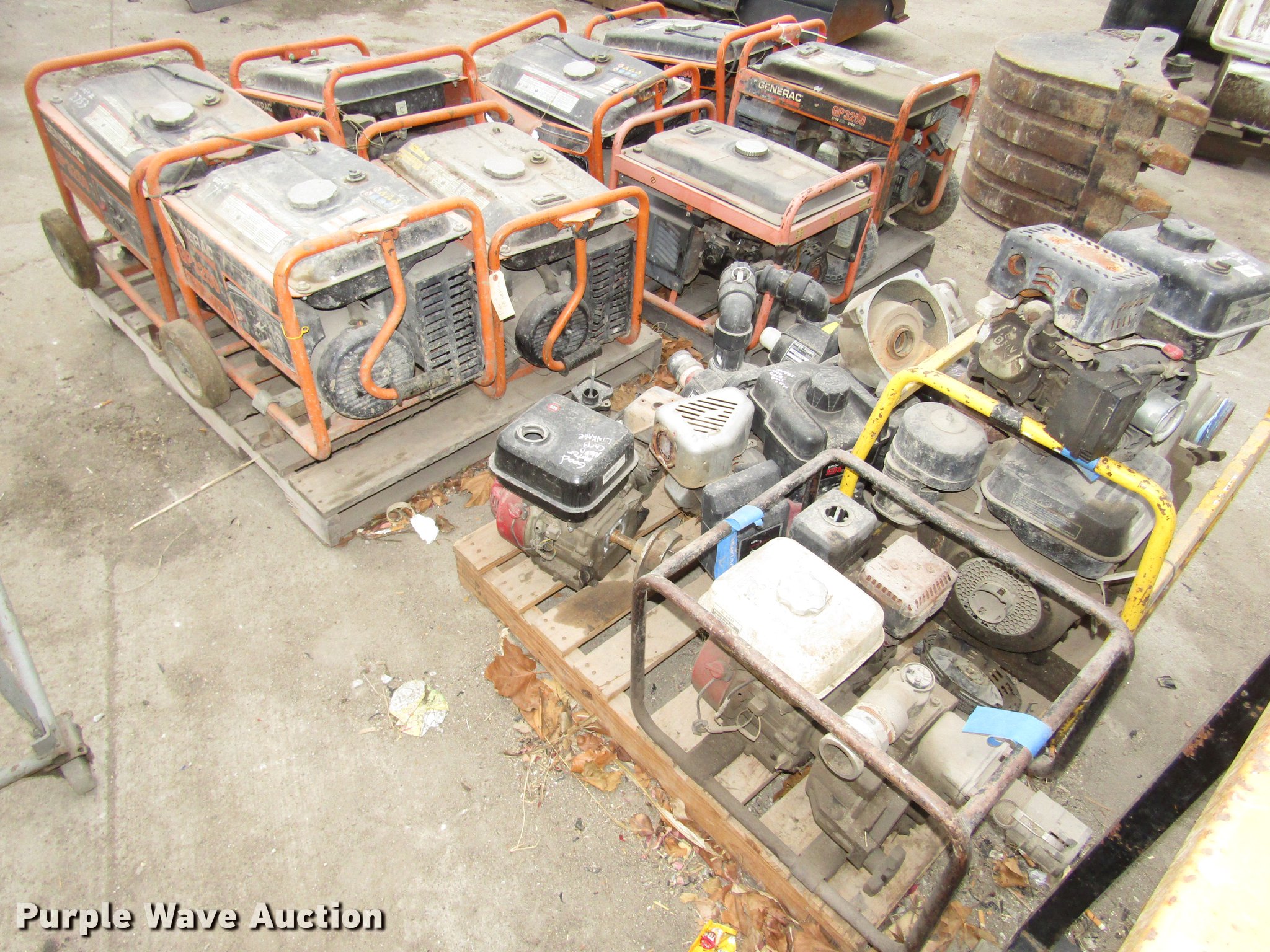 Purple Wave is selling a used Tools in Nebraska. This item is a Generators and pumps with the following: (8) Generac GP3250 generators, Gas engines, Recoil start, (5) water pumps, Gas engines, Non-operational units, parts only