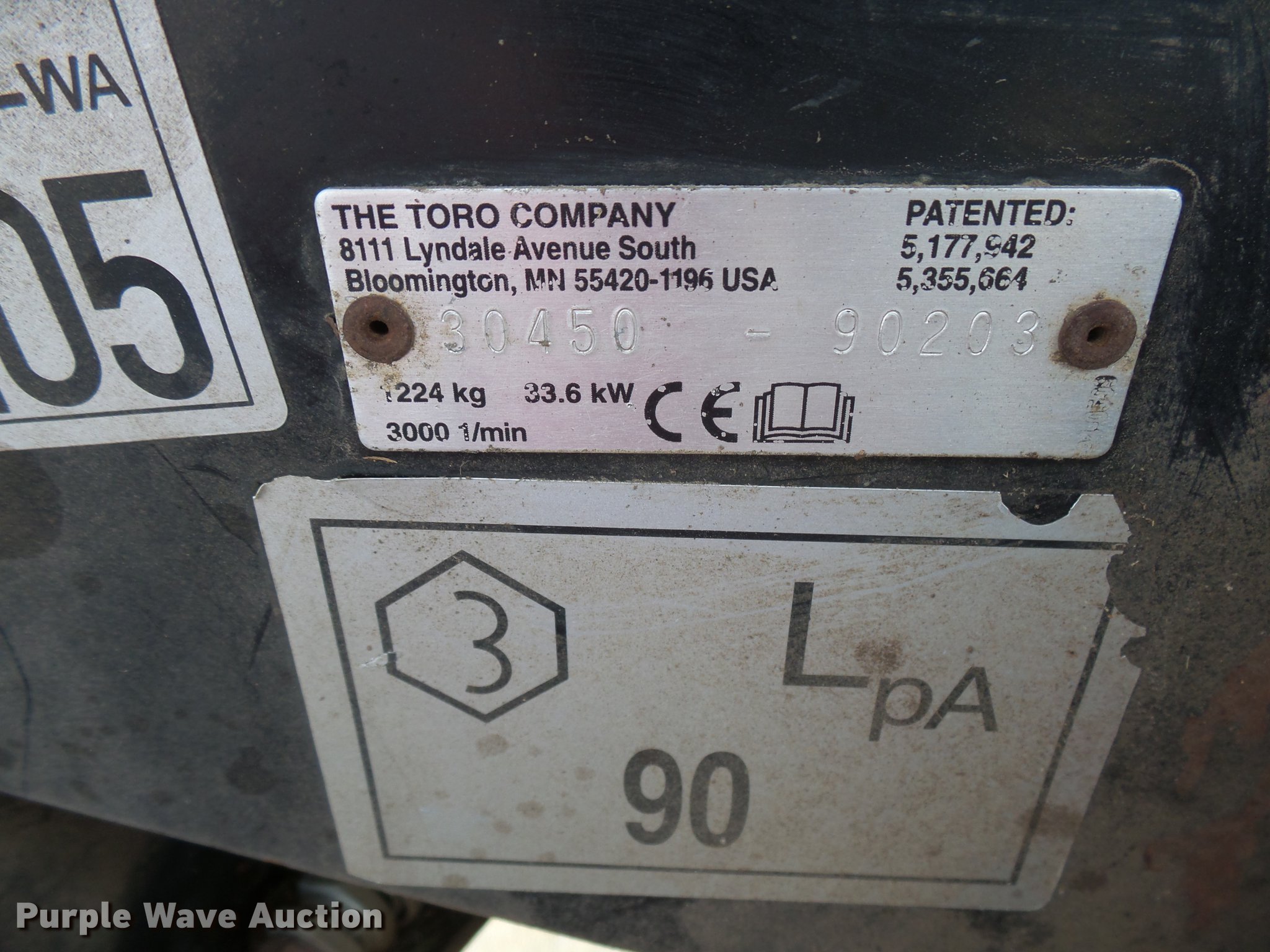 Purple Wave is selling a used Commercial Turf Mower in South Dakota. This item is a Toro Groundsmaster 455D lawn mower with the following: 7,831 hours on meter, 126"W cut, Kohler diesel engine, Quad float deck, 26x12-12 front tires, 20x10-10 rear tires, Serial 90203