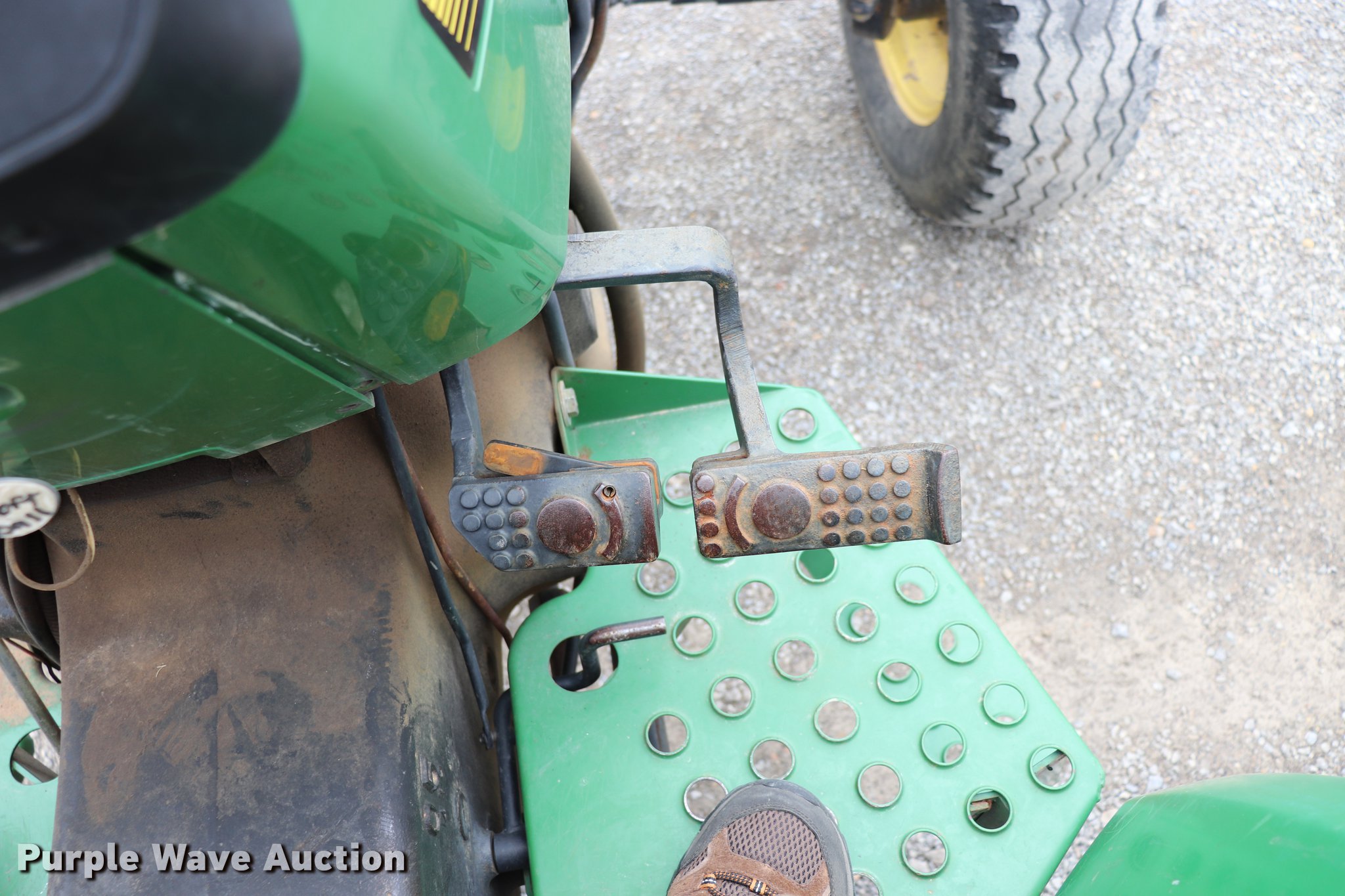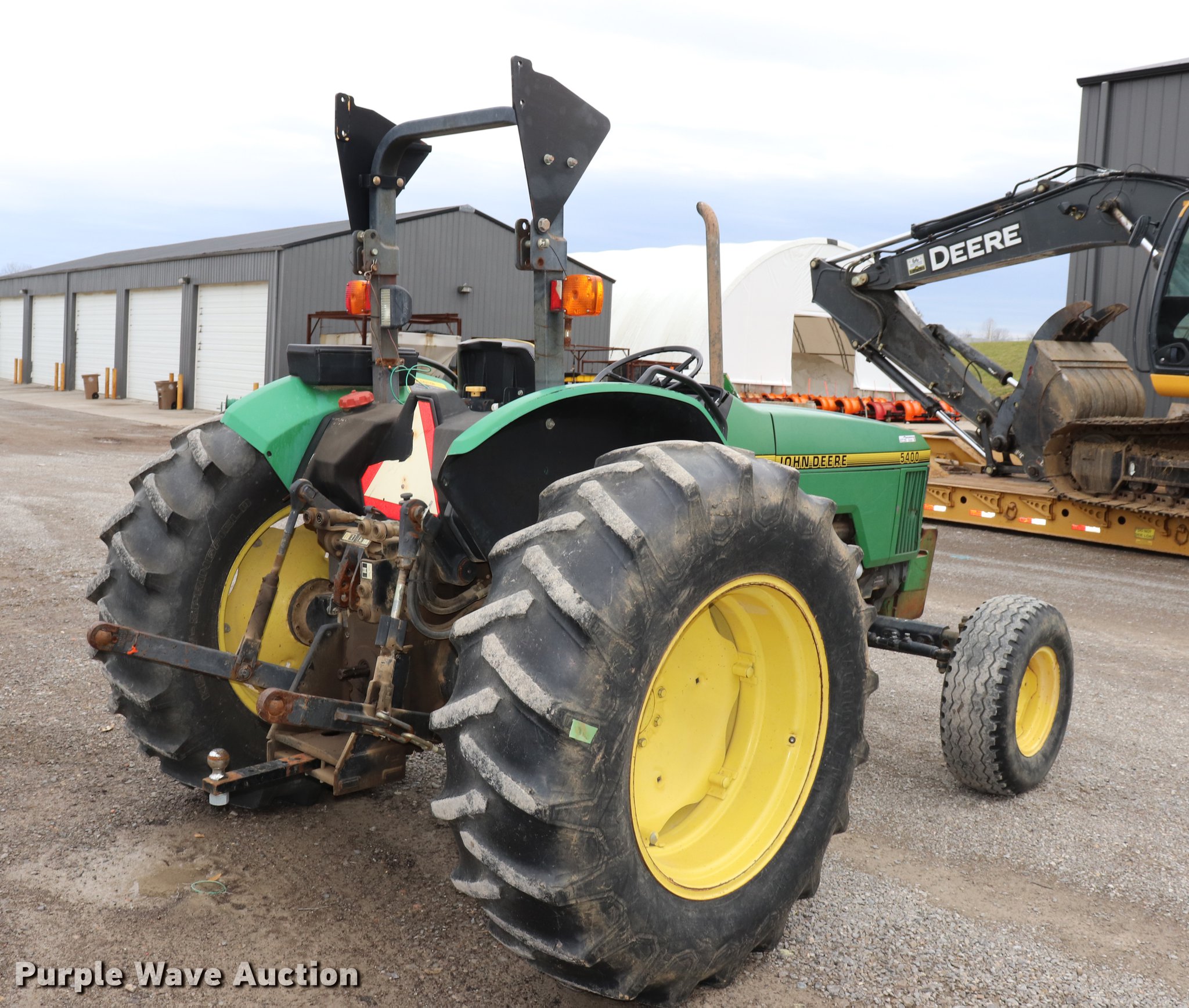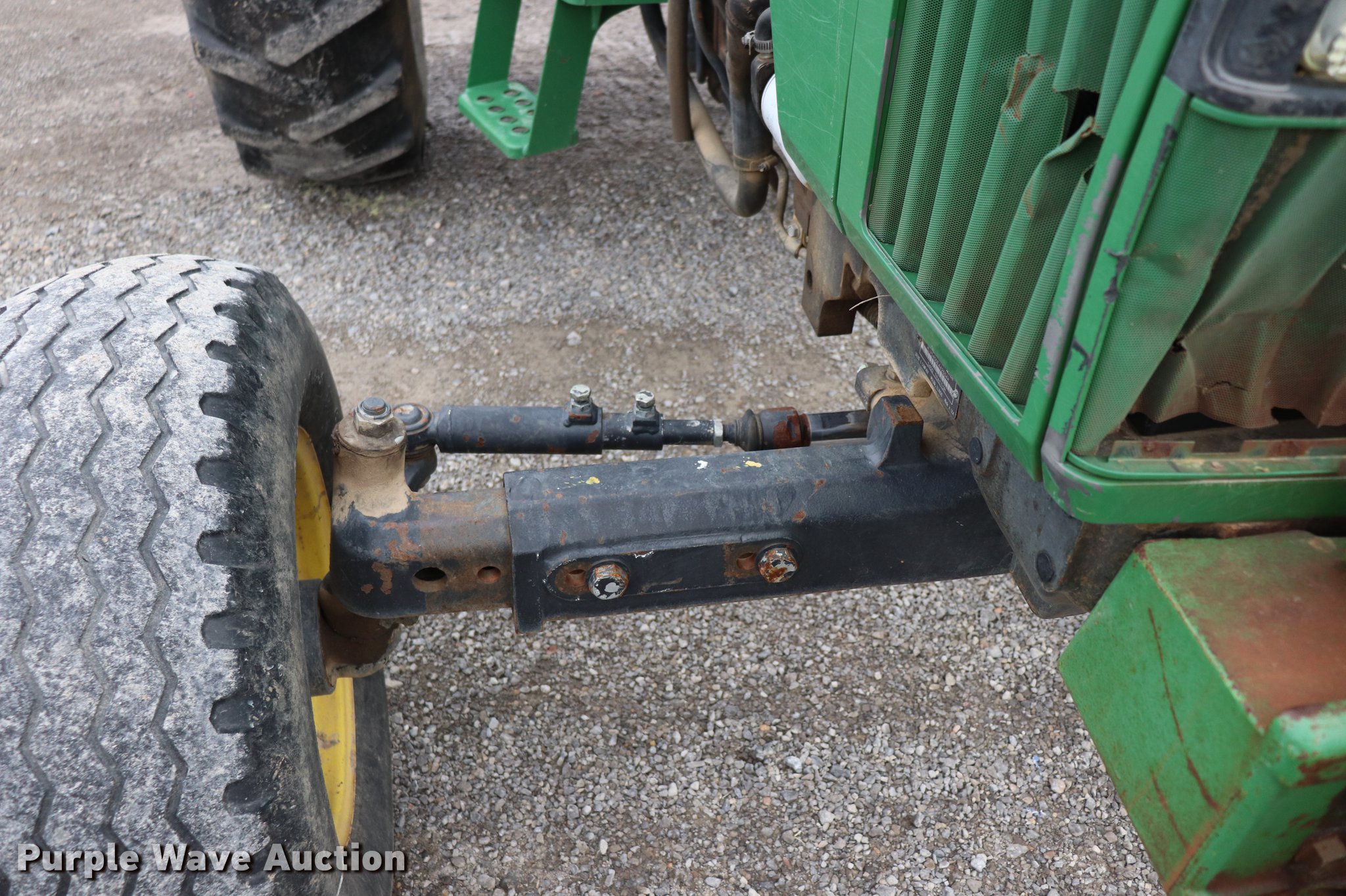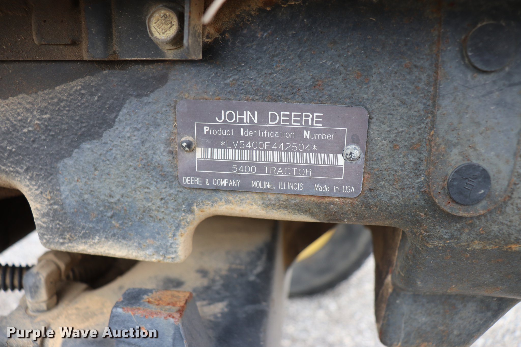 Purple Wave is selling a used Tractor in Missouri. This item is a John Deere 5400 tractor with the following: 4,243 hours on meter, John Deere three cylinder turbo diesel engine, Synchro transmission, 3F-1R gears, Differential lock, Suspension seat, Rear work lights, Three point, 540 PTO, (3) rear hydraulic remote sets, (4) suitcase weights, 11L-15 front tires, 16.9-30 rear tires, Serial LV5400E442504, Unit# 189