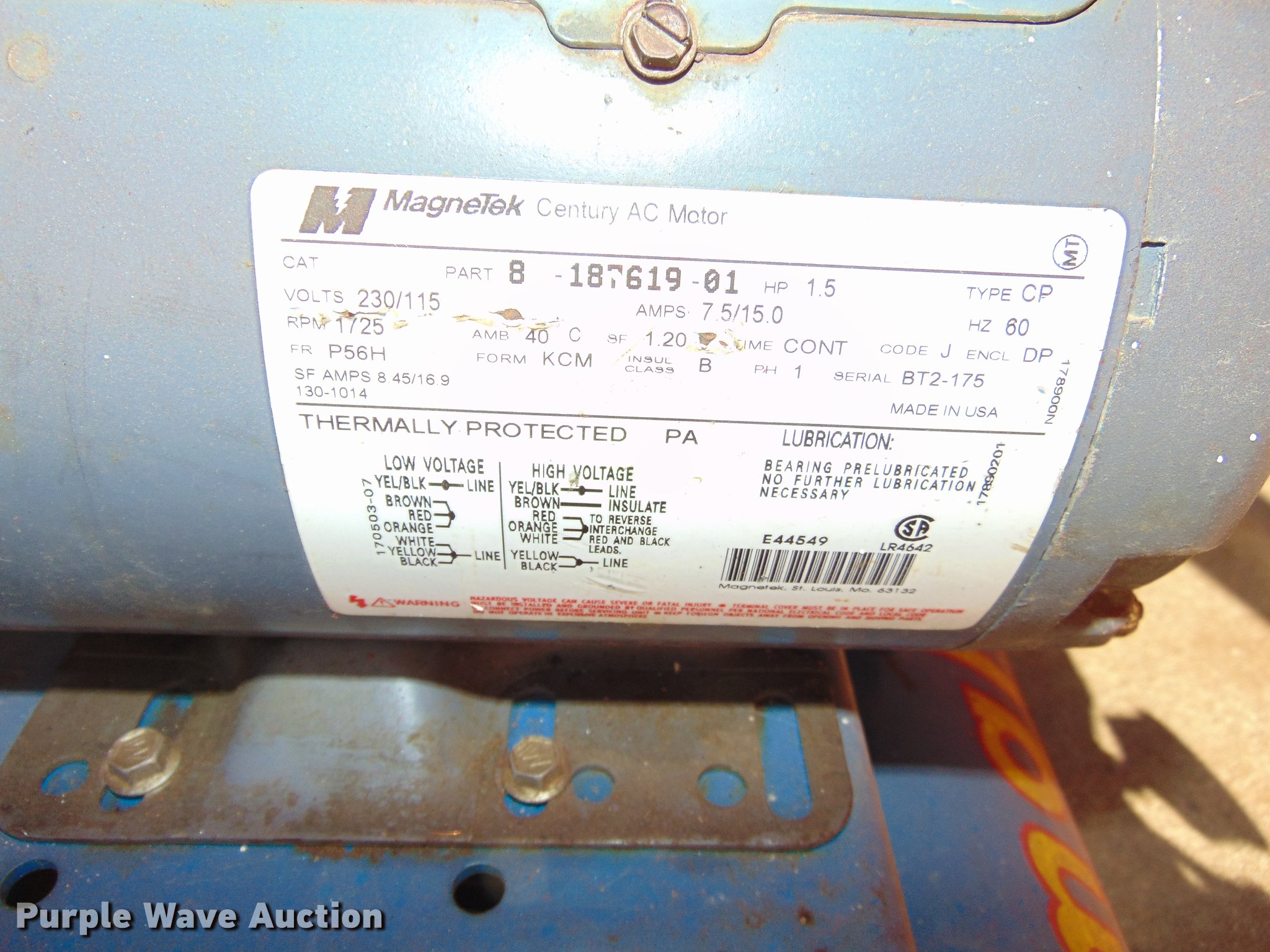 Purple Wave is selling a used Air Compressor in Iowa. This item is a Magnetek air compressor with the following: 1.5 HP, Single phase, 230V, Serial BT2-175