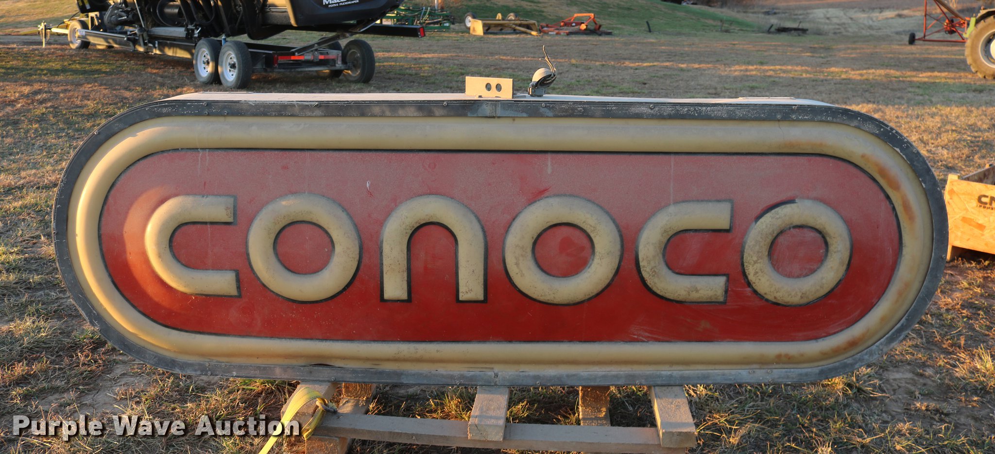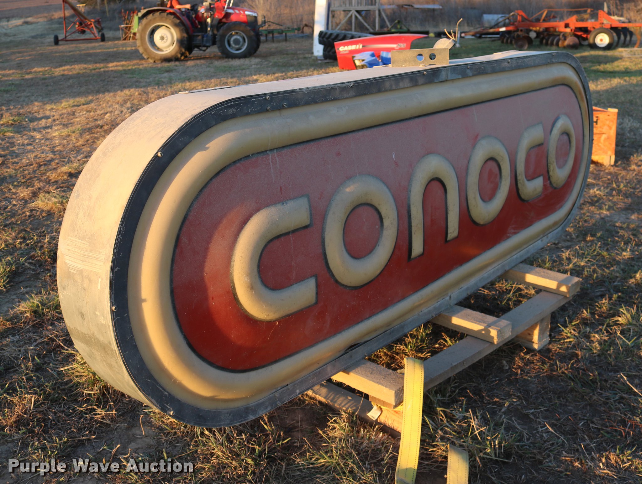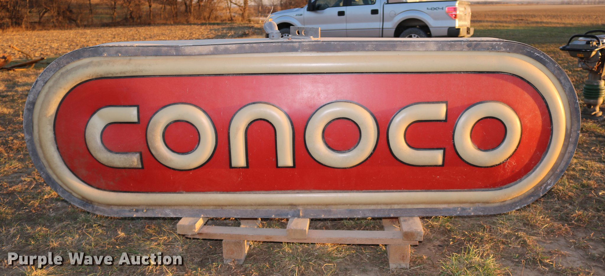 Purple Wave is selling a used Retail Displays in Kansas. This item is a Conoco sign with the following: 8'W x 31"H, Unknown operating condition