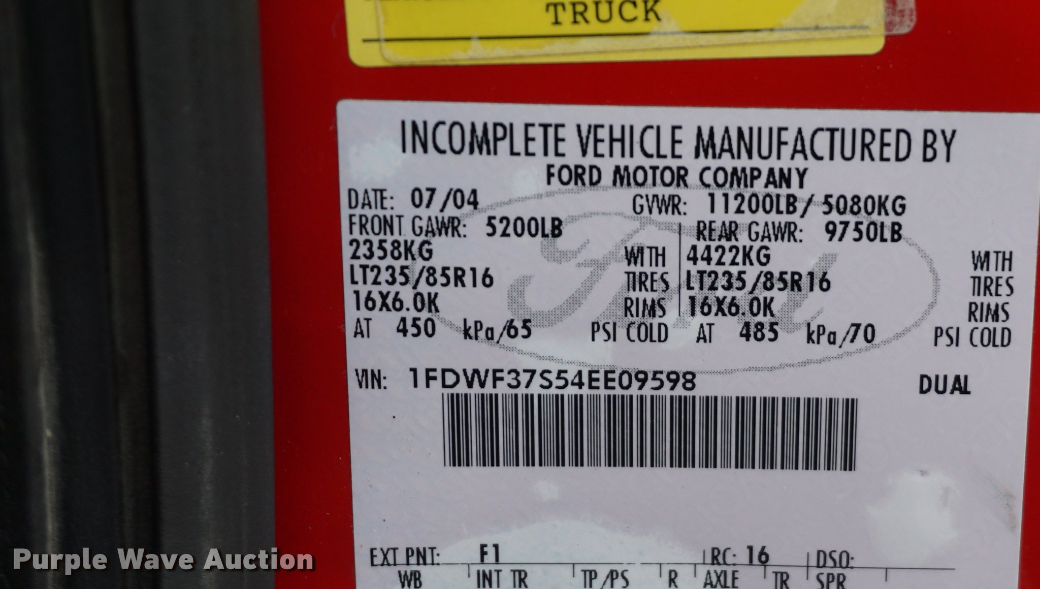 Purple Wave is selling a used 3/4 or 1 Ton Pickup or Van in Missouri. This item is a 2004 Ford F350 Super Duty XL dump bed pickup truck with the following: 19,456 miles on odometer, 6.8L V10 SOHC 20V gas engine, Automatic transmission, Four wheel drive, AC and heat, Tilt, Cruise, AM/FM, Manual windows and locks, Vinyl interior, Air Flow dump bed, 9'L x 95"W, 12" side height, 7.5" side board height, Electric over hydraulic operation, Front tow hooks, Receiver hitch, 235/85R16 tires