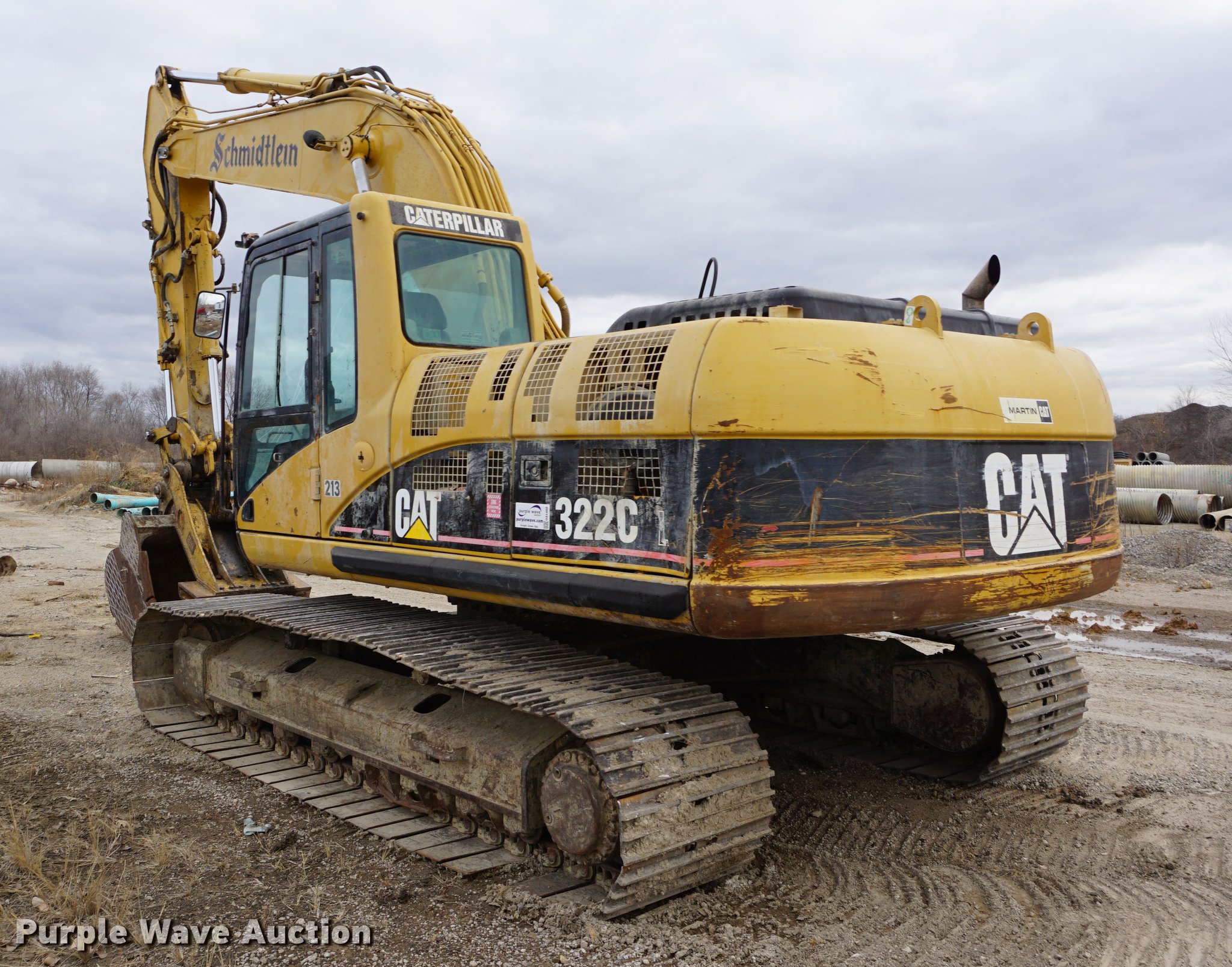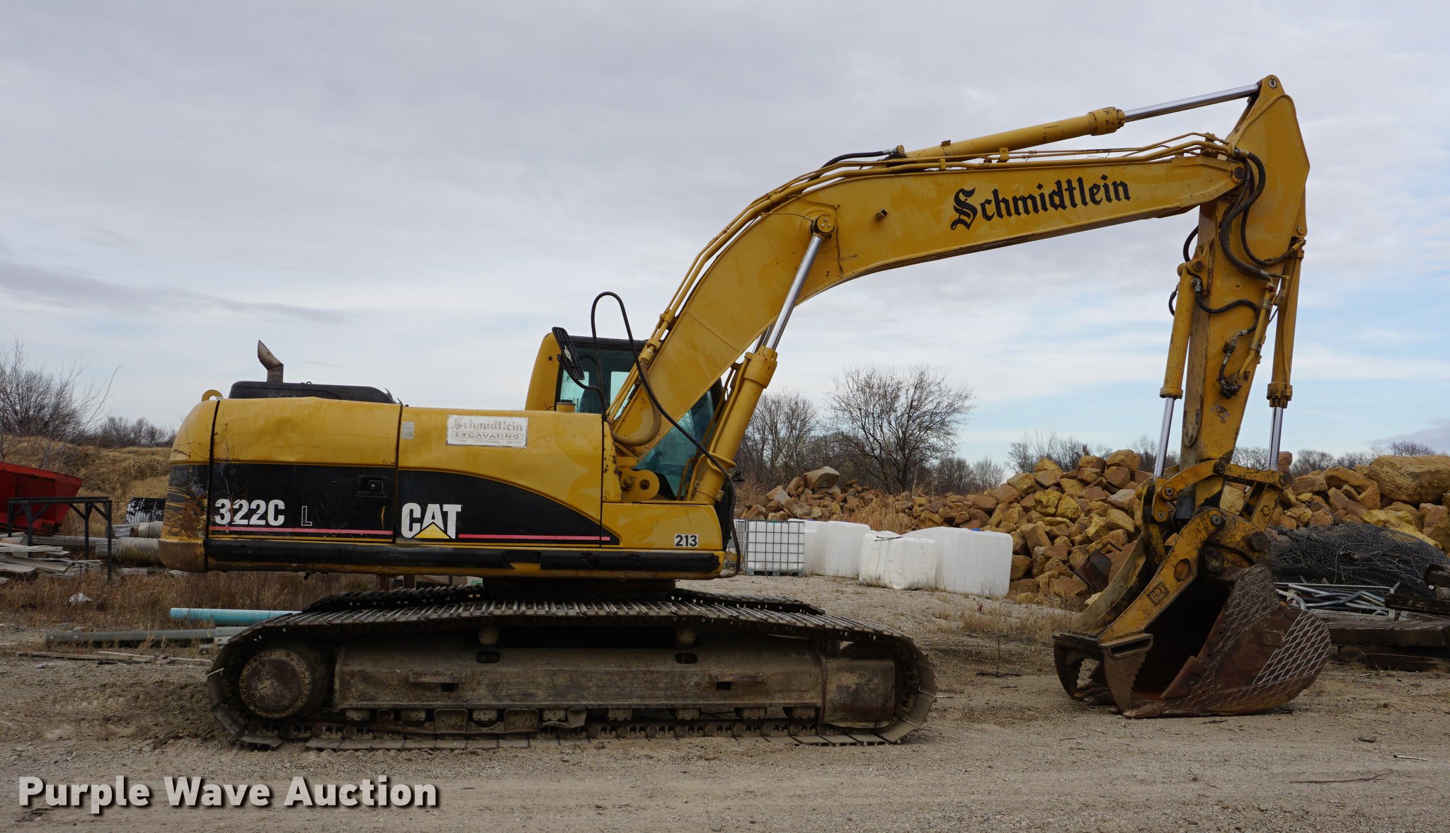 Purple Wave is selling a used Hydraulic Excavator in Kansas. This item is a 2005 Caterpillar 322C L excavator with the following: 13,027 hours on meter, Caterpillar 3126 7.2L six cylinder turbo diesel engine, 165 HP, Serial 5GG06935, Hydrostatic transmission, Straight travel, EROPS, AC and heat, AM/FM, Suspension seat, Wipers, Front work lights, Standard boom, 9'9" stick length, Caterpillar 54"W bucket, (6) weld-on teeth, Caterpillar hydraulic thumb, Caterpillar hydraulic quick coupler, Two way auxiliary hydraulics, 31.5"W steel triple grouser track pads, Windshield cracked, Serial CAT0322CVHEK00793, Unit# 213
