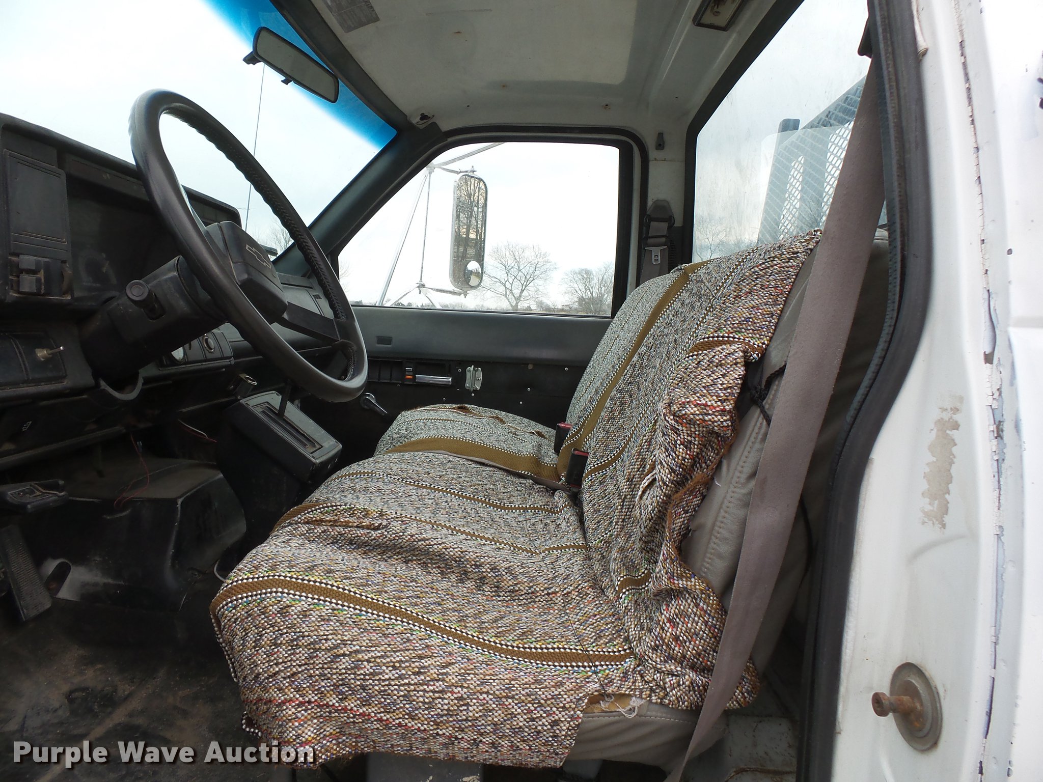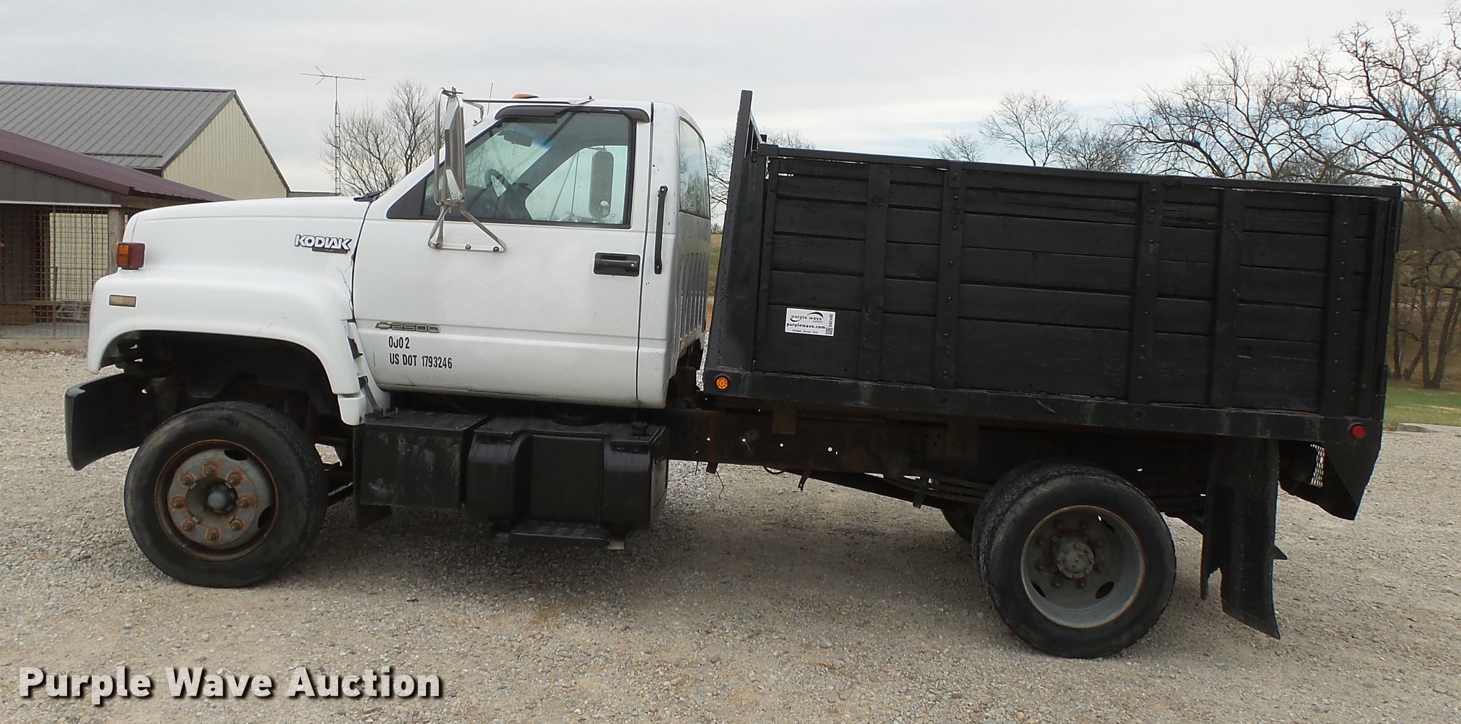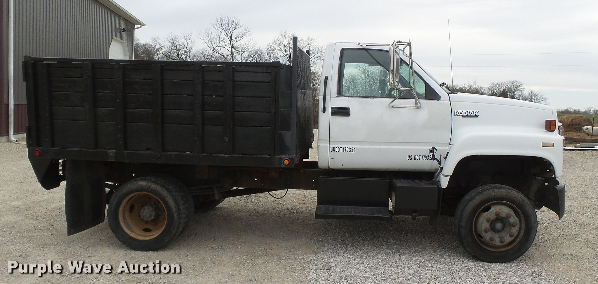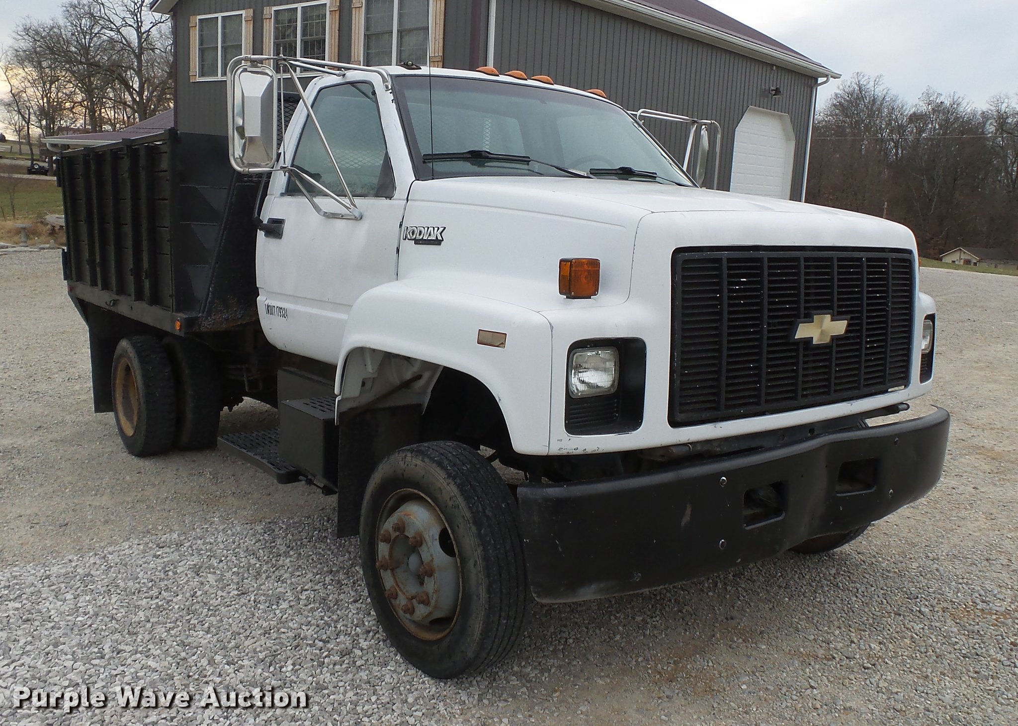 Purple Wave is selling a used Construction Dump Truck in Missouri. This item is a 1990 Chevrolet Kodiak dump truck with the following: 131,913 miles on odometer, 6.0L V8 gas engine, Automatic transmission, Heat, AM/FM, Trailer brake controller, 9'L x 8'W steel dump bed, 36" side height, Single ram hoist, Manual operated end gate, Receiver hitch, 144" wheelbase, Spring suspension, Hydraulic brakes, 225/70R19.5 tires, No exhaust, Exhaust manifolds bad, Rust holes in floor