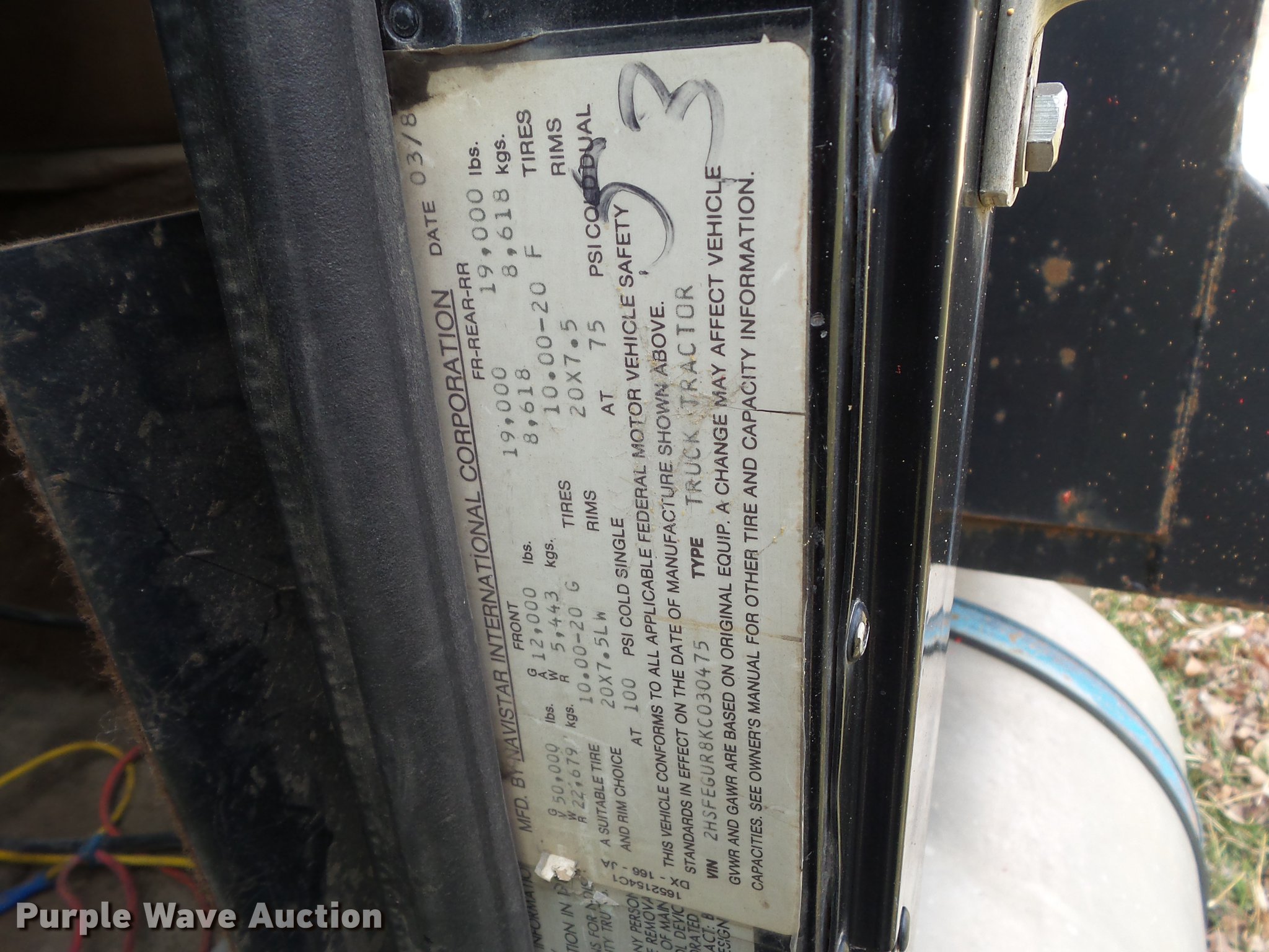 1989 International F-9370 dump truck. 31,939 miles on odometer, Cummins N14 14.0L L6 turbo diesel engine, Eaton Fuller Road Ranger nine speed manual transmission, Tandem axle, Heat, AM/FM/cassette, Heated mirrors, Air suspension seat, Block heater, PTO, Exterior visor, 17'L x 96"W steel dump bed 48" side height, Single ram hoist, Air operated end gate, Dual fuel tanks, 224" wheelbase, Air suspension, Air brakes, 315/80R22.5 front tires, 285/75R24.5 rear tires, GVWR 50,000 lbs. Iowa title. Title has a lien that will be released following the close of the auction. Title distribution may be delayed up to 30 days from verification of funds. 2HSFEGUR8KC030475. Van Sickle Construction. 1139 242nd St. Boone, IA 50036