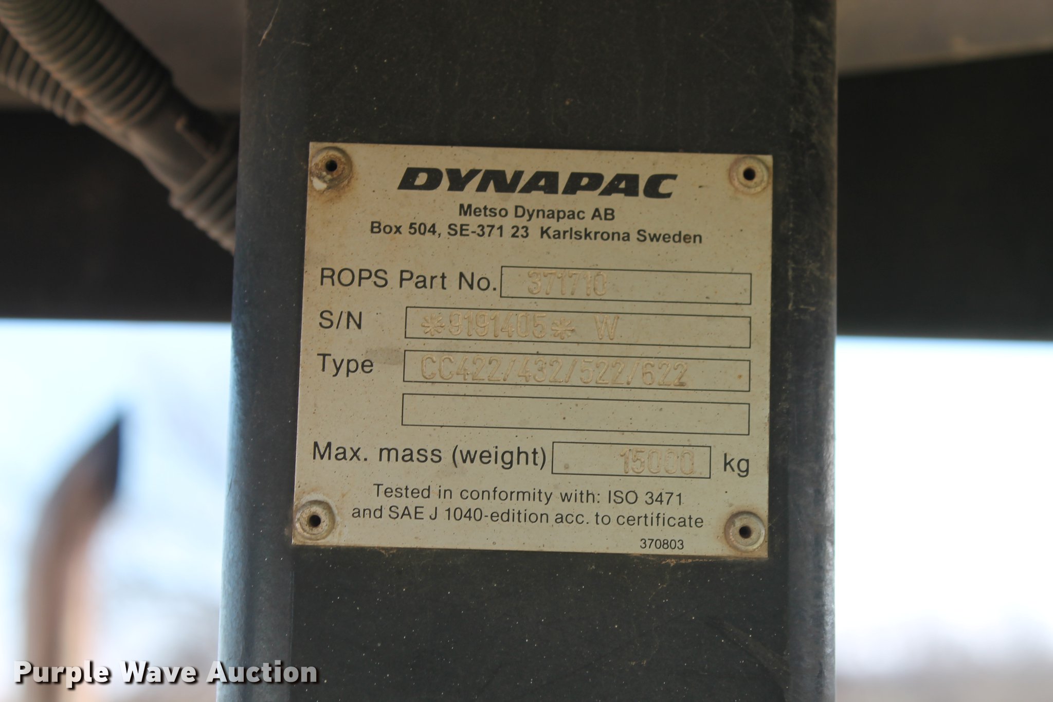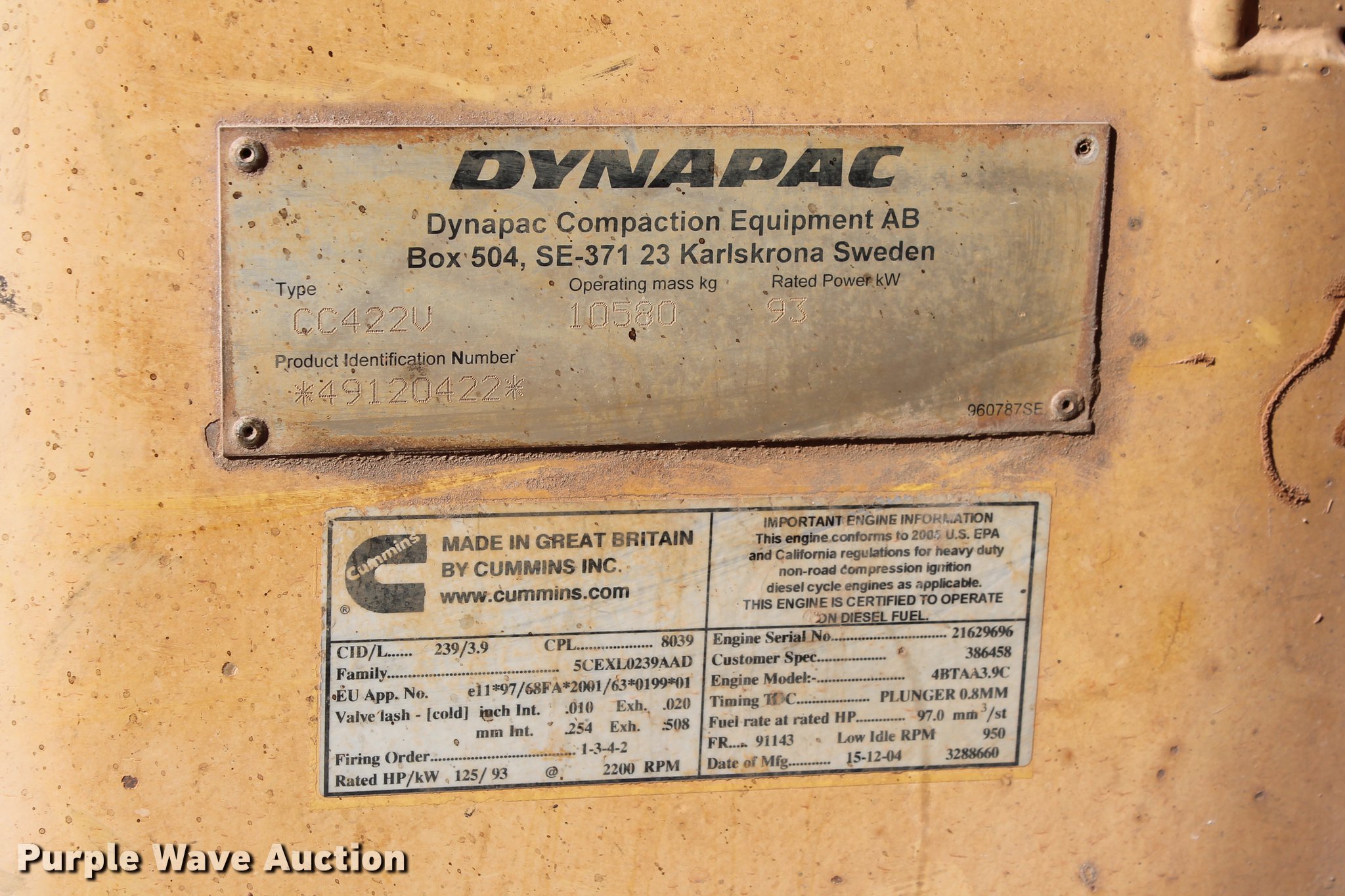 Purple Wave is selling a used Double Drum Roller Compactor in Oklahoma. This item is a 2005 Dynapac CC422HF double drum roller with the following: 6,307 hours on meter, Cummins 4BTAA3.9C 3.4L four cylinder diesel engine, 97 HP, Serial 21629676, Hydrostatic transmission, OROPS canopy, Tilt steering wheel, Work lights, Two speed double vibratory system, Independent drum controls, 66"W x 50.5" diameter smooth drums, Front and rear drum scrapers, Front and rear water spray applicators, Serial 49120422