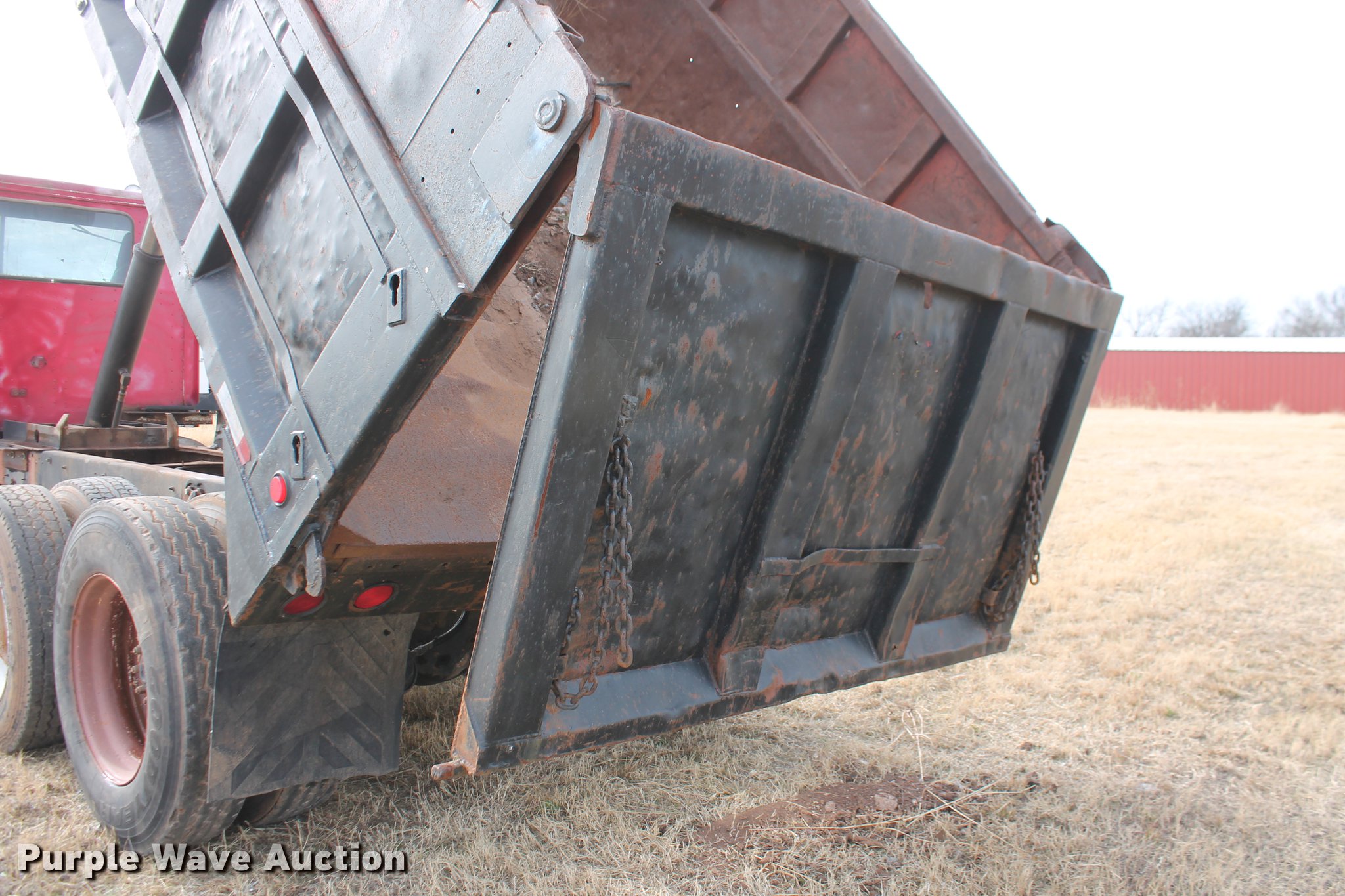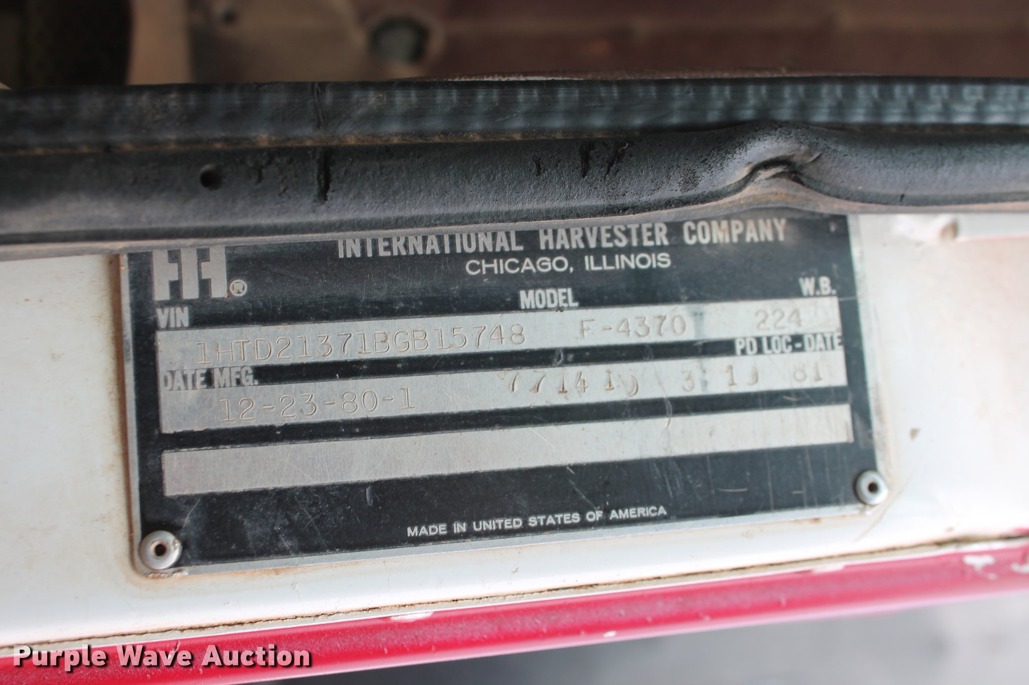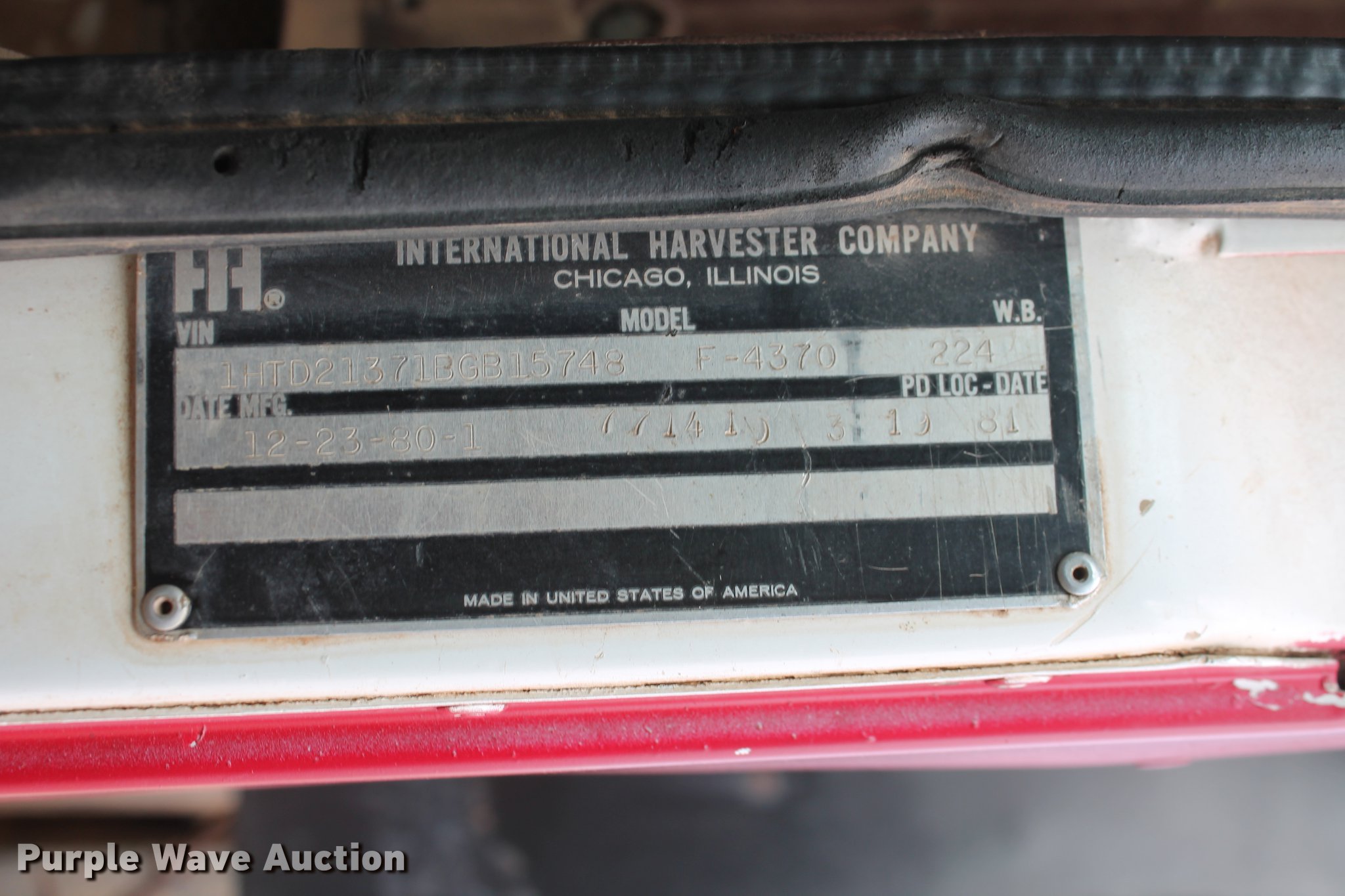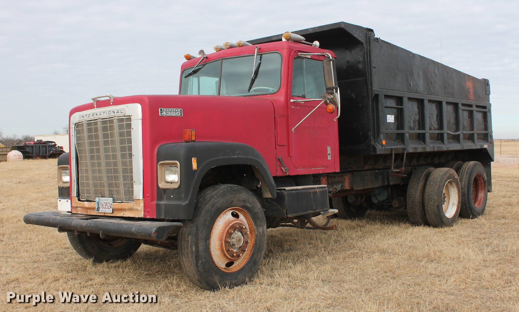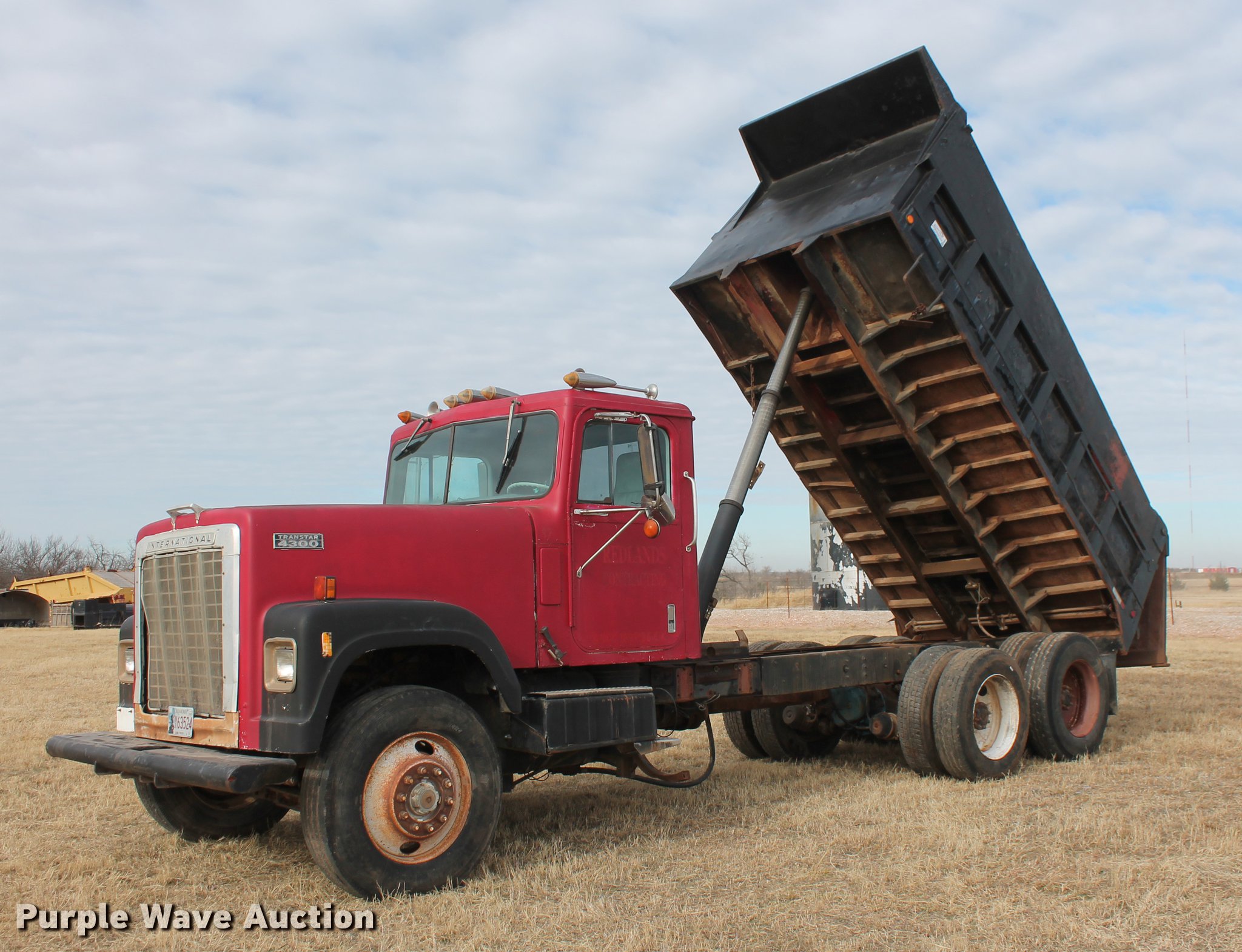 Purple Wave is selling a used Construction Dump Truck in Oklahoma. This item is a 1981 International F4370 Transter 4300 dump truck with the following: 387,935 miles on odometer, Caterpillar 3406 six cylinder turbo diesel engine, 380 HP, Serial 92U38991, Manual transmission, Tandem axle, AC and heat, AM/FM, Air suspension seat, PTO, Single exhaust stack, 15'L x 96"W steel dump bed, 52" to 60" tapered side height, Air operated end gate, Single ram hoist, Single fuel tank, Pin hitch, Spring suspension, Air brakes, 224" wheelbase, 11R24.5 tires