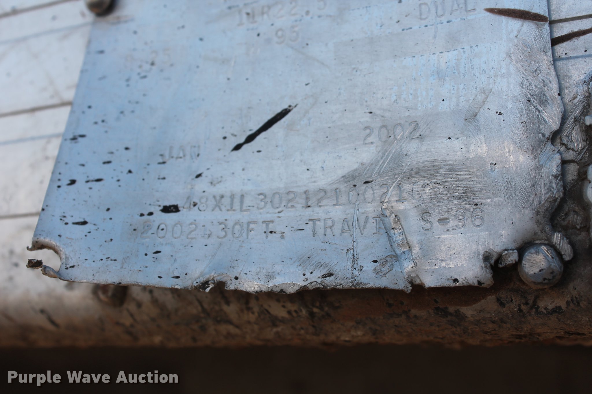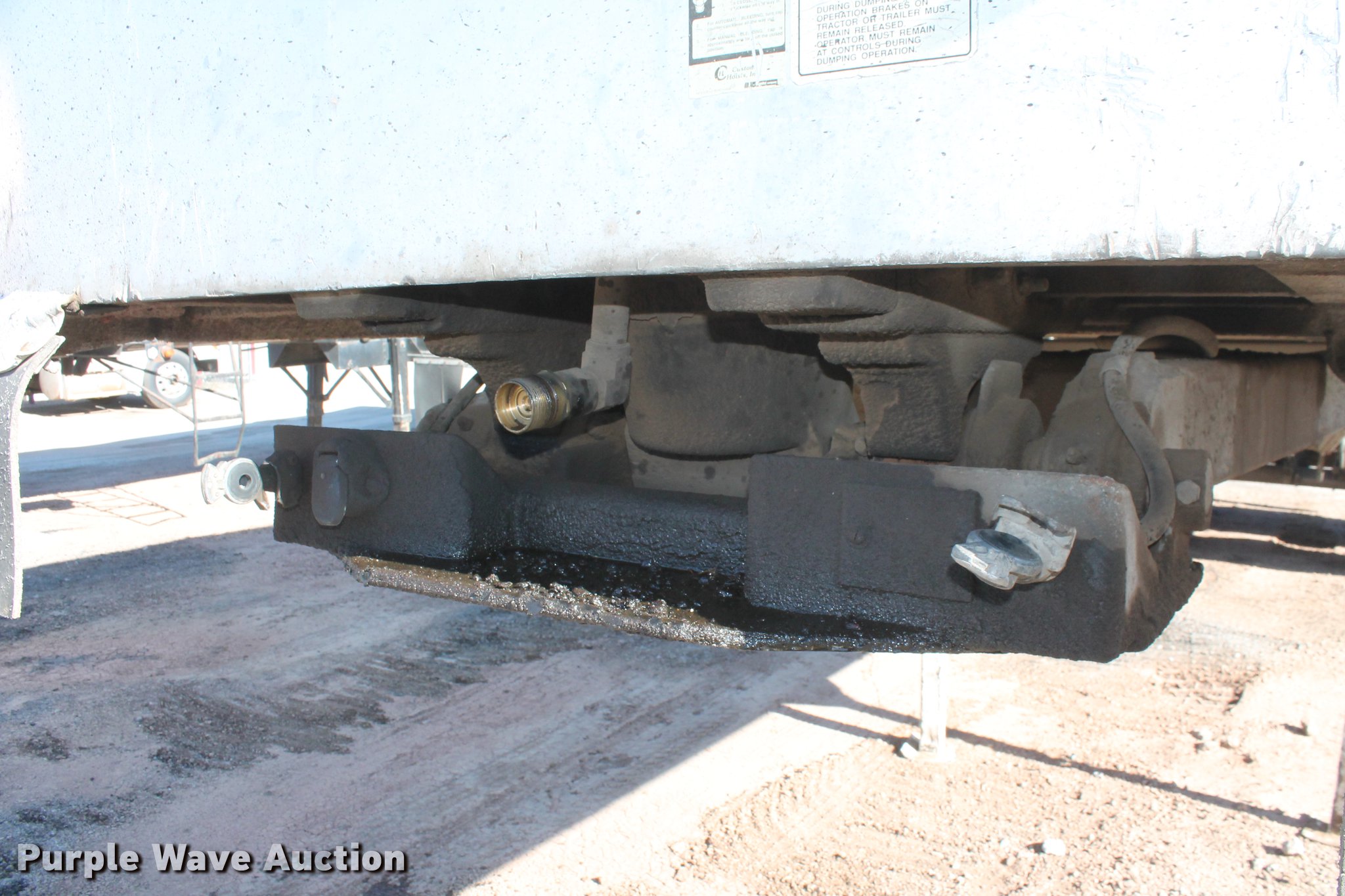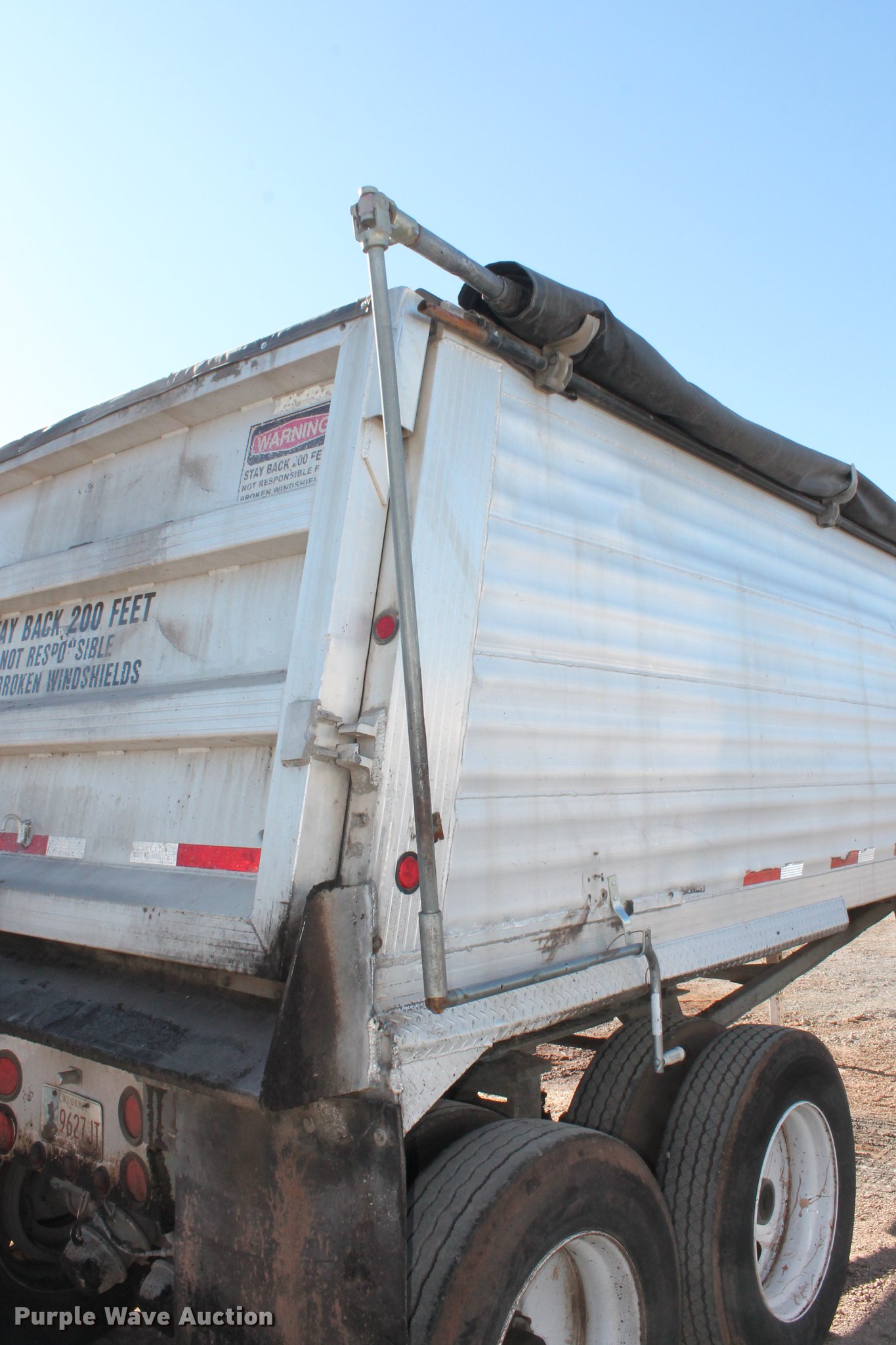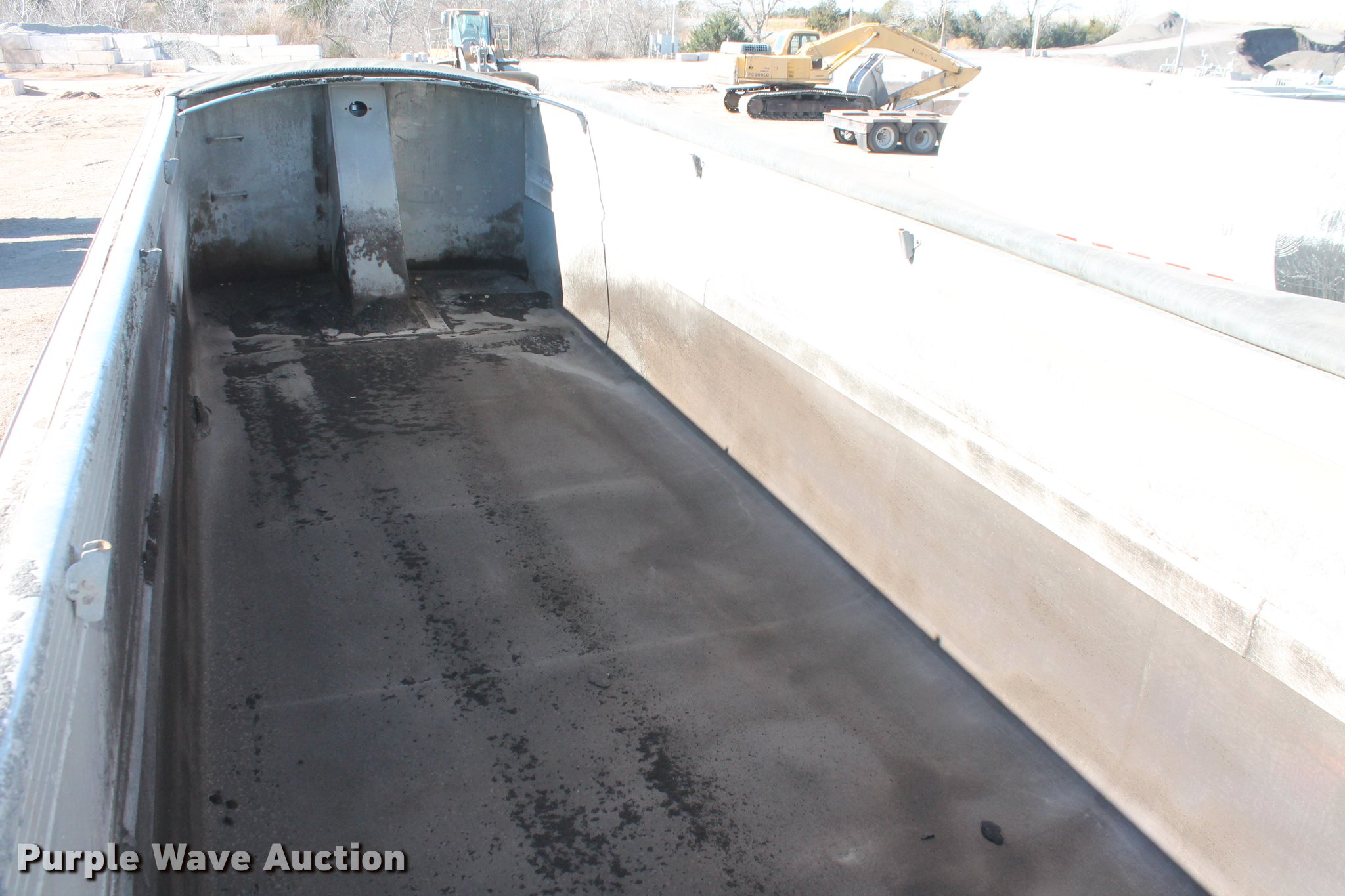 Purple Wave is selling a used End Dump Rock Trailer in Oklahoma. This item is a 2002 Travis S-96 end dump trailer with the following: 30'L x 96"W, 54" side height, Aluminum construction, Asphalt liner, Single hydraulic cylinder, End gate, Manual tarp, Access ladder, Dual leg landing gear, Fifth wheel plate, Tandem axle, Spring suspension, Air brakes, Steel wheels, 11R24.5 tires, GVWR 68,000 lbs, GAWR 20,000 lbs