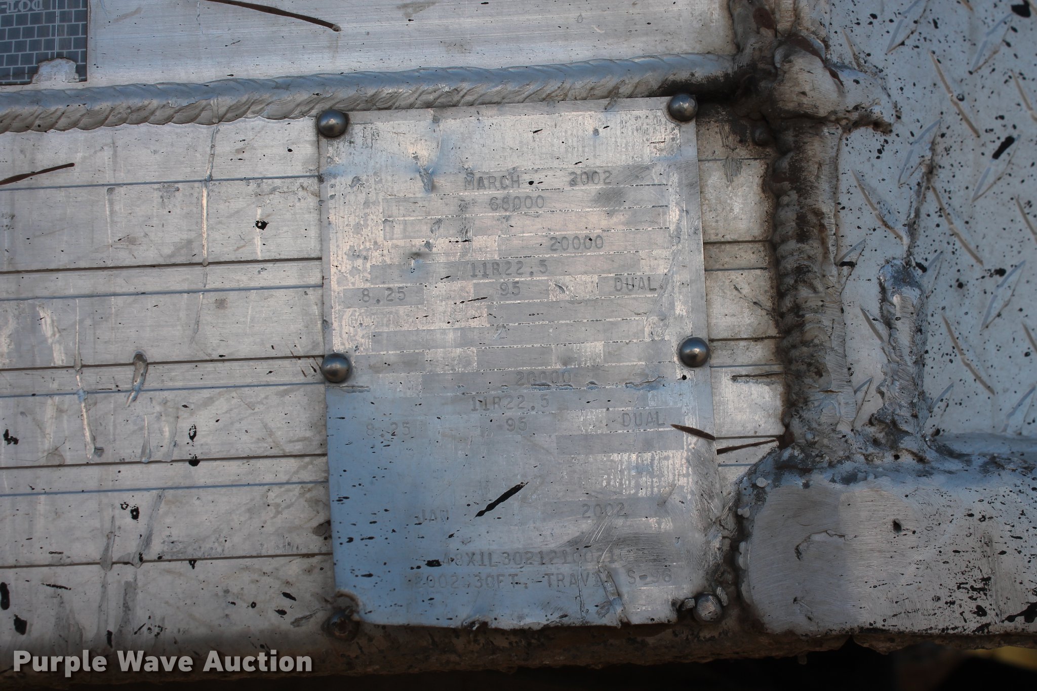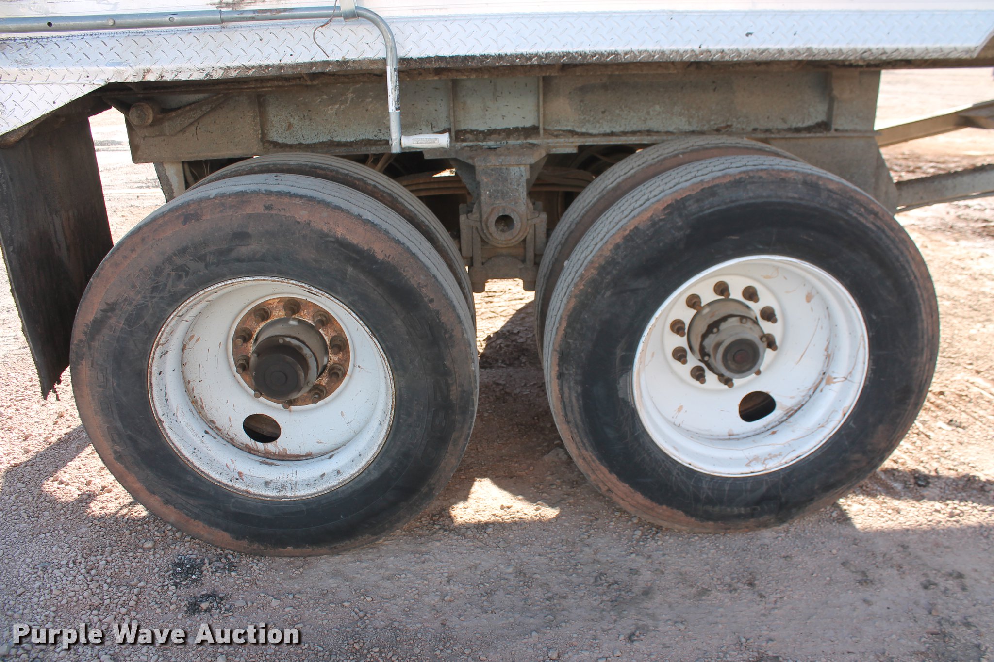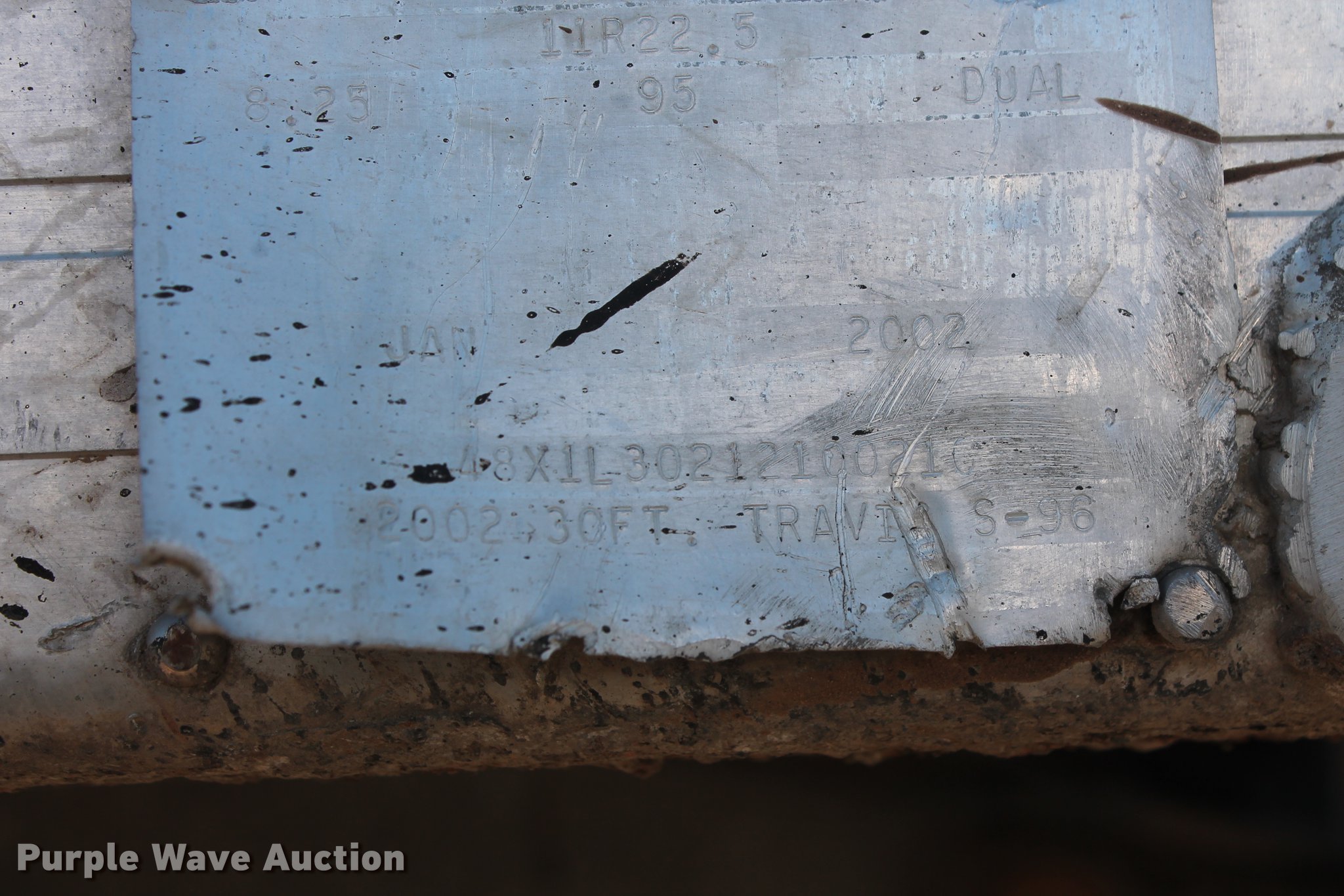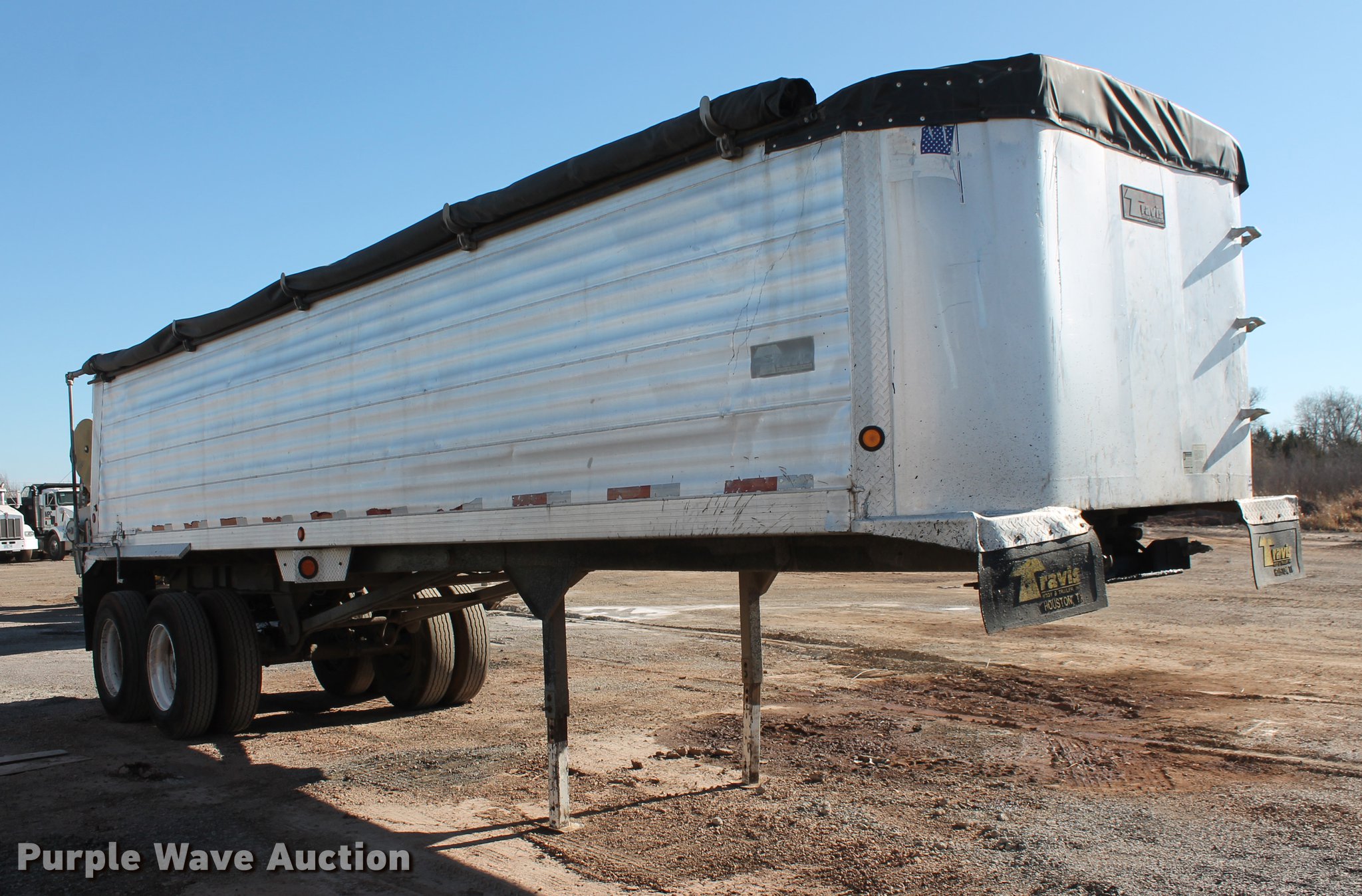 Purple Wave is selling a used End Dump Rock Trailer in Oklahoma. This item is a 2002 Travis S-96 end dump trailer with the following: 30'L x 96"W, 54" side height, Aluminum construction, Asphalt liner, Single hydraulic cylinder, End gate, Manual tarp, Access ladder, Dual leg landing gear, Fifth wheel plate, Tandem axle, Spring suspension, Air brakes, Steel wheels, 11R24.5 tires, GVWR 68,000 lbs, GAWR 20,000 lbs