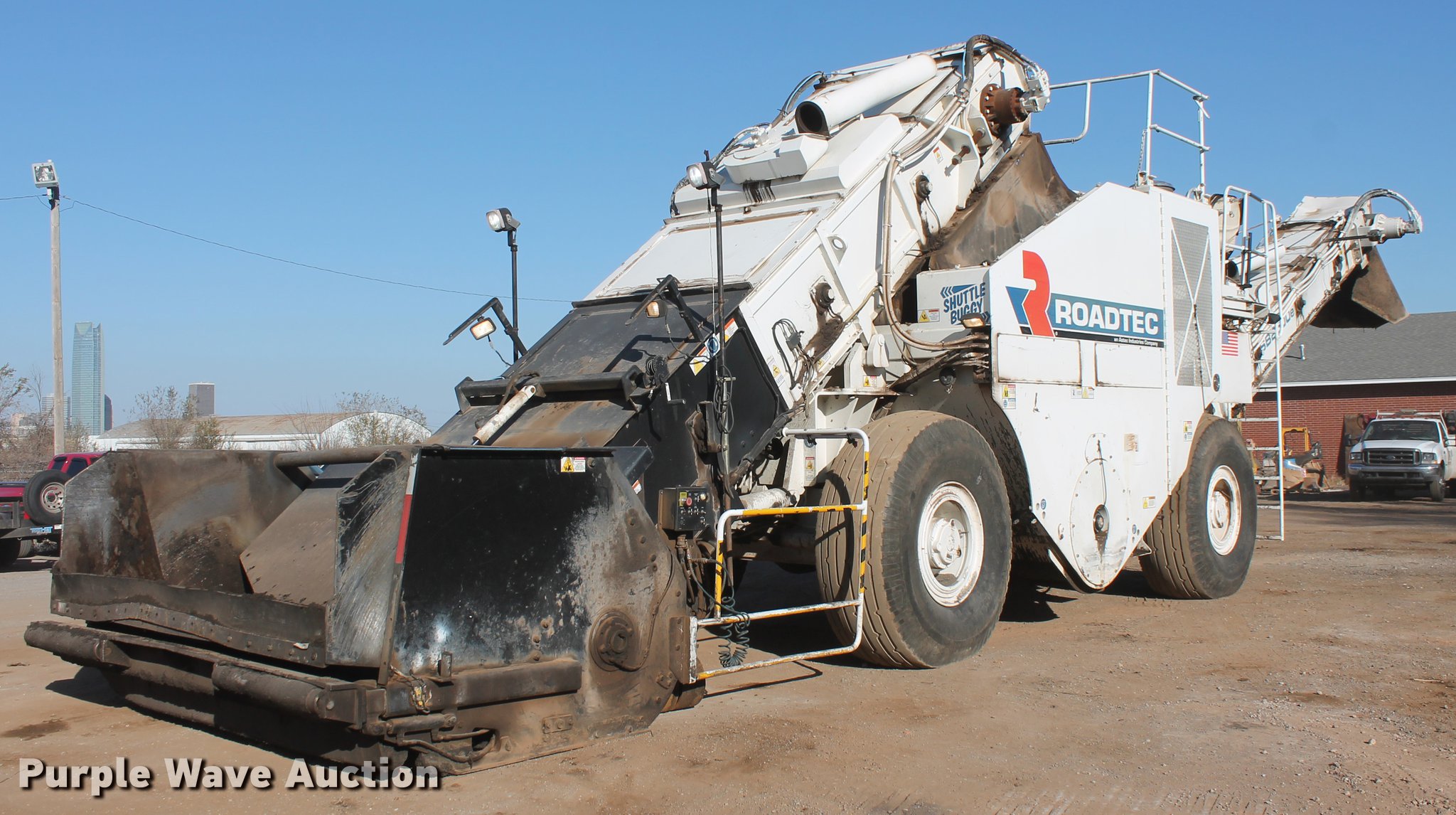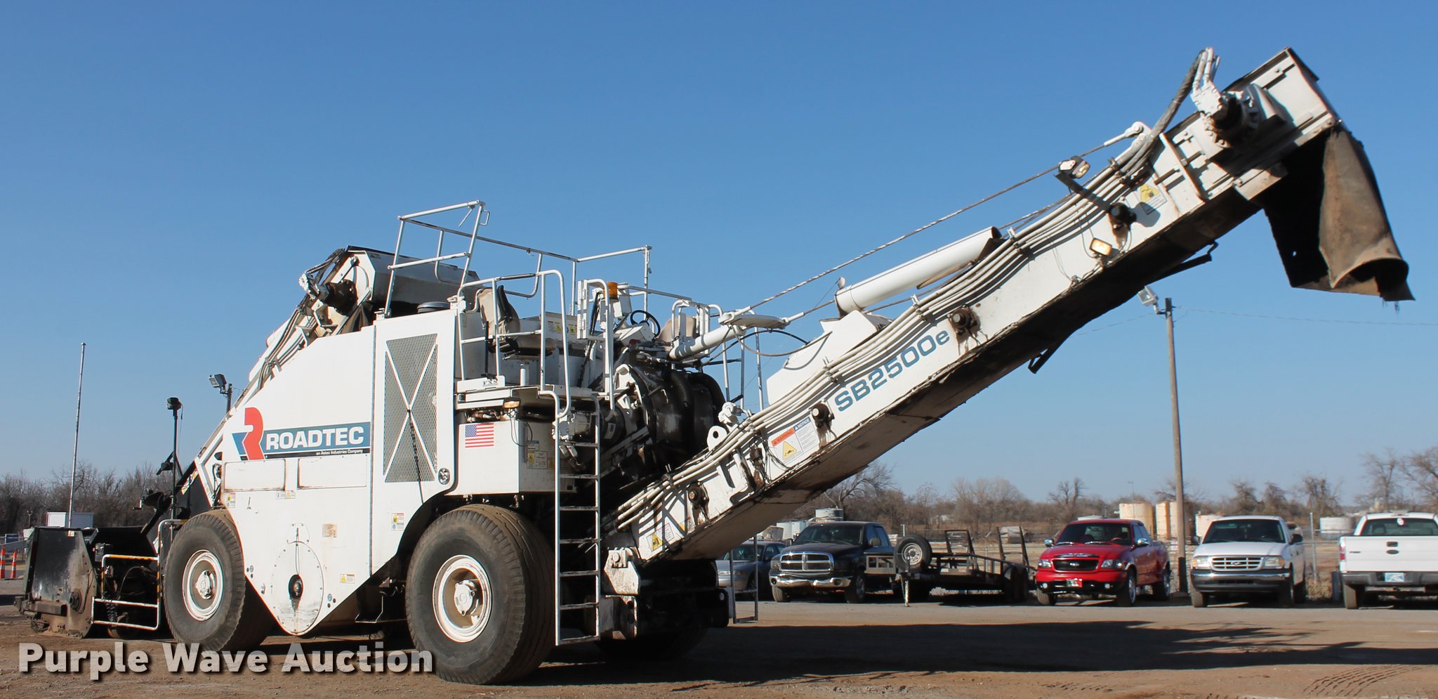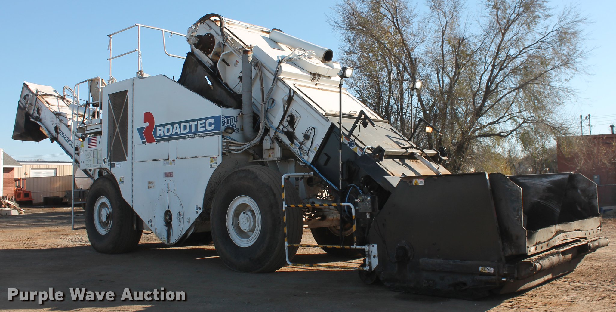Purple Wave is selling a used Planer or Milling Machine in Oklahoma. This item is a 2013 Roadtec SB-2500E Shuttle Buggy material transfer vehicle with the following: 4,514 hours on meter, Caterpillar C9.3 six cylinder diesel engine, 300 HP, Serial C9N01239, Two speed hydrostatic transmission, Continuously variable speed control, Dual operator stations, Center pivot control console, Clearview fume extraction system, Truck unloading conveyor, C1, 1,000 TPH, Chrome-carbide clad wear plates, Dual roller bushing offset link chain, Surge bin unloading conveyor, C2, 600 TPH, Chrome-carbide clad wear plates, Dual roller bushing offset link chain, Paver loading conveyor, C3, 600 TPH, Chrome-carbide clad wear plates, Dual roller bushing offset link chain, Insulated floor, Guard rails, 100 degree swing, Interlocking controls, C1, C2, C3, Surge bin, 25 ton storage capacity, 29" diameter cast Ni-Hard segmented auger, Full width clean-out doors, 9'2"W dump hopper, Dual control boxes, Vibrating floor plate, Hydraulic adjustable push rollers, Hydraulic adjustable hopper baffle, 29" diameter cast Ni-Hard segmented auger, 150 gallon fuel tank, 96 gallon hydraulic tank, Pro-Trac 21.00-25 sand ribbed tires, Approximately 56'9"L x 9'10"W x 11'11"H shipping dimensions, Serial SB2500E-2104