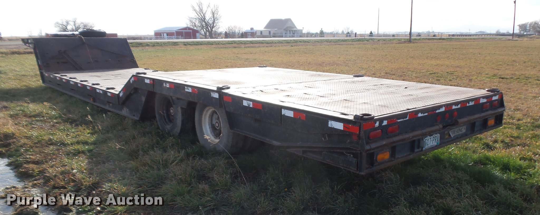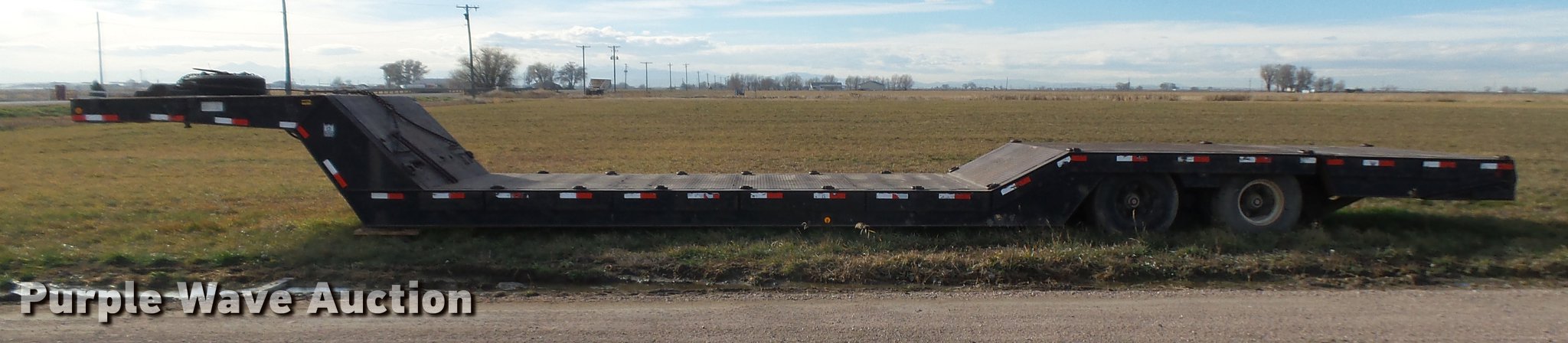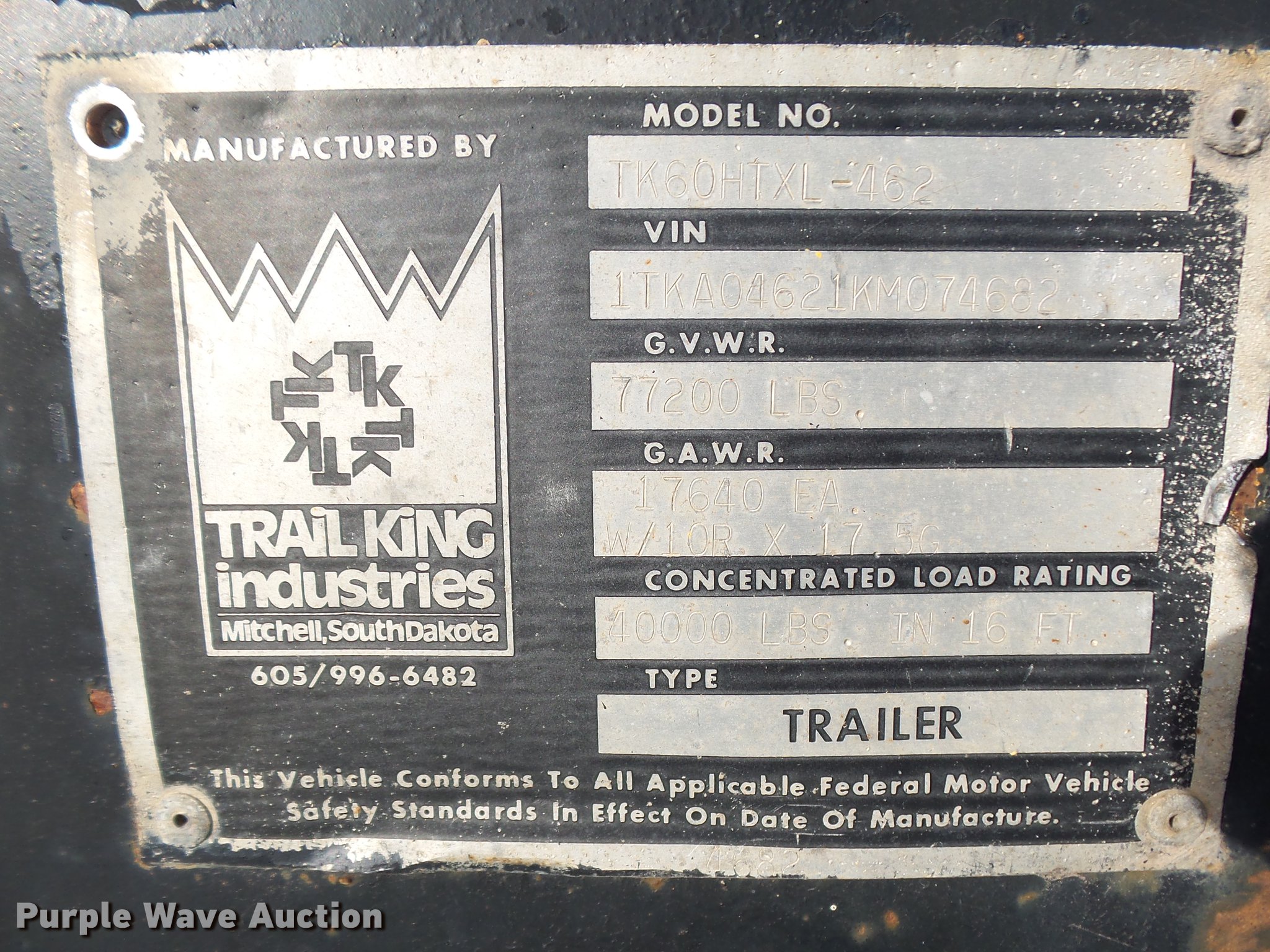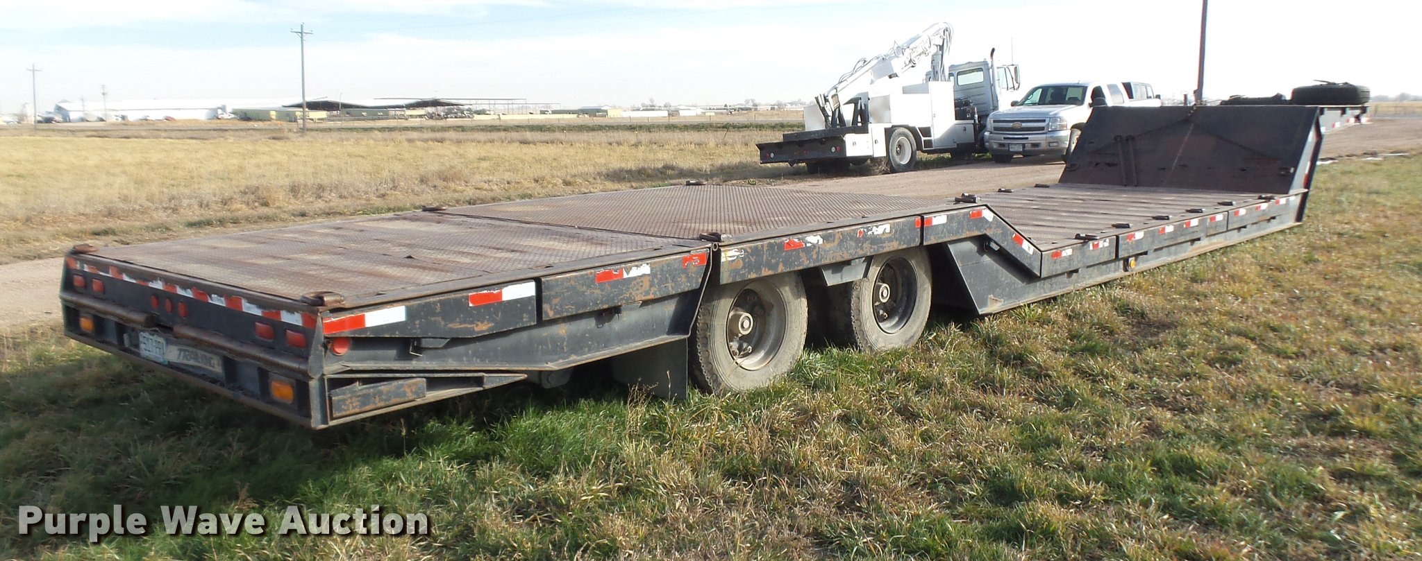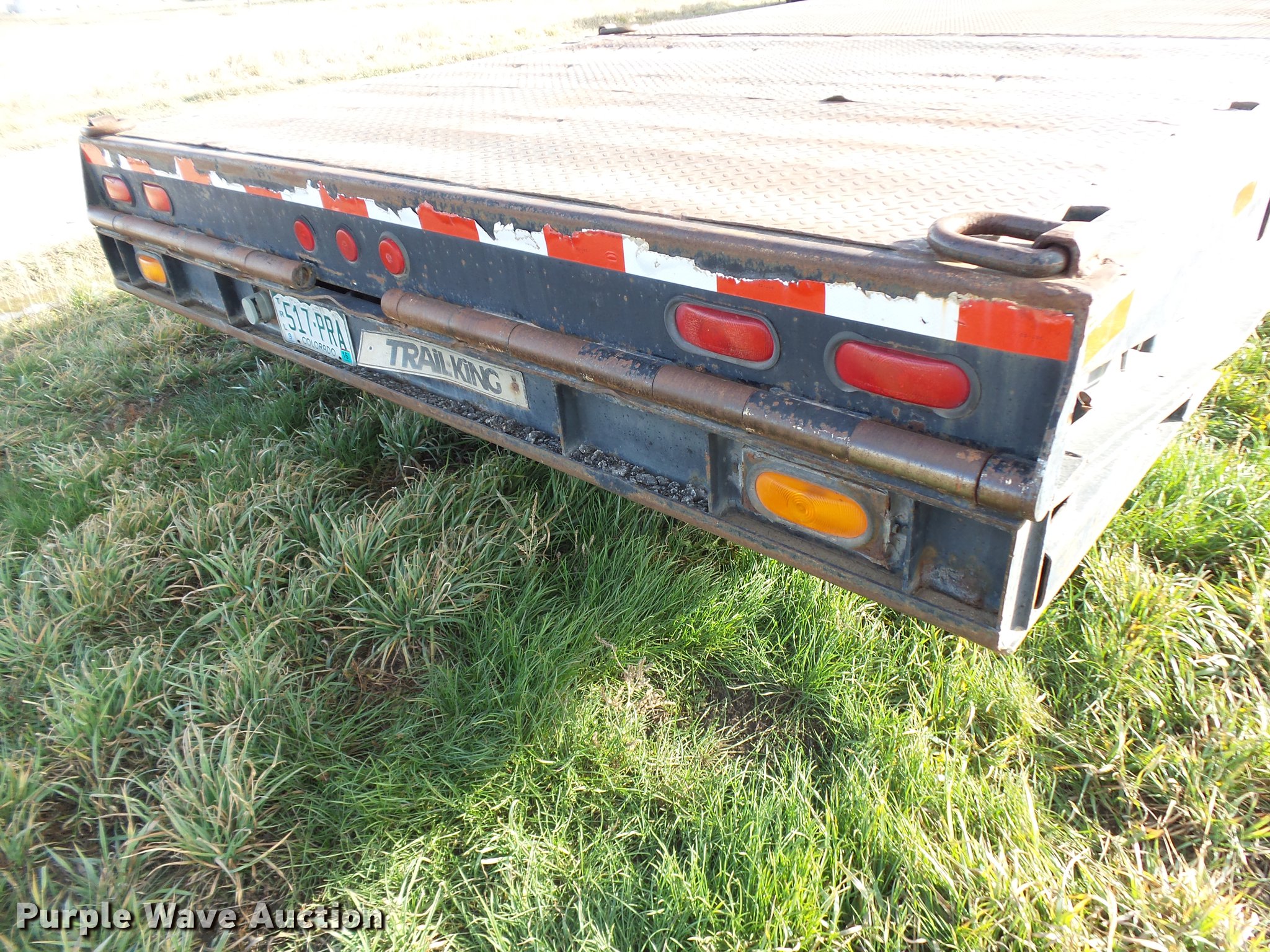 Purple Wave is selling a used Equip. Trailer in Colorado. This item is a 1989 Trail King TK60HTXL462 double drop deck equipment trailer with the following: 46' overall length, 8'L x 102"W top deck, 17'10" well length, 14'4" rear deck length, 6'L hydraulic ramps, 35"L hydratail, Steel pullout outriggers, Steel deck, D-ring tie downs, Stake side pockets, Winch, Manual hydraulic controls, Recessed toolbox, Dual leg landing gear, Fifth wheel plate, Tandem axle, Spring suspension, Air brakes, Steel wheels, 10R17.5 tires, GVWR 77,200 lbs, GAWR 17,640 lbs
