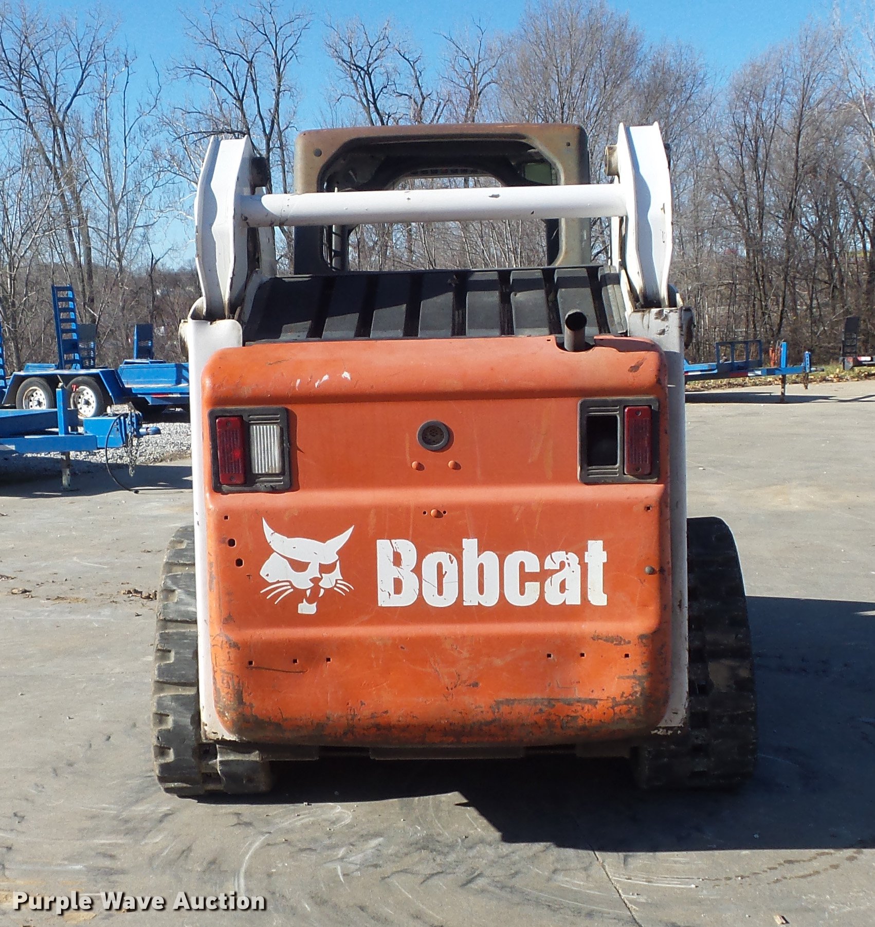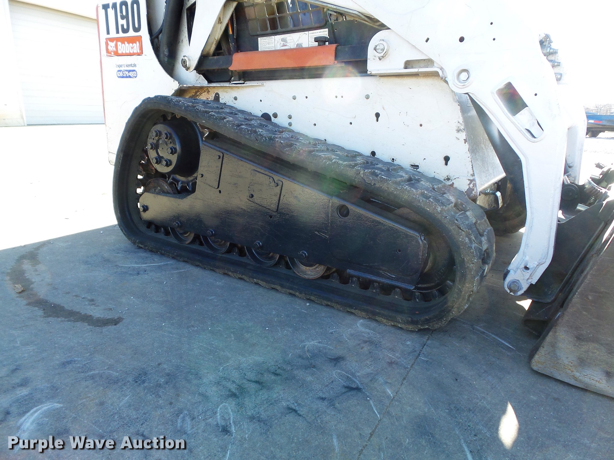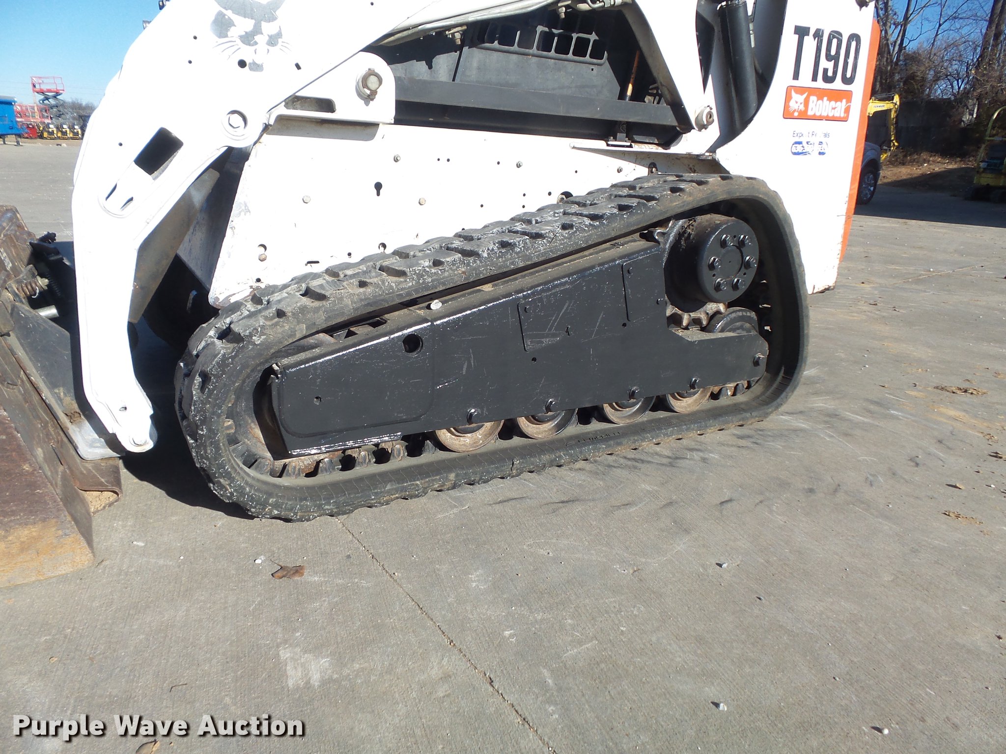 Purple Wave is selling a used Tracked Skid Steer Loader in Missouri. This item is a 2008 Bobcat T190 skid steer with the following: 2,758 hours on meter, Kubota V2607-D1-ET03 2.6L four cylinder turbo diesel engine, Two speed hydrostatic transmission, Open station/Canopy, Hand and foot controls, EMS panel, Front and rear work lights, 67"W bucket, (7) bolt-on teeth, Manual quick coupler, High Flow auxiliary hydraulics, Auxiliary electrical outlet, 12"W tracks, Auxiliary electrical outlet damaged, Rear window missing, Serial A3LN11188
